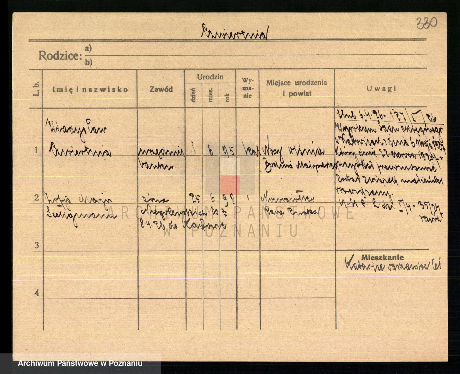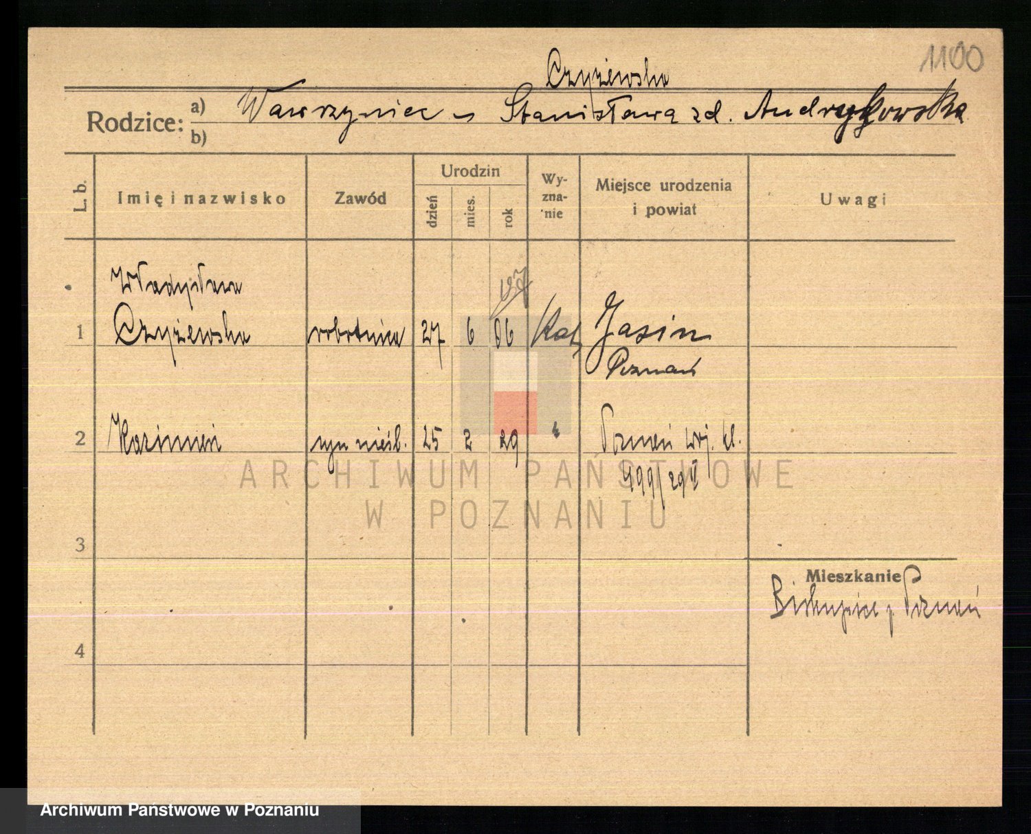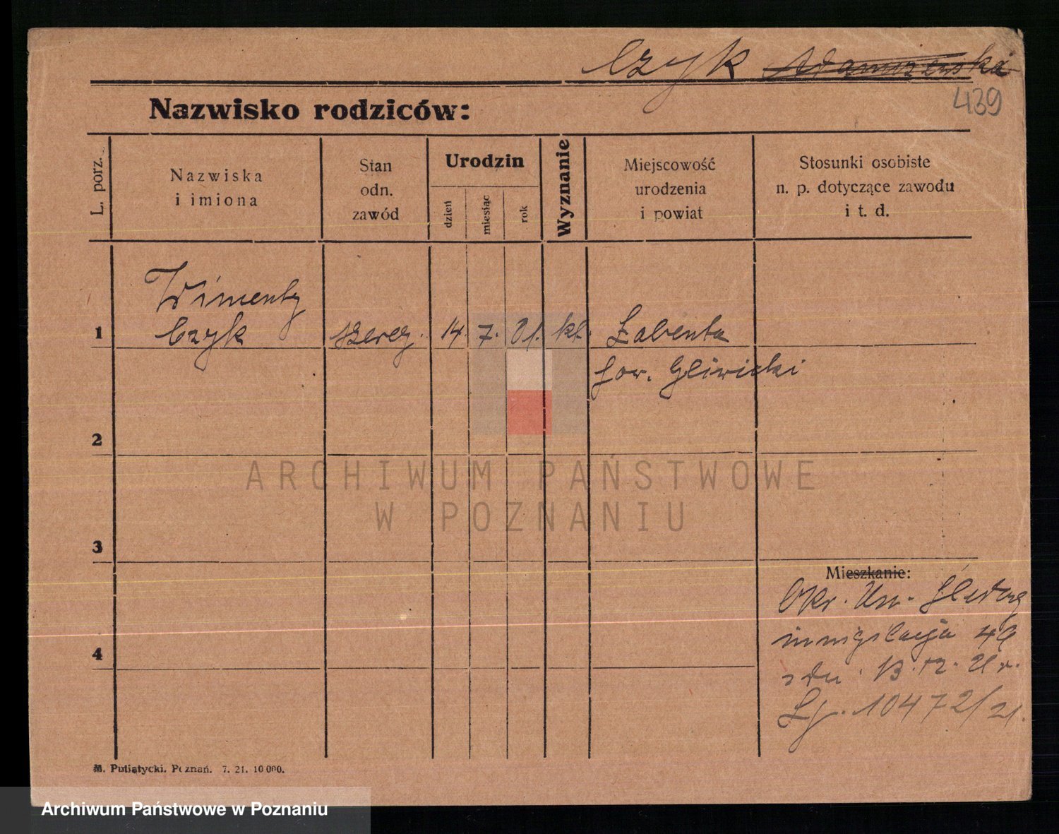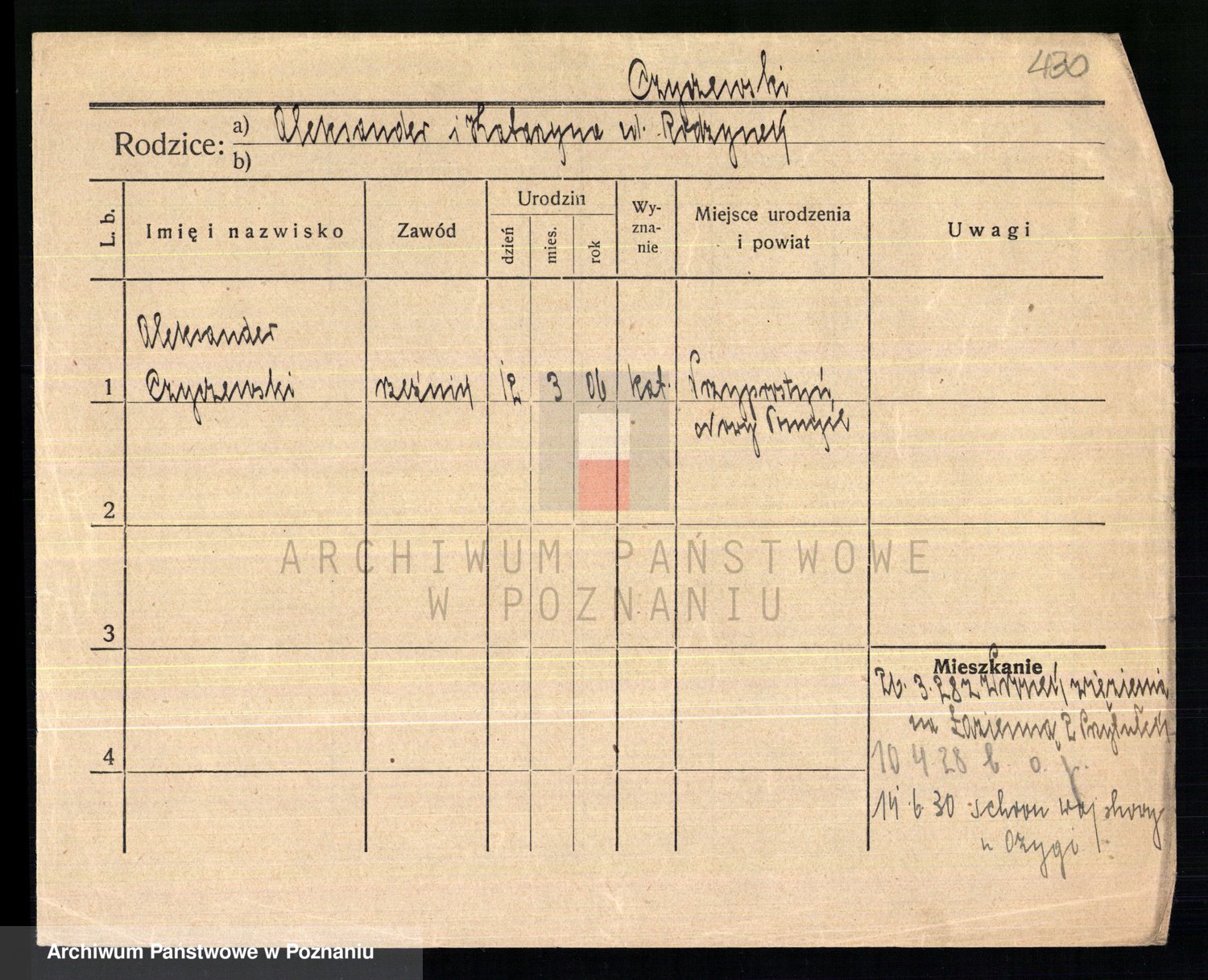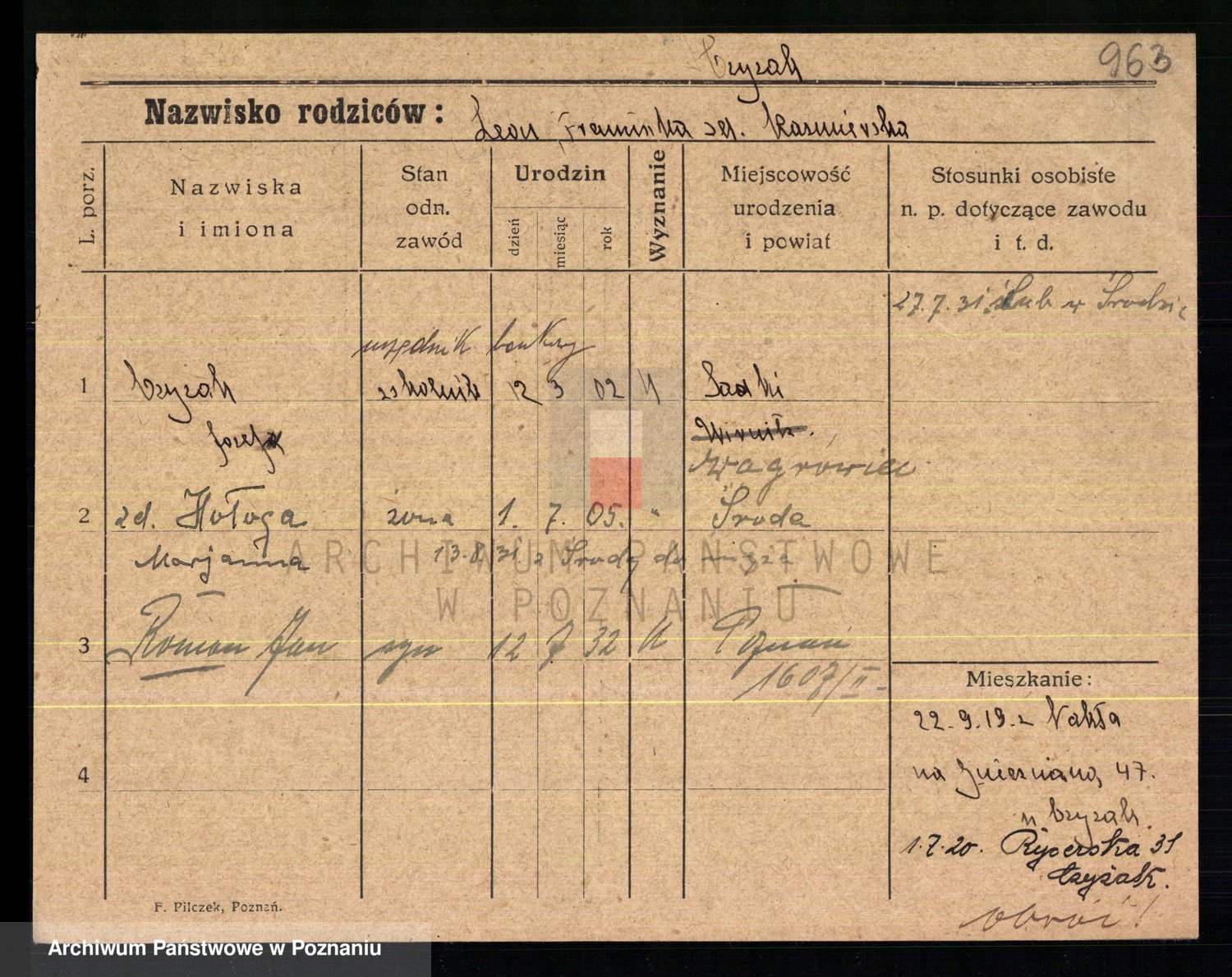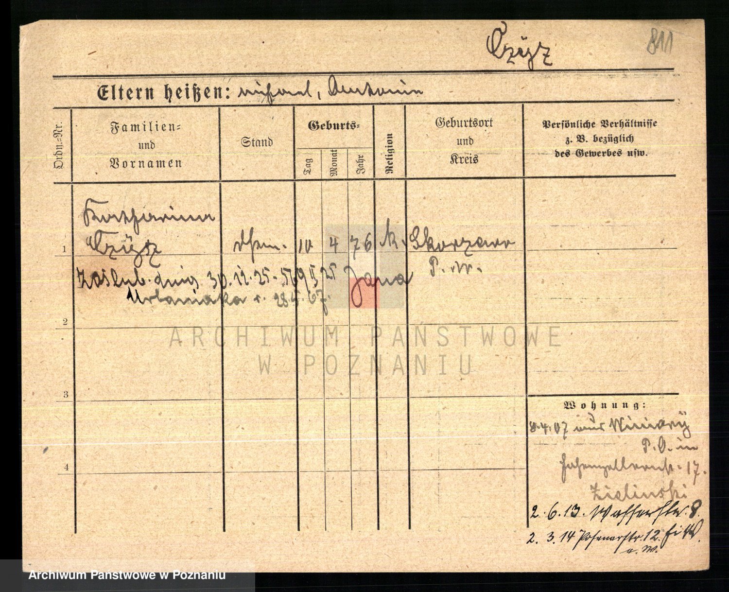 Podgląd karty osobowej dostępny jest po kliknięciu na nazwisko lub ikonkę karty. Można dokonywać powiększenia (ikony na górze) lub przechodzić między kolejnymi skanami (strzałki po bokach).