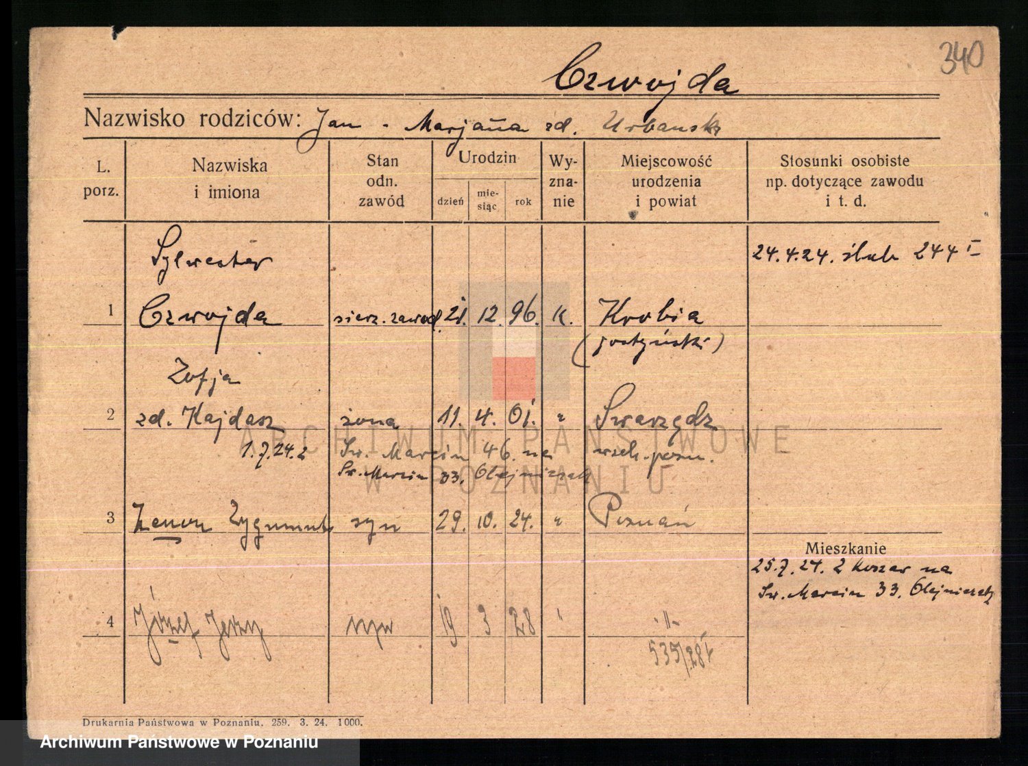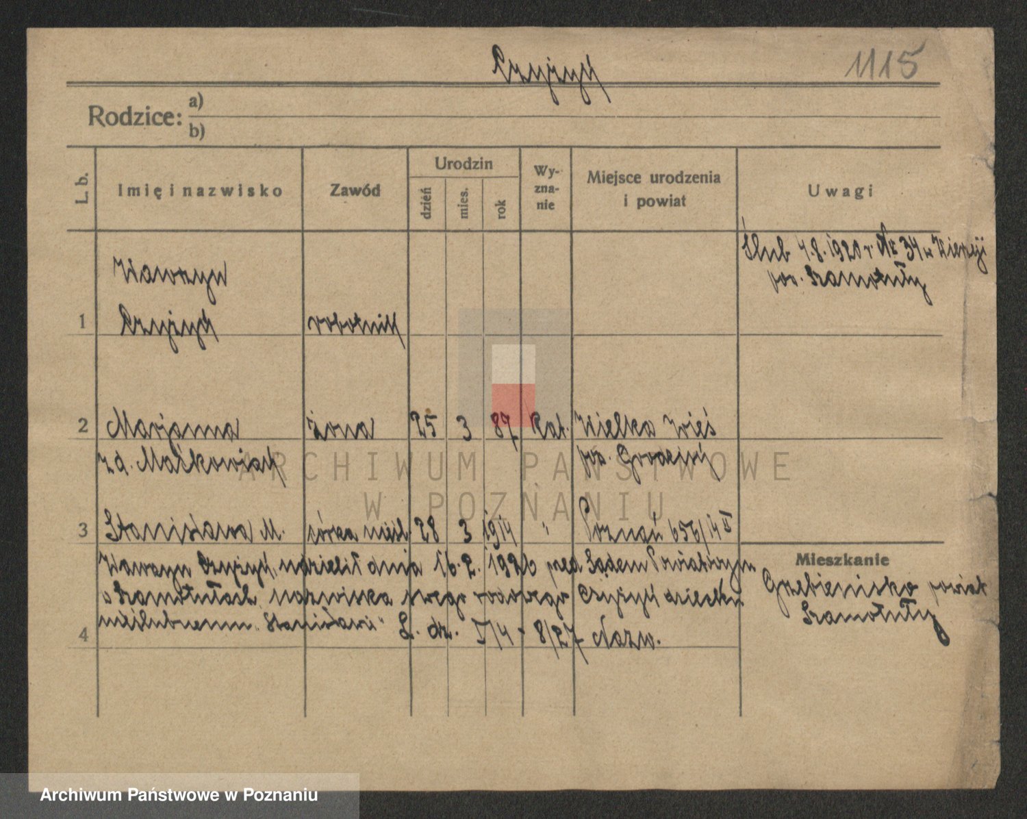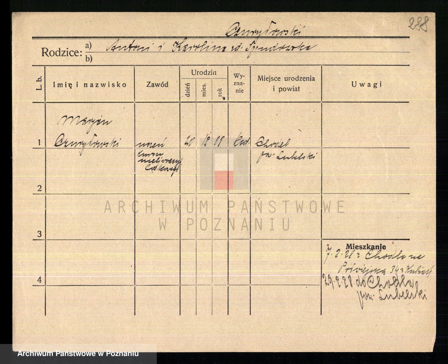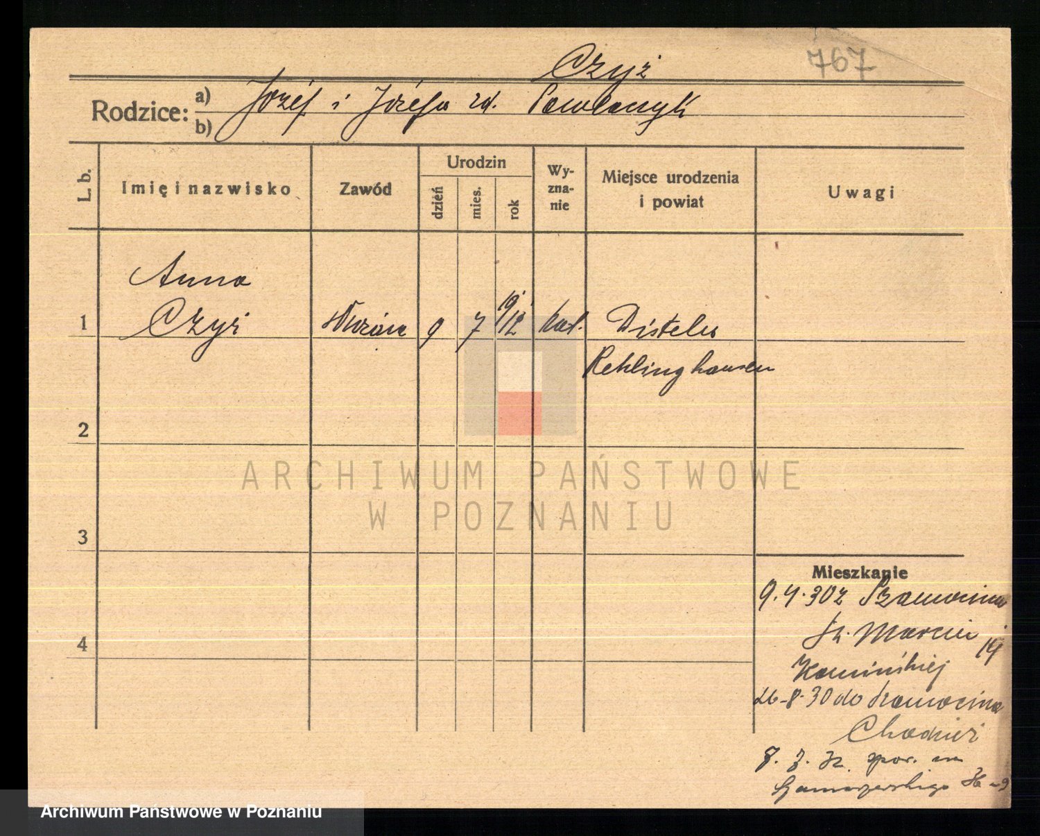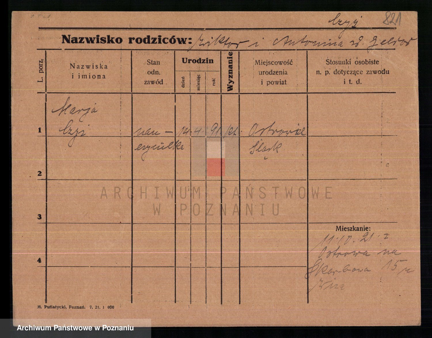 Podgląd karty osobowej dostępny jest po kliknięciu na nazwisko lub ikonkę karty. Można dokonywać powiększenia (ikony na górze) lub przechodzić między kolejnymi skanami (strzałki po bokach).