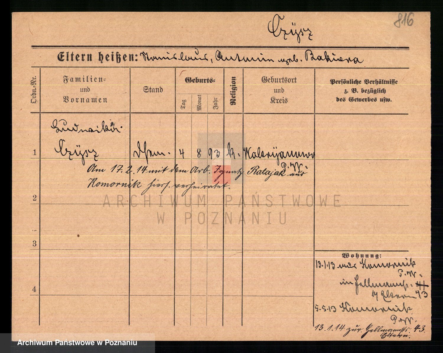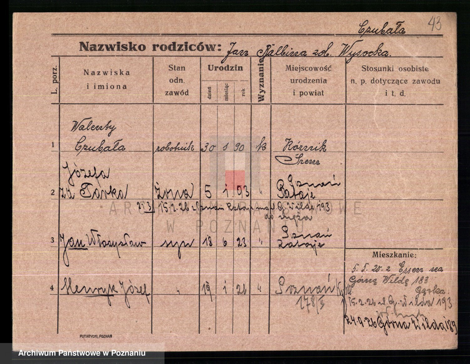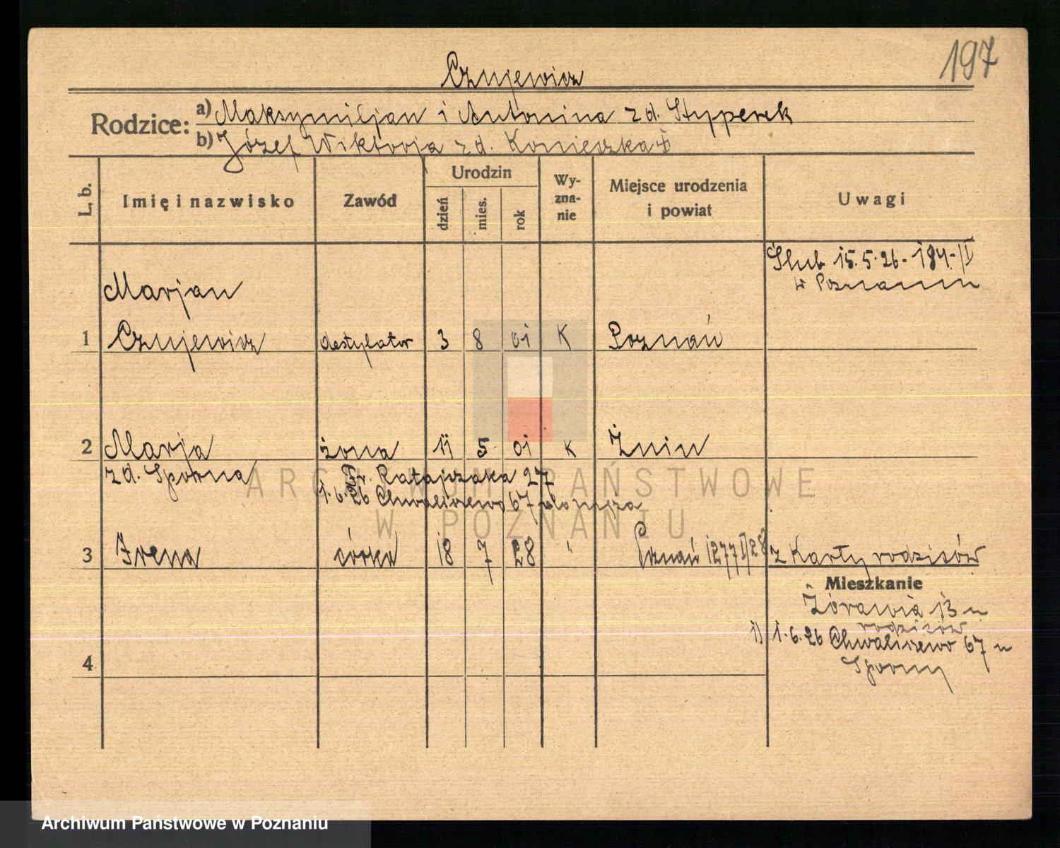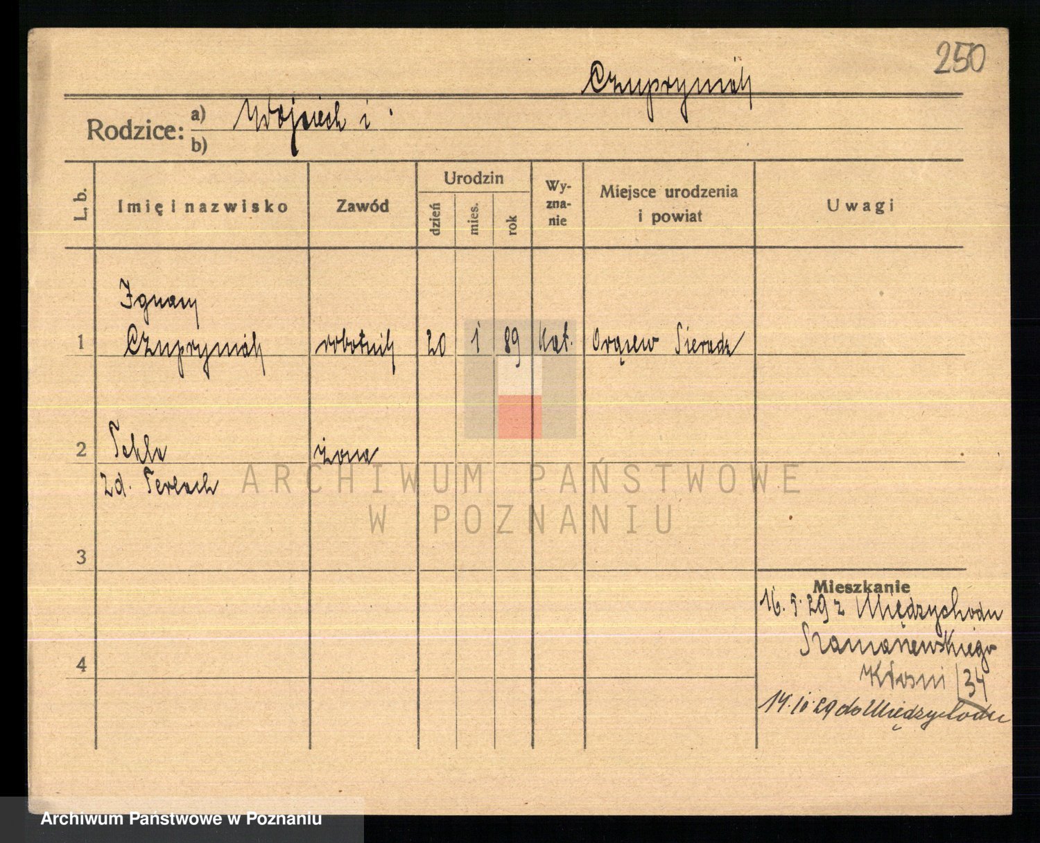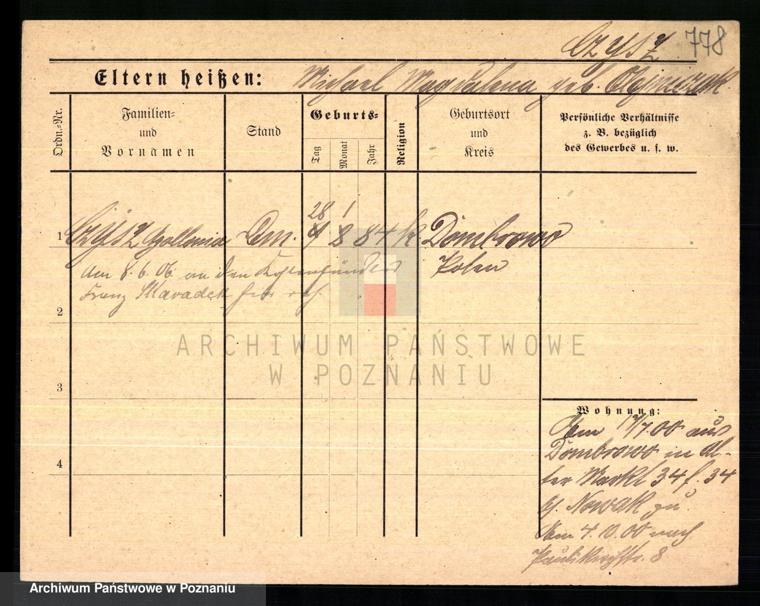 Podgląd karty osobowej dostępny jest po kliknięciu na nazwisko lub ikonkę karty. Można dokonywać powiększenia (ikony na górze) lub przechodzić między kolejnymi skanami (strzałki po bokach).