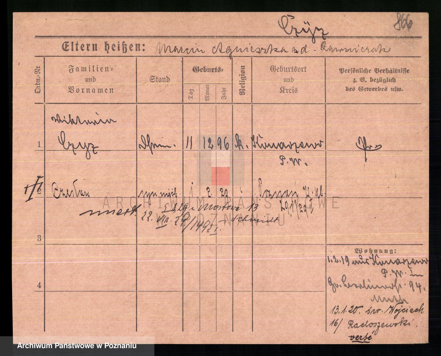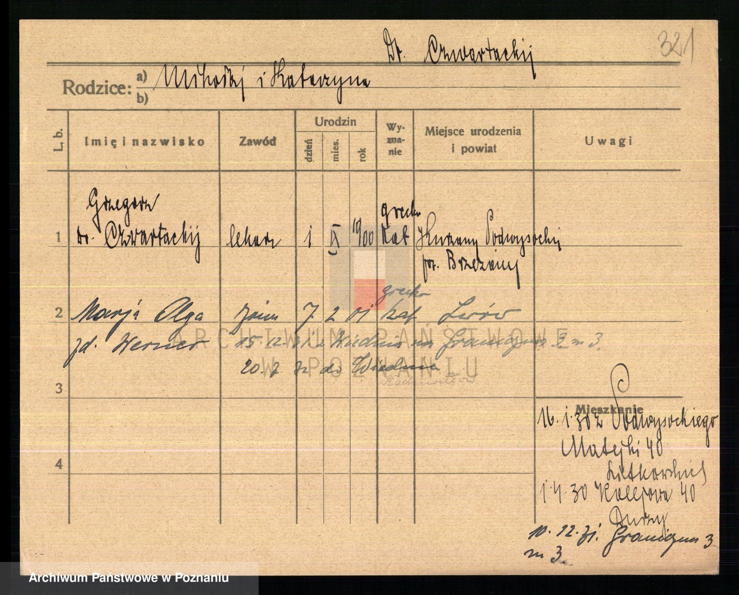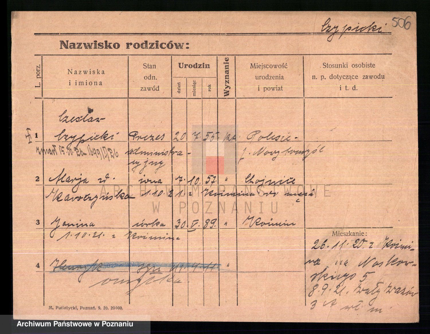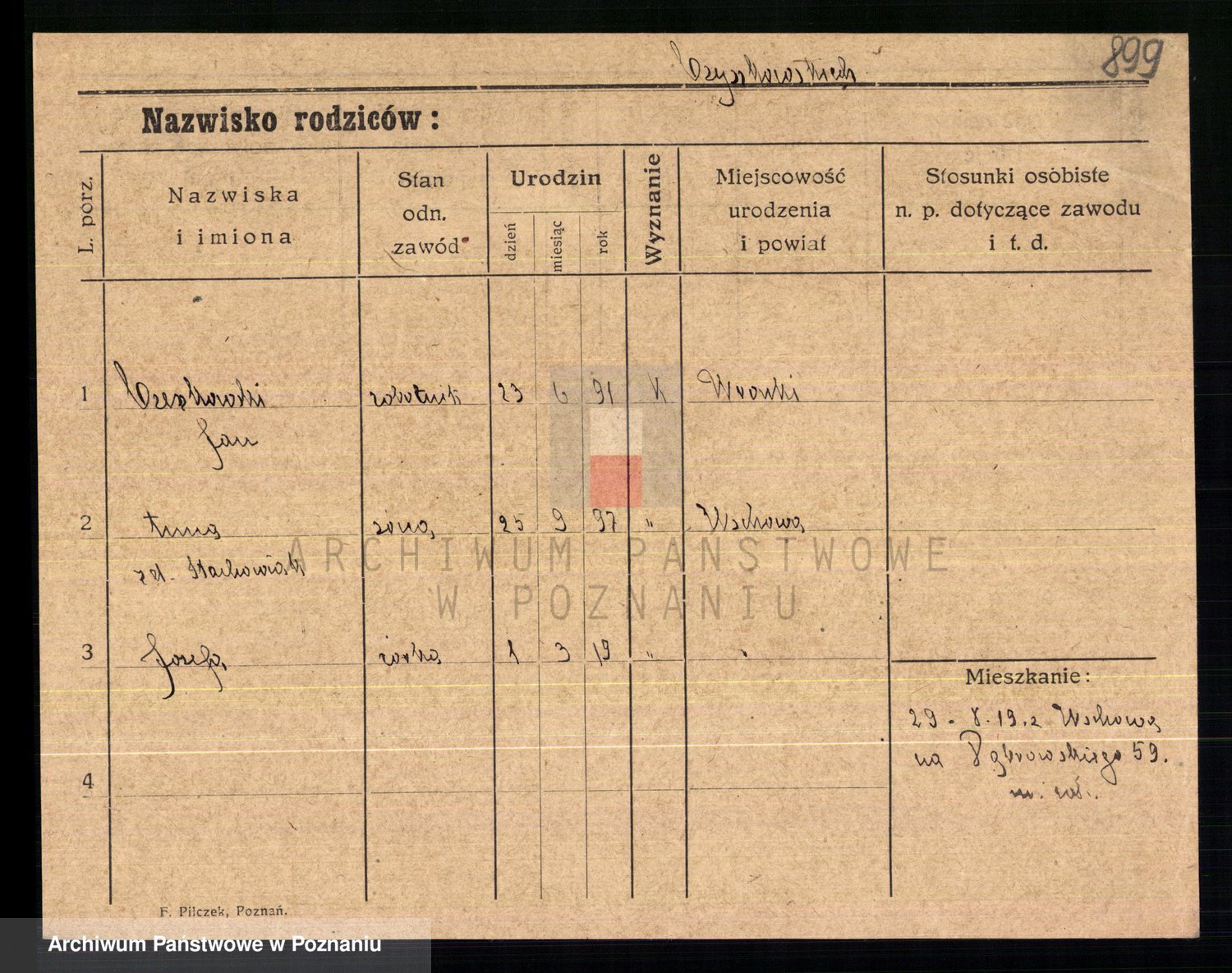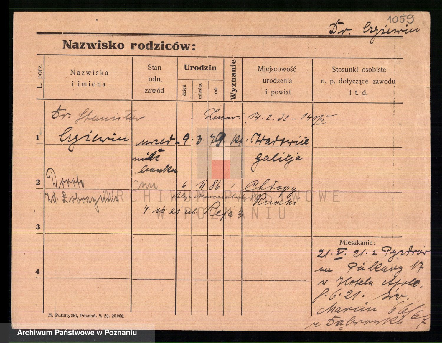 Podgląd karty osobowej dostępny jest po kliknięciu na nazwisko lub ikonkę karty. Można dokonywać powiększenia (ikony na górze) lub przechodzić między kolejnymi skanami (strzałki po bokach).