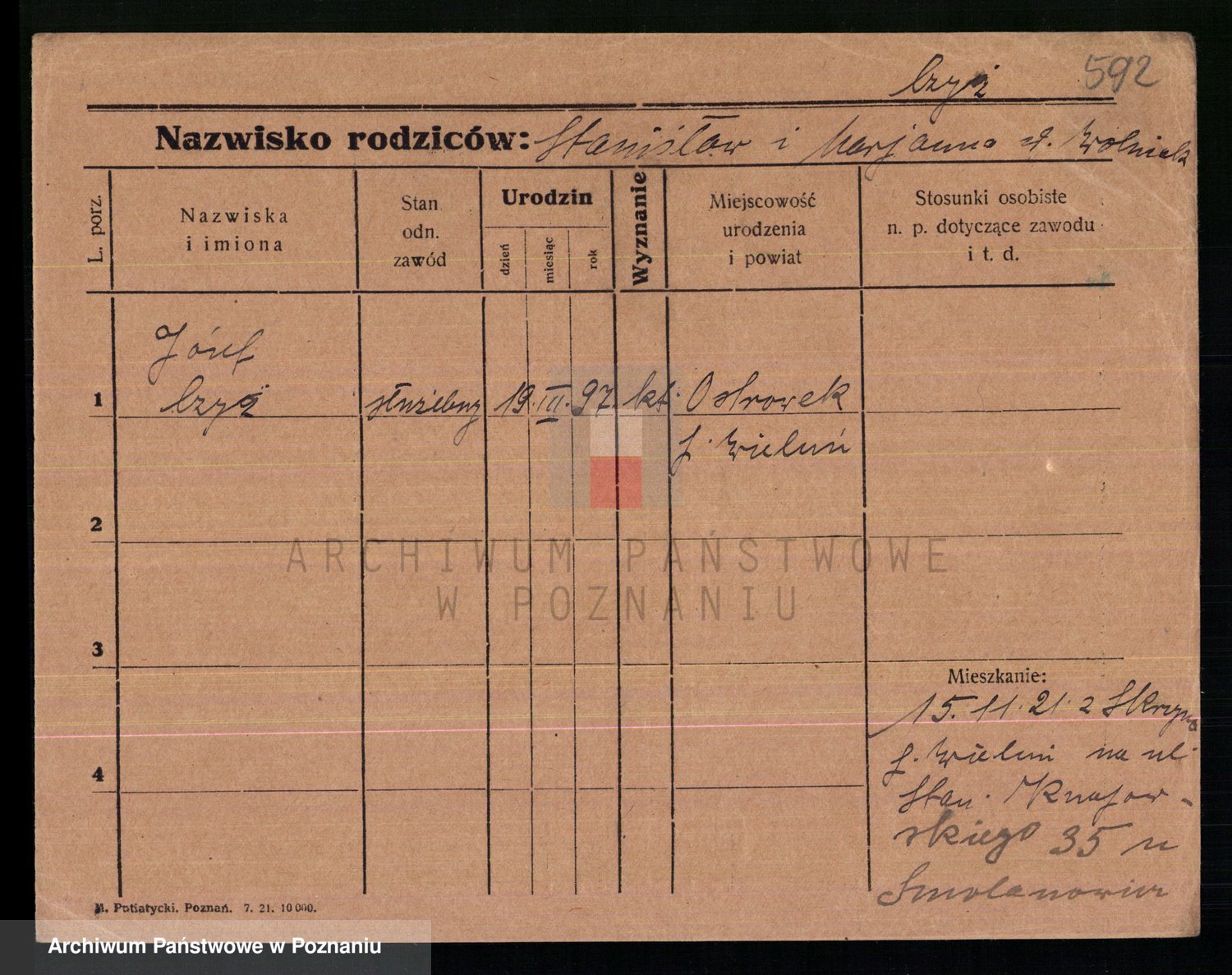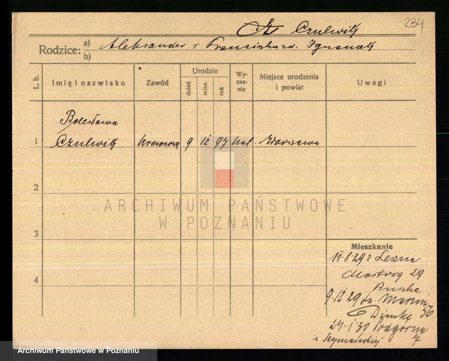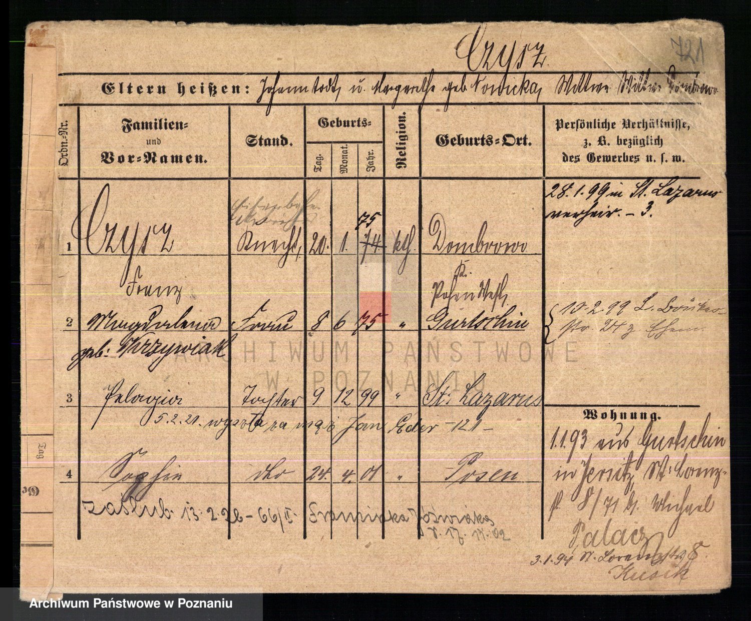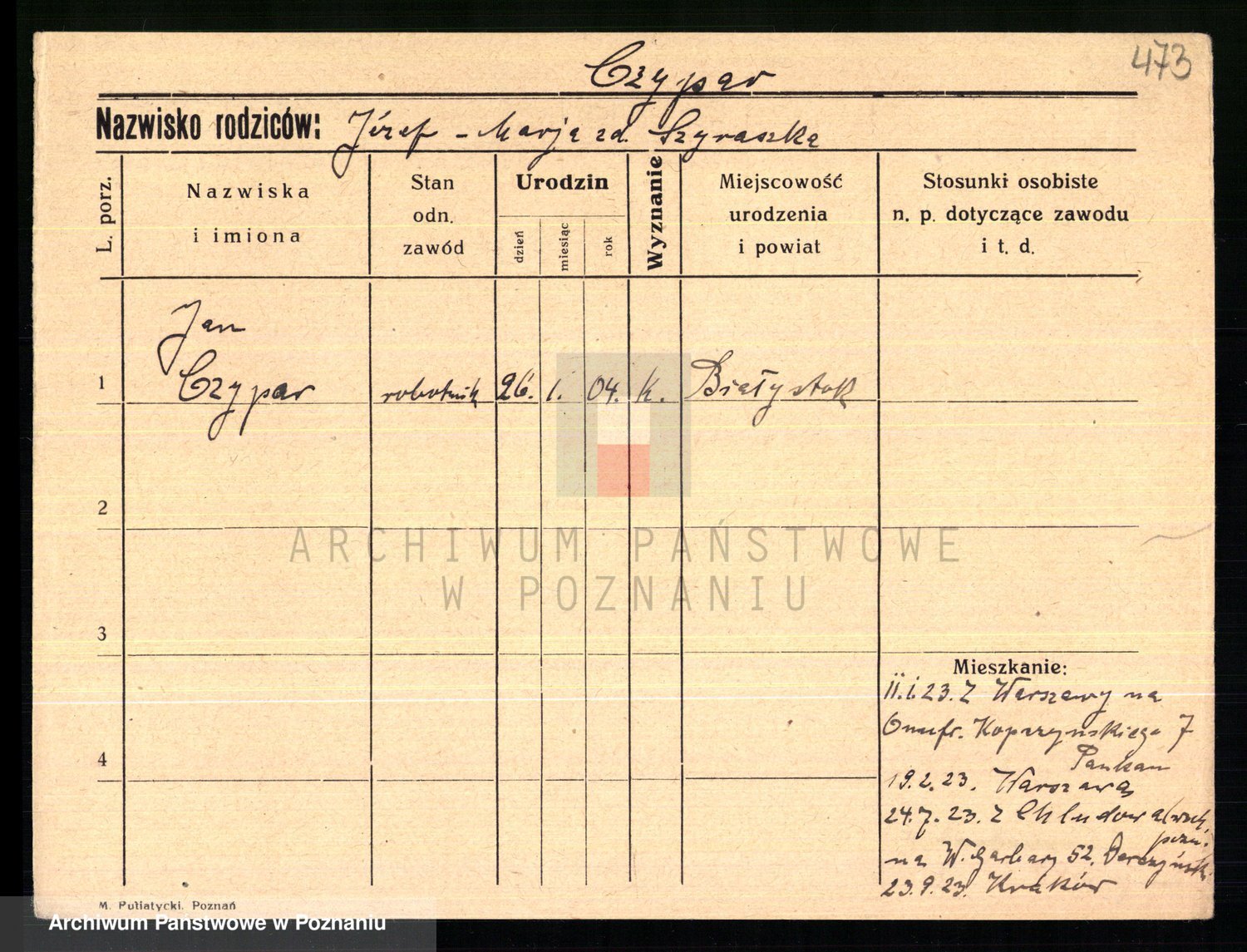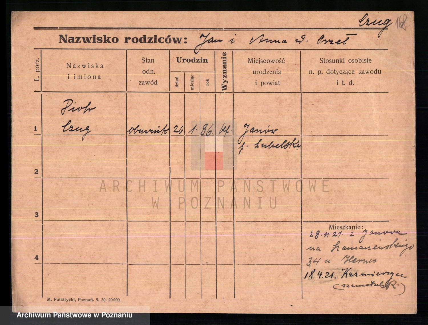 Podgląd karty osobowej dostępny jest po kliknięciu na nazwisko lub ikonkę karty. Można dokonywać powiększenia (ikony na górze) lub przechodzić między kolejnymi skanami (strzałki po bokach).