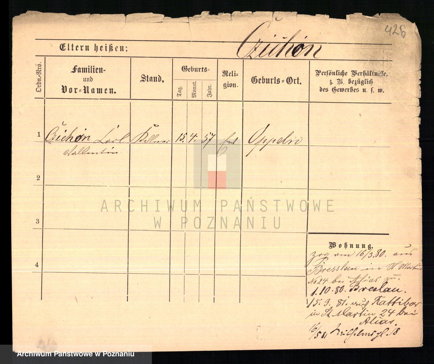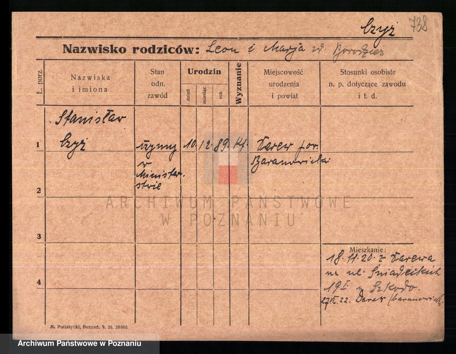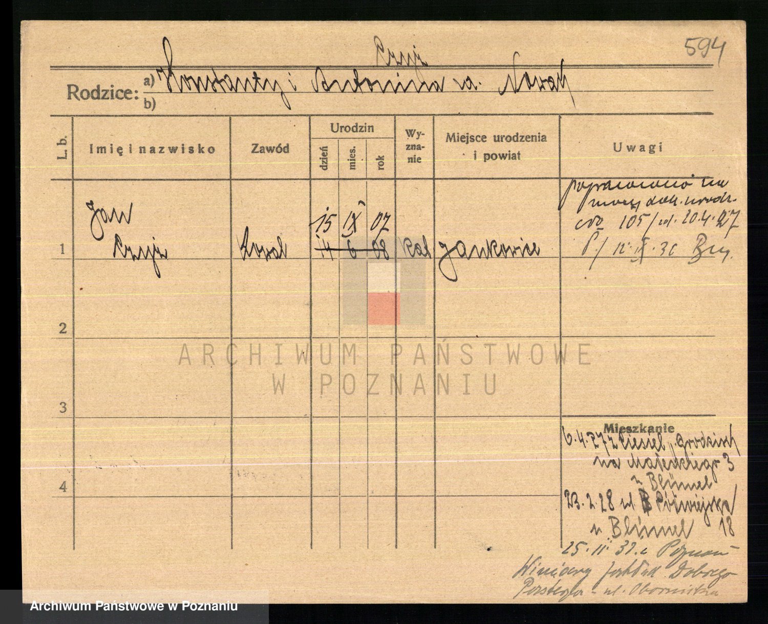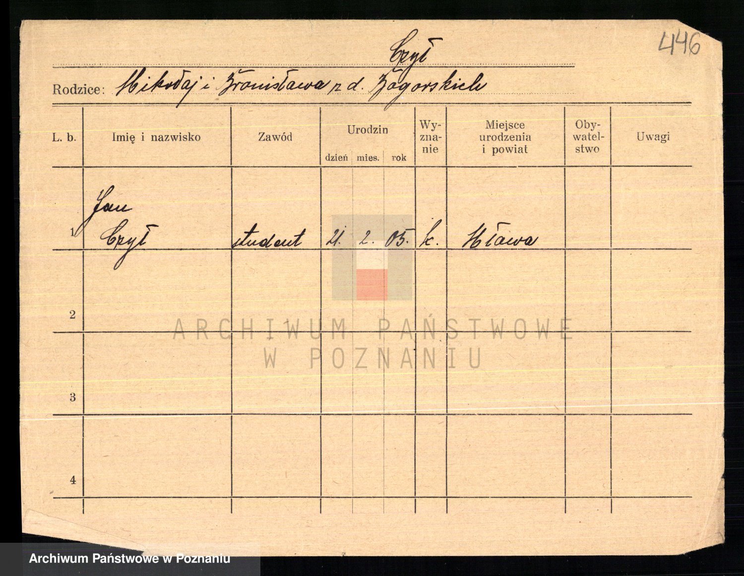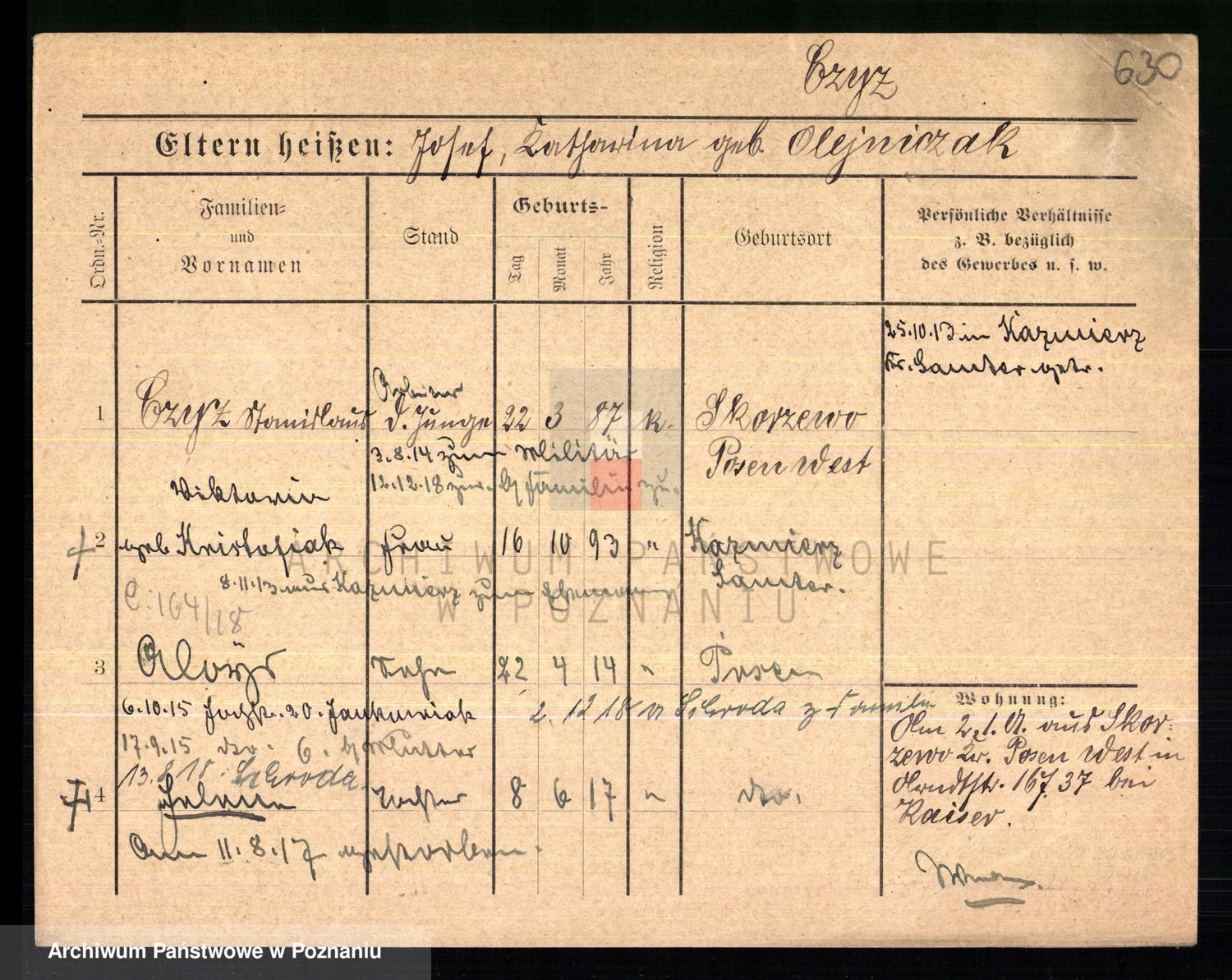Podgląd karty osobowej dostępny jest po kliknięciu na nazwisko lub ikonkę karty. Można dokonywać powiększenia (ikony na górze) lub przechodzić między kolejnymi skanami (strzałki po bokach).