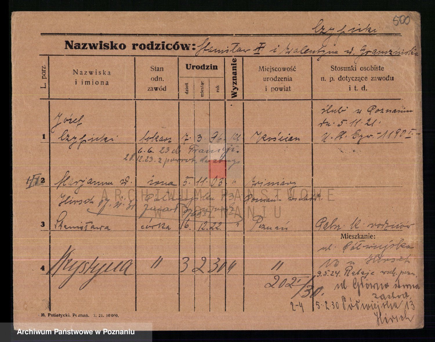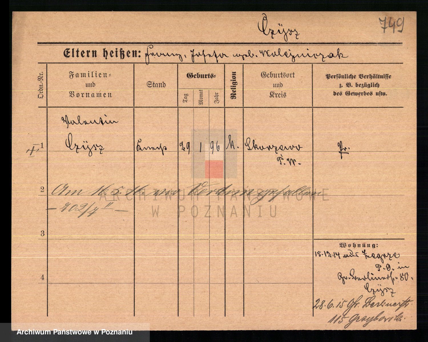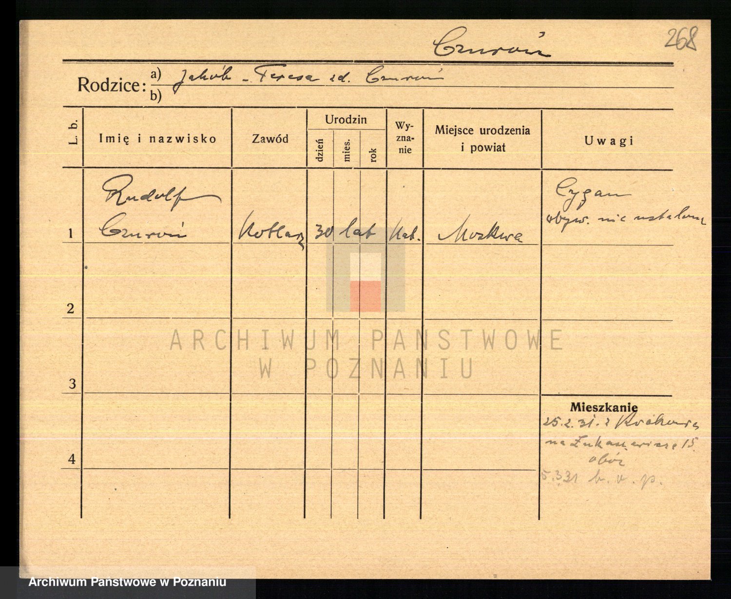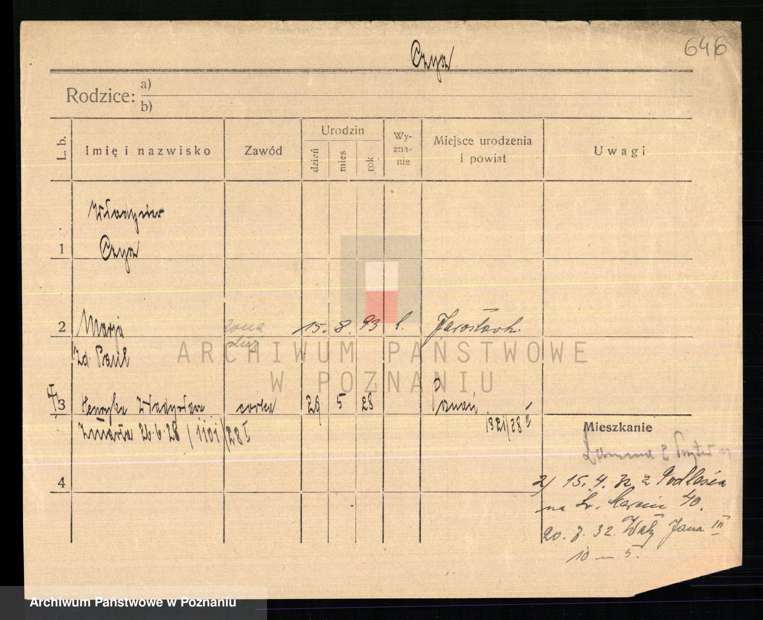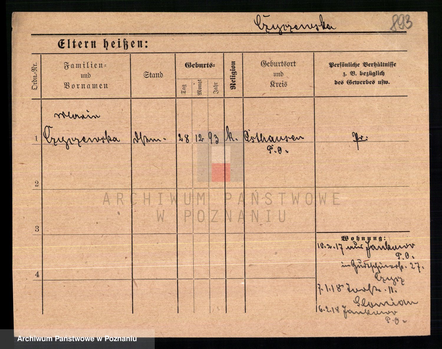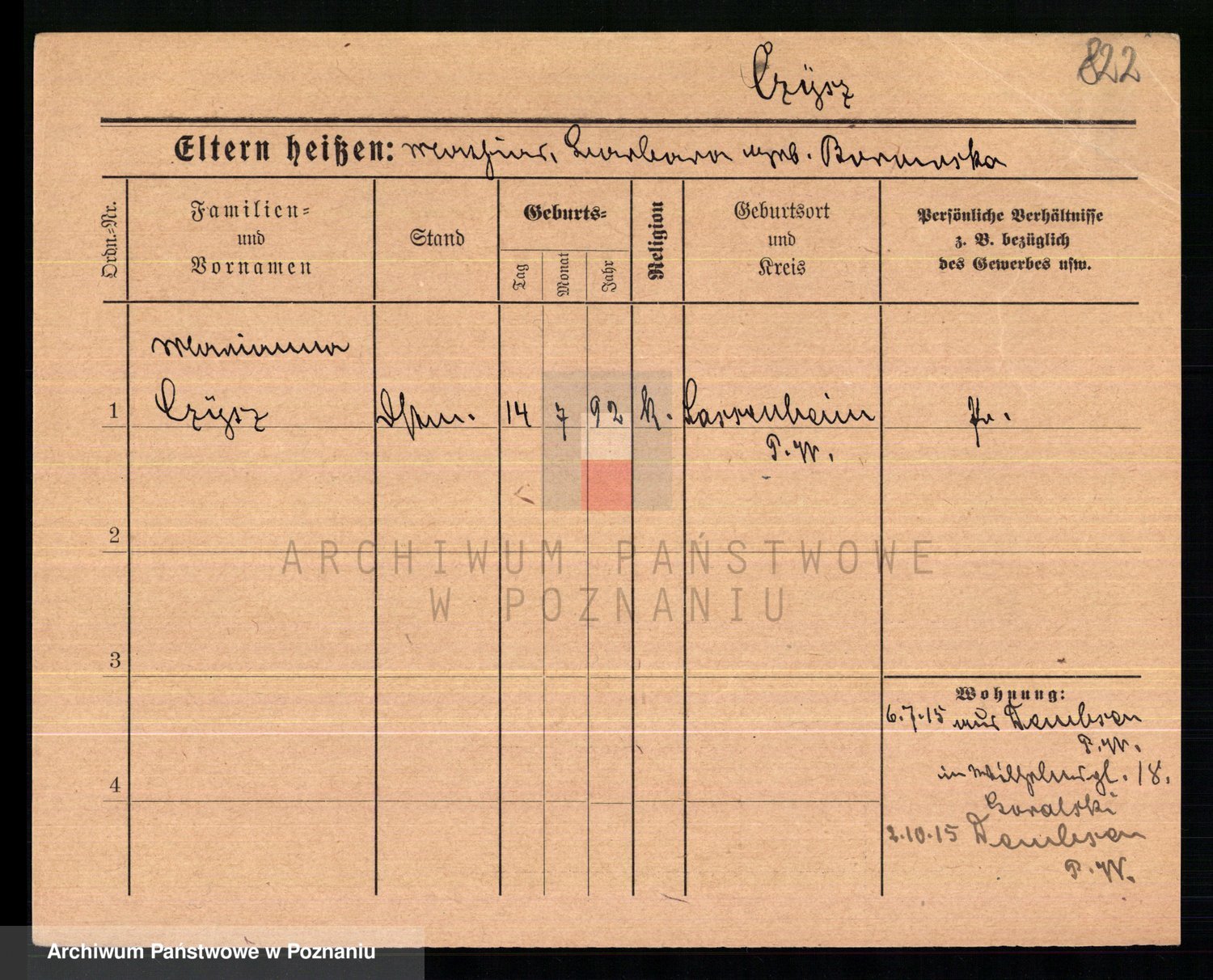 Podgląd karty osobowej dostępny jest po kliknięciu na nazwisko lub ikonkę karty. Można dokonywać powiększenia (ikony na górze) lub przechodzić między kolejnymi skanami (strzałki po bokach).