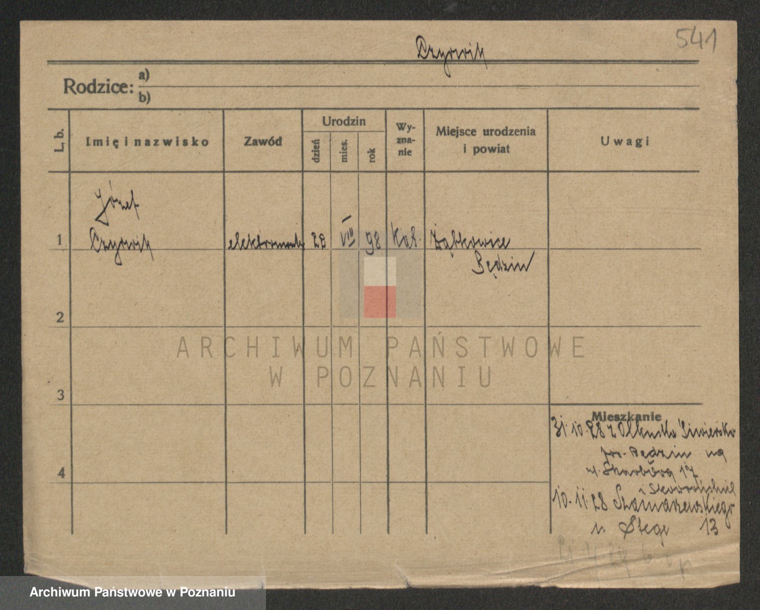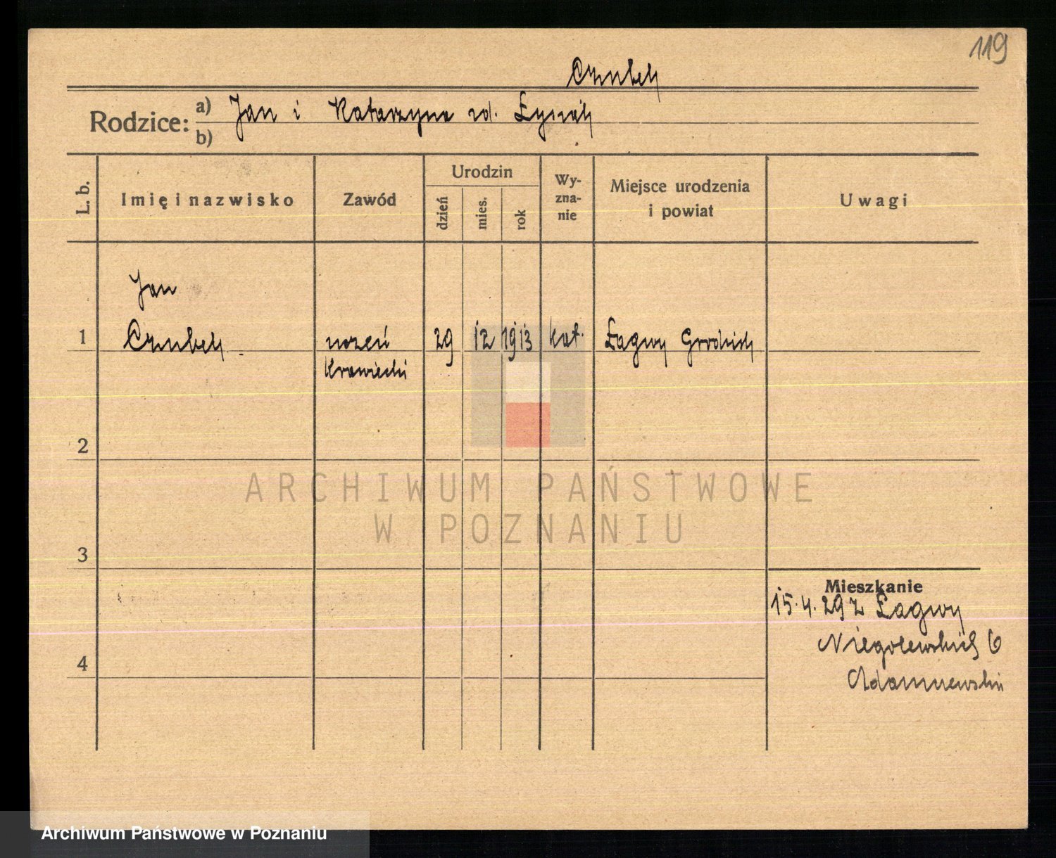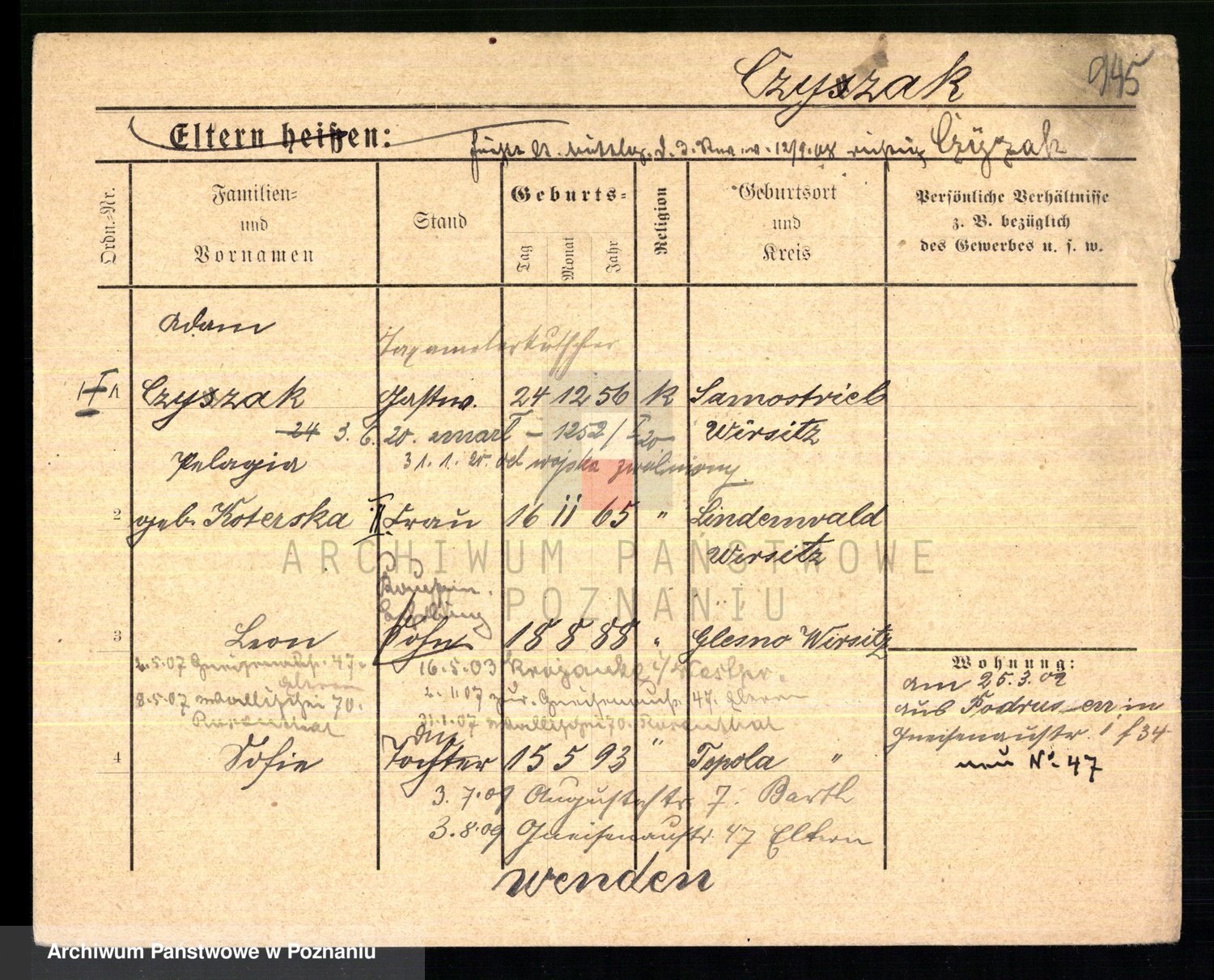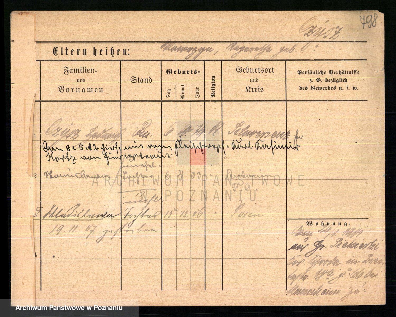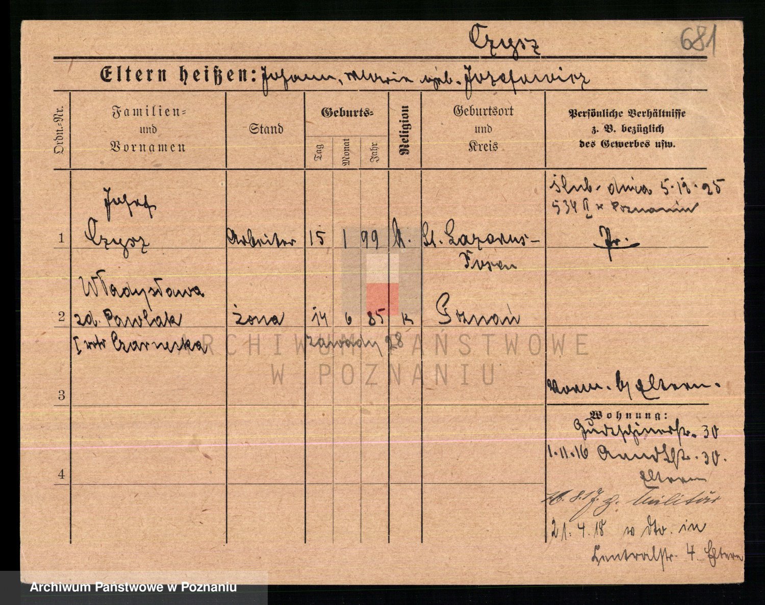 Podgląd karty osobowej dostępny jest po kliknięciu na nazwisko lub ikonkę karty. Można dokonywać powiększenia (ikony na górze) lub przechodzić między kolejnymi skanami (strzałki po bokach).