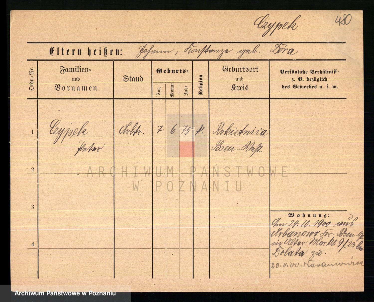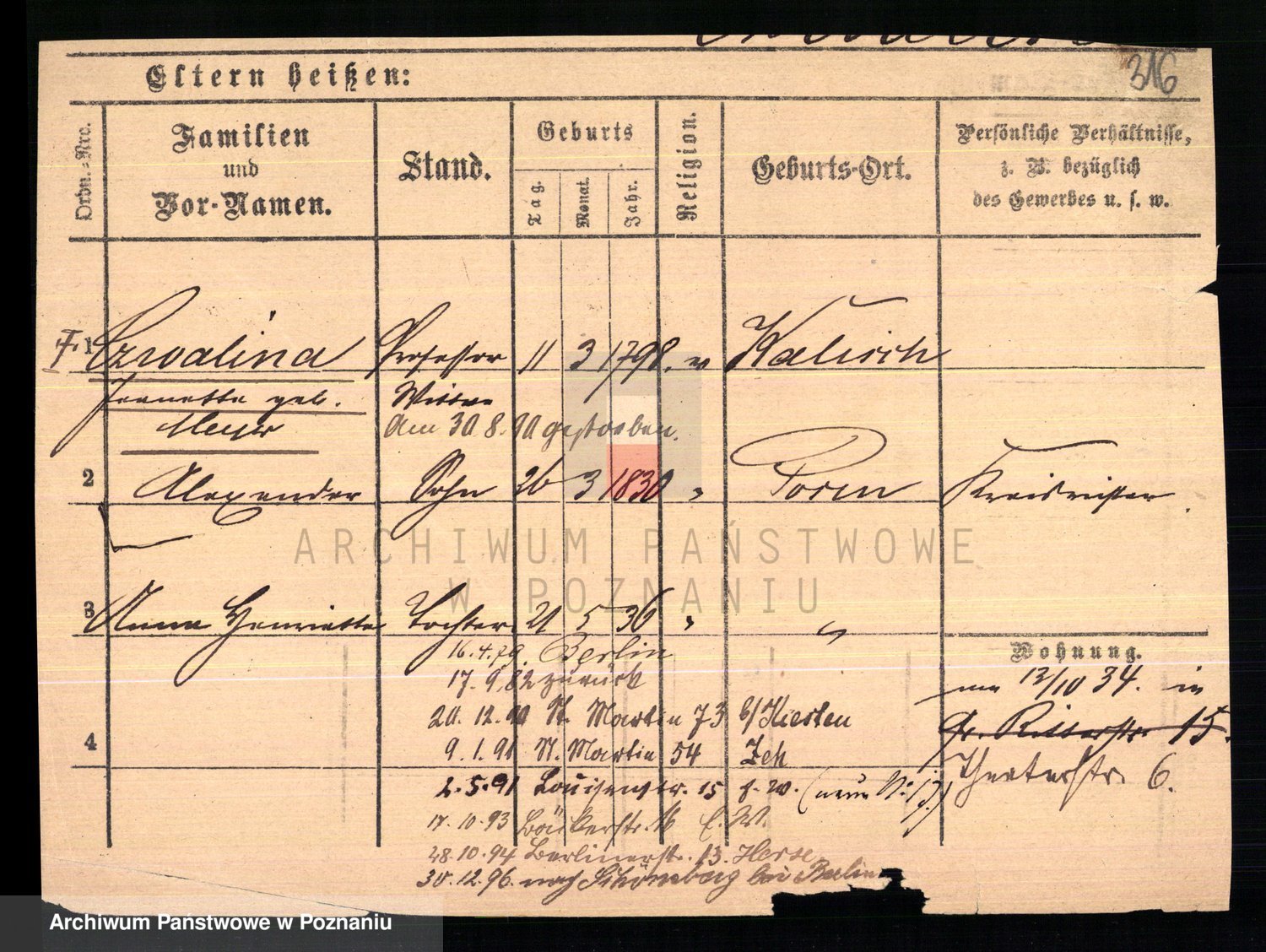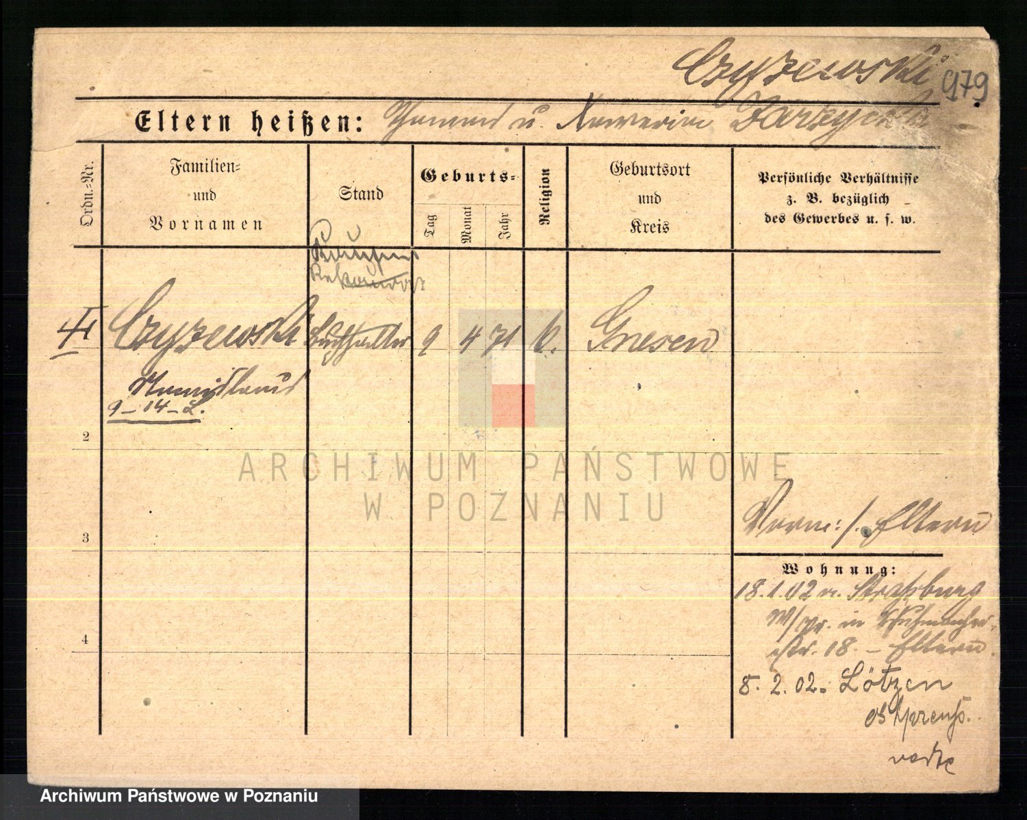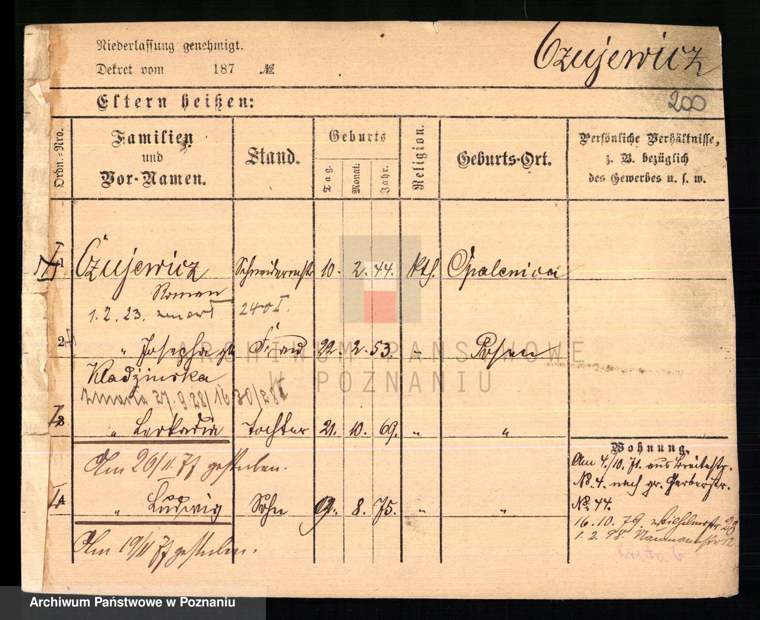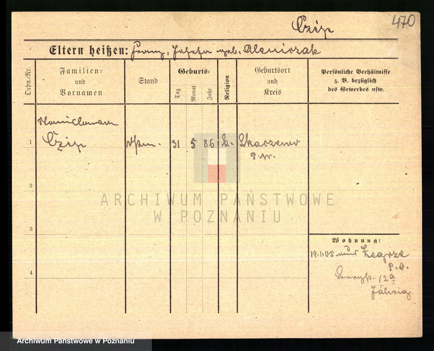 Podgląd karty osobowej dostępny jest po kliknięciu na nazwisko lub ikonkę karty. Można dokonywać powiększenia (ikony na górze) lub przechodzić między kolejnymi skanami (strzałki po bokach).