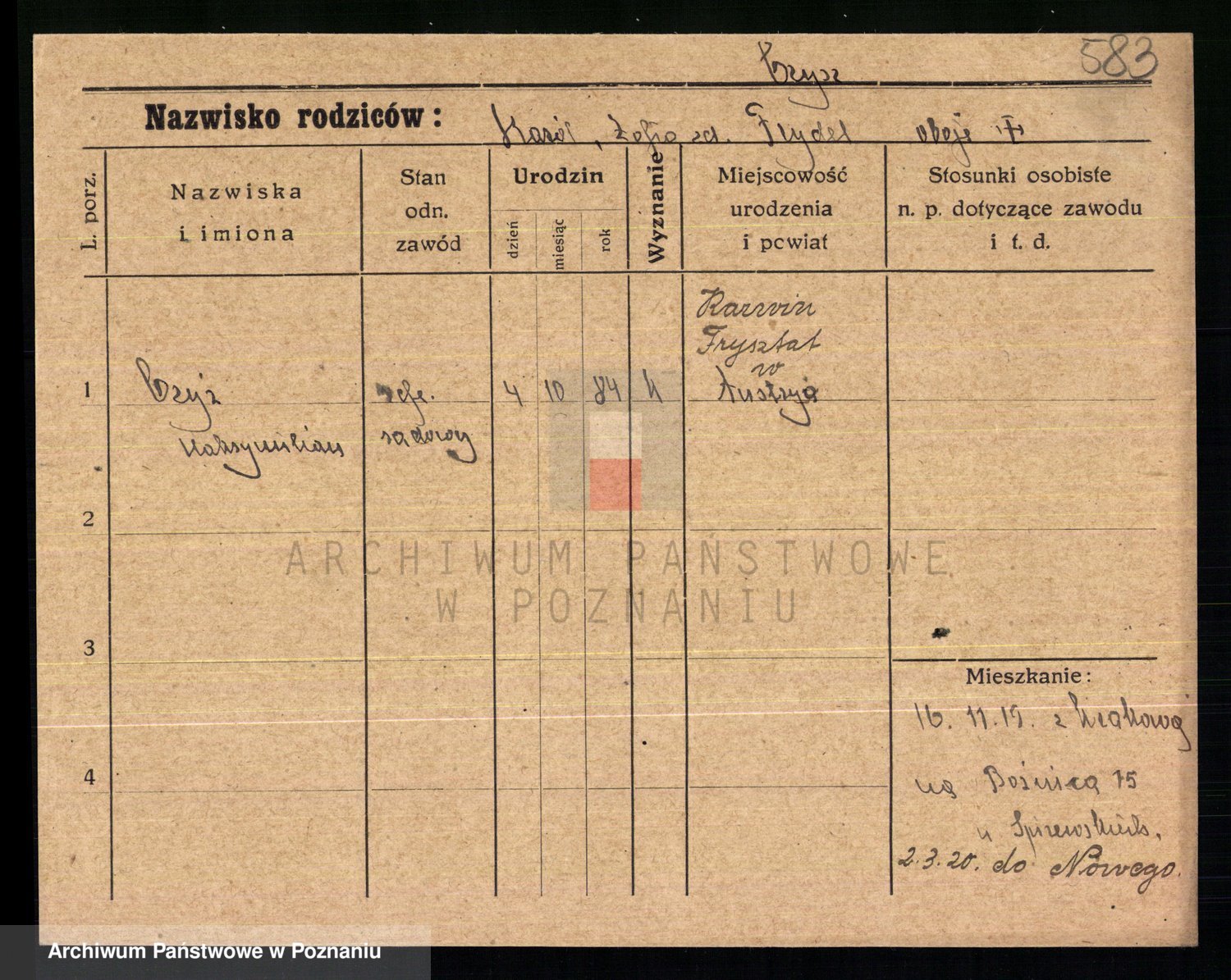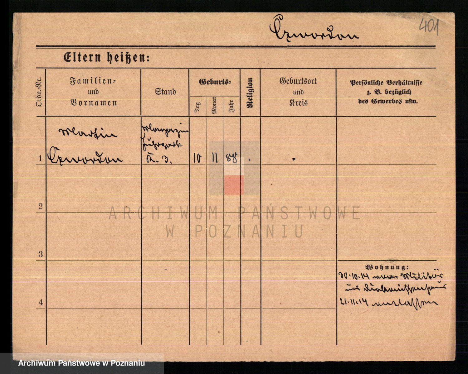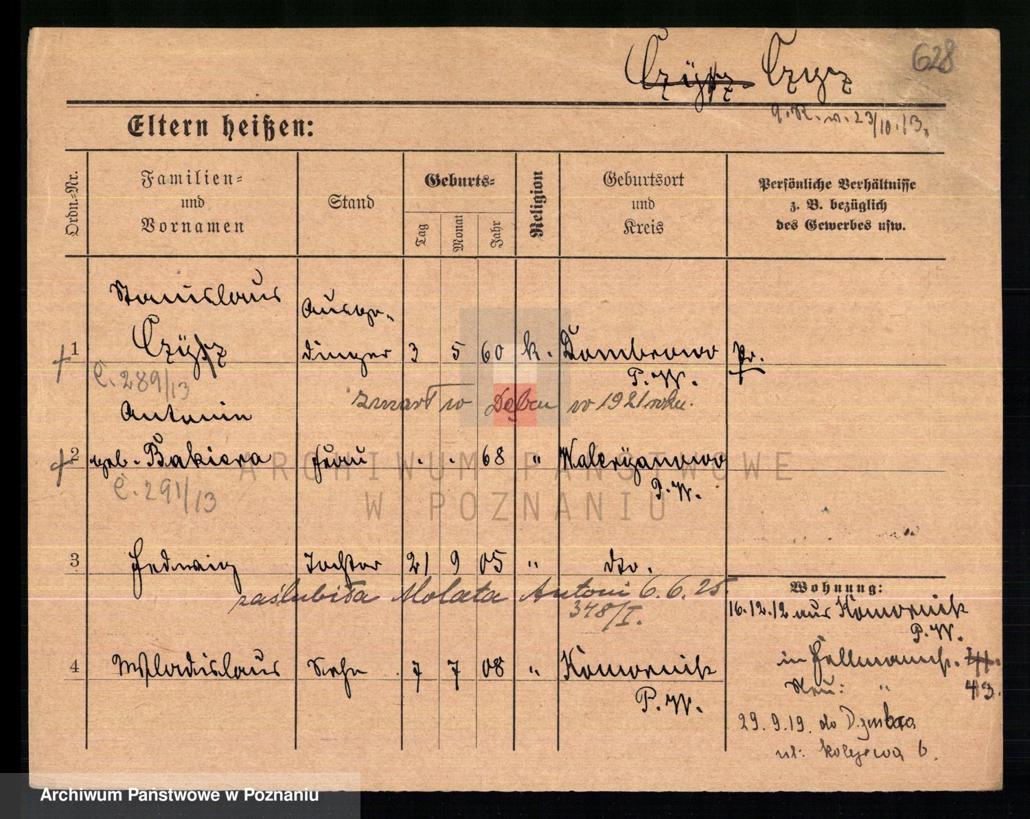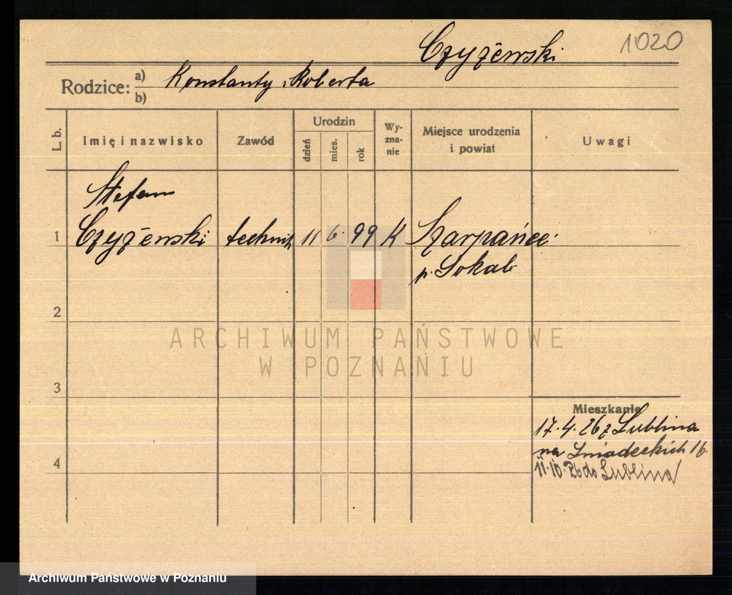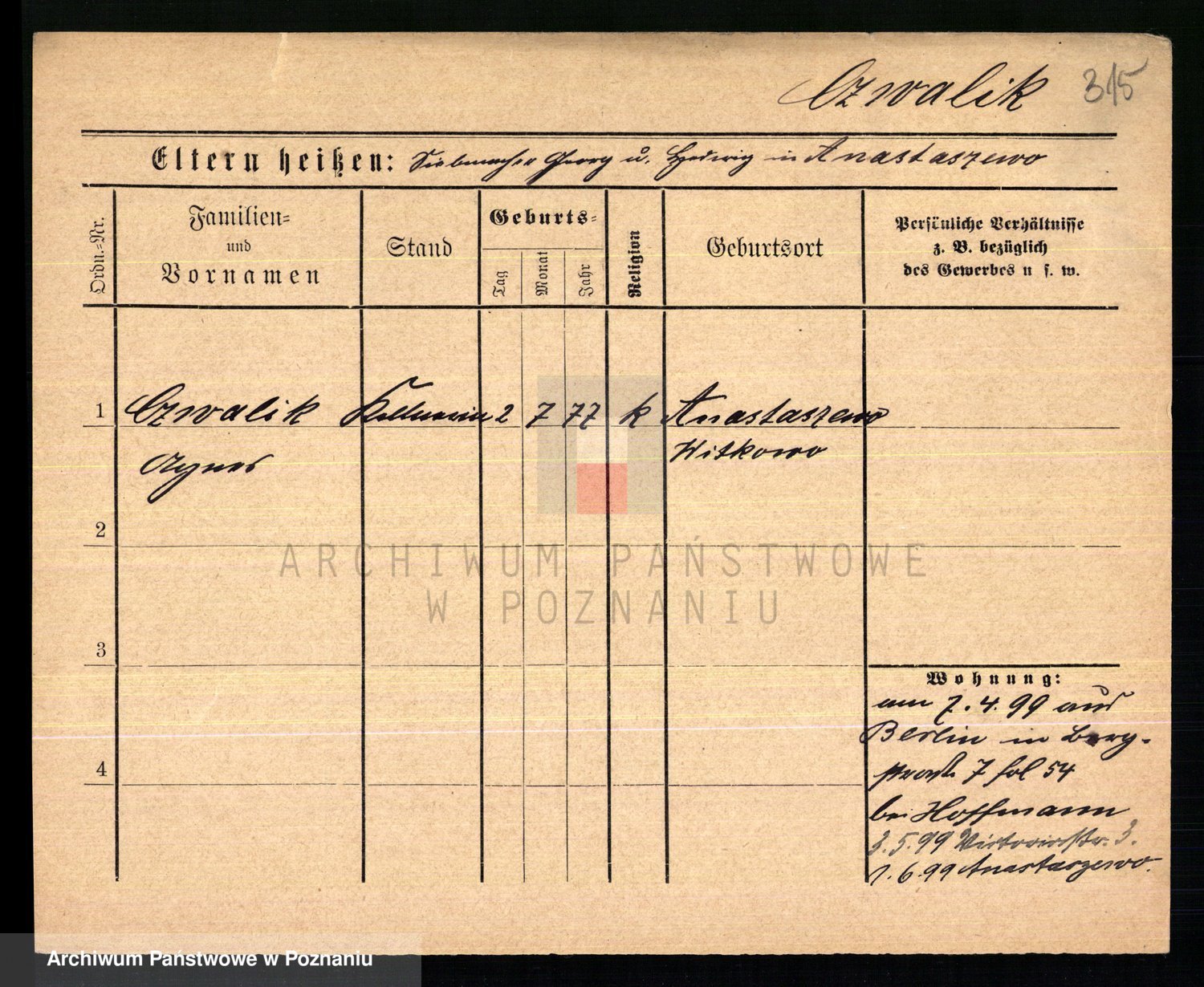 Podgląd karty osobowej dostępny jest po kliknięciu na nazwisko lub ikonkę karty. Można dokonywać powiększenia (ikony na górze) lub przechodzić między kolejnymi skanami (strzałki po bokach).