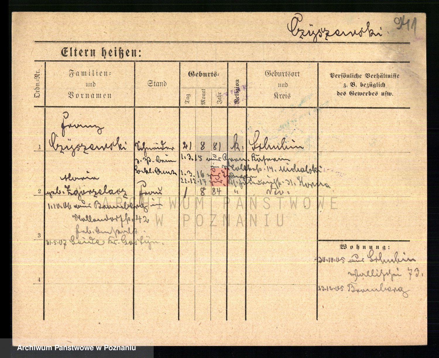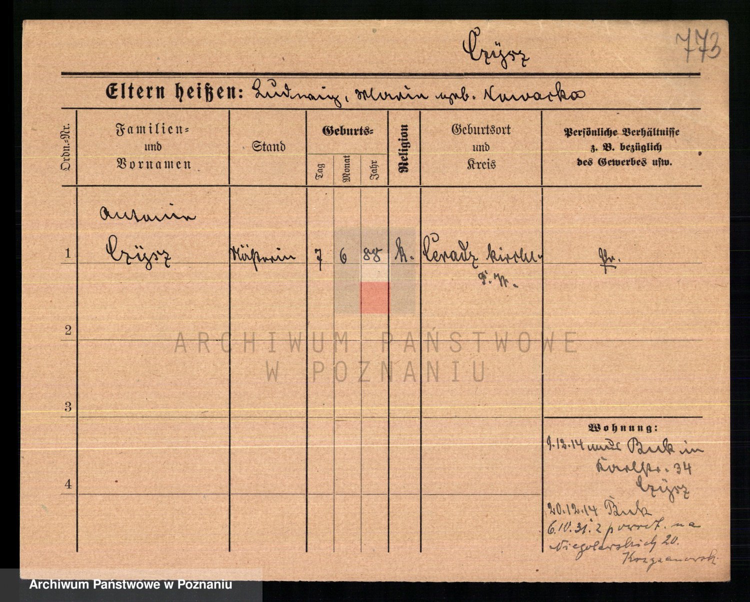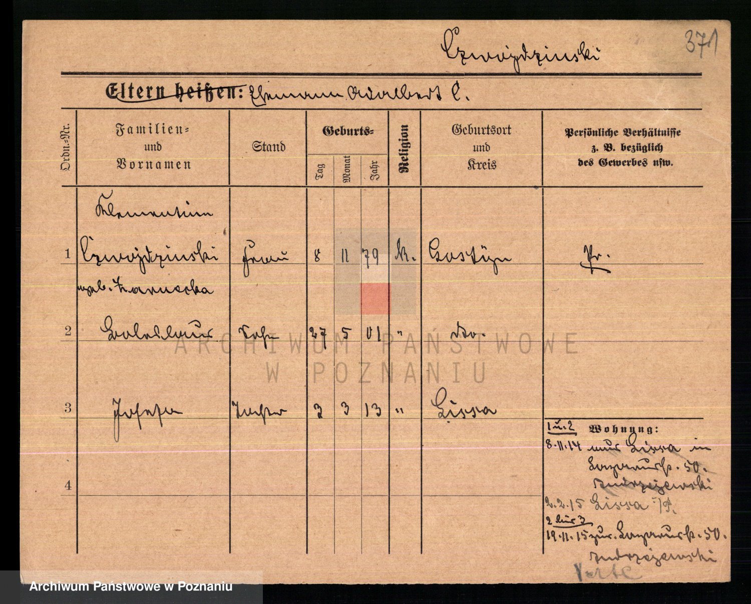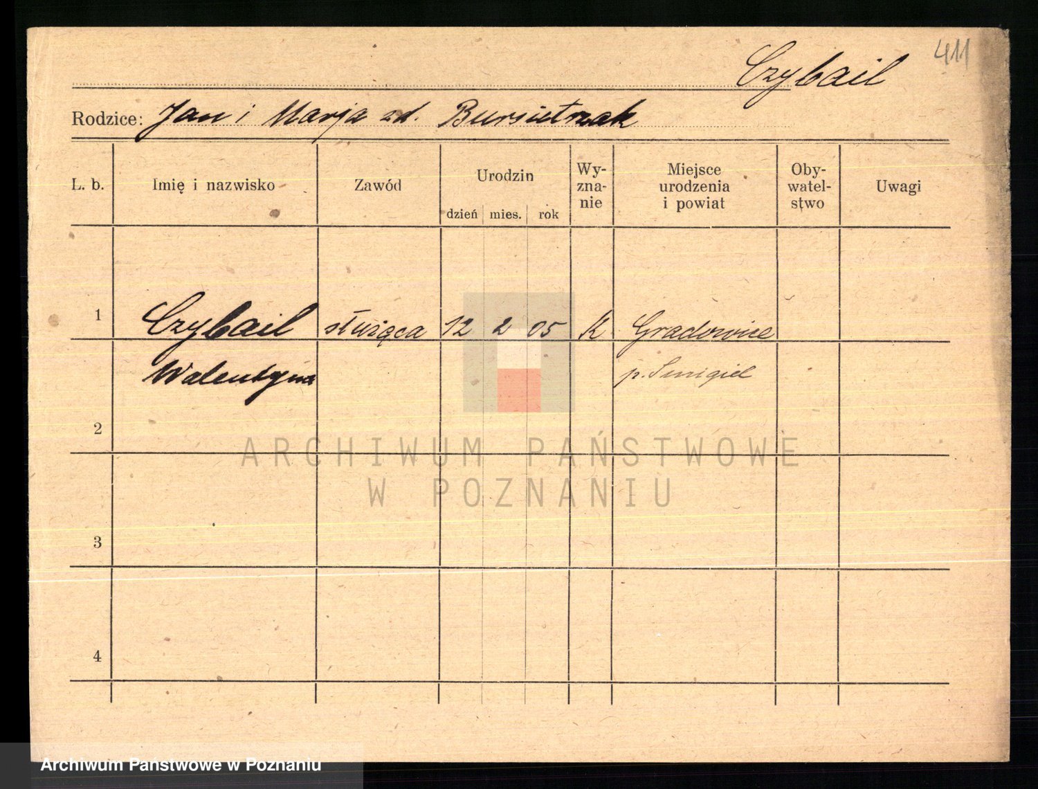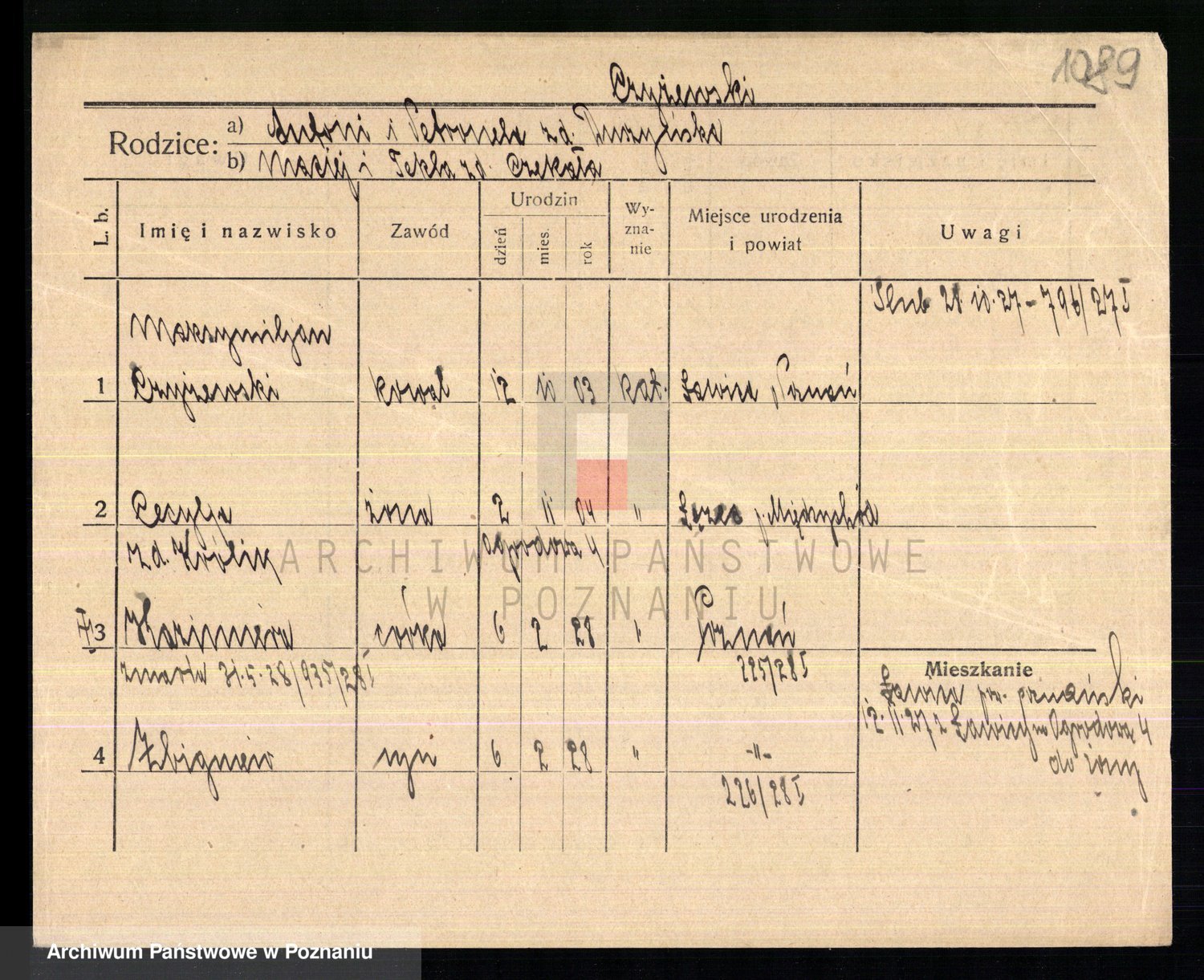 Podgląd karty osobowej dostępny jest po kliknięciu na nazwisko lub ikonkę karty. Można dokonywać powiększenia (ikony na górze) lub przechodzić między kolejnymi skanami (strzałki po bokach).