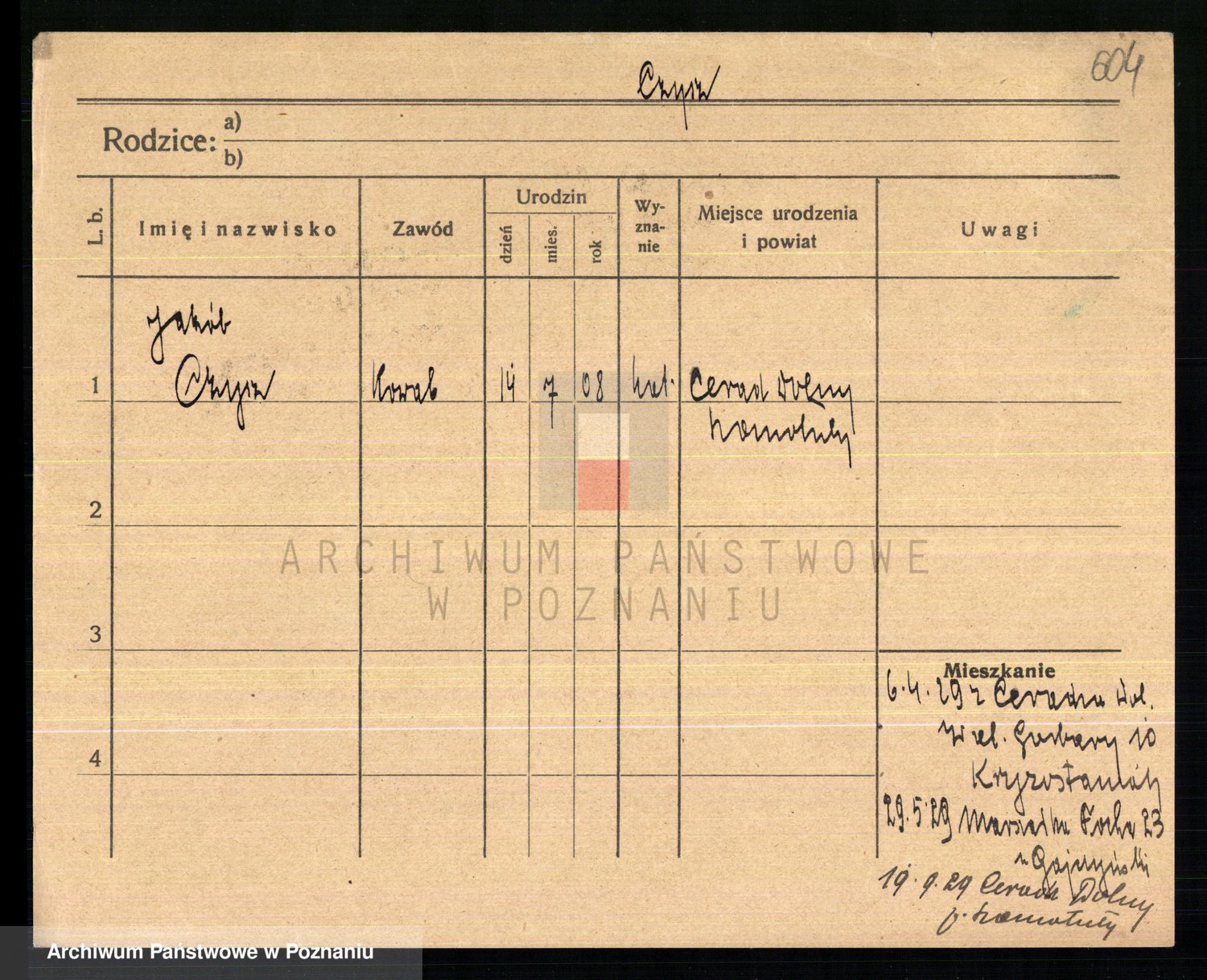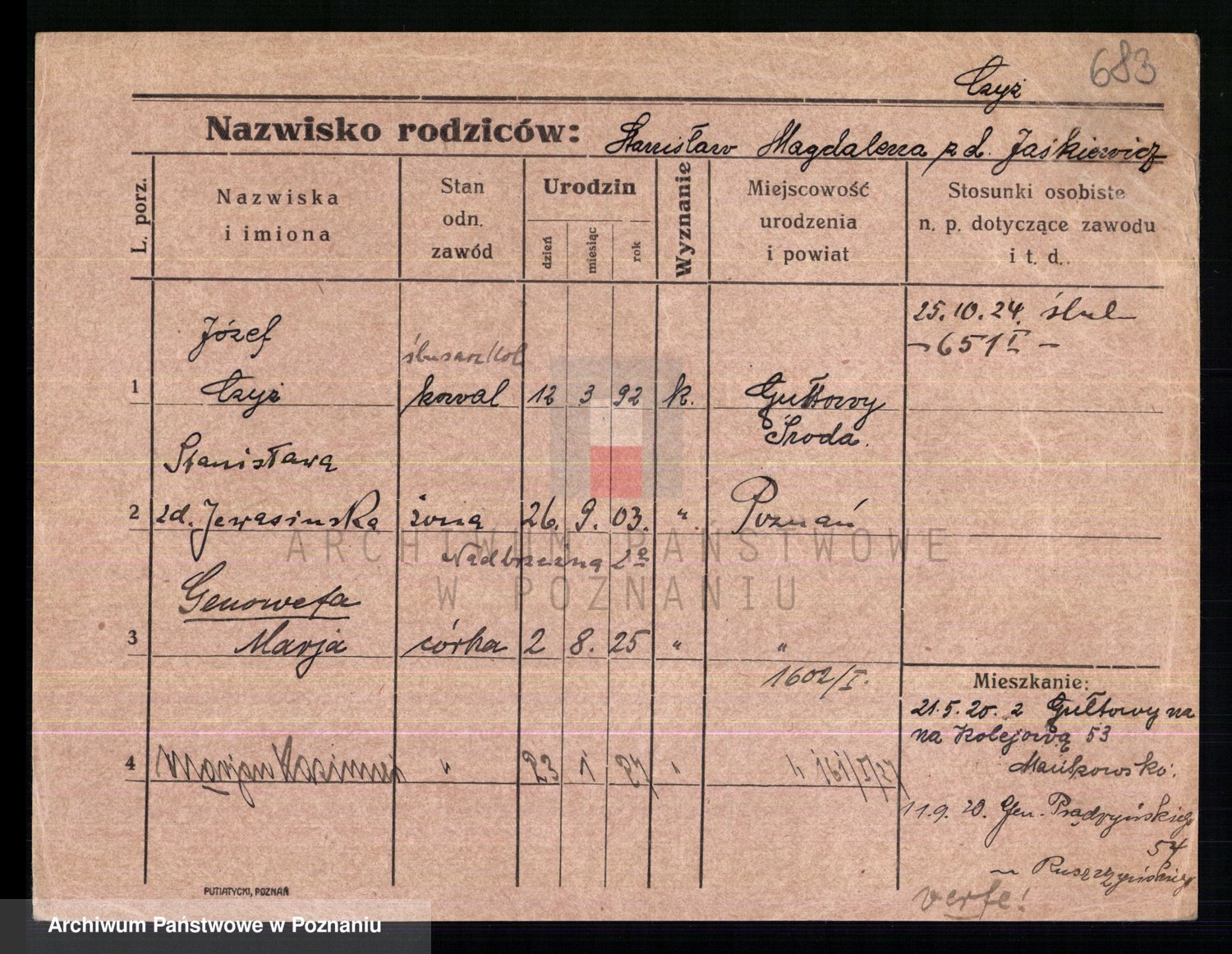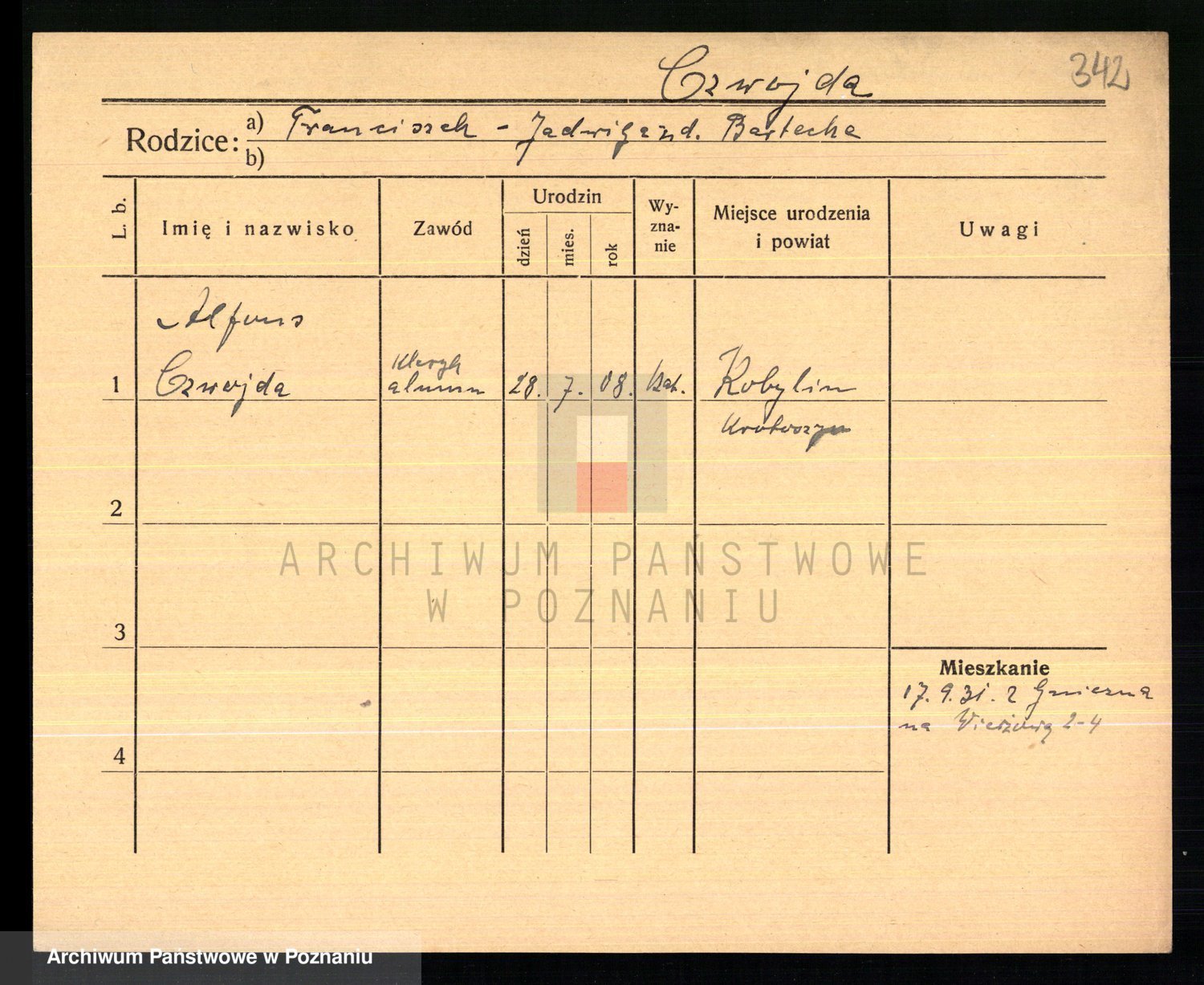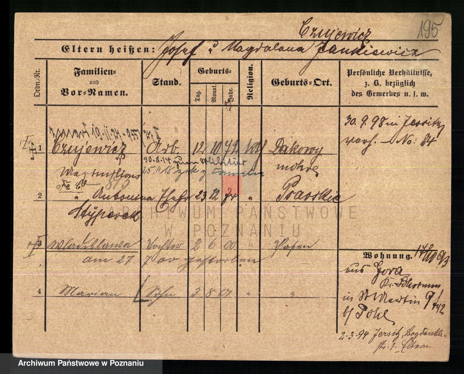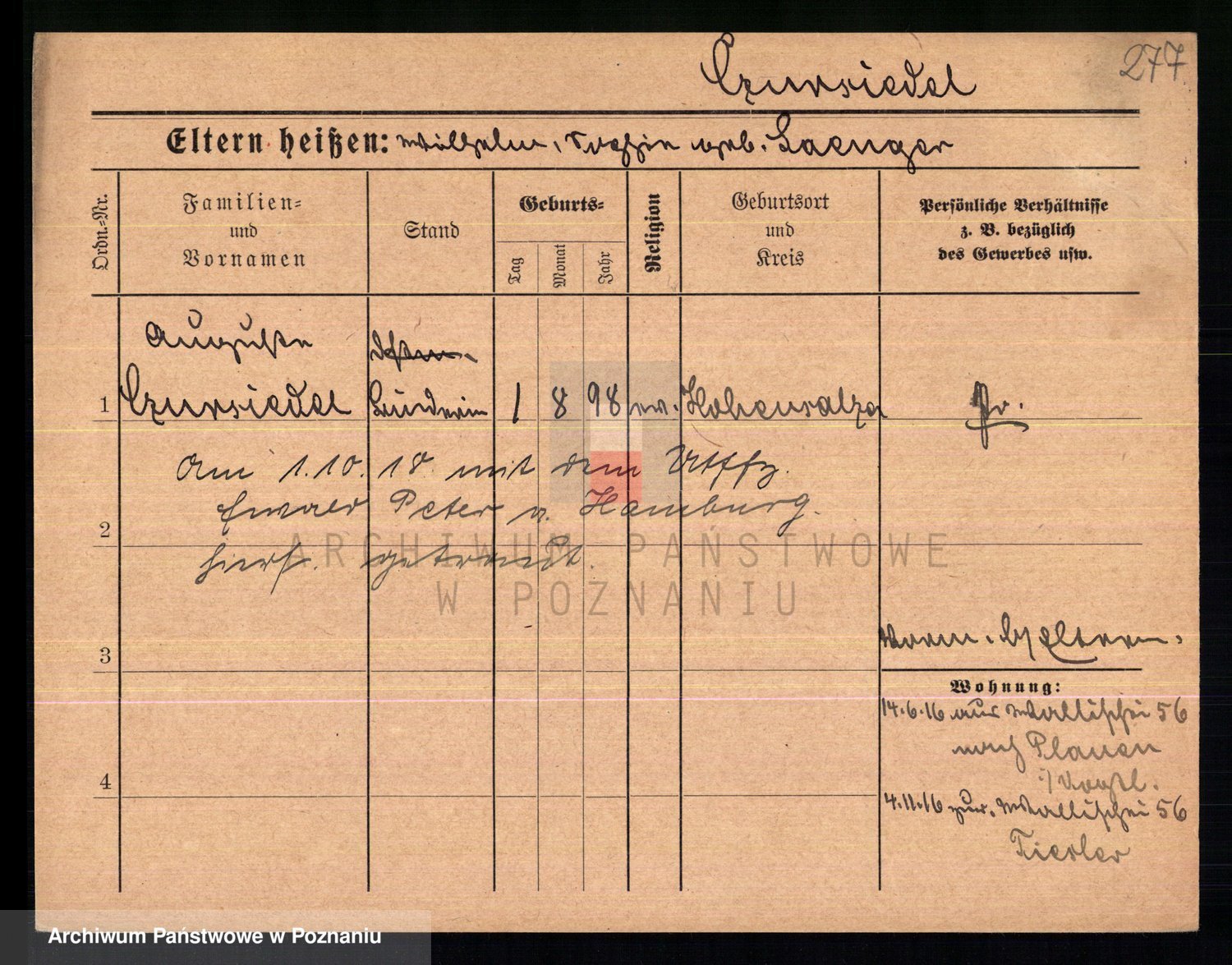 Podgląd karty osobowej dostępny jest po kliknięciu na nazwisko lub ikonkę karty. Można dokonywać powiększenia (ikony na górze) lub przechodzić między kolejnymi skanami (strzałki po bokach).