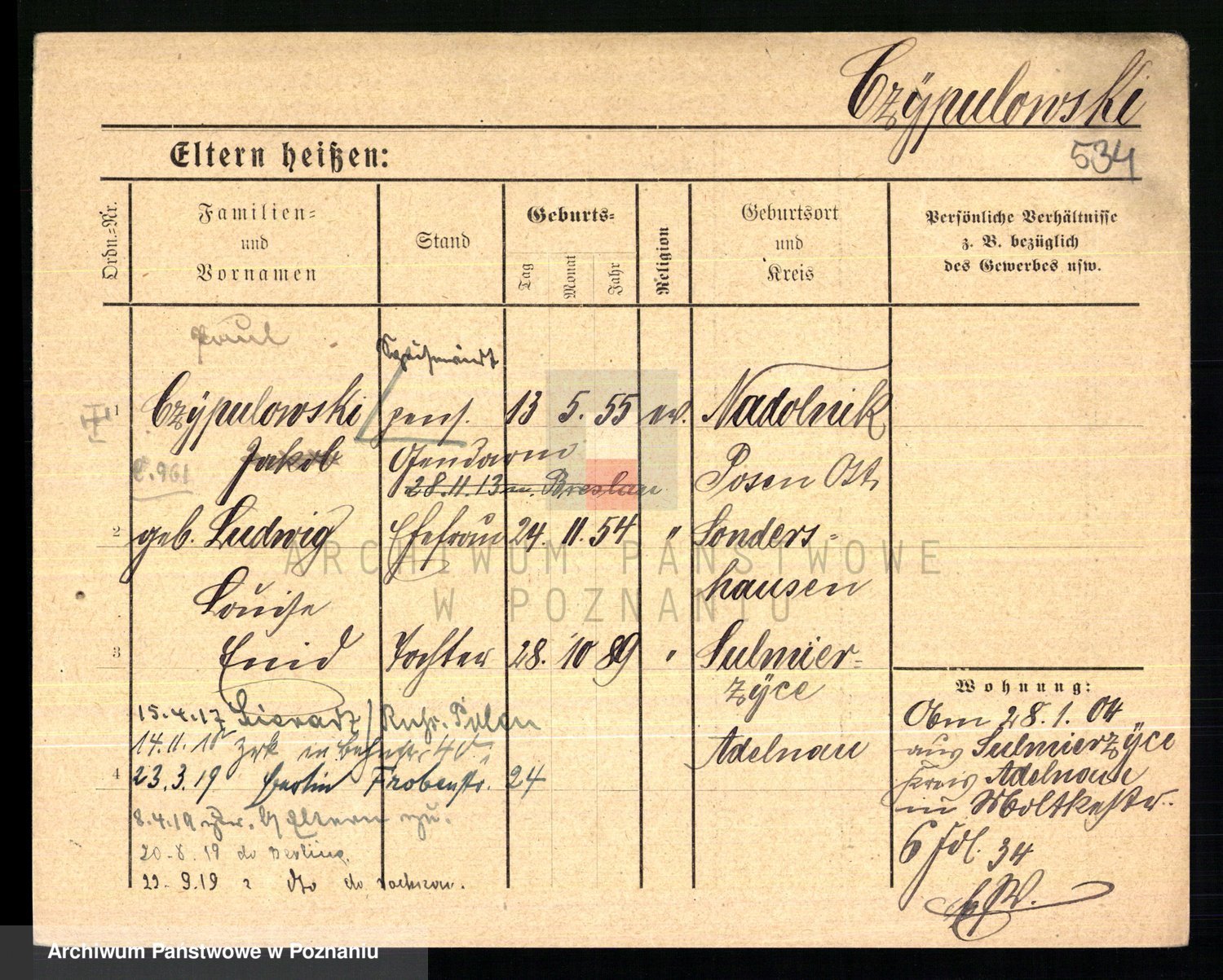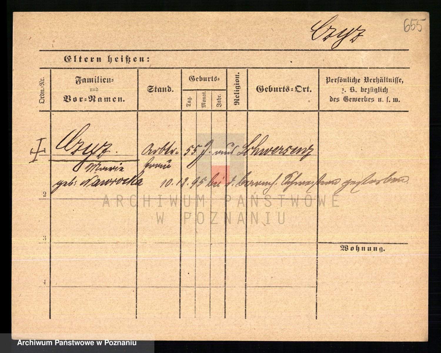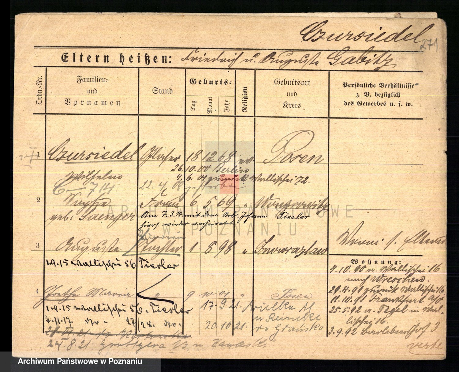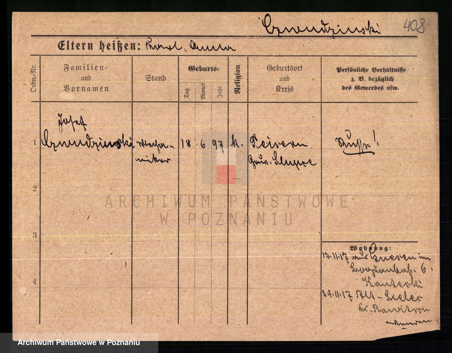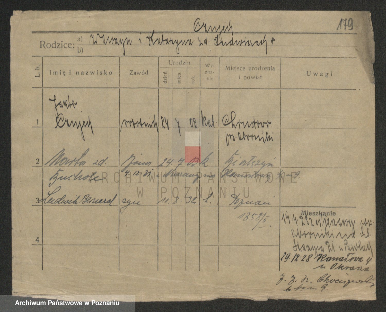 Podgląd karty osobowej dostępny jest po kliknięciu na nazwisko lub ikonkę karty. Można dokonywać powiększenia (ikony na górze) lub przechodzić między kolejnymi skanami (strzałki po bokach).
