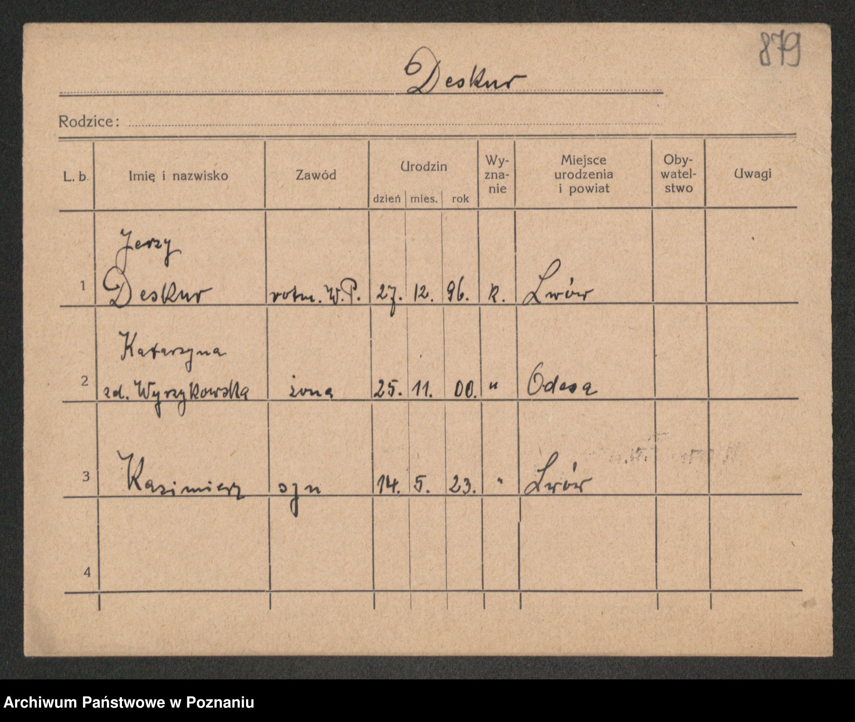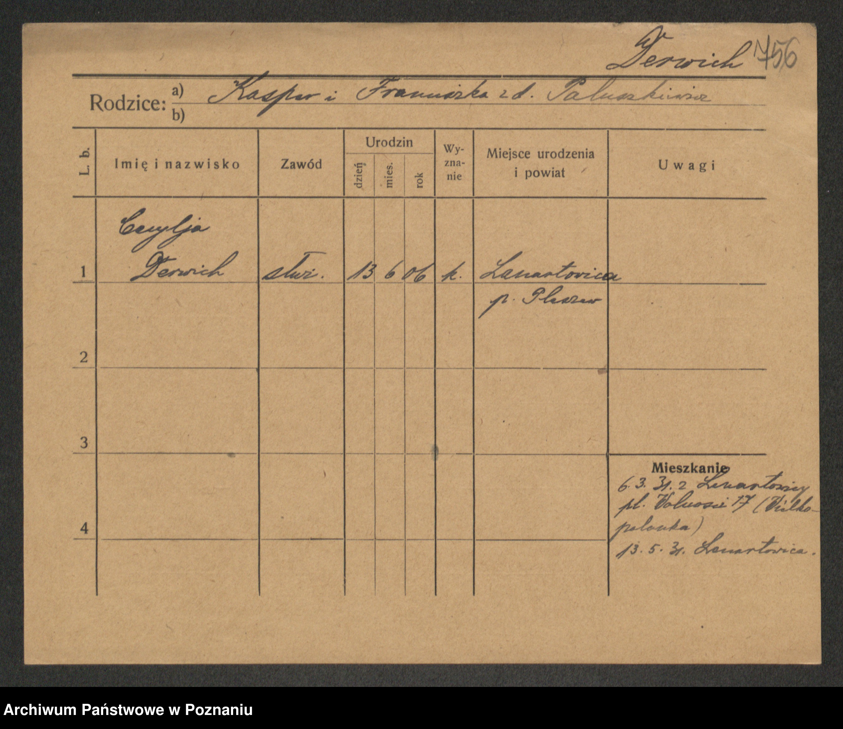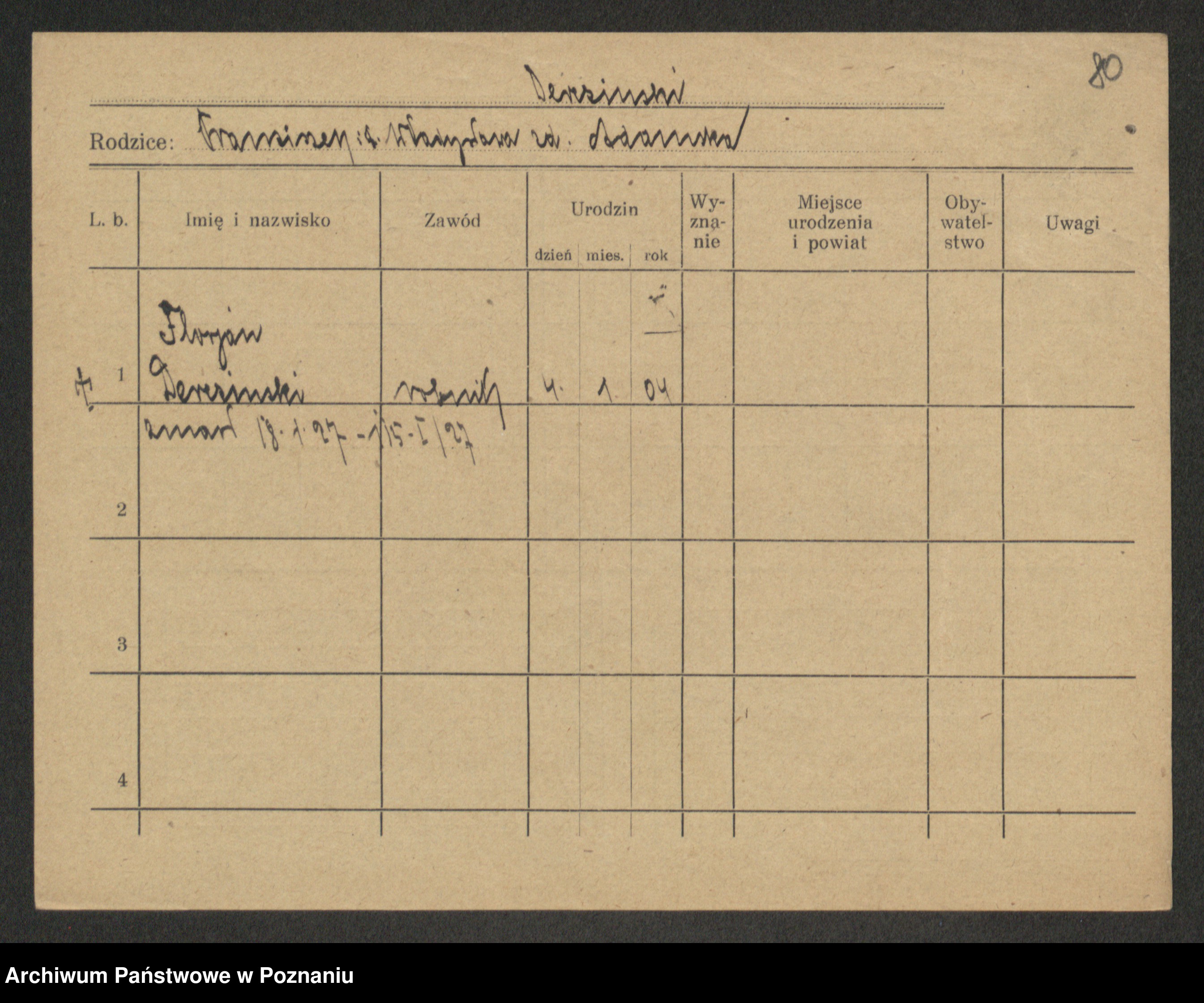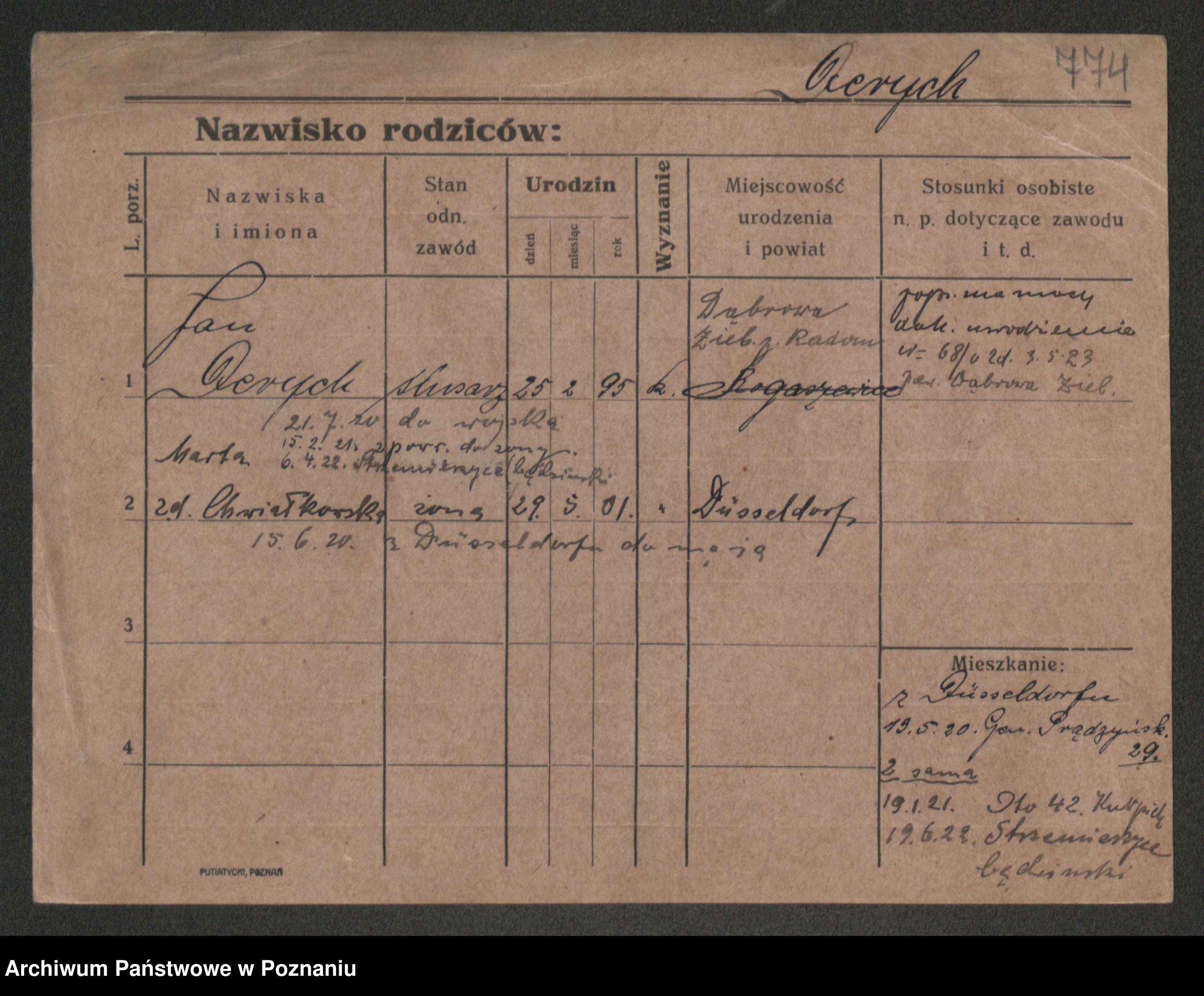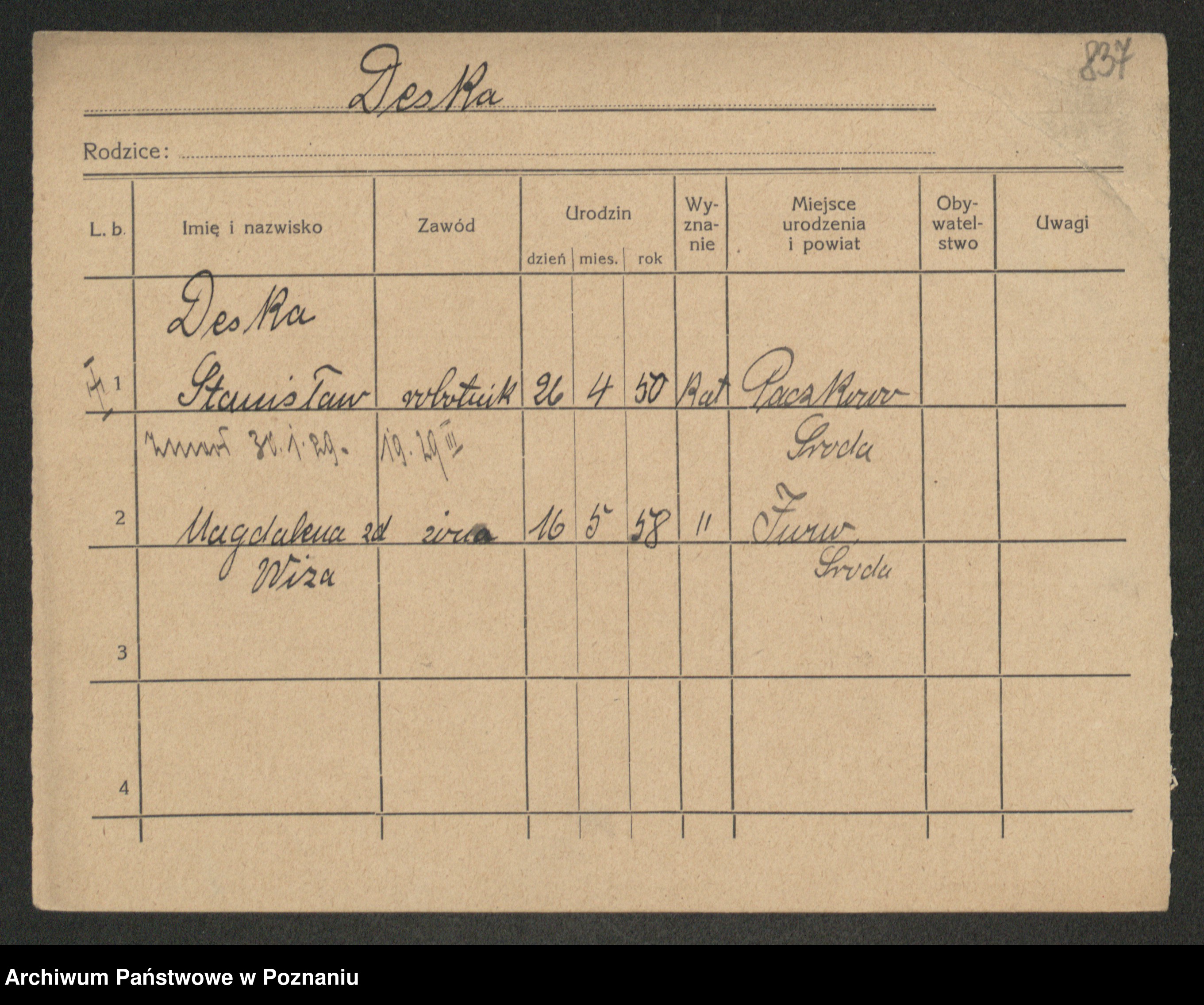Podgląd karty osobowej dostępny jest po kliknięciu na nazwisko lub ikonkę karty. Można dokonywać powiększenia (ikony na górze) lub przechodzić między kolejnymi skanami (strzałki po bokach).