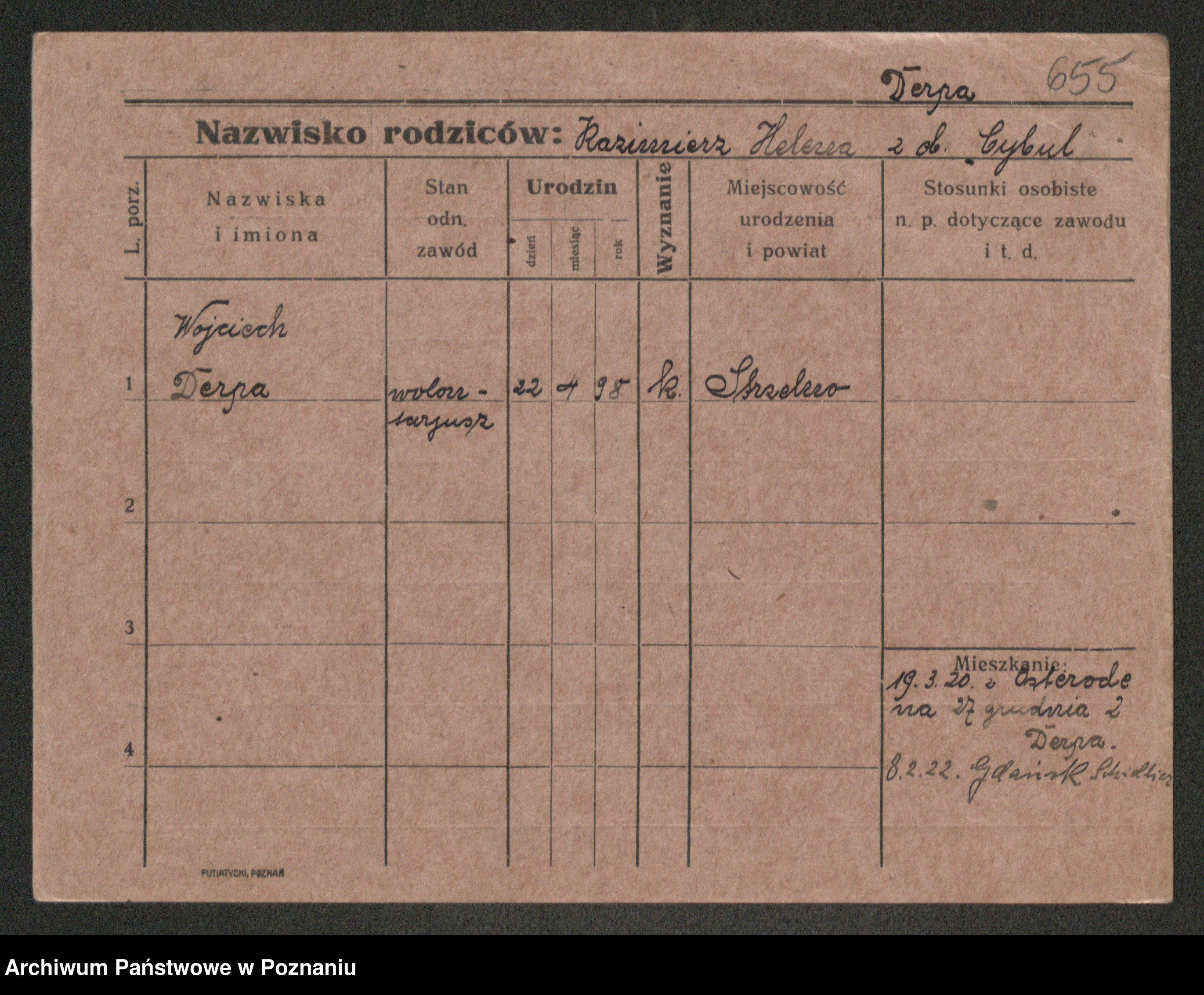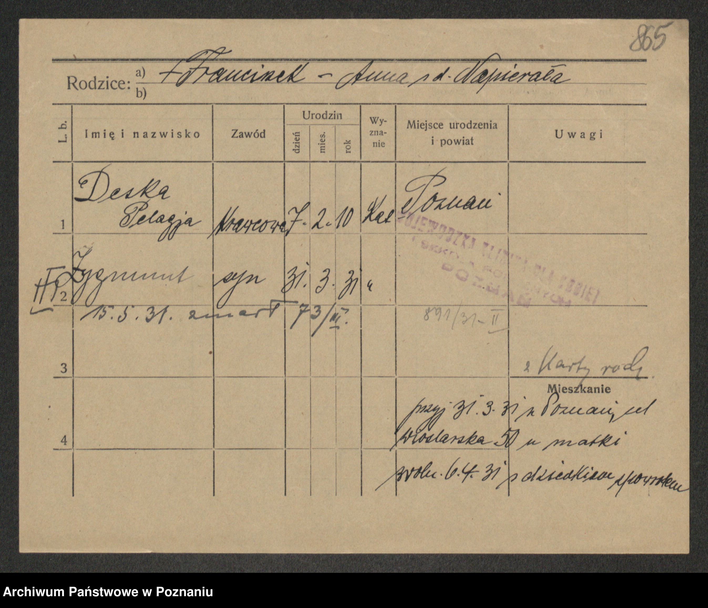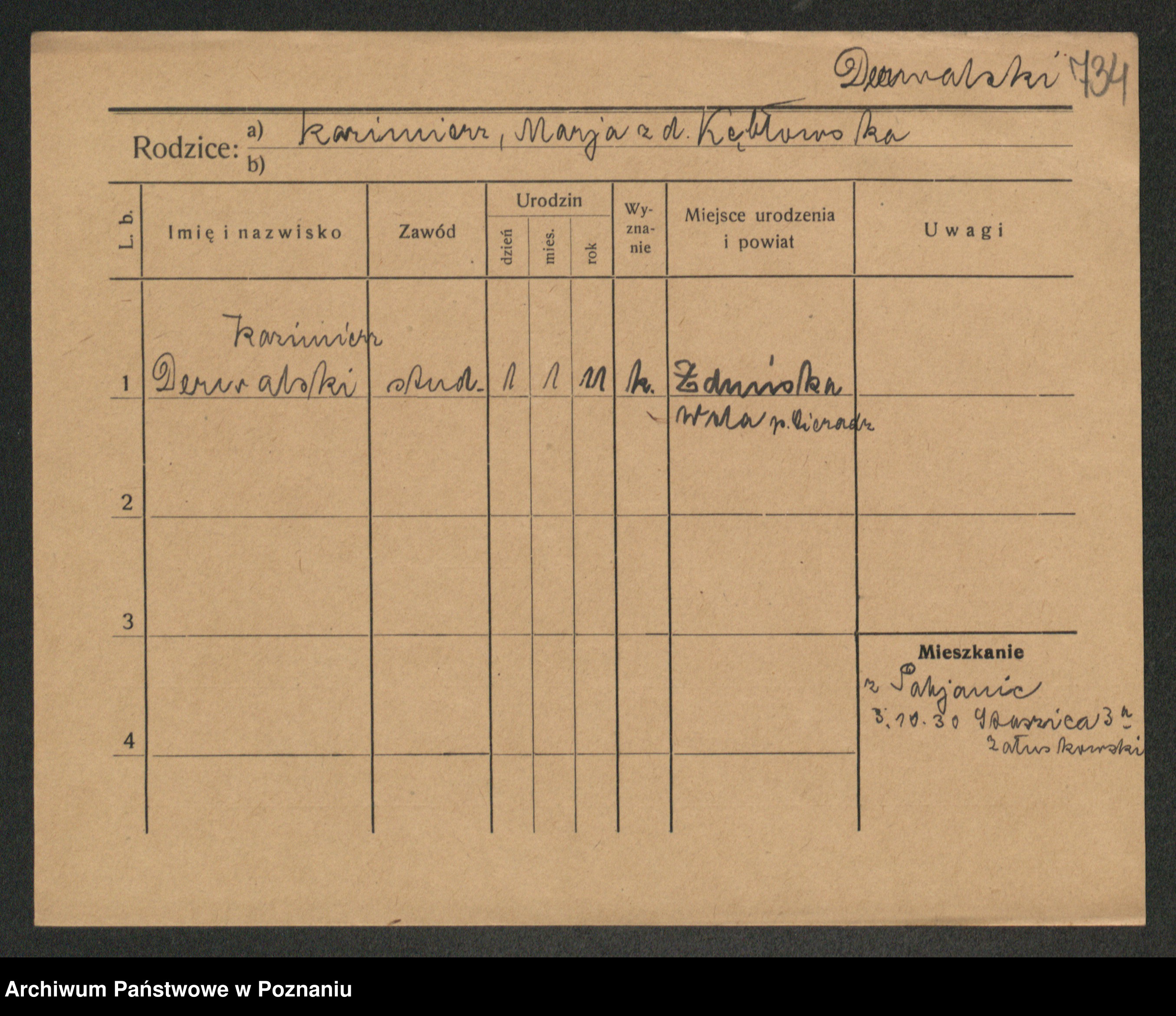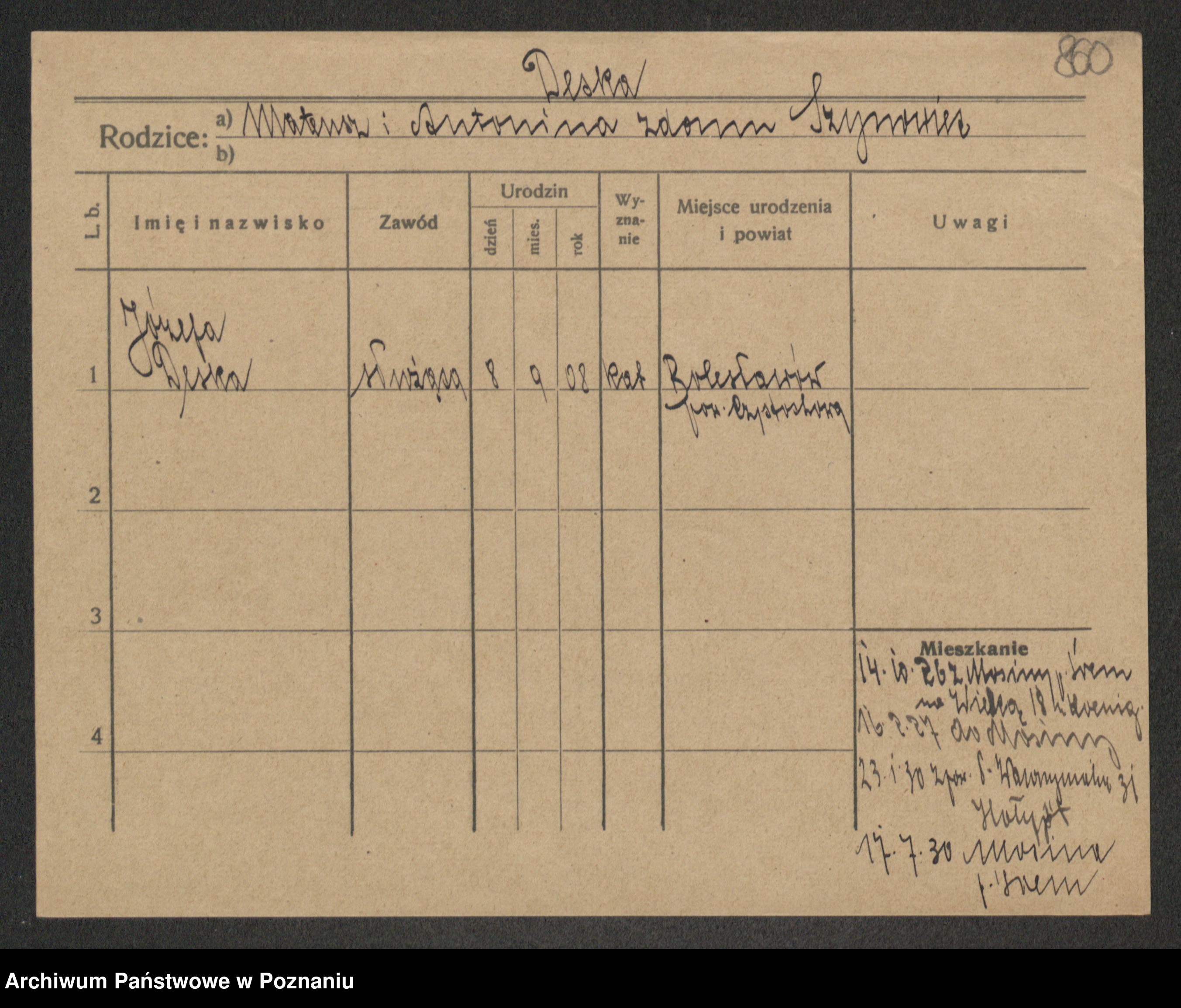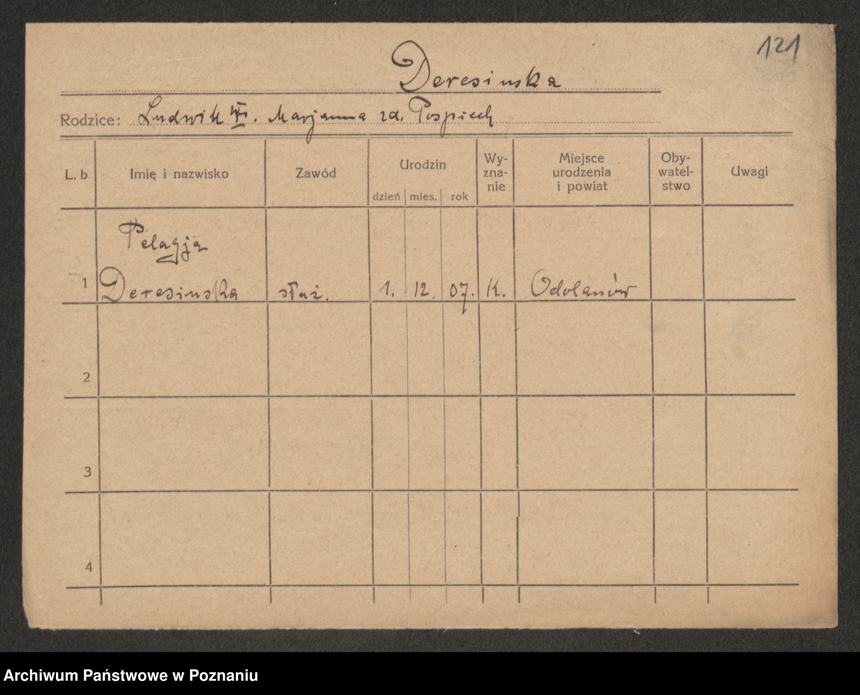 Podgląd karty osobowej dostępny jest po kliknięciu na nazwisko lub ikonkę karty. Można dokonywać powiększenia (ikony na górze) lub przechodzić między kolejnymi skanami (strzałki po bokach).
