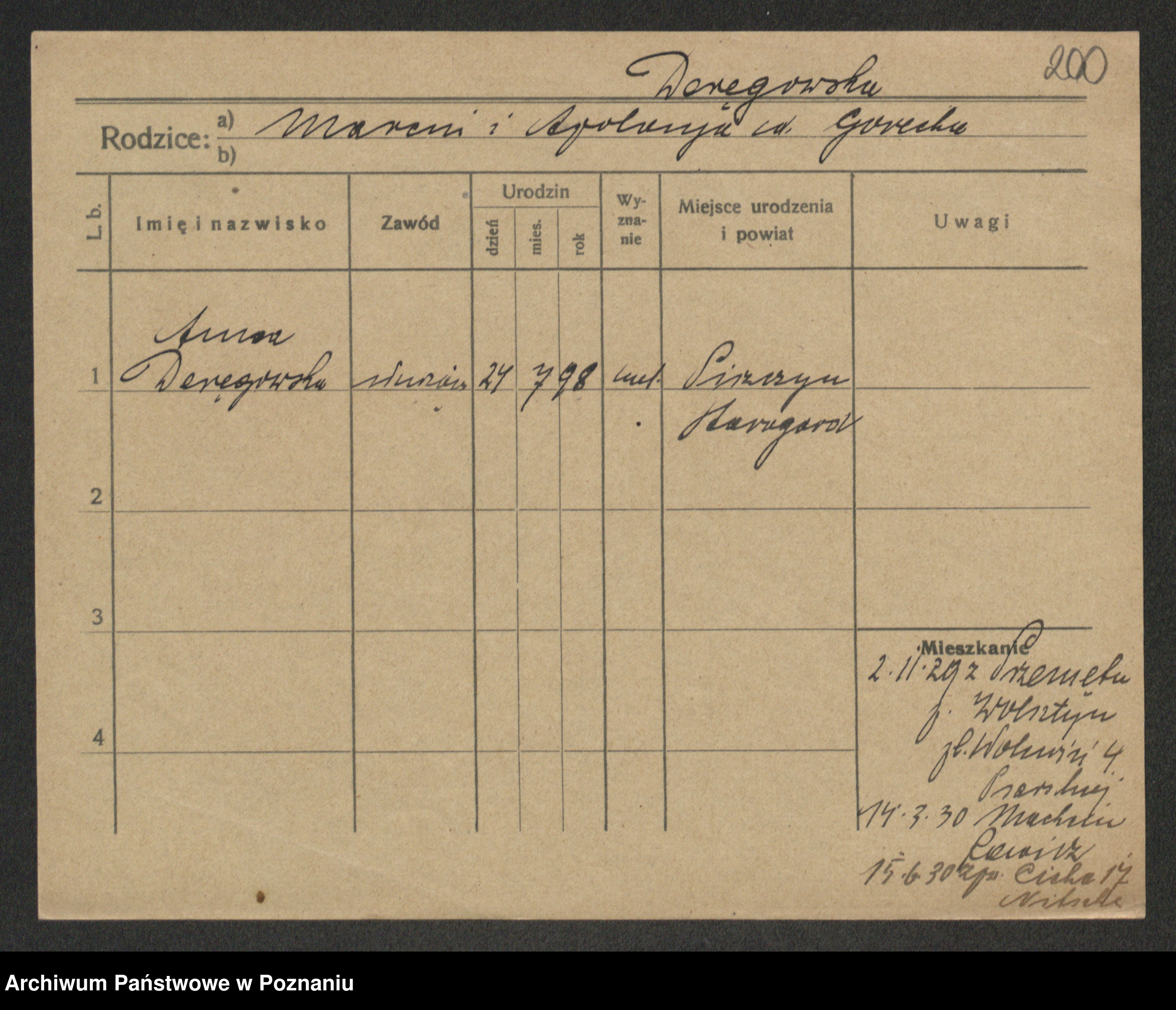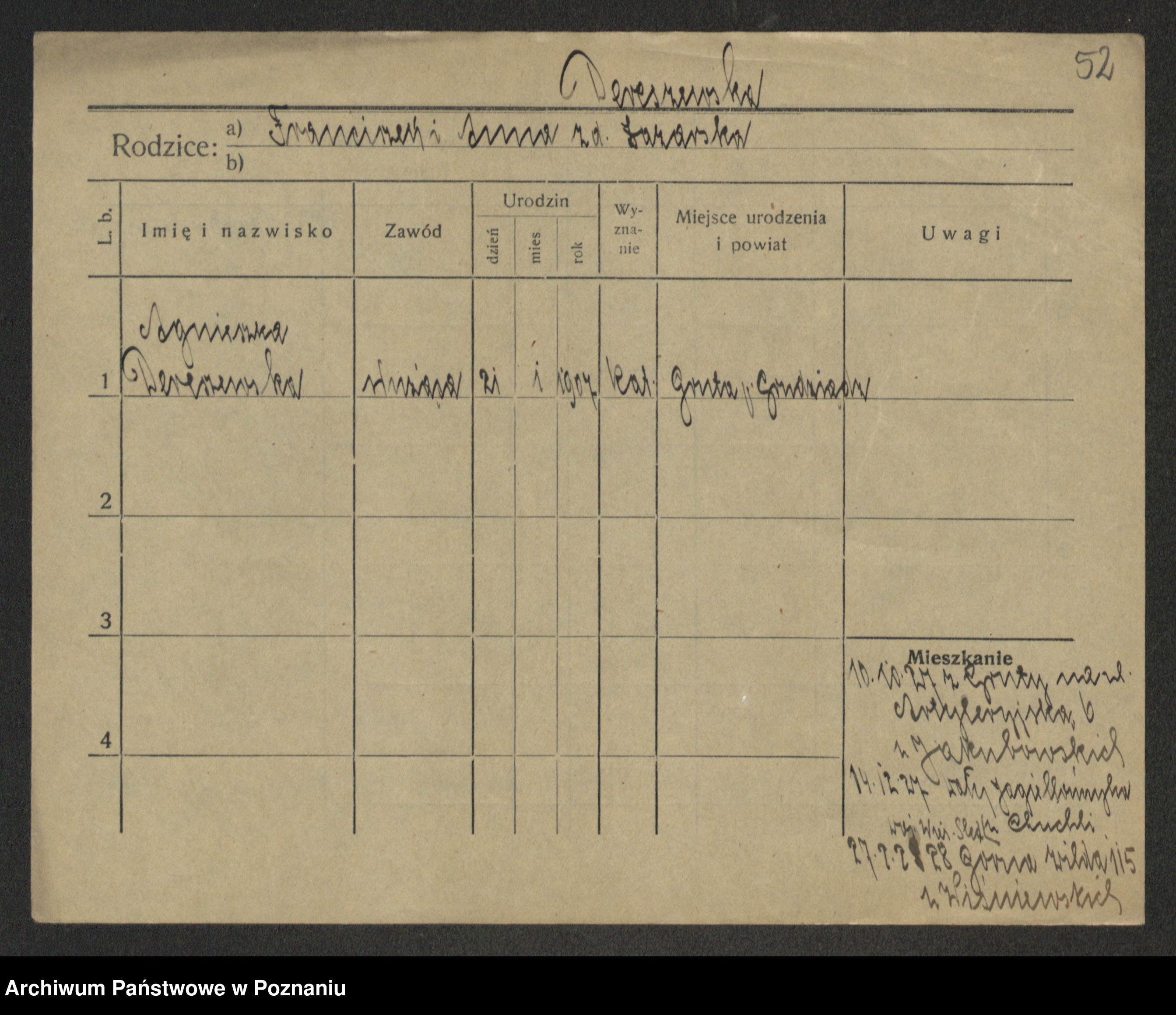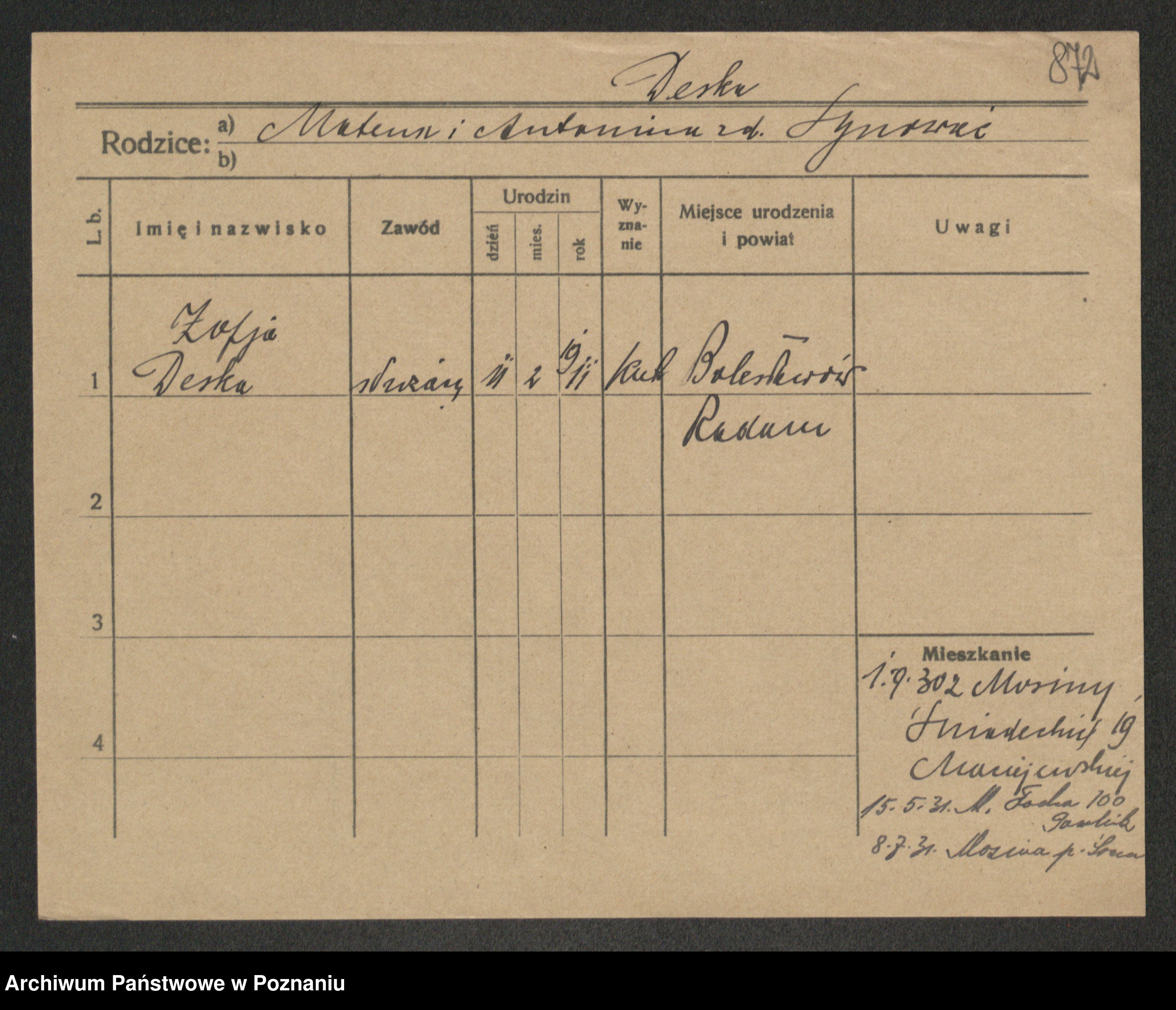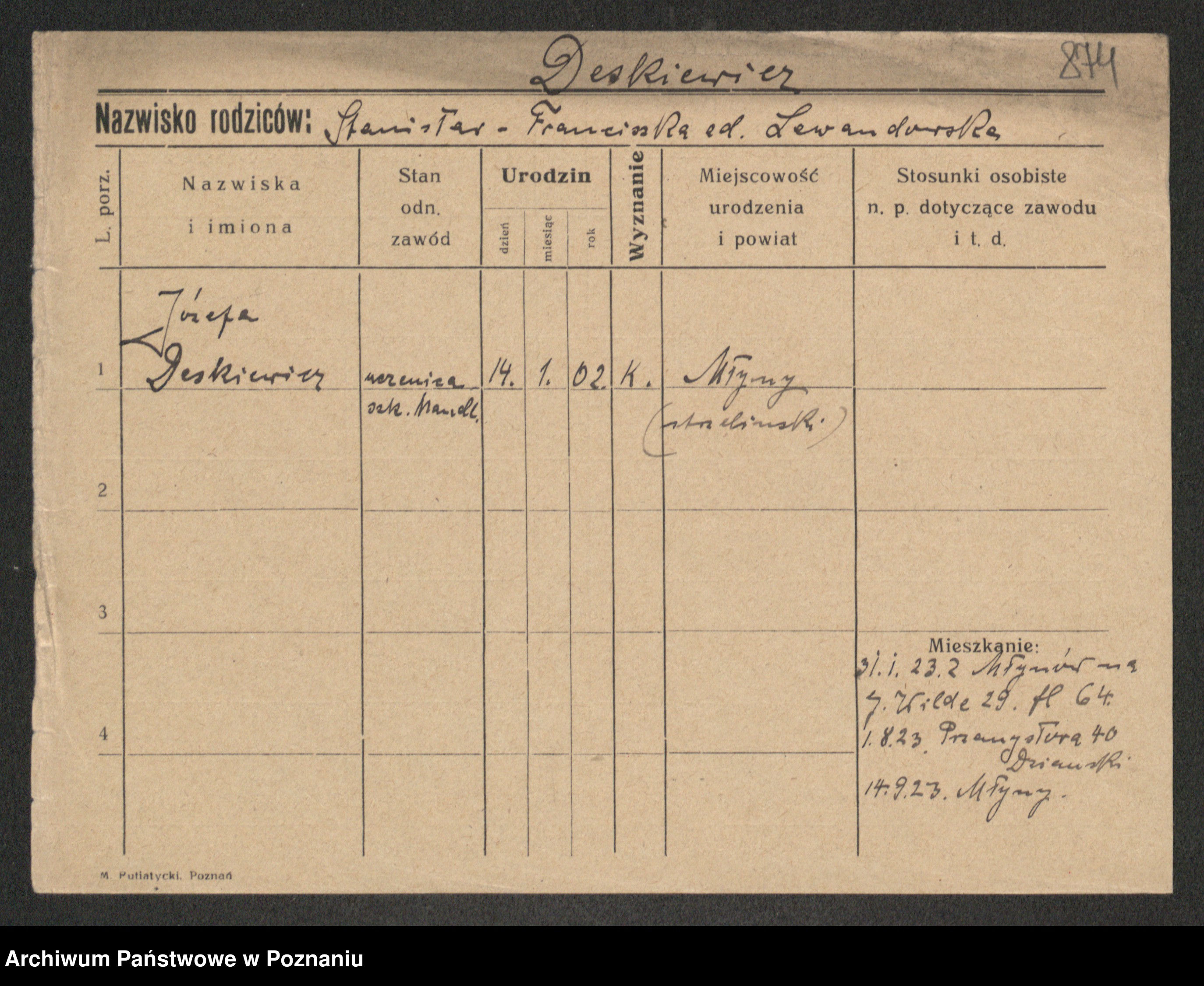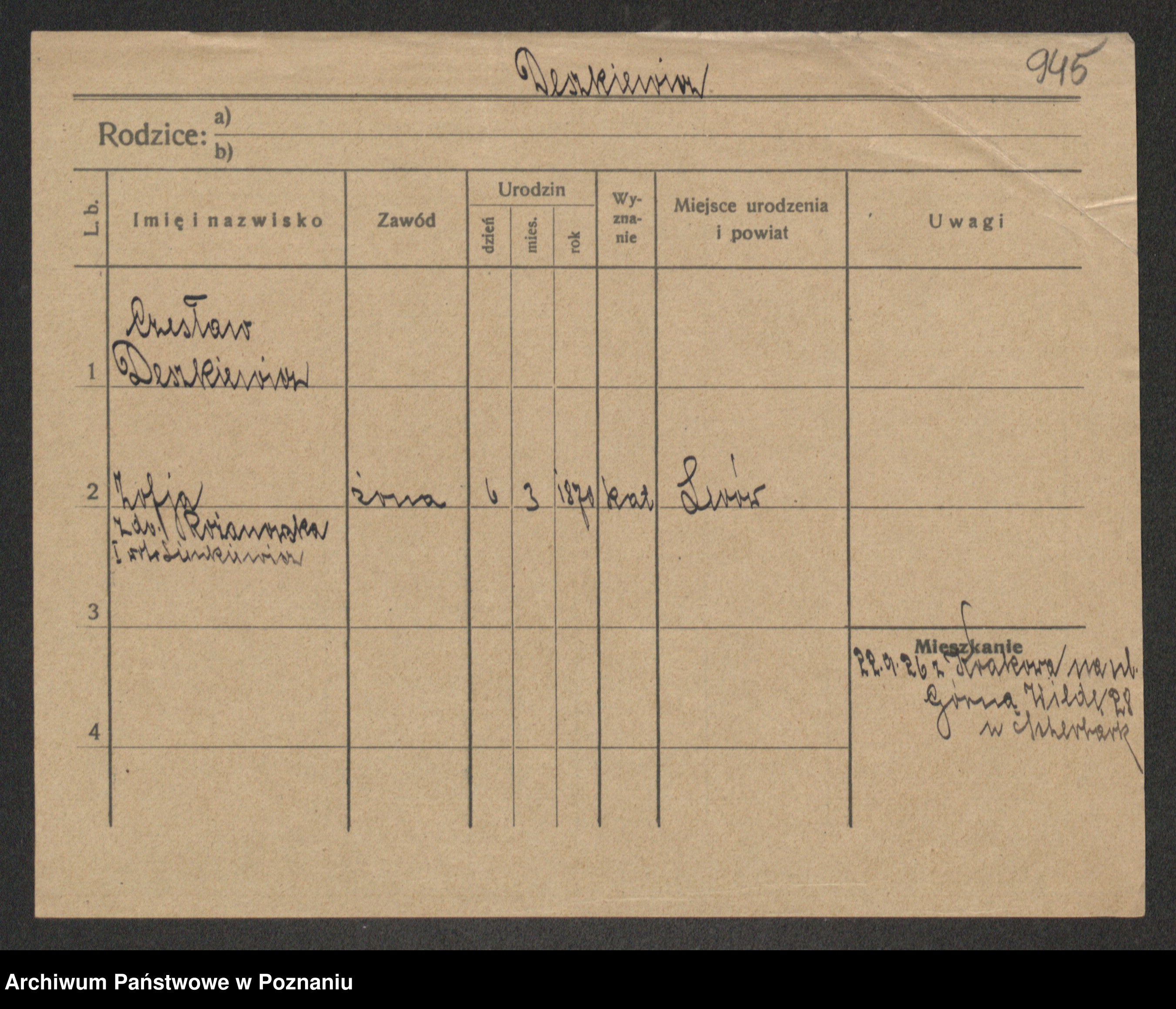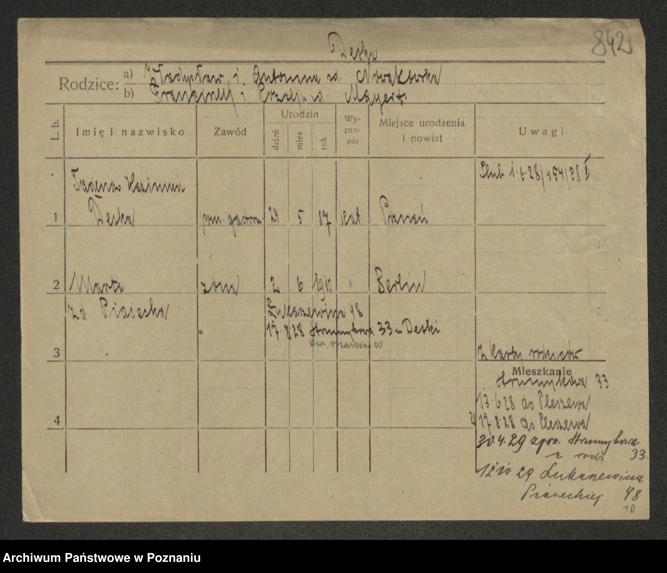 Podgląd karty osobowej dostępny jest po kliknięciu na nazwisko lub ikonkę karty. Można dokonywać powiększenia (ikony na górze) lub przechodzić między kolejnymi skanami (strzałki po bokach).