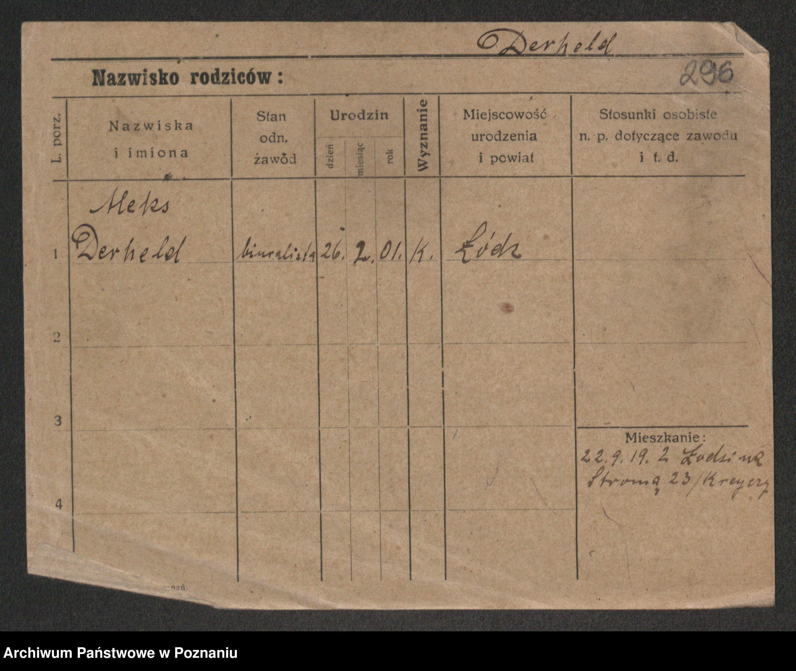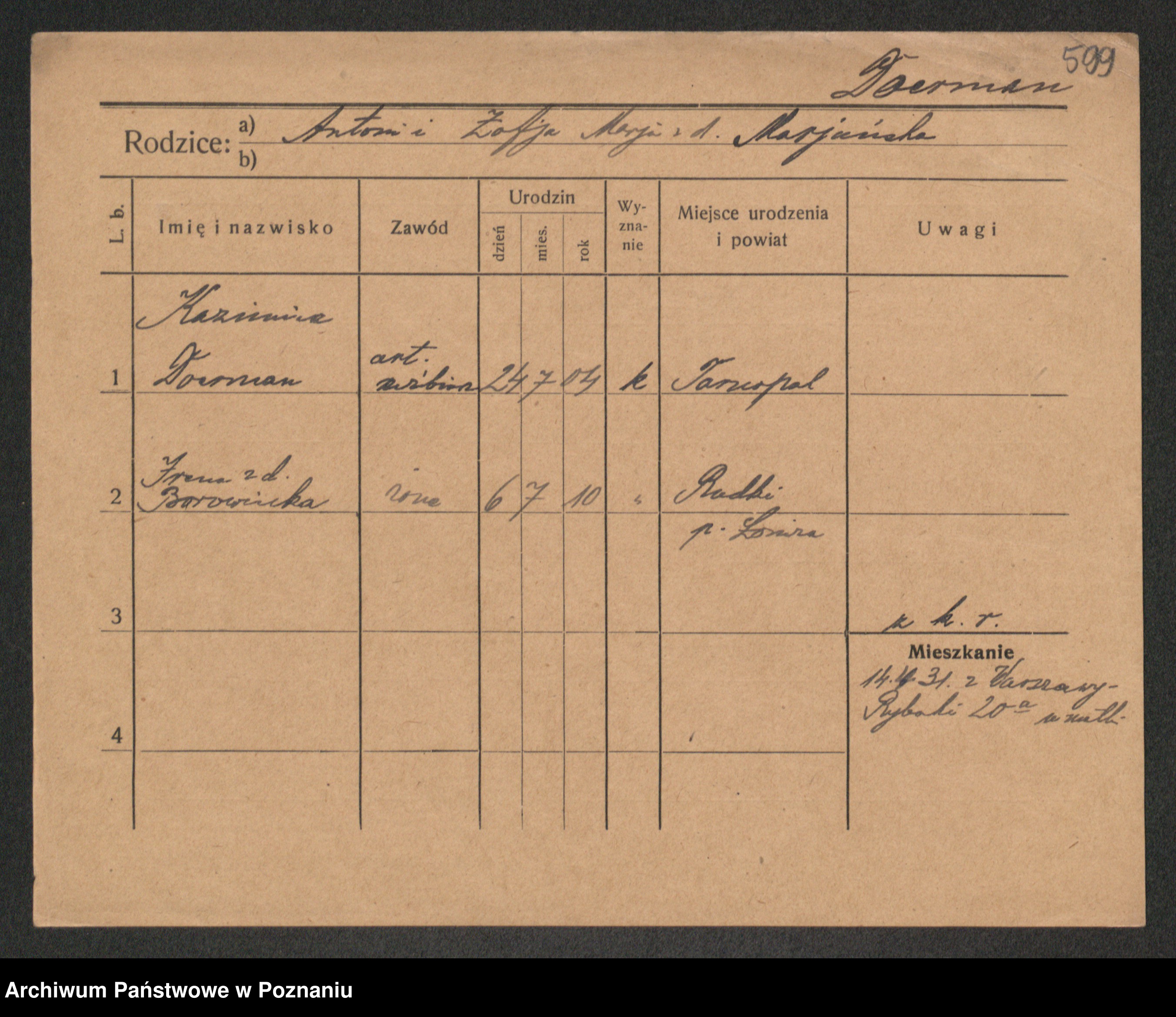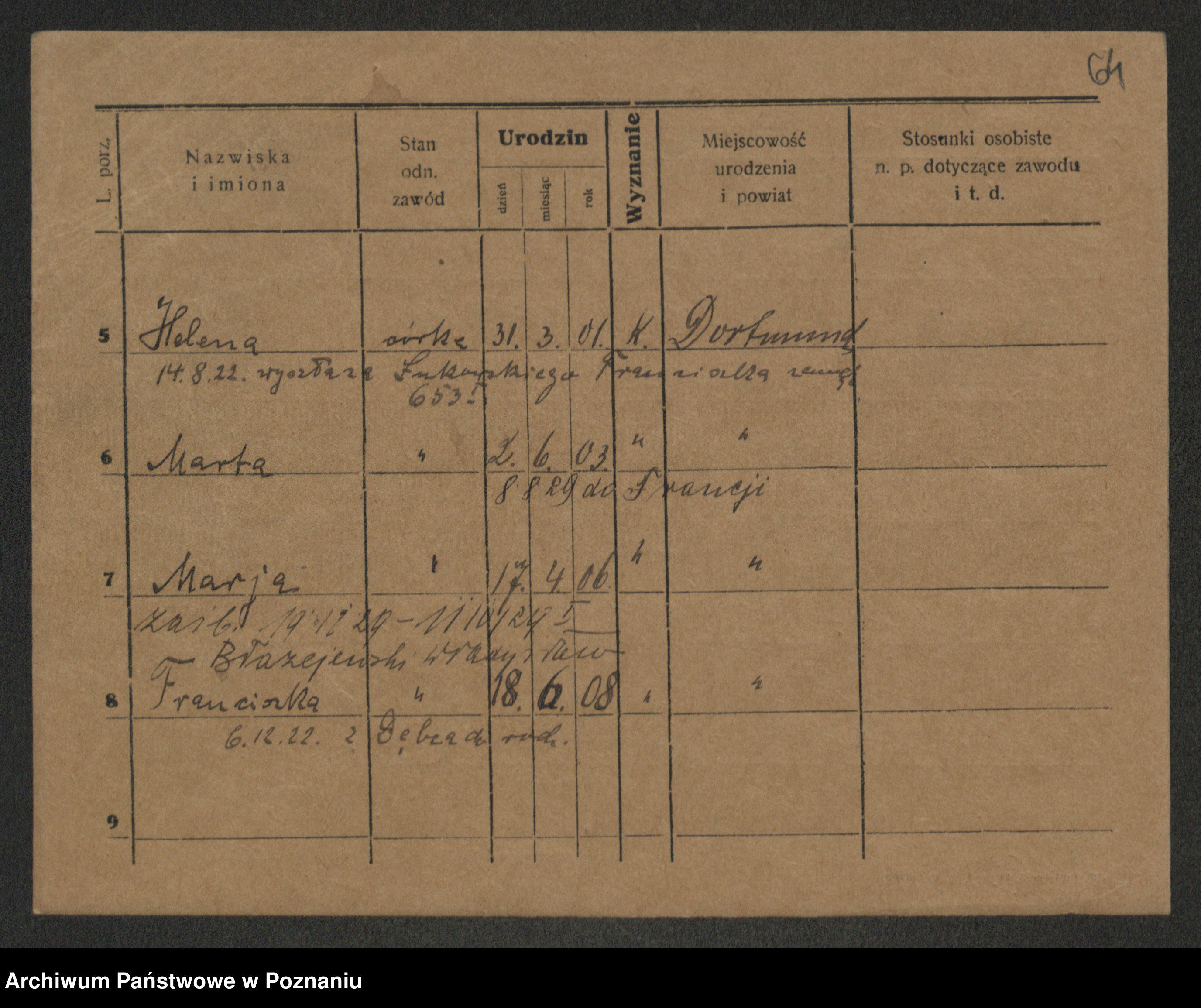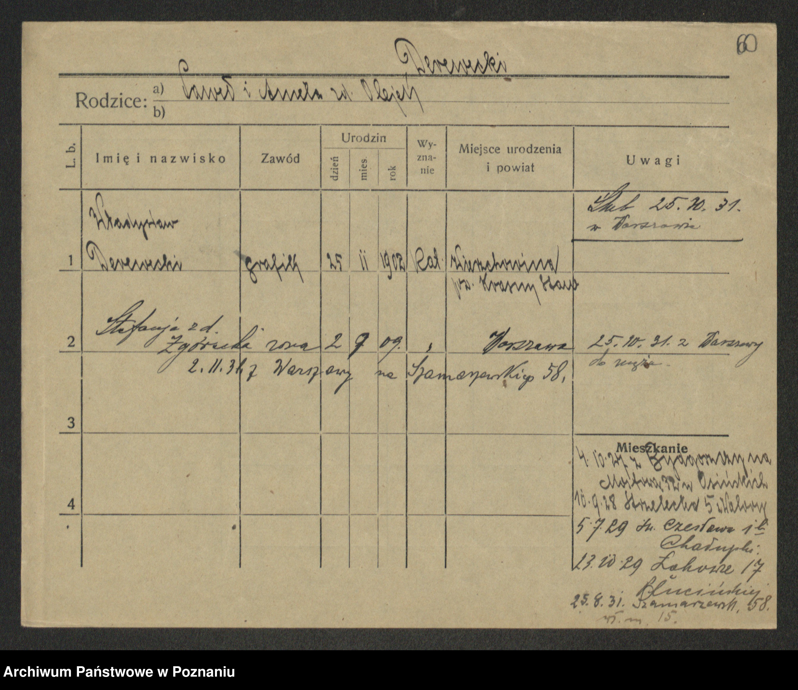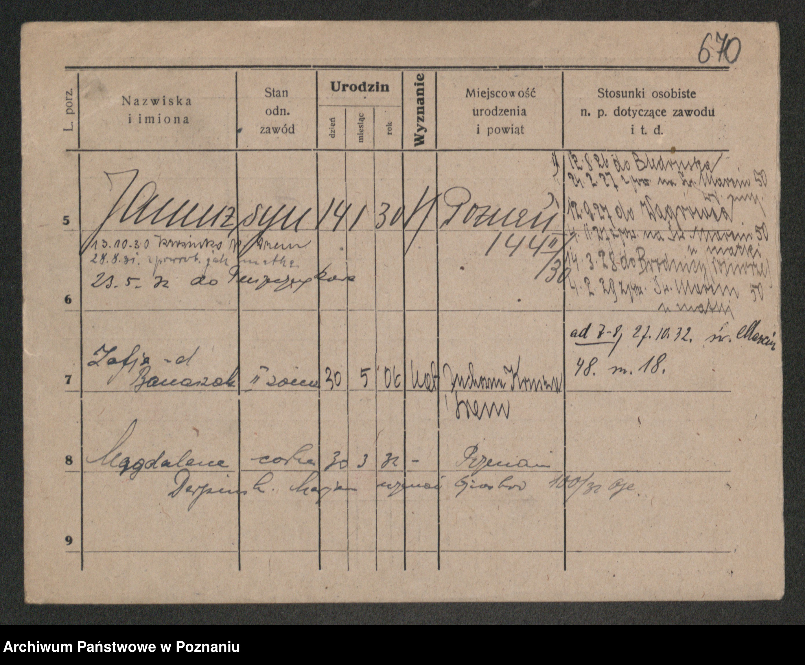 Podgląd karty osobowej dostępny jest po kliknięciu na nazwisko lub ikonkę karty. Można dokonywać powiększenia (ikony na górze) lub przechodzić między kolejnymi skanami (strzałki po bokach).