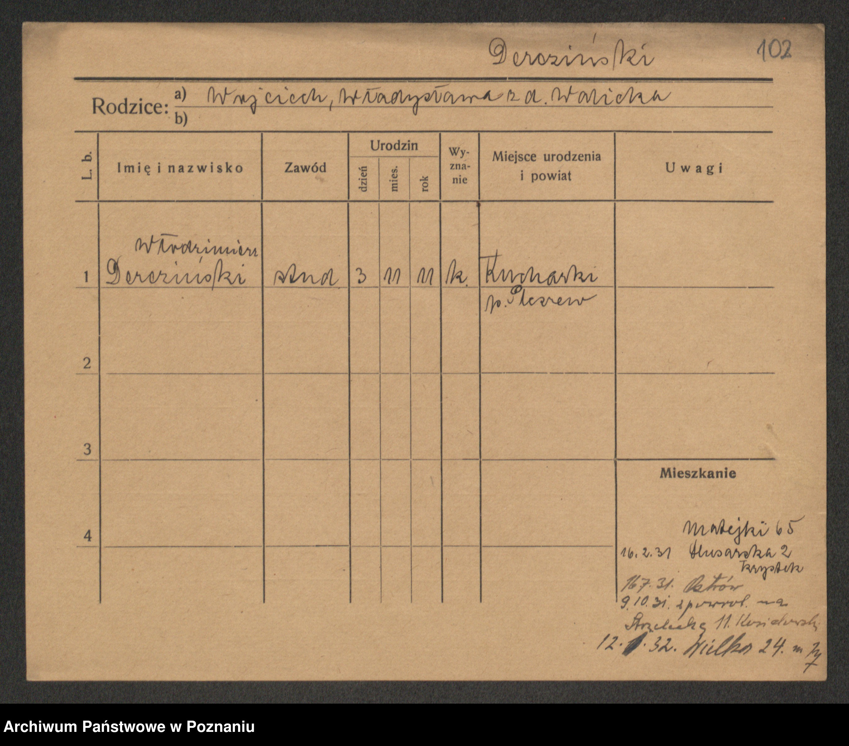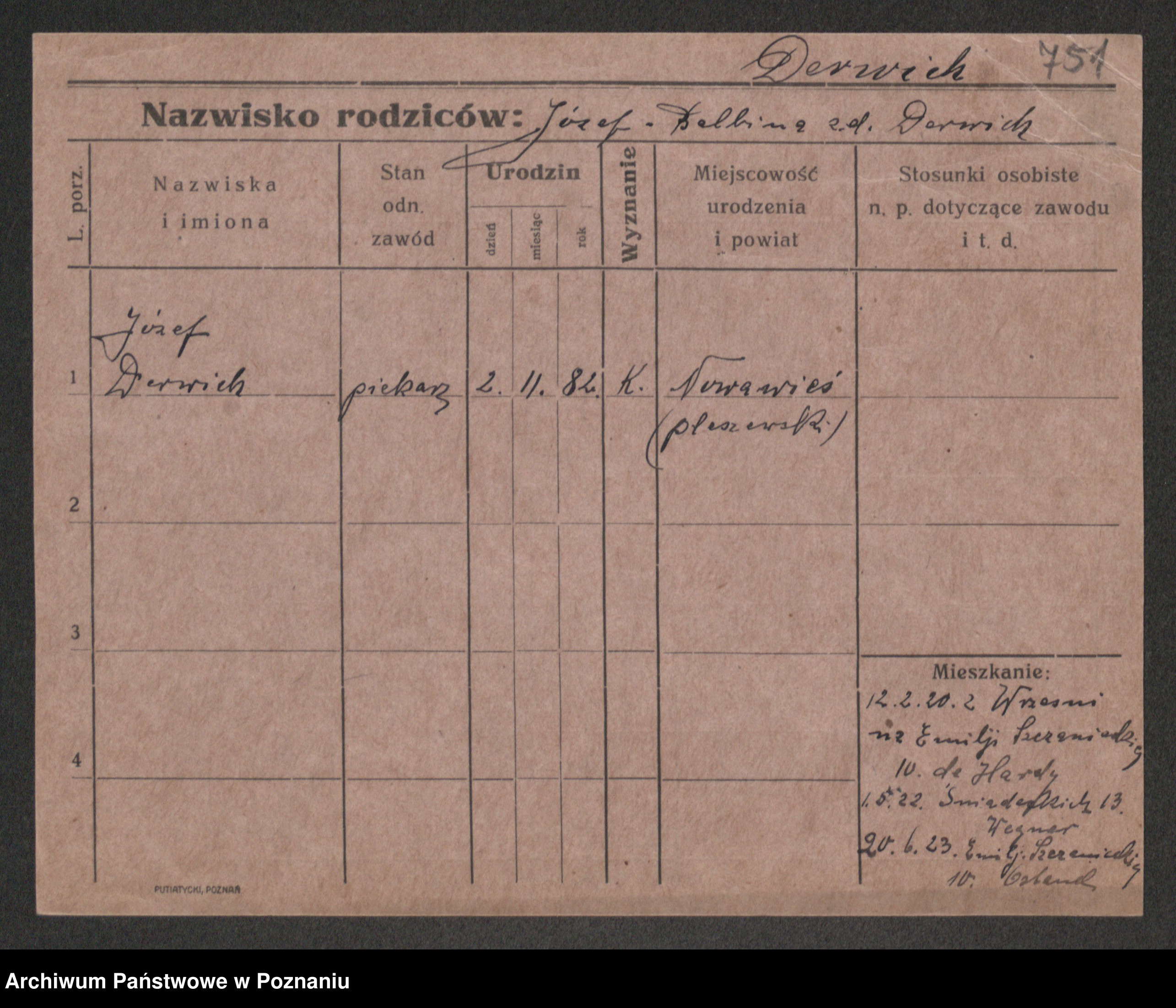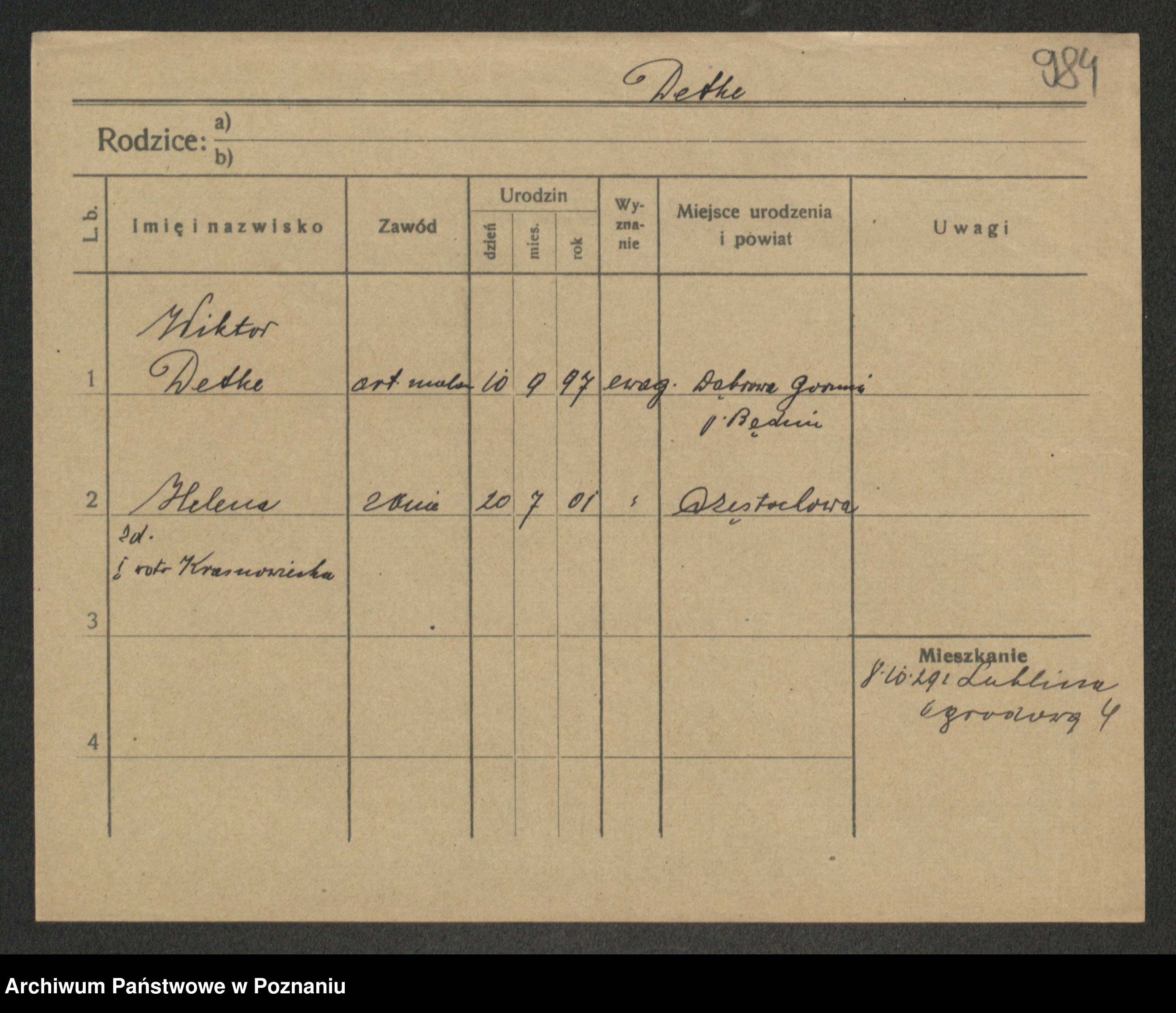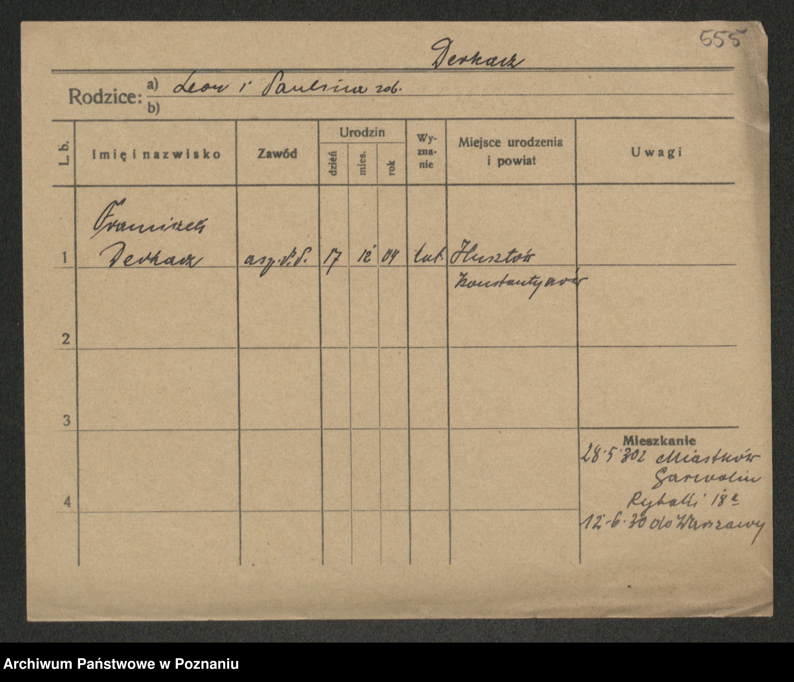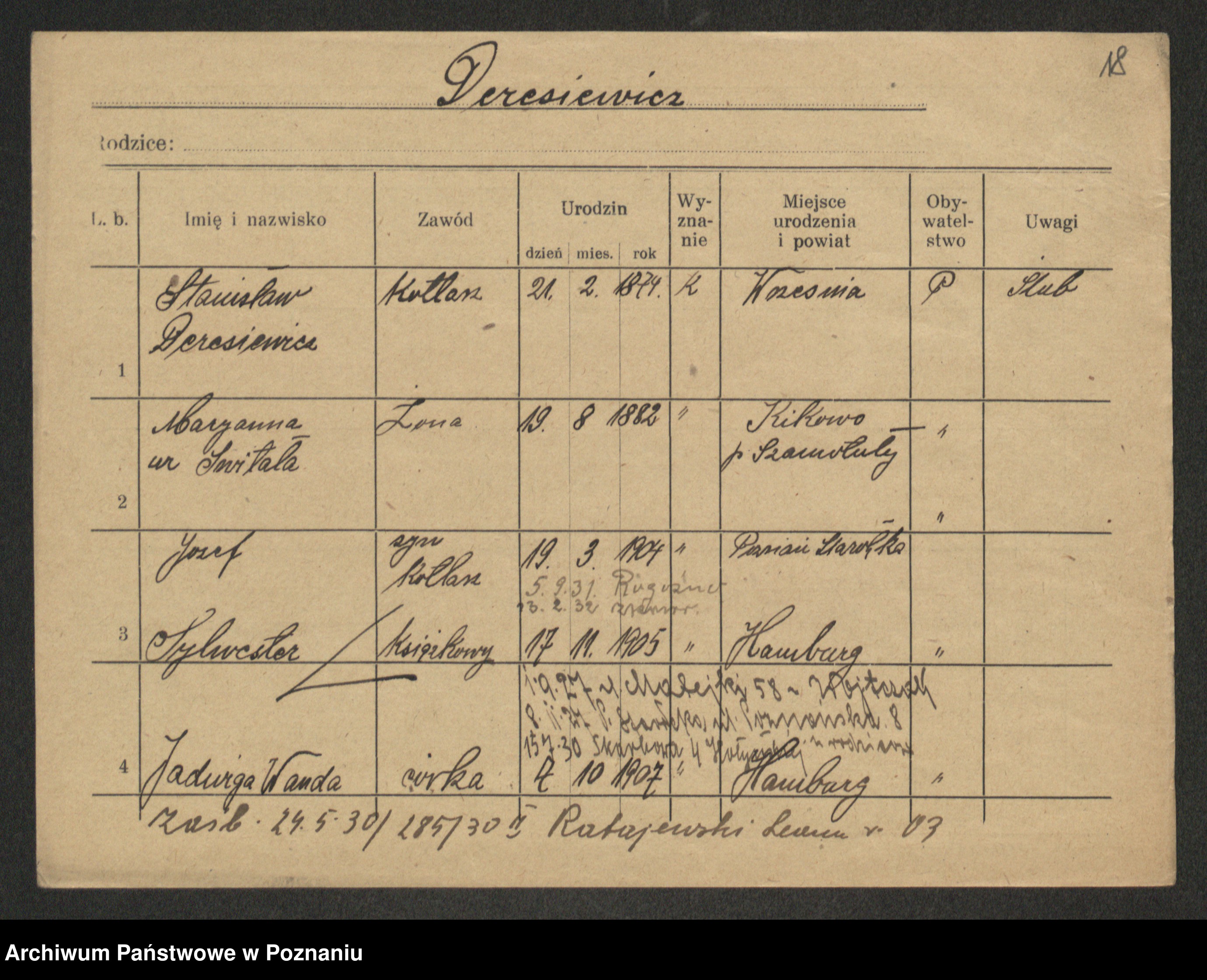 Podgląd karty osobowej dostępny jest po kliknięciu na nazwisko lub ikonkę karty. Można dokonywać powiększenia (ikony na górze) lub przechodzić między kolejnymi skanami (strzałki po bokach).