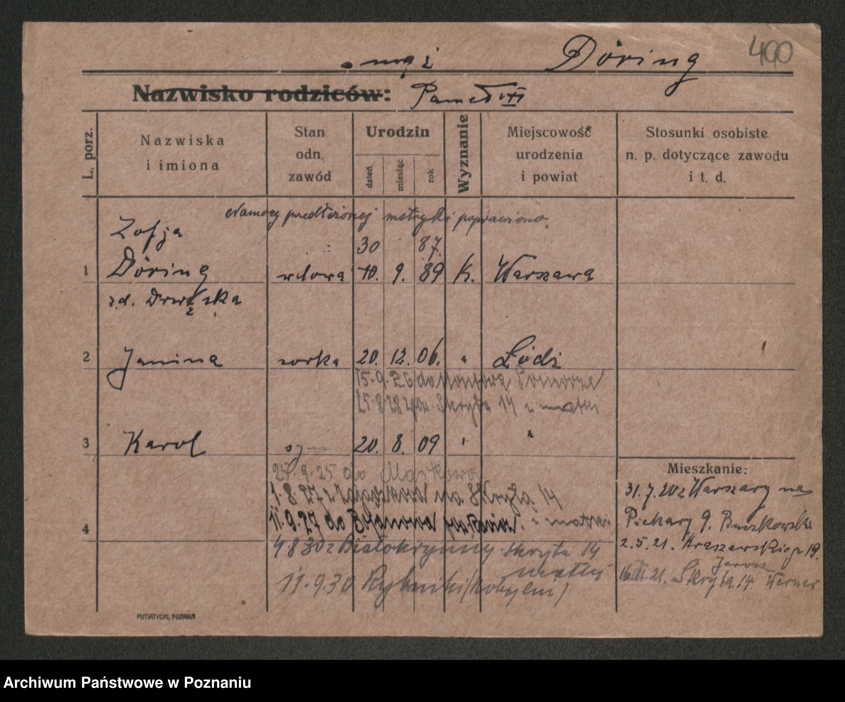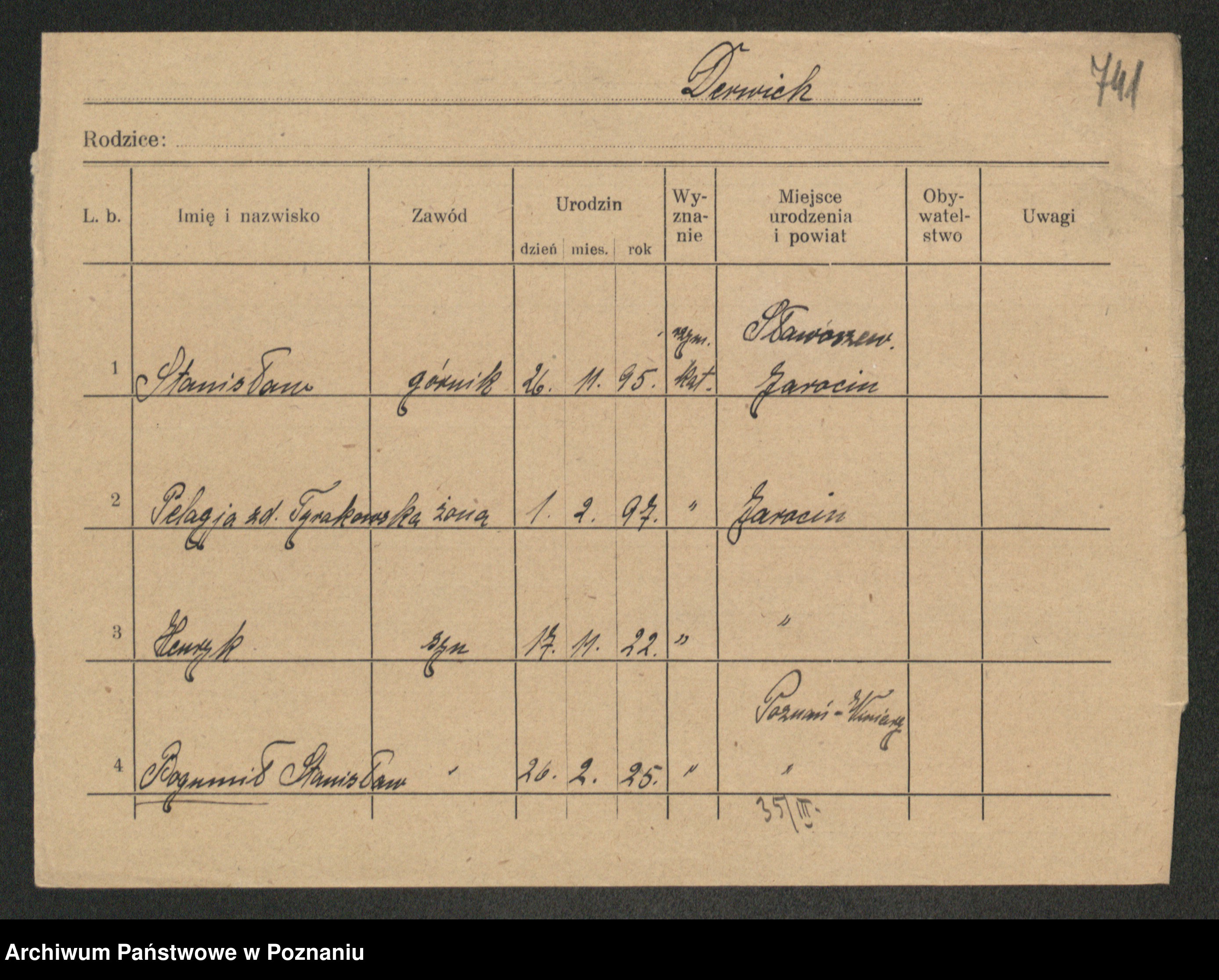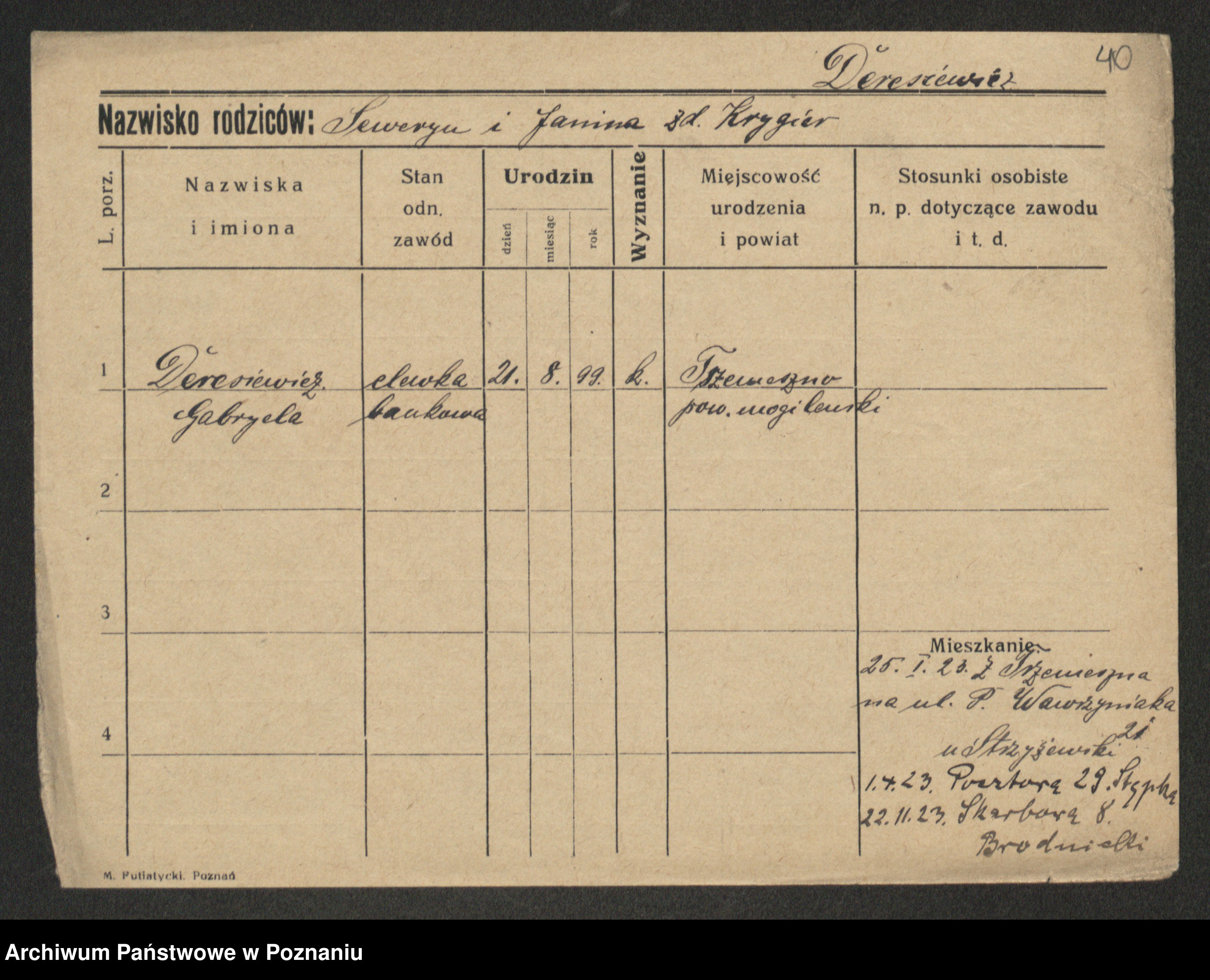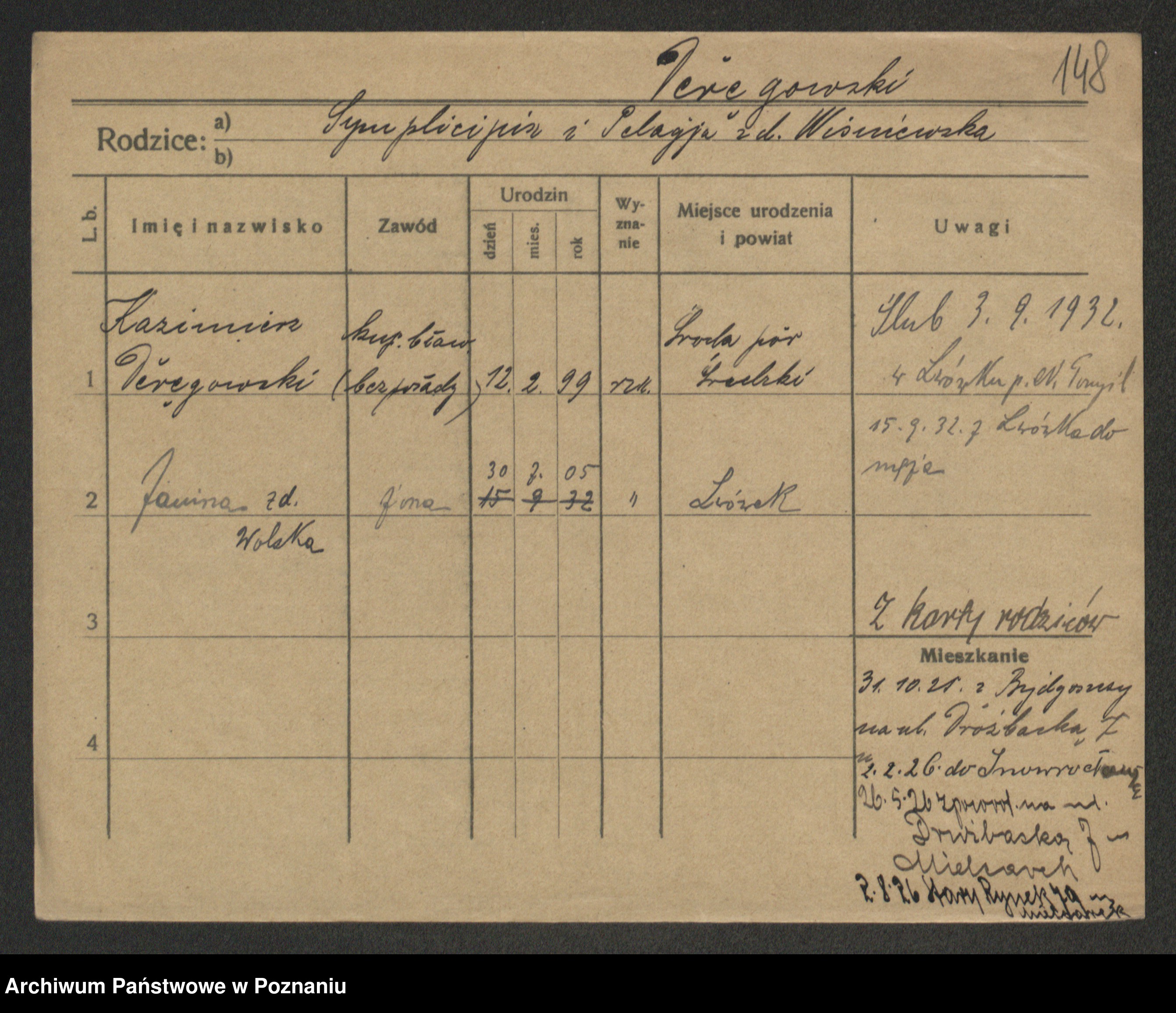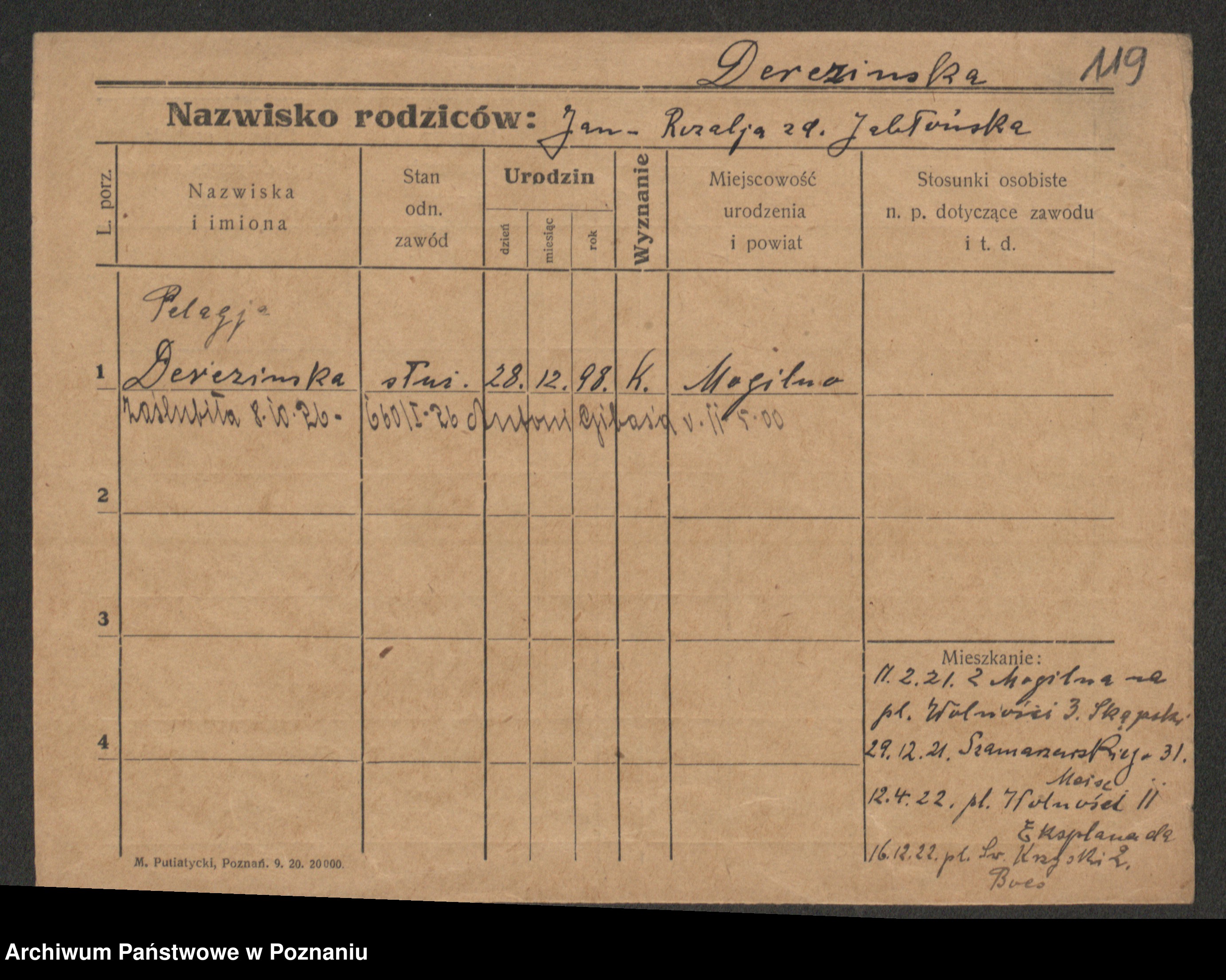 Podgląd karty osobowej dostępny jest po kliknięciu na nazwisko lub ikonkę karty. Można dokonywać powiększenia (ikony na górze) lub przechodzić między kolejnymi skanami (strzałki po bokach).