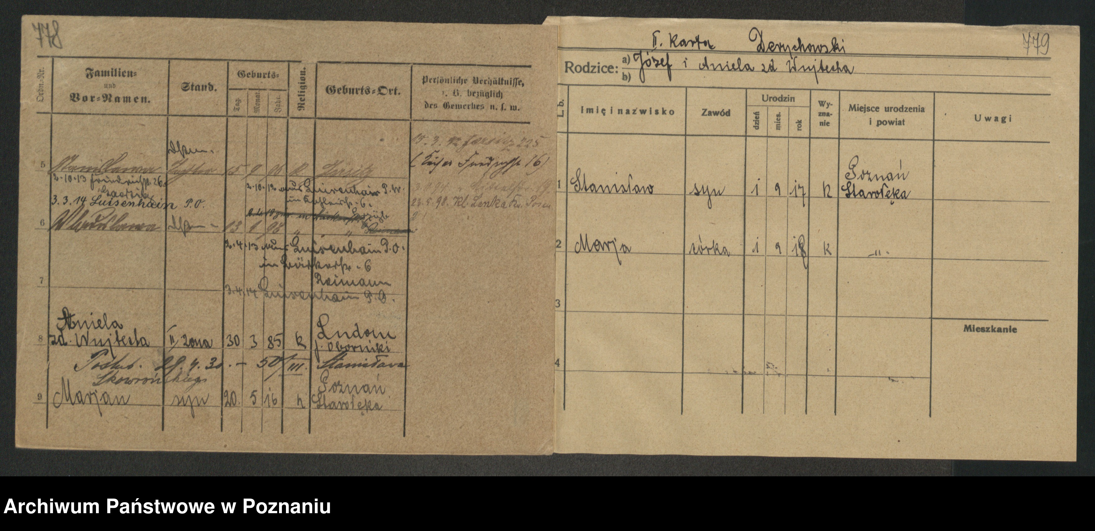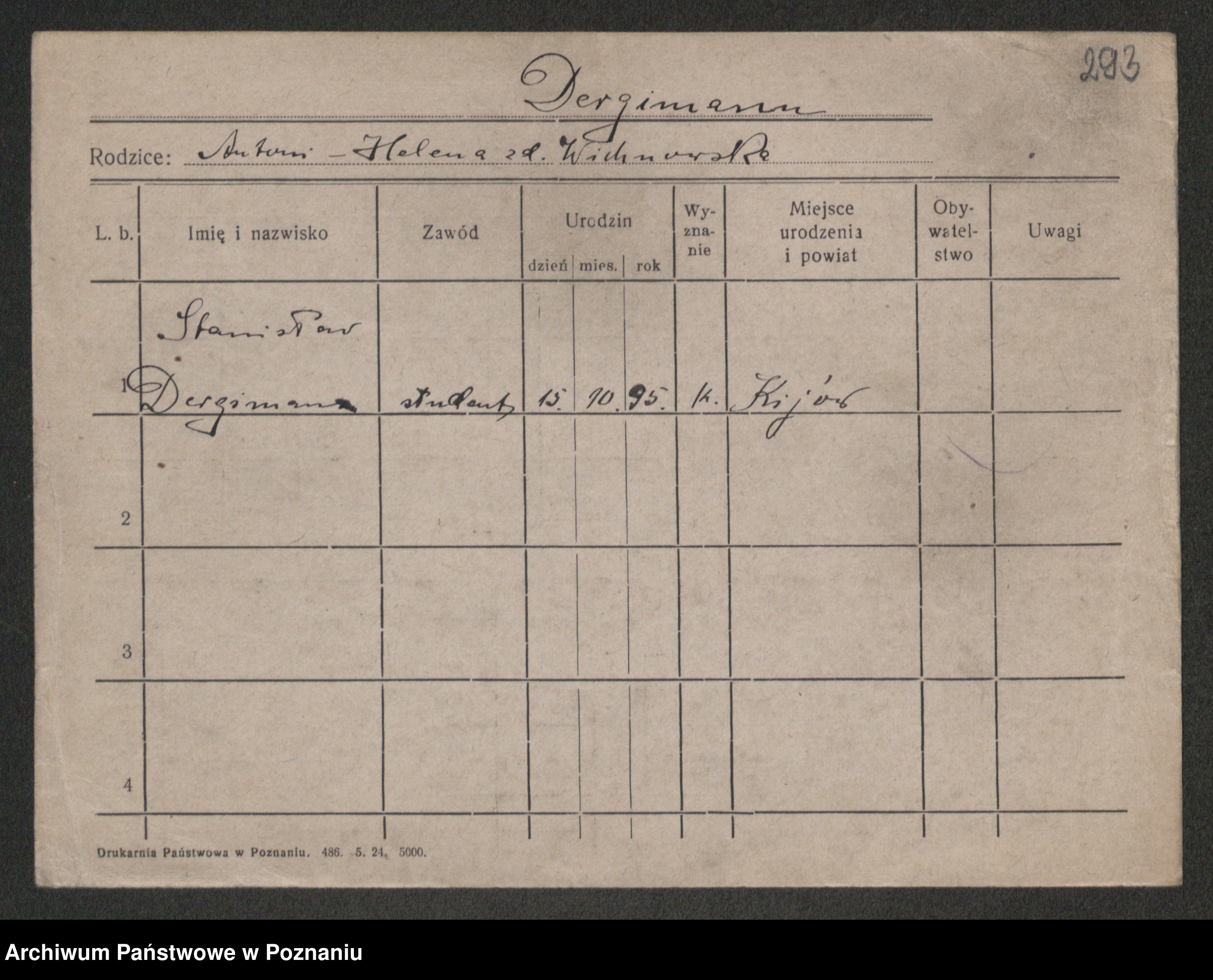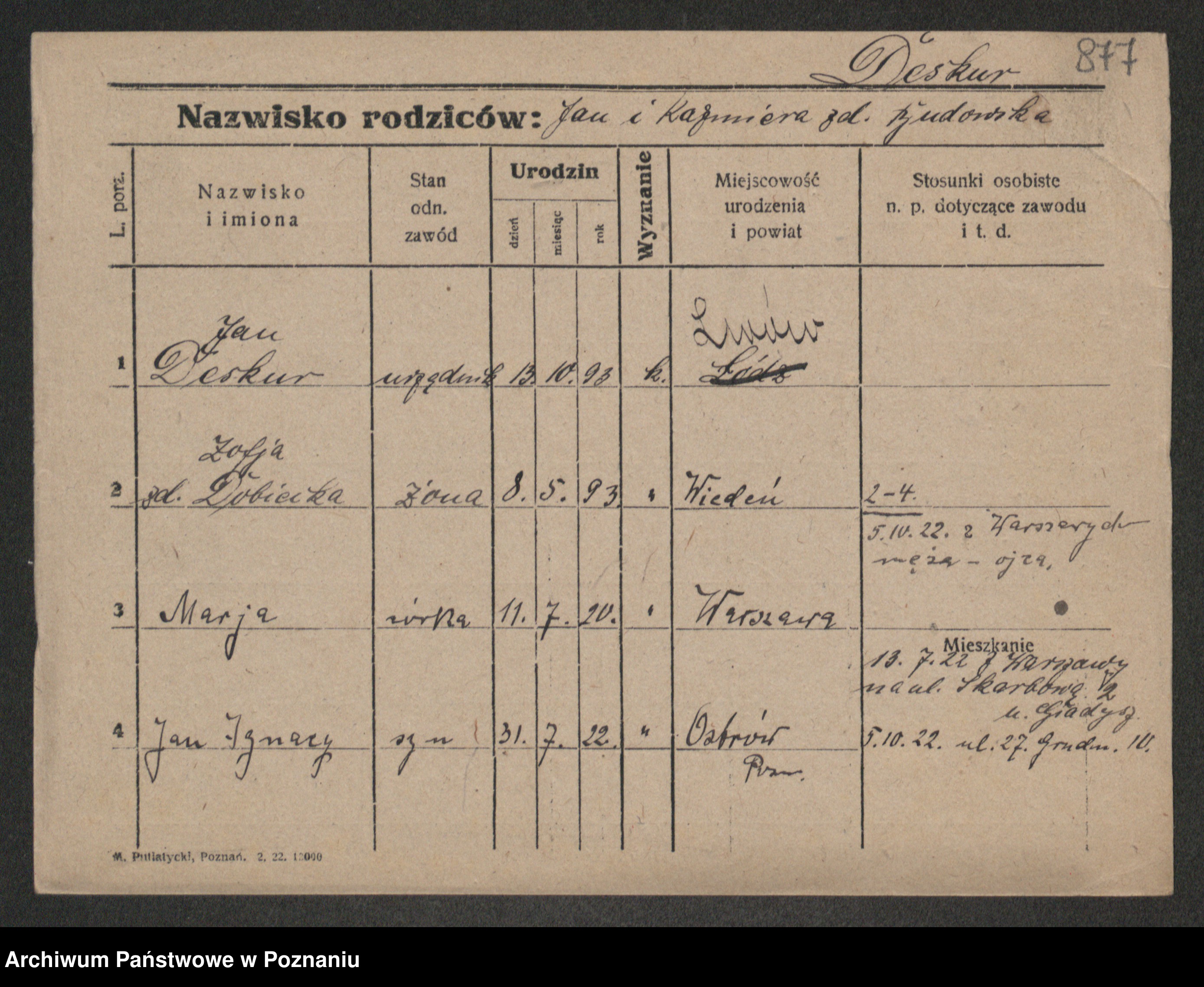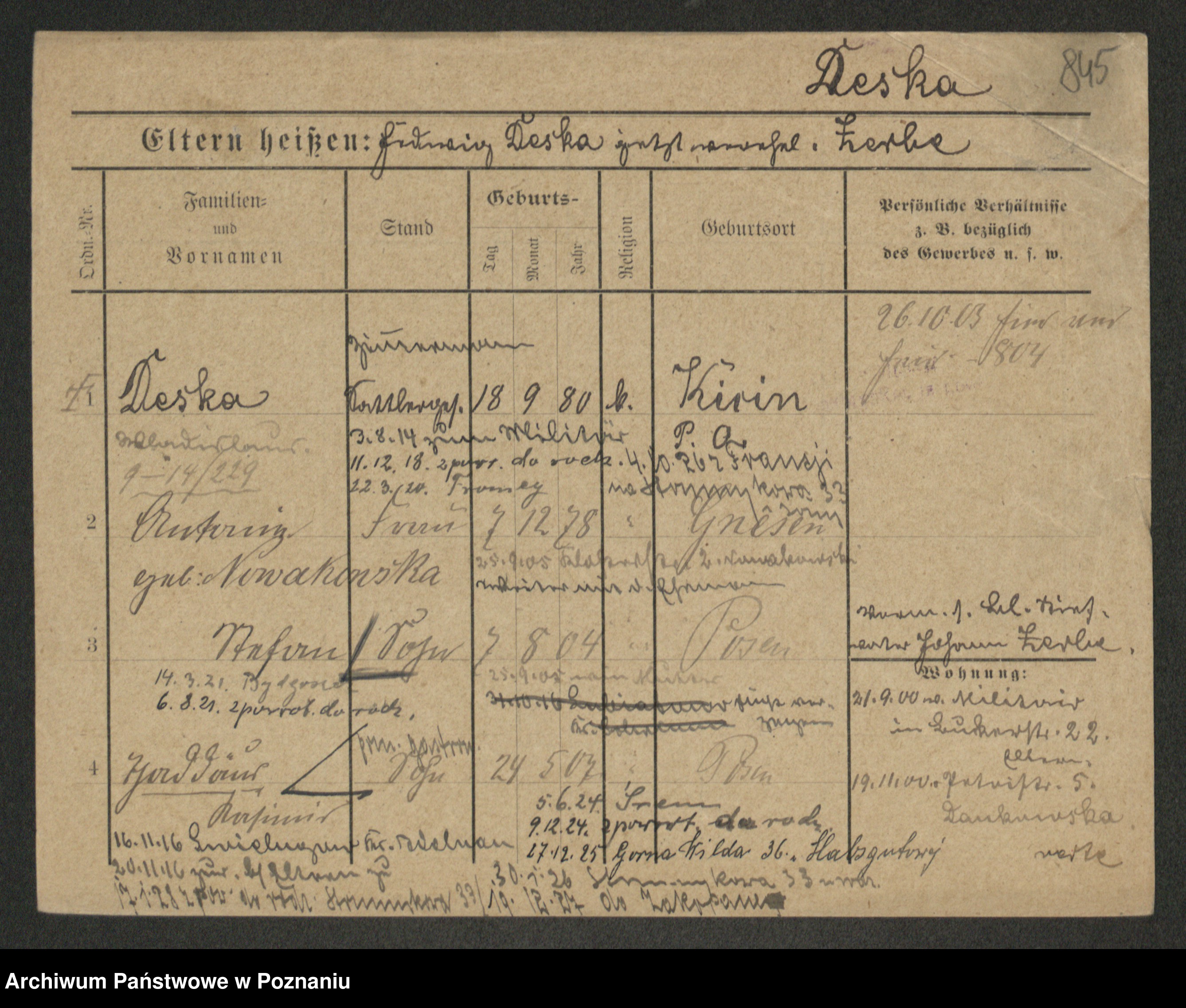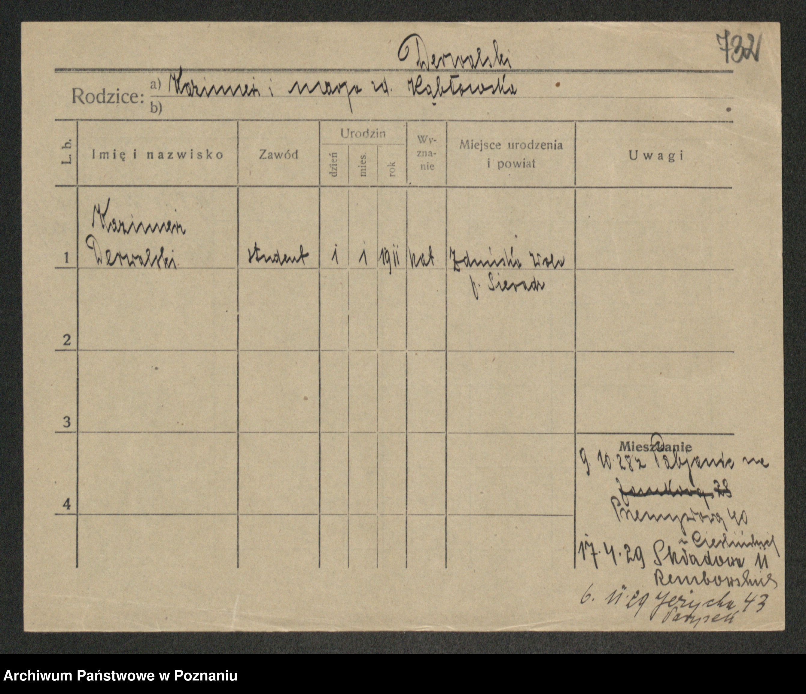 Podgląd karty osobowej dostępny jest po kliknięciu na nazwisko lub ikonkę karty. Można dokonywać powiększenia (ikony na górze) lub przechodzić między kolejnymi skanami (strzałki po bokach).