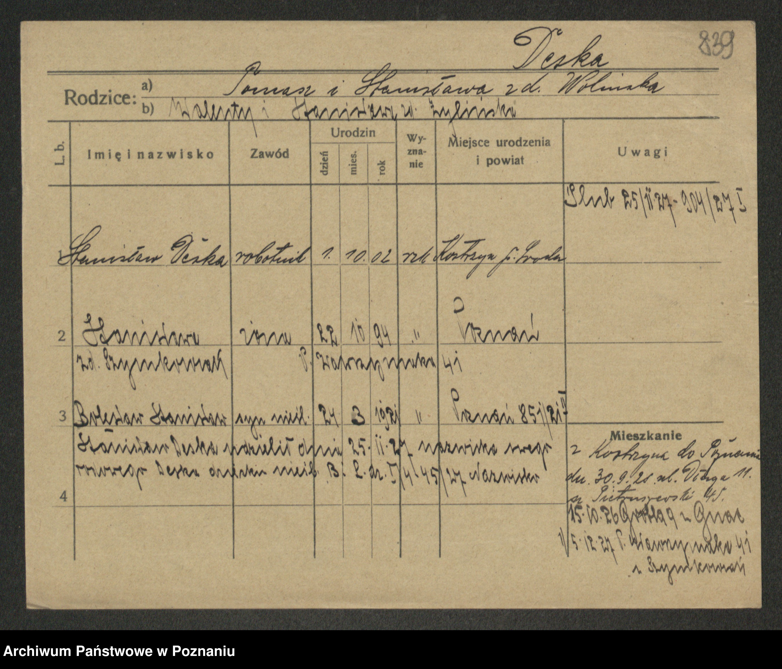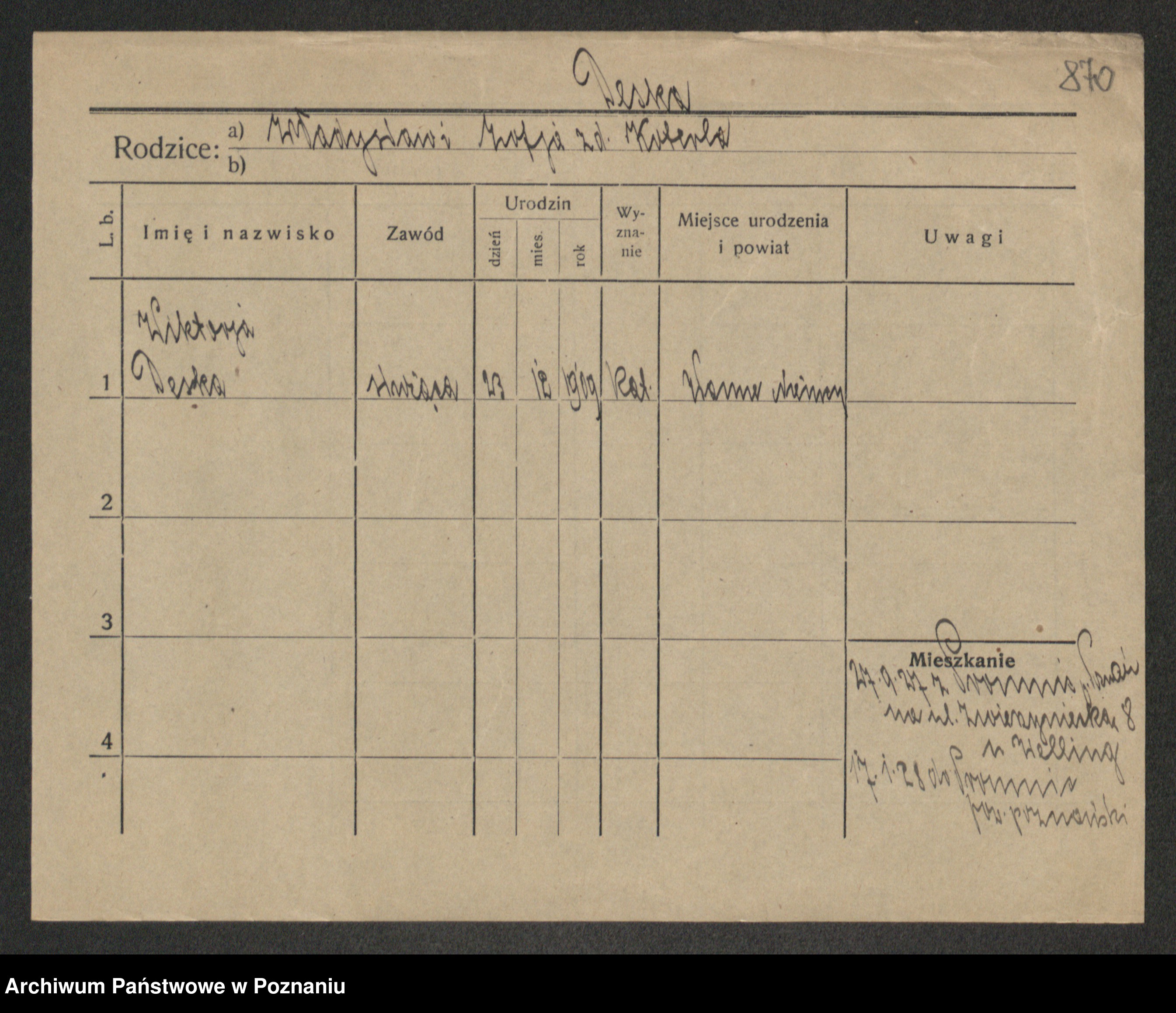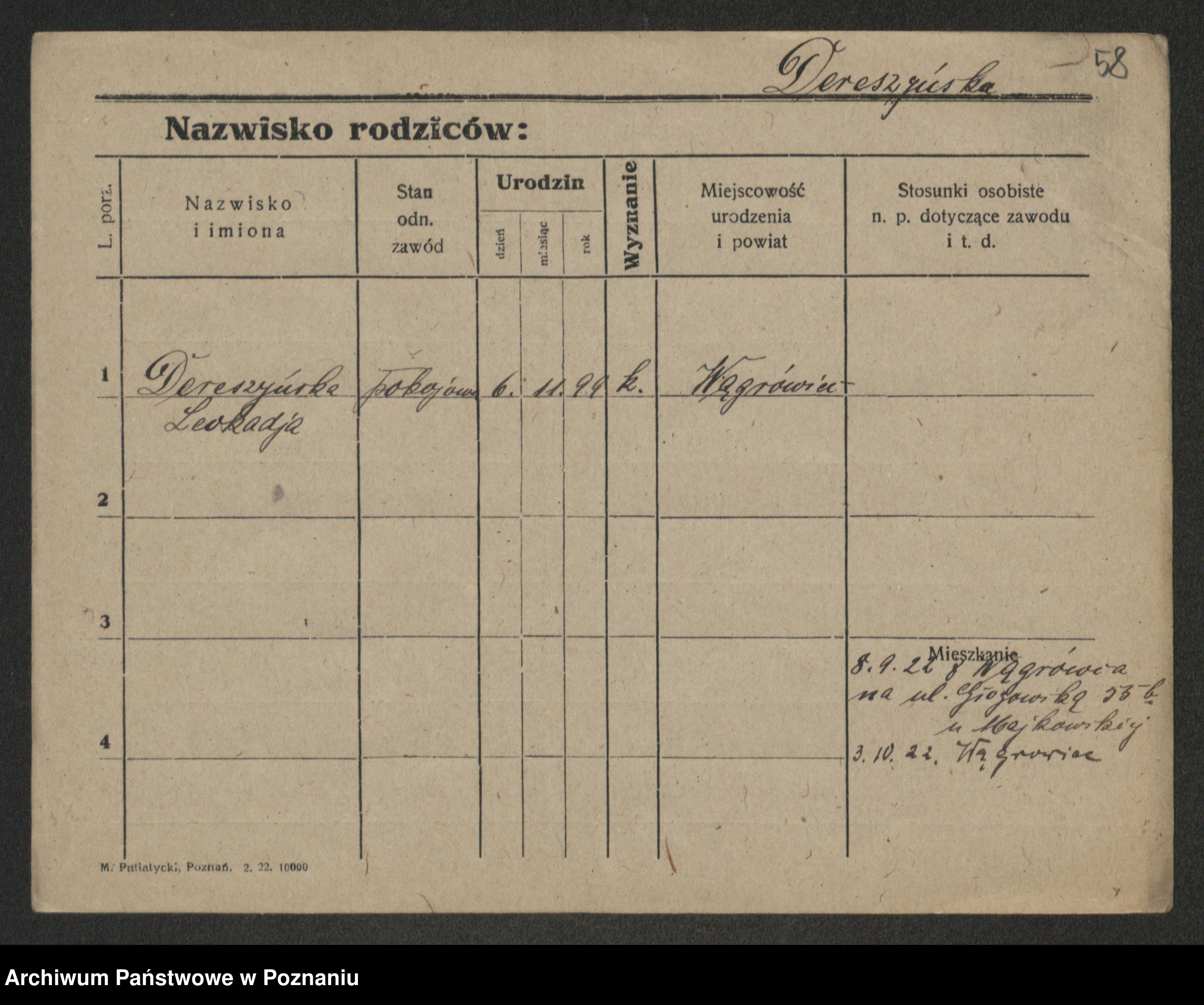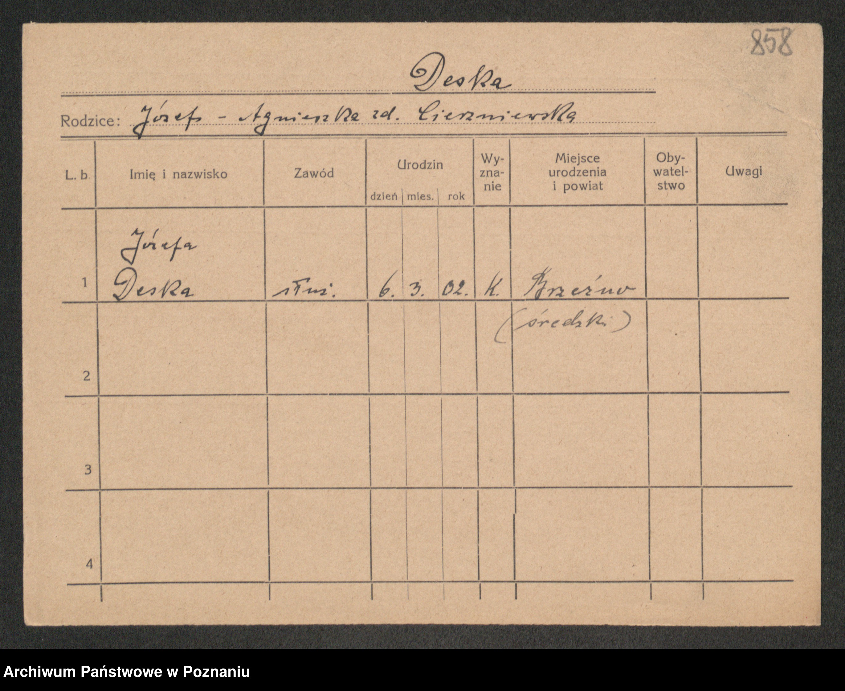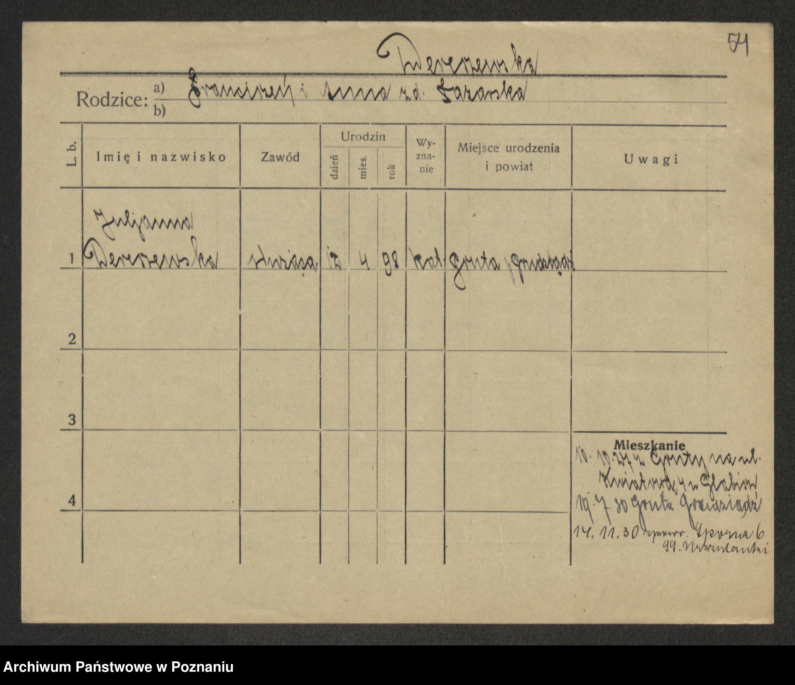 Podgląd karty osobowej dostępny jest po kliknięciu na nazwisko lub ikonkę karty. Można dokonywać powiększenia (ikony na górze) lub przechodzić między kolejnymi skanami (strzałki po bokach).
