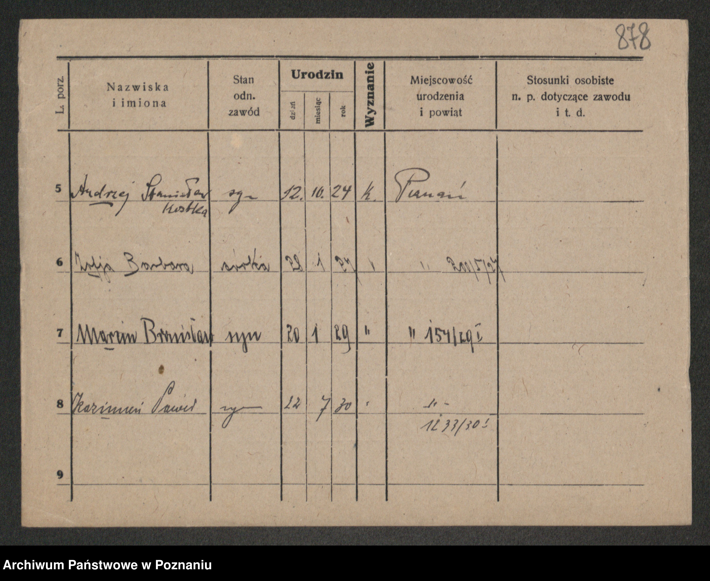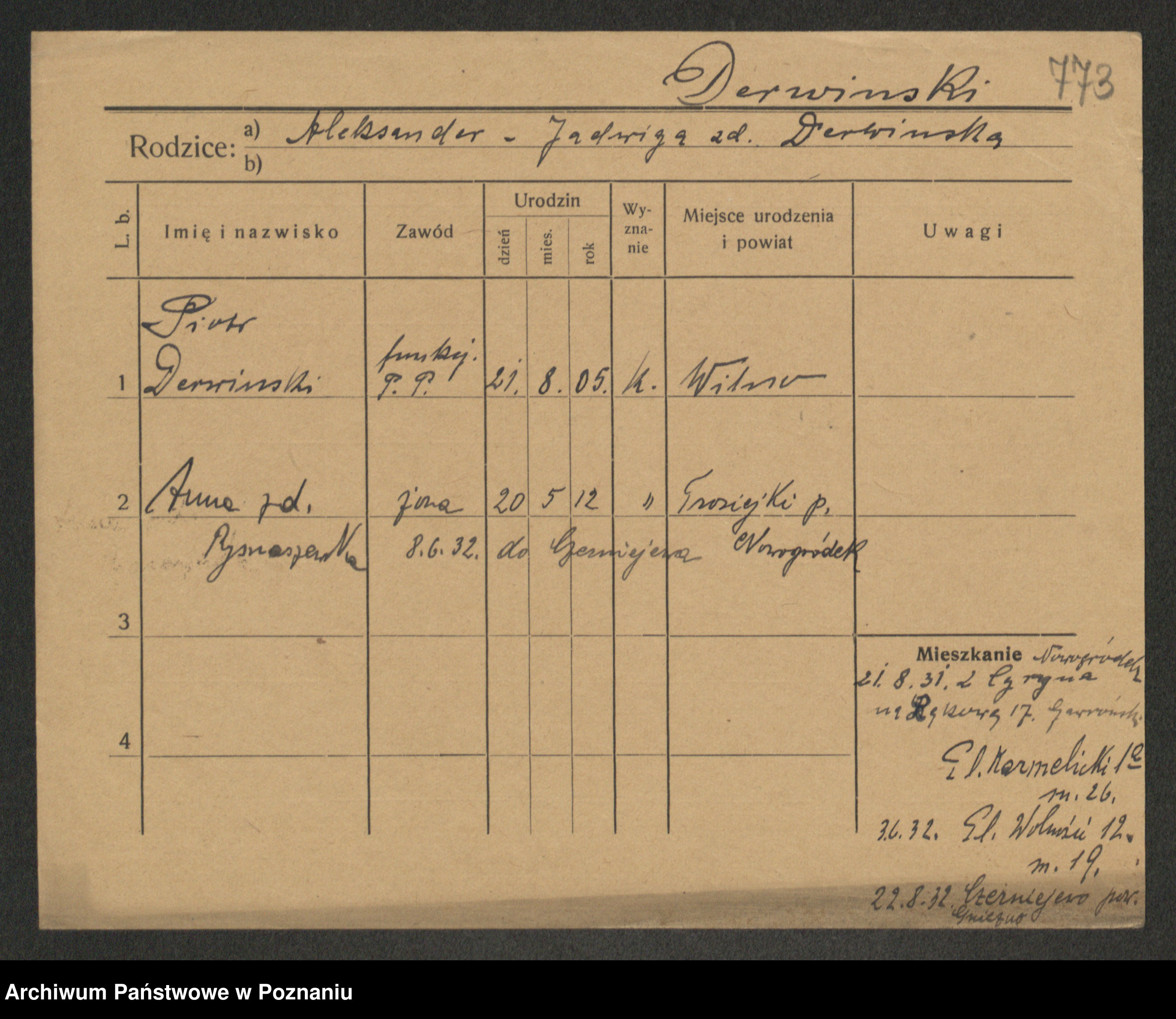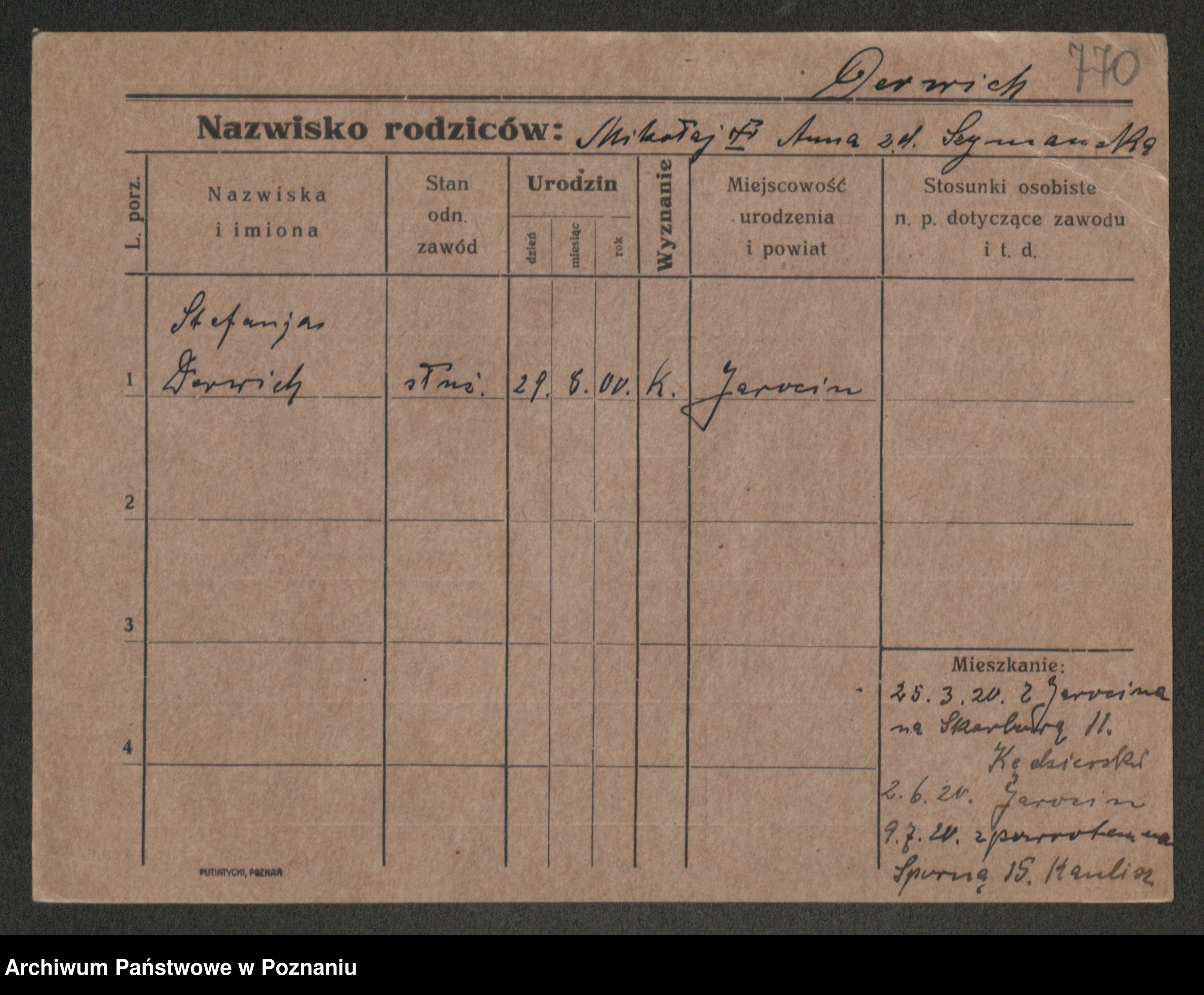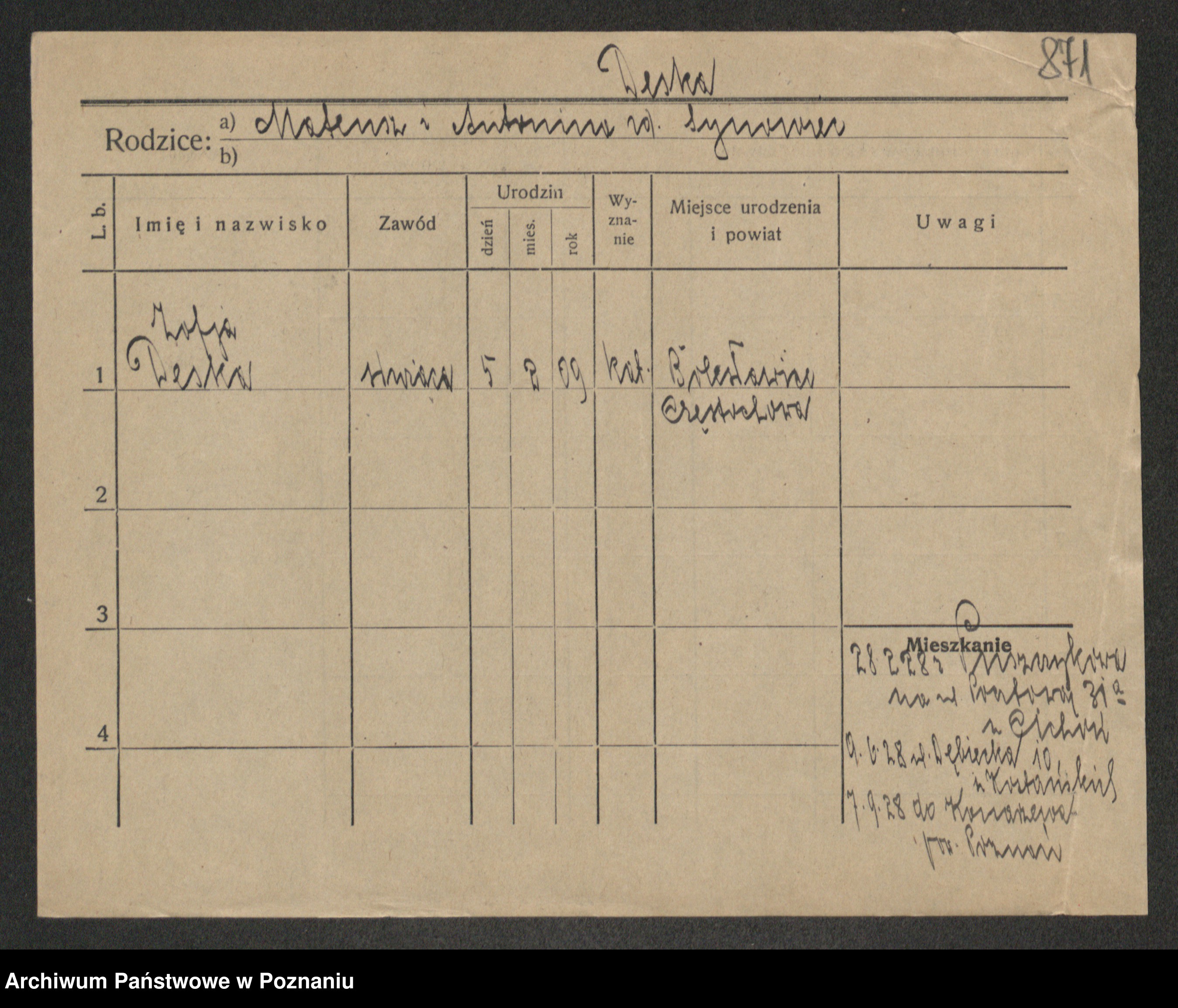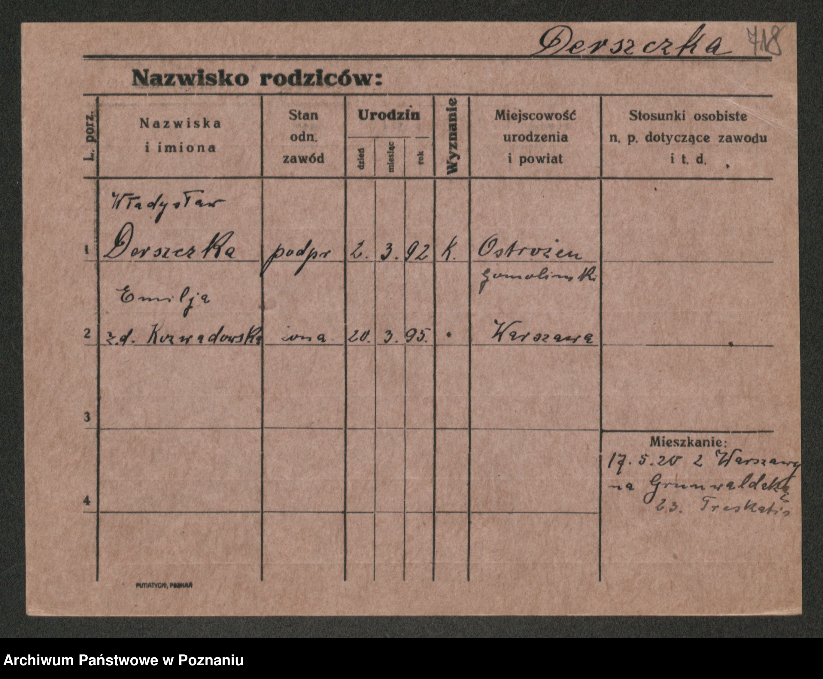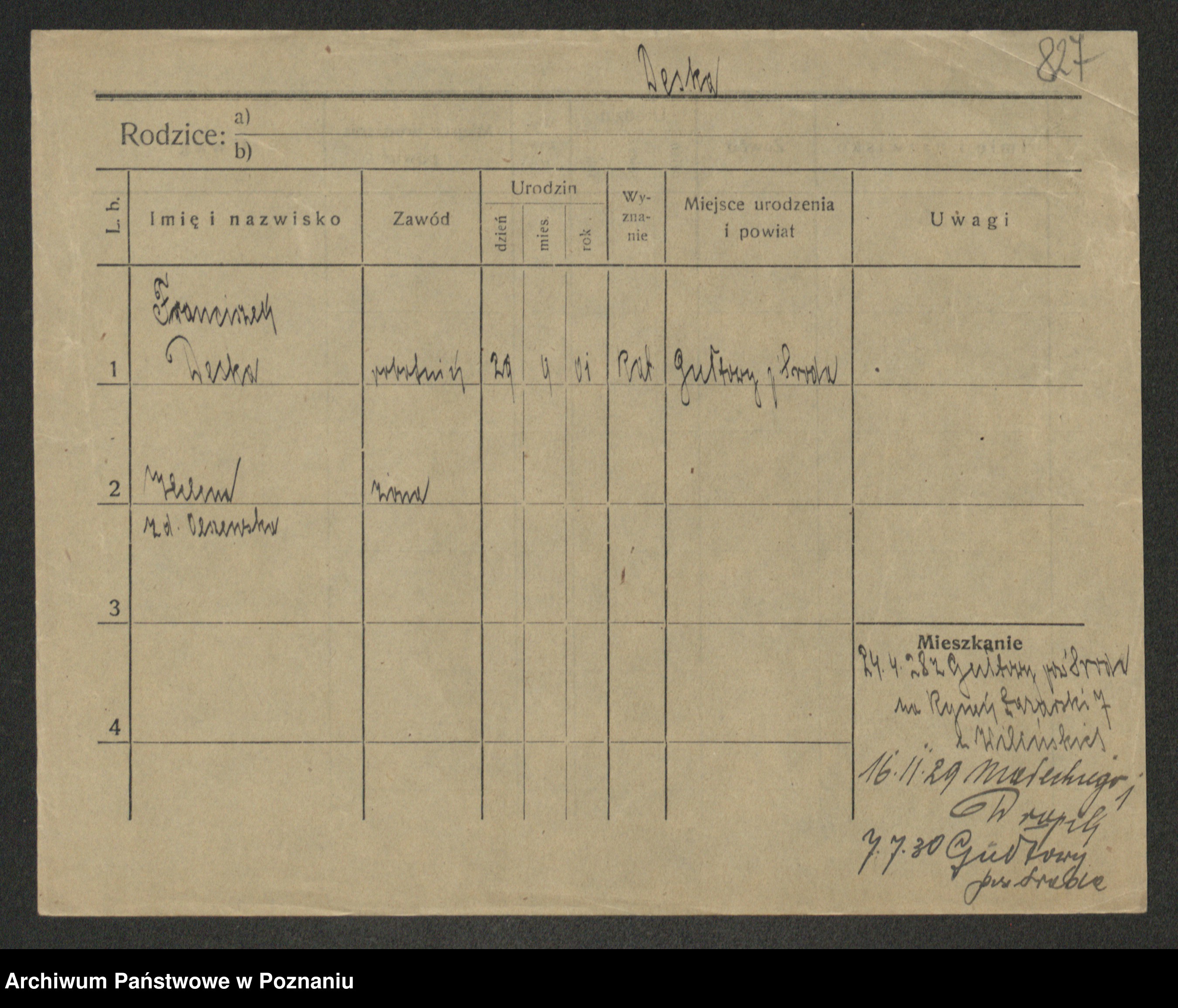 Podgląd karty osobowej dostępny jest po kliknięciu na nazwisko lub ikonkę karty. Można dokonywać powiększenia (ikony na górze) lub przechodzić między kolejnymi skanami (strzałki po bokach).