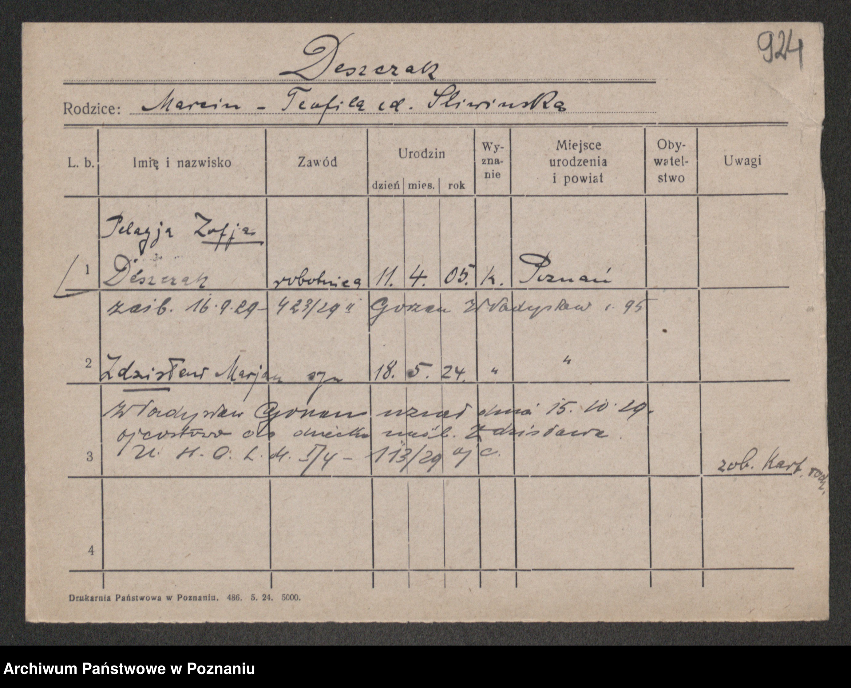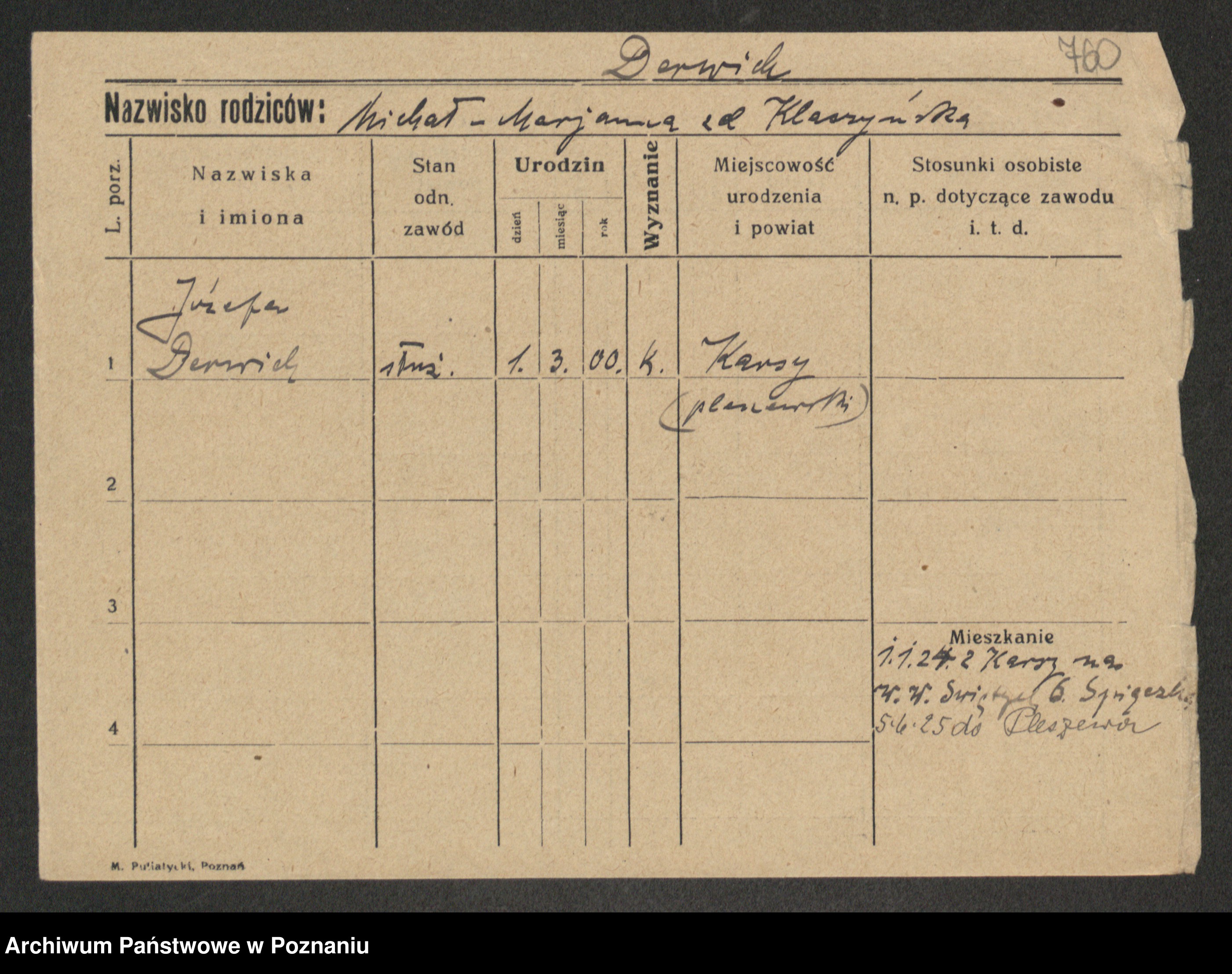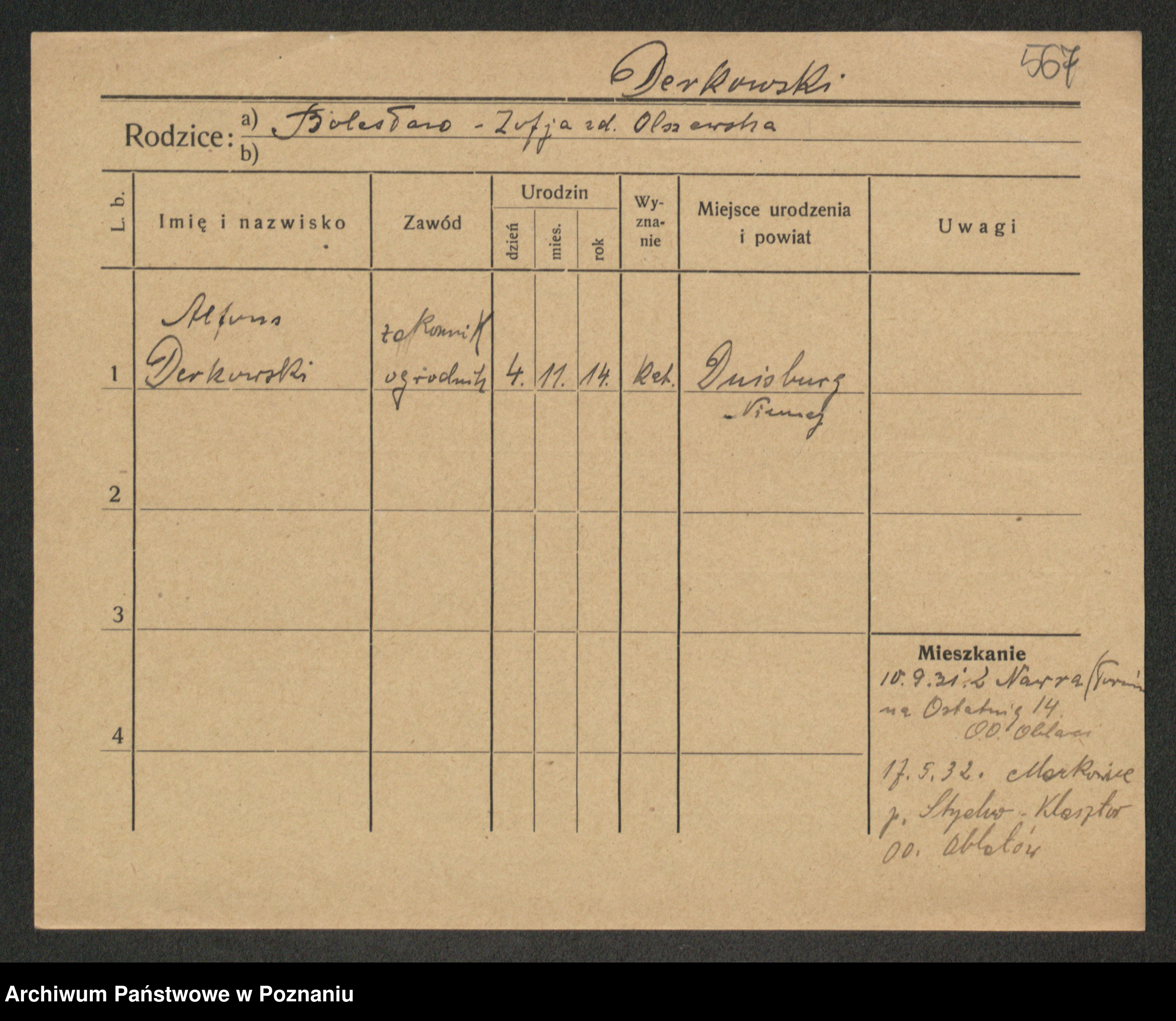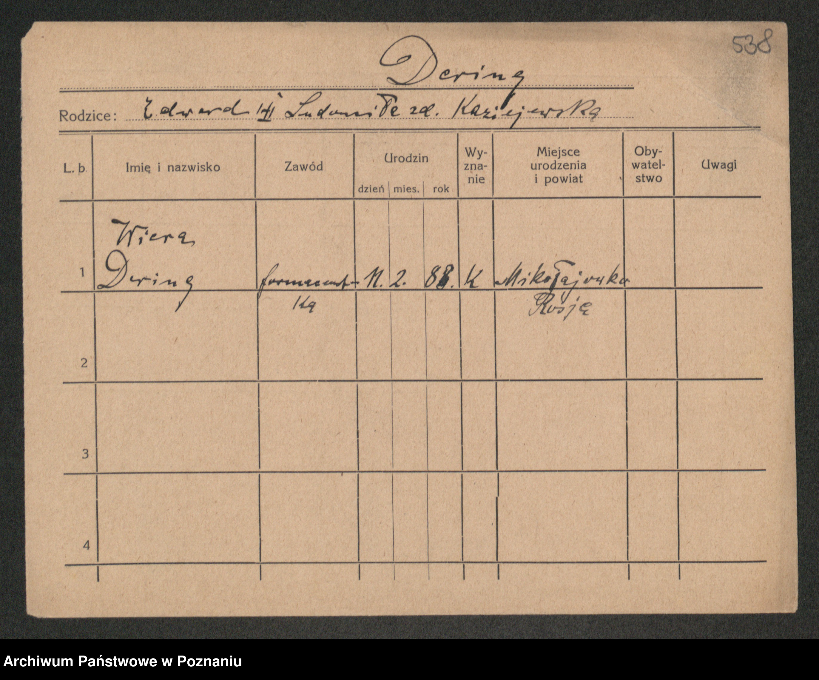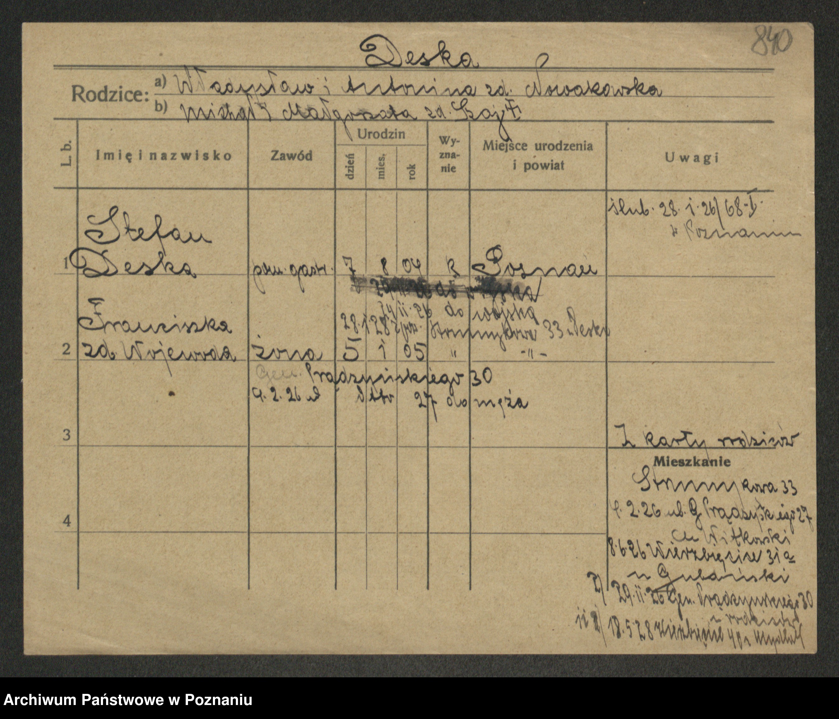 Podgląd karty osobowej dostępny jest po kliknięciu na nazwisko lub ikonkę karty. Można dokonywać powiększenia (ikony na górze) lub przechodzić między kolejnymi skanami (strzałki po bokach).