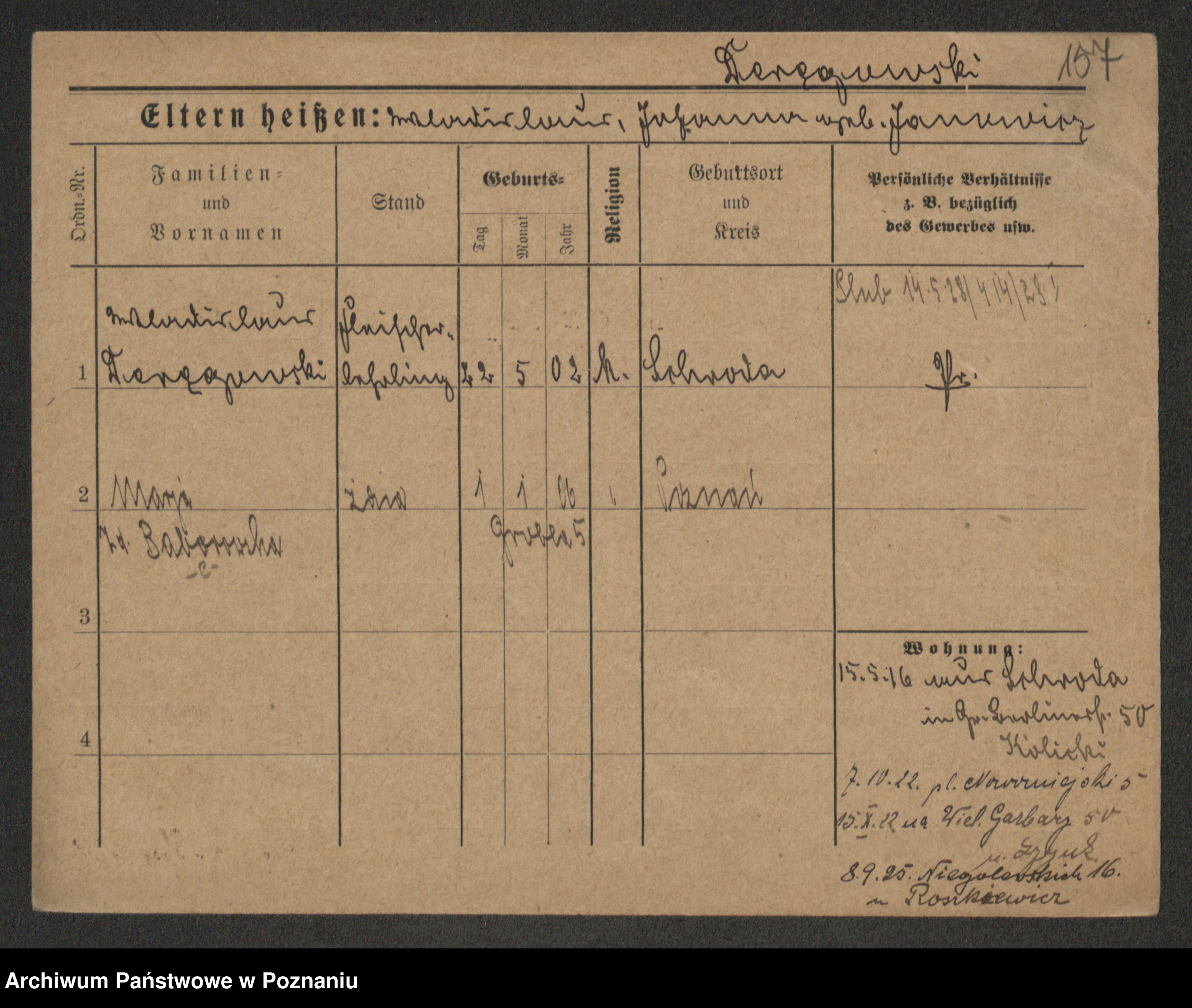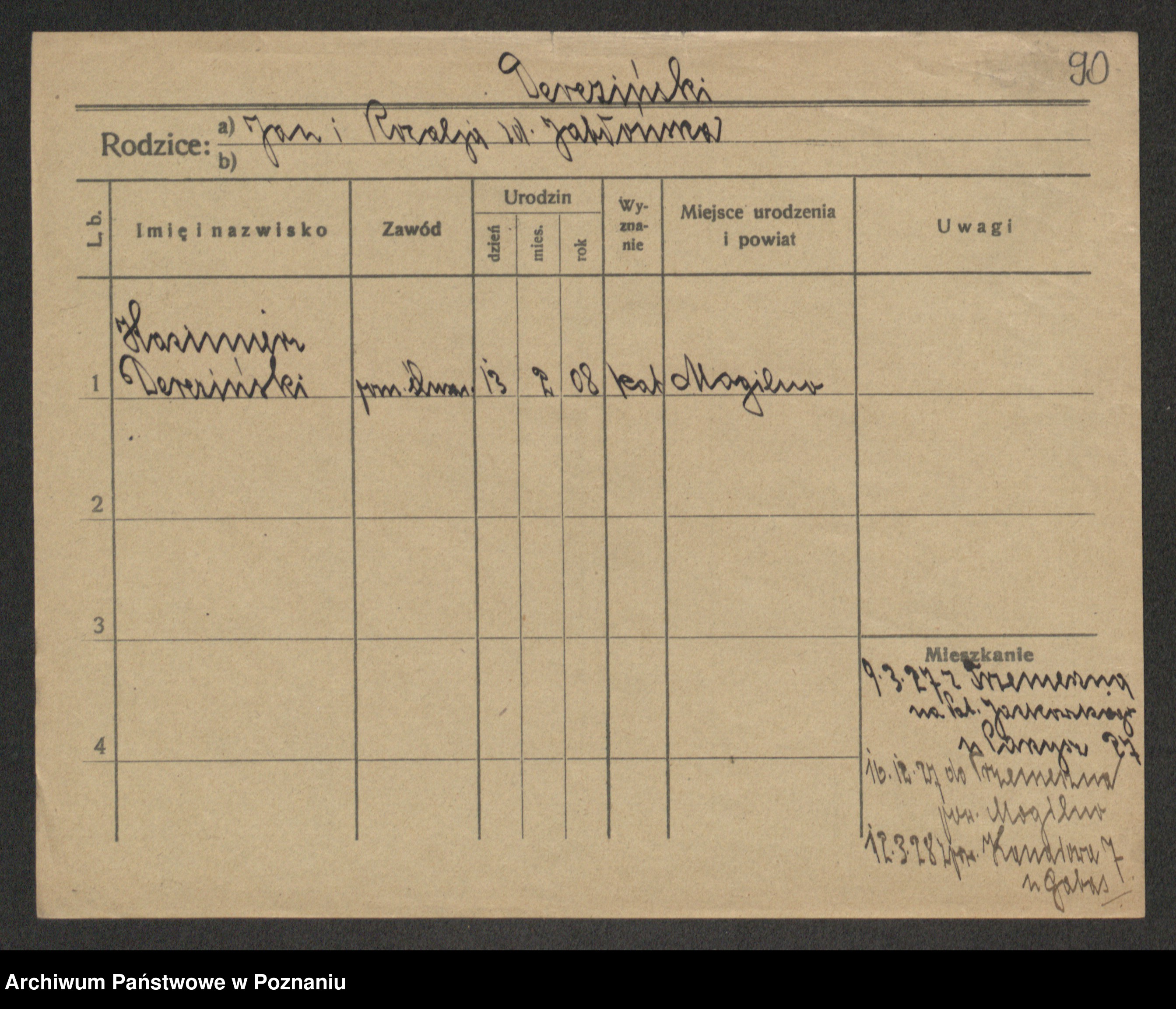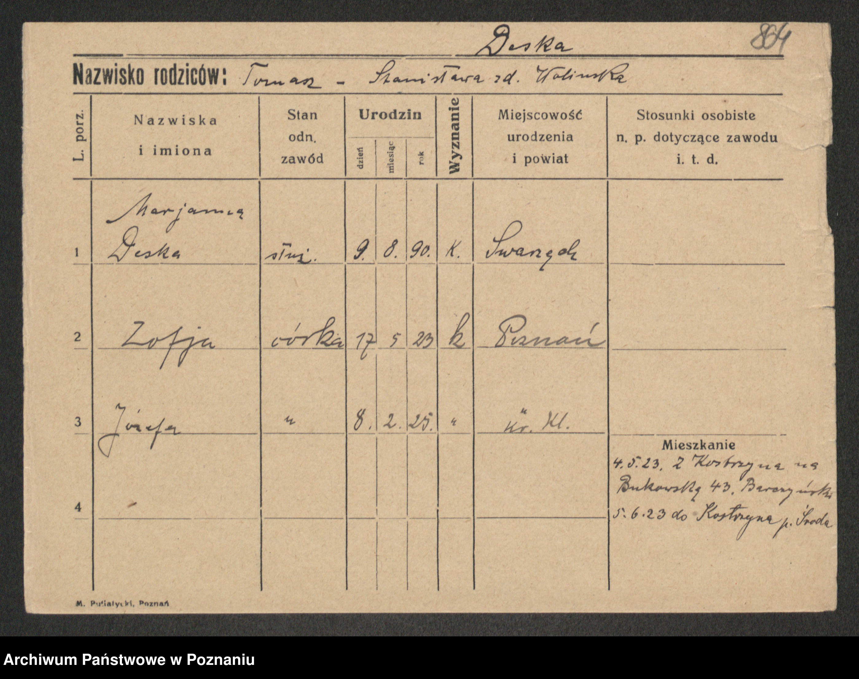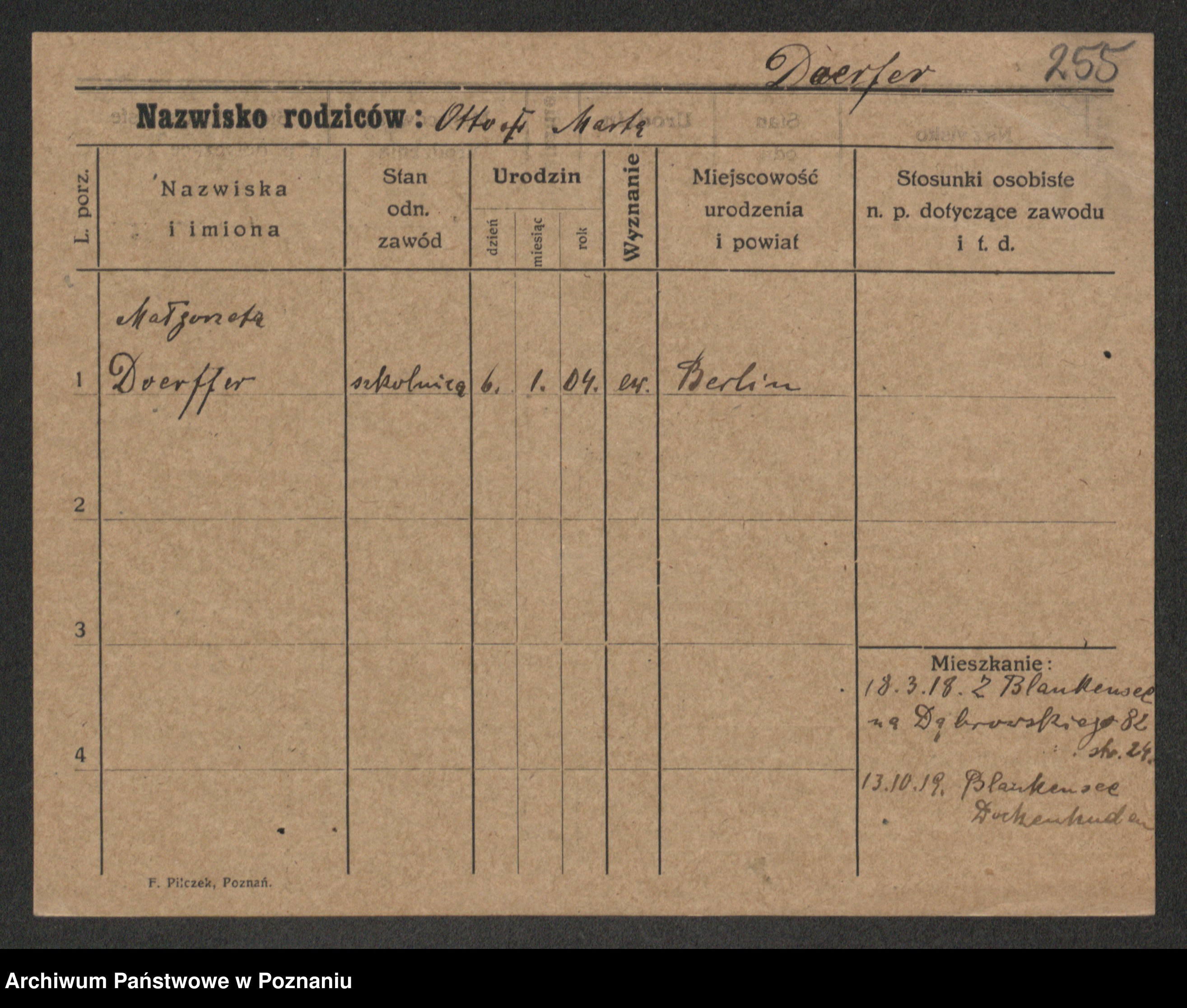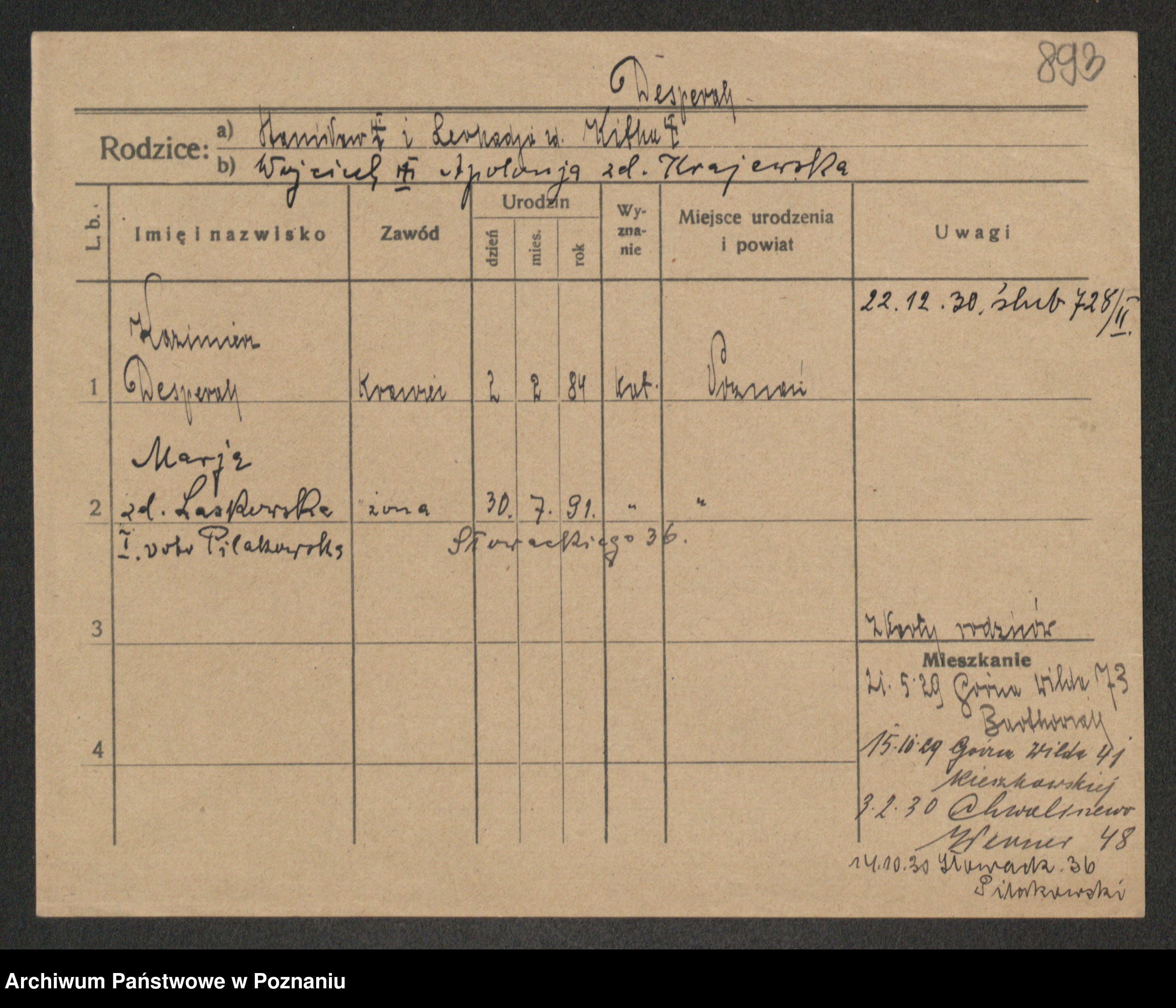 Podgląd karty osobowej dostępny jest po kliknięciu na nazwisko lub ikonkę karty. Można dokonywać powiększenia (ikony na górze) lub przechodzić między kolejnymi skanami (strzałki po bokach).