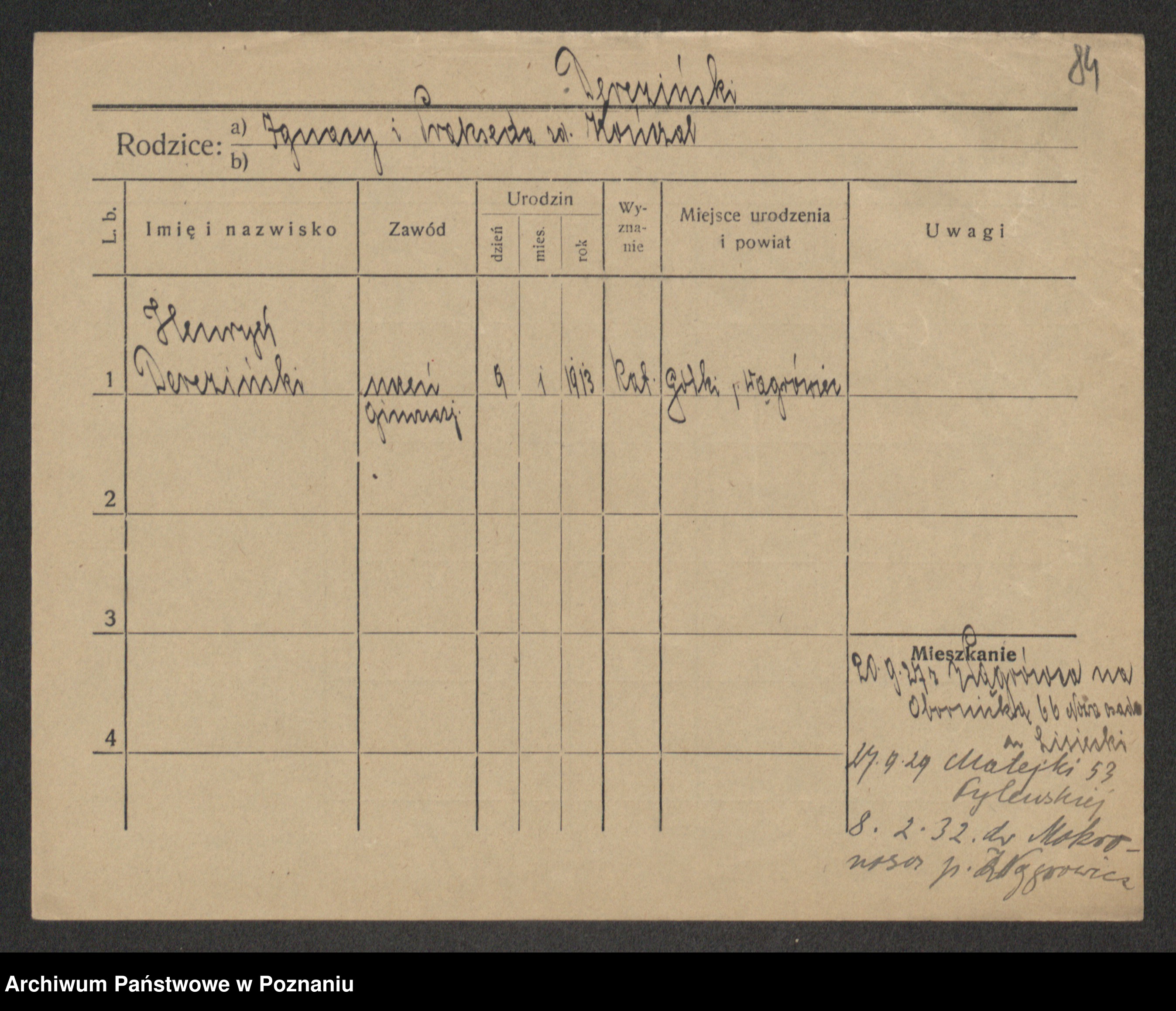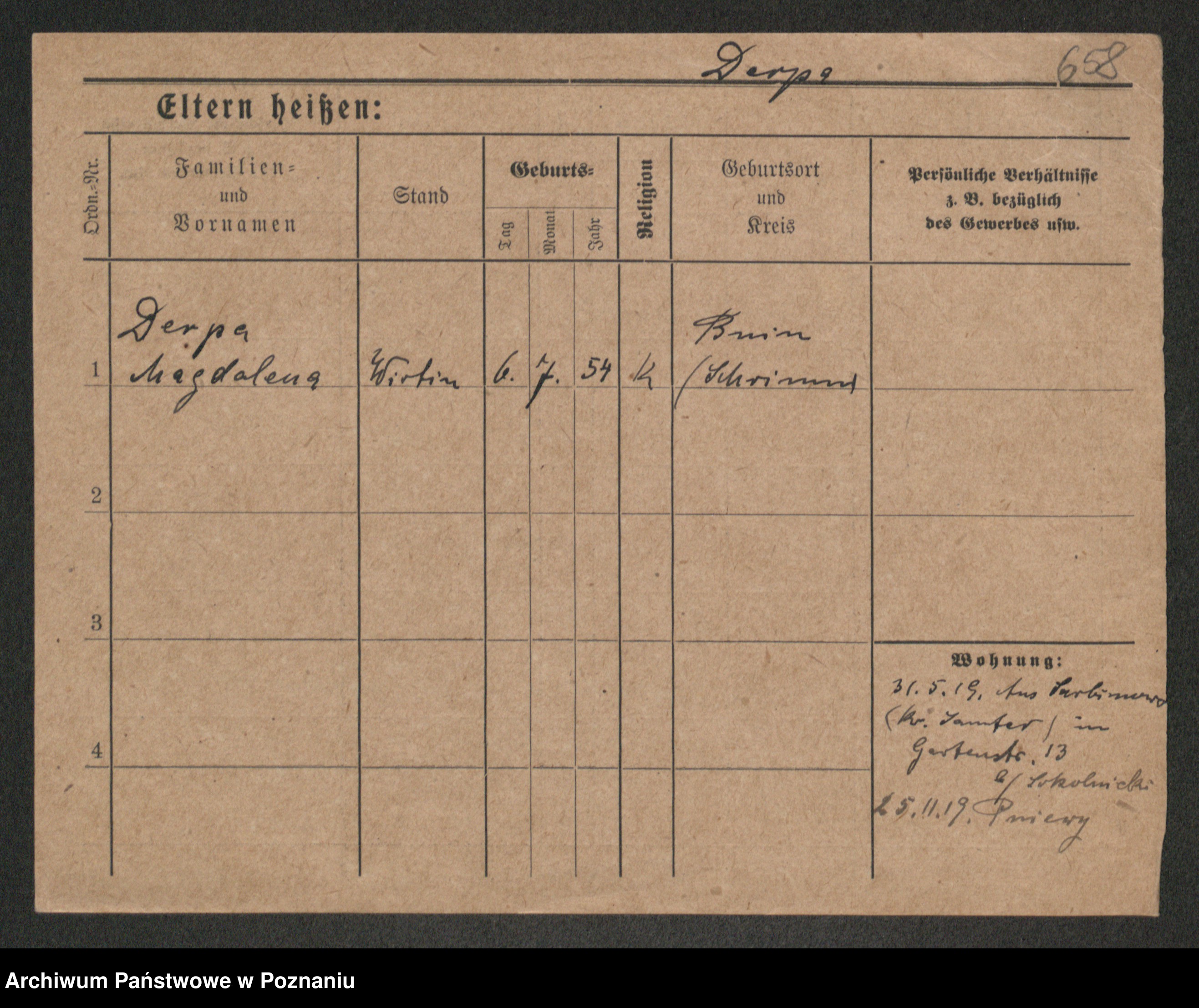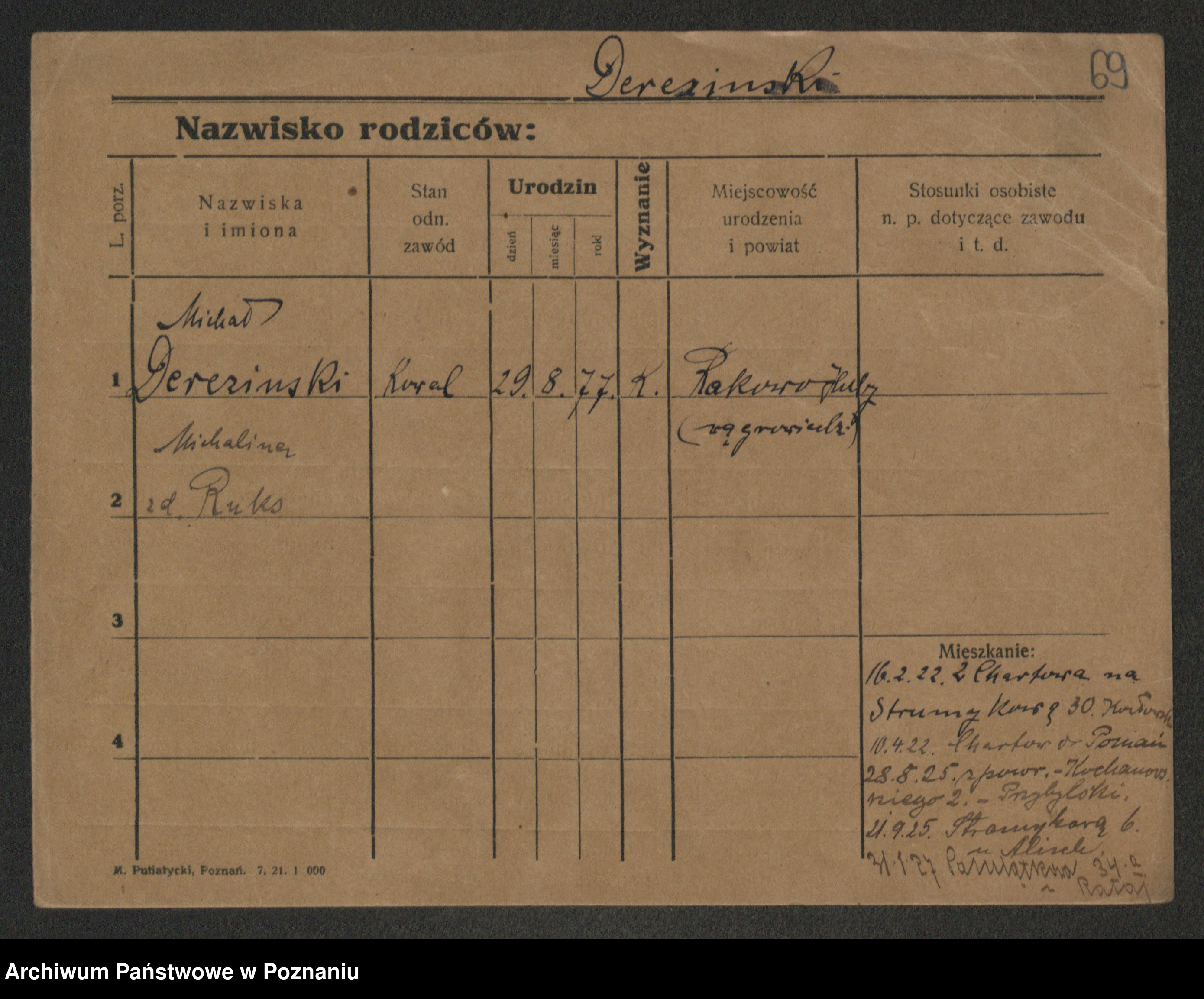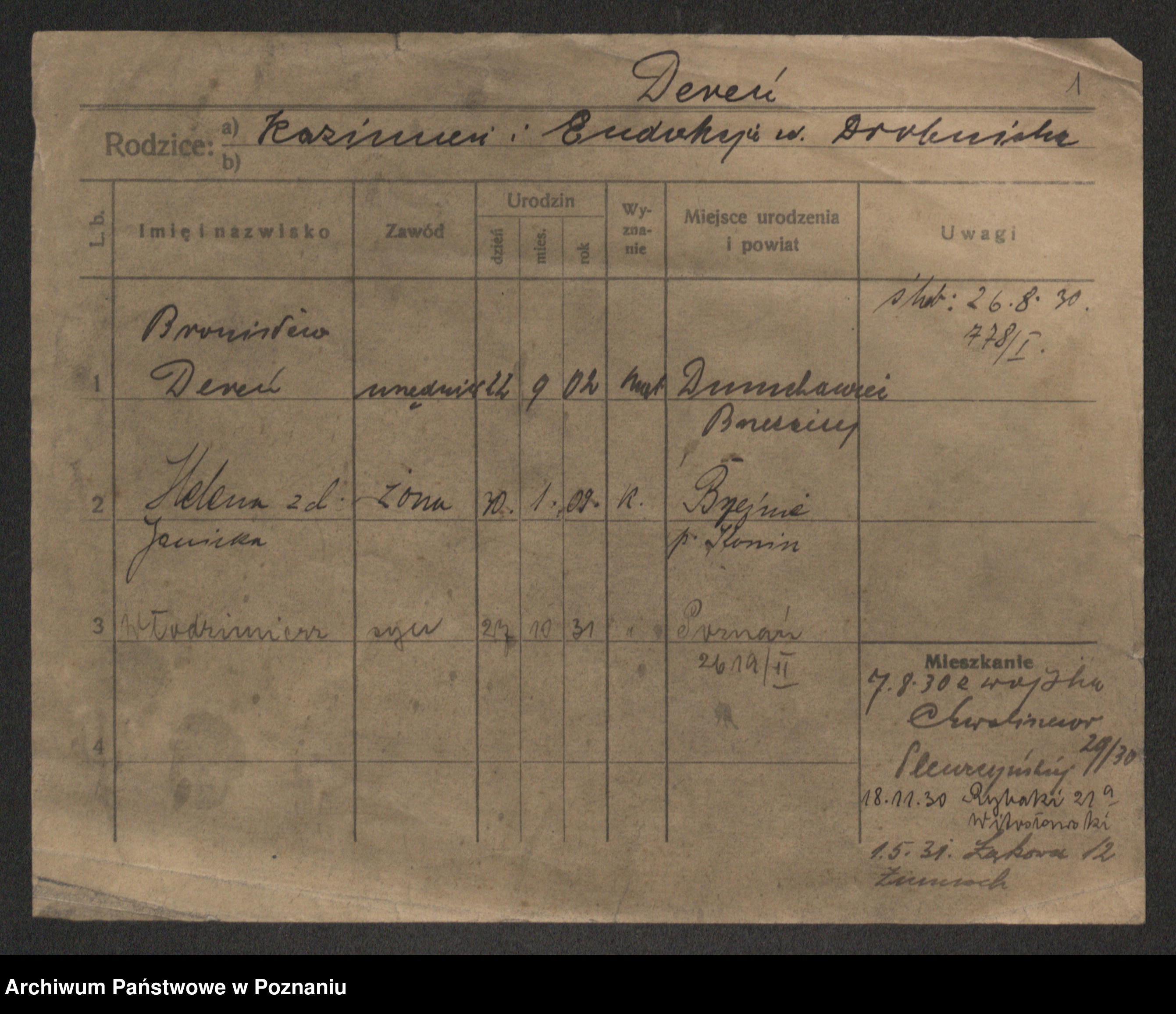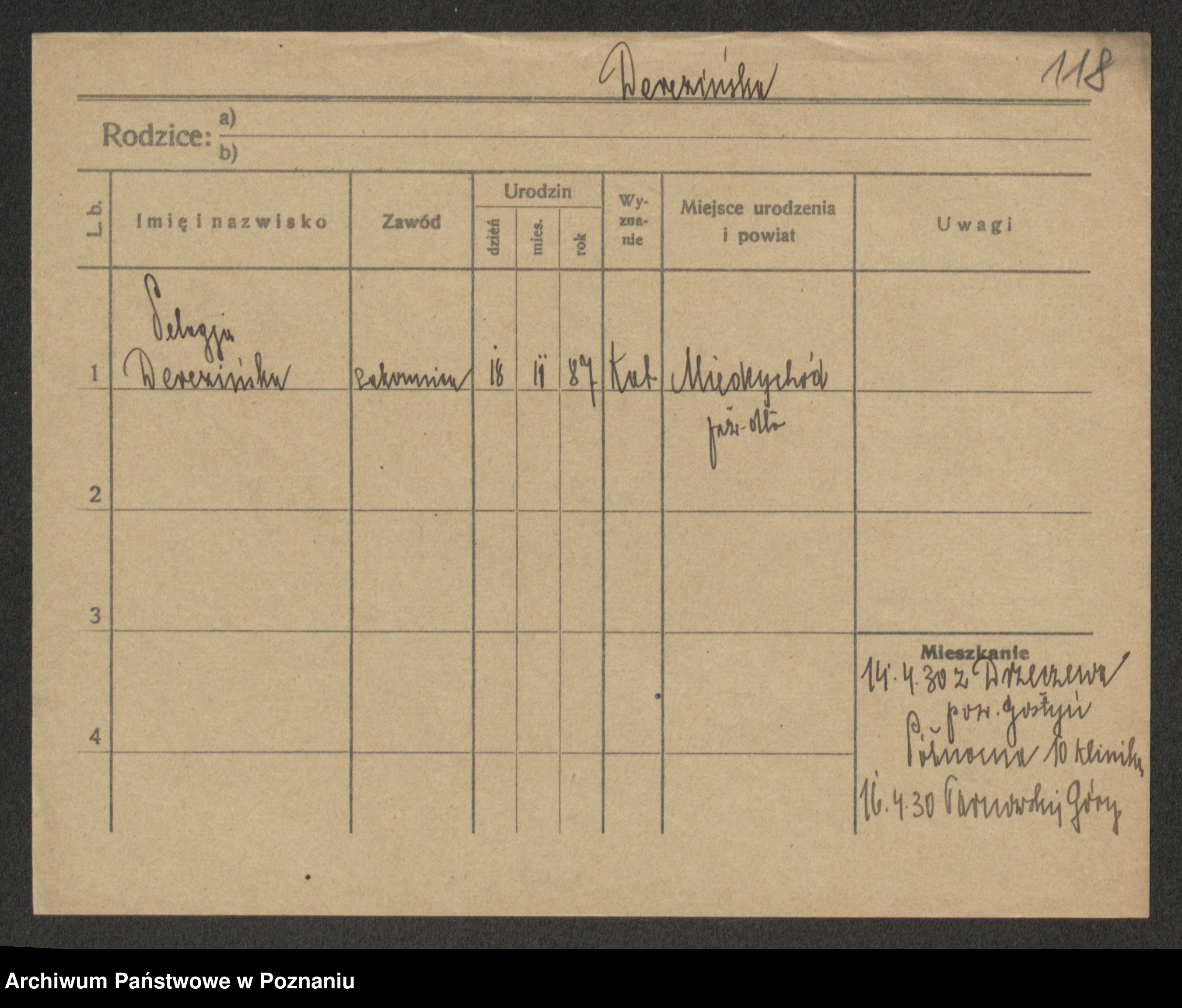 Podgląd karty osobowej dostępny jest po kliknięciu na nazwisko lub ikonkę karty. Można dokonywać powiększenia (ikony na górze) lub przechodzić między kolejnymi skanami (strzałki po bokach).