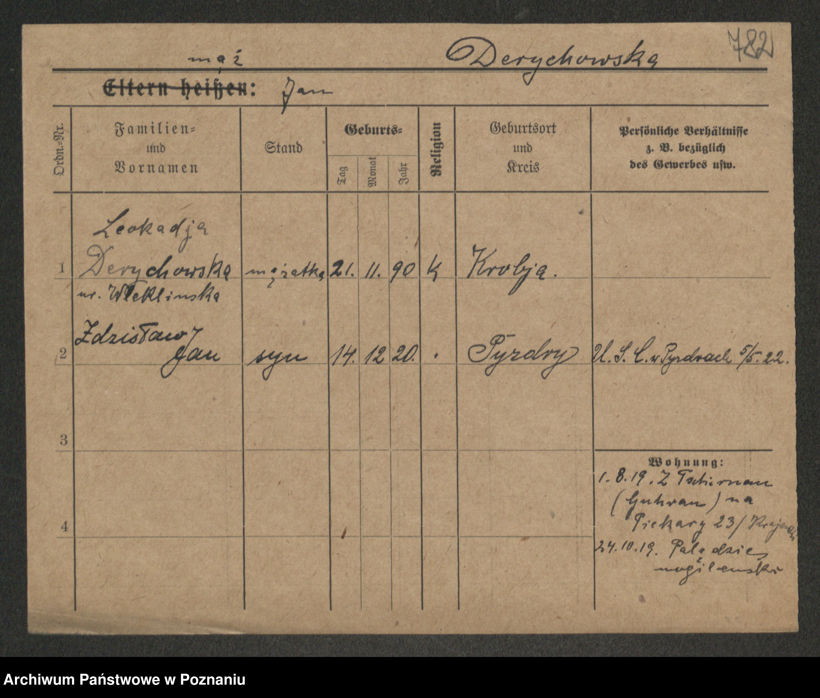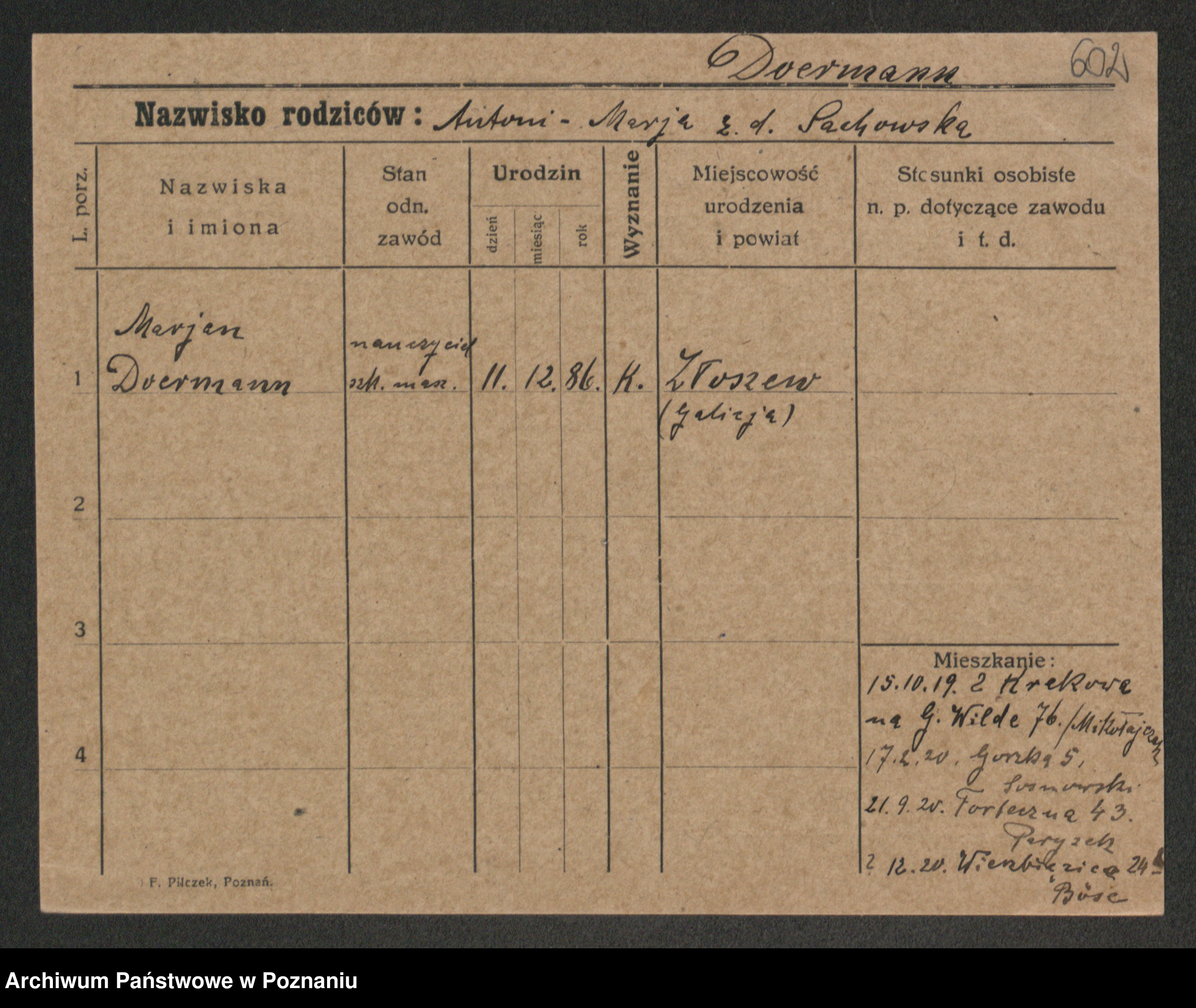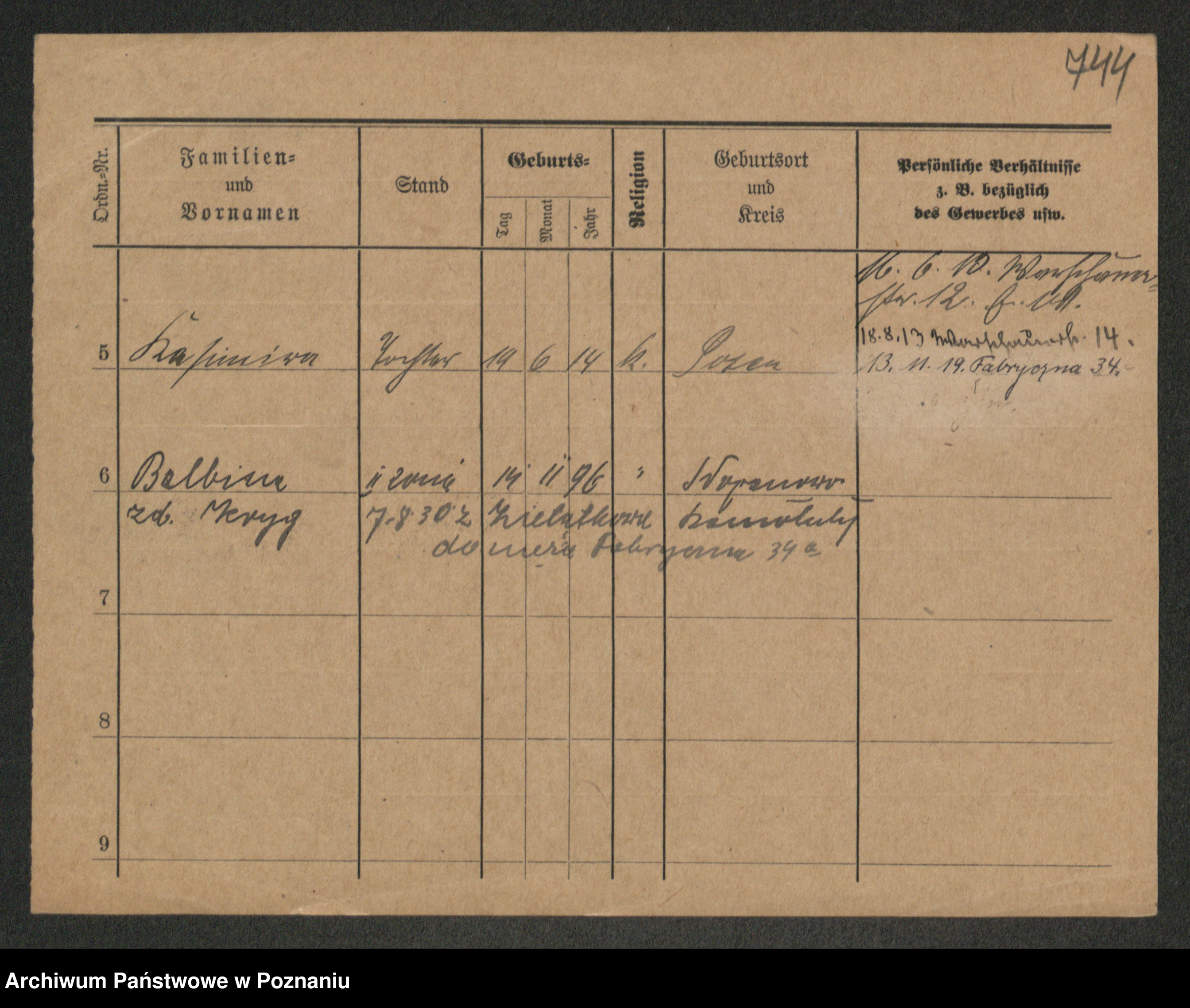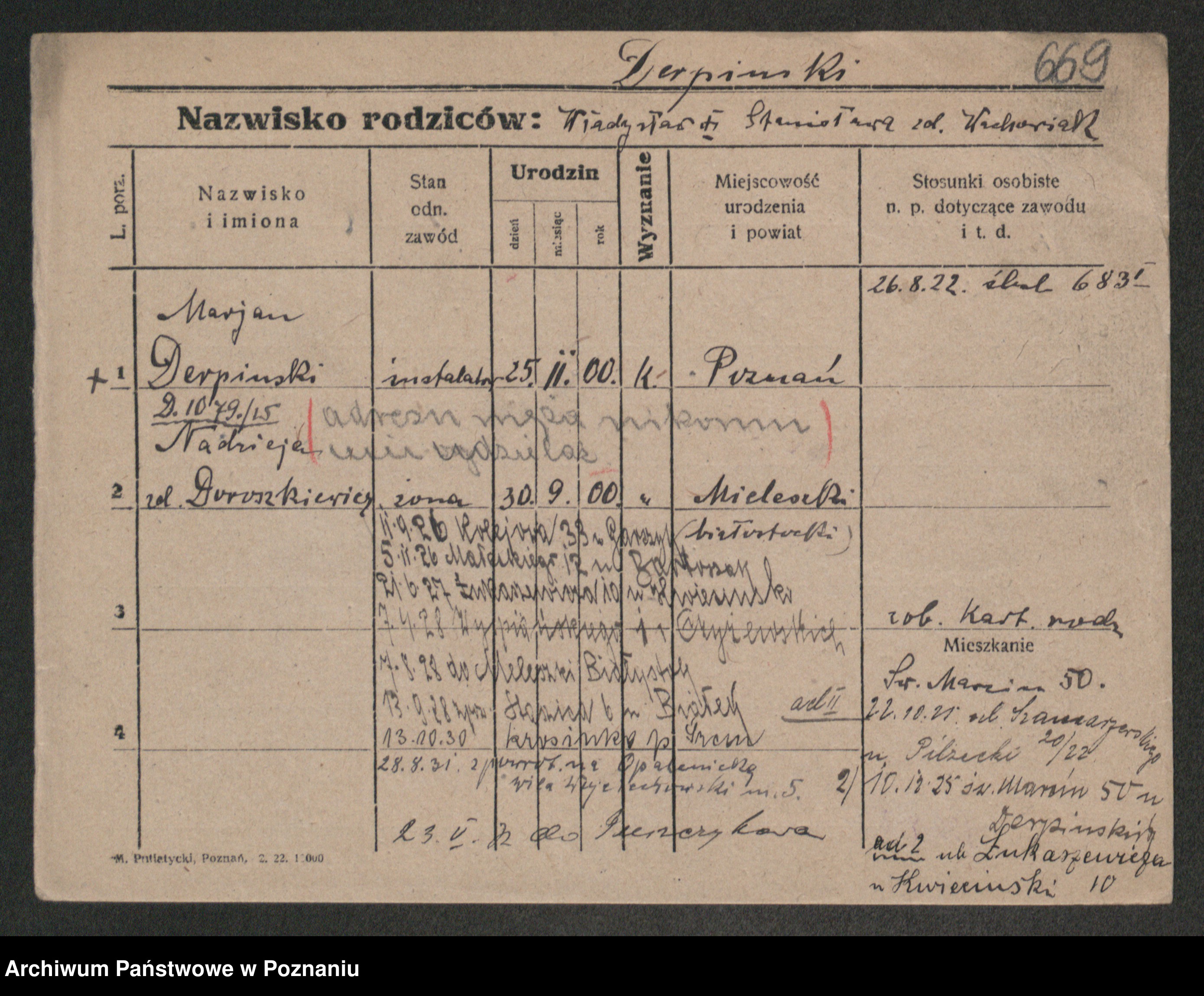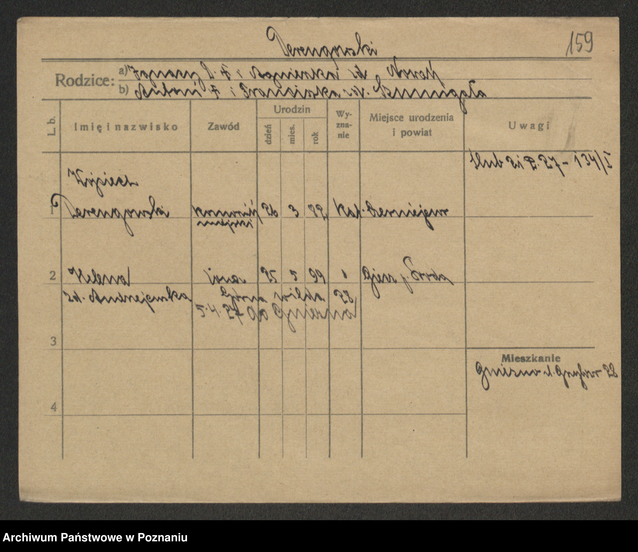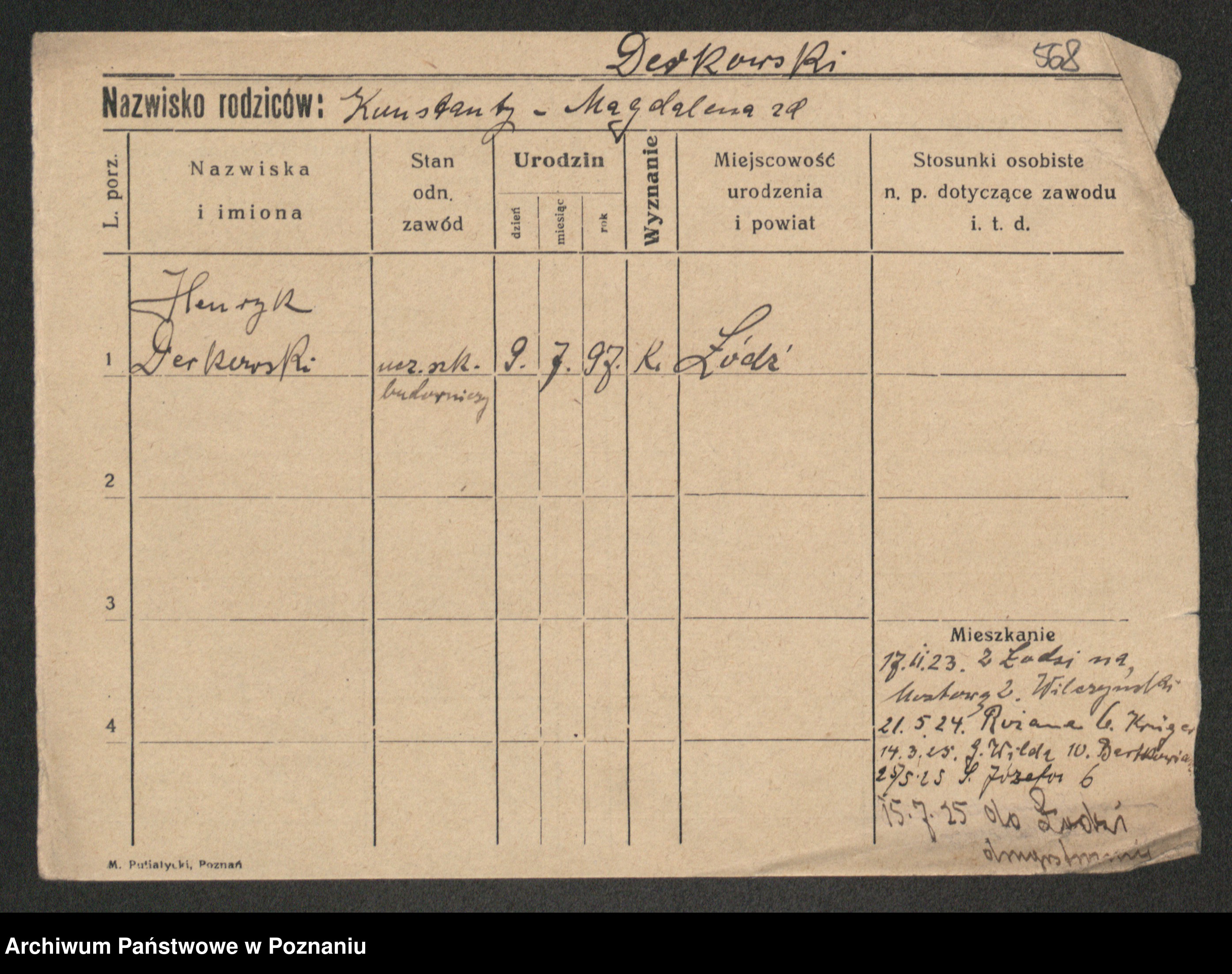 Podgląd karty osobowej dostępny jest po kliknięciu na nazwisko lub ikonkę karty. Można dokonywać powiększenia (ikony na górze) lub przechodzić między kolejnymi skanami (strzałki po bokach).