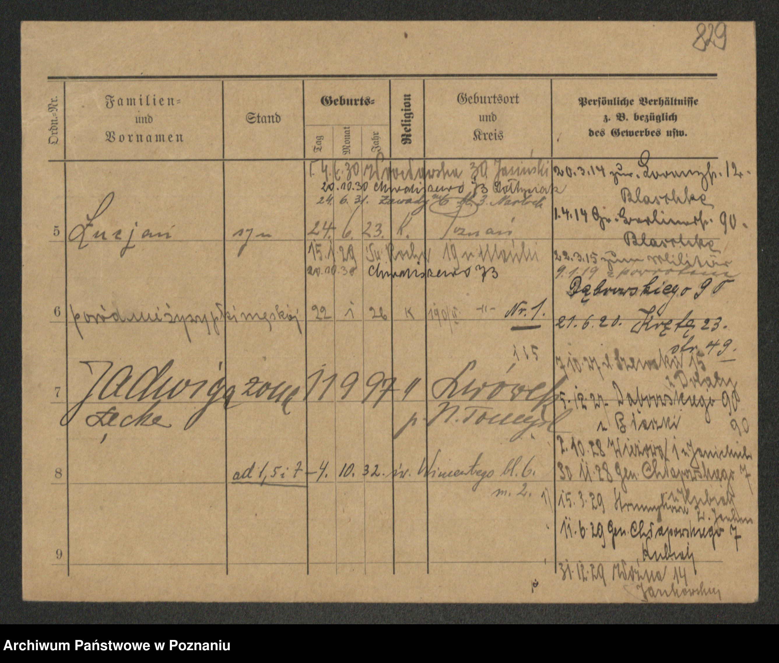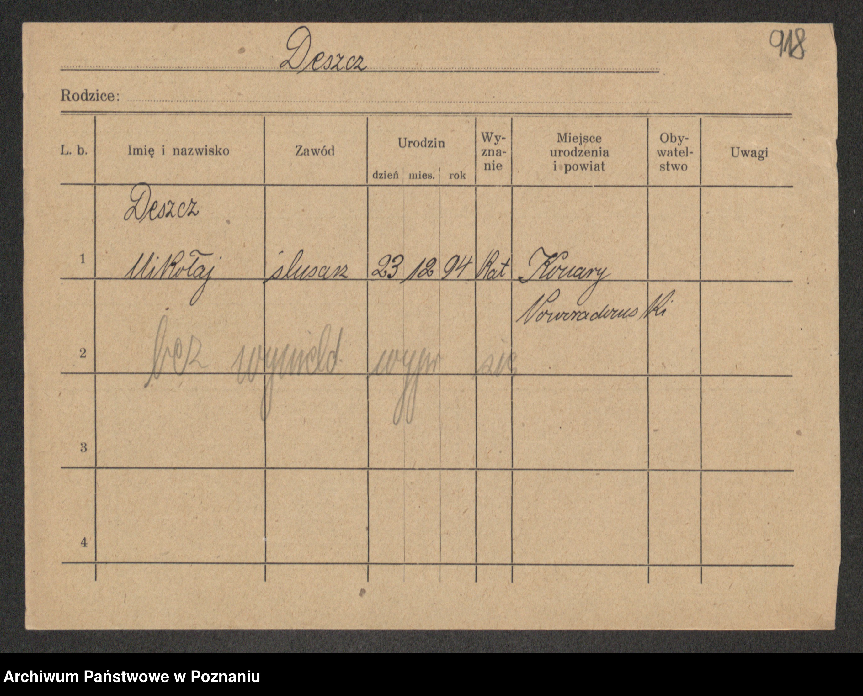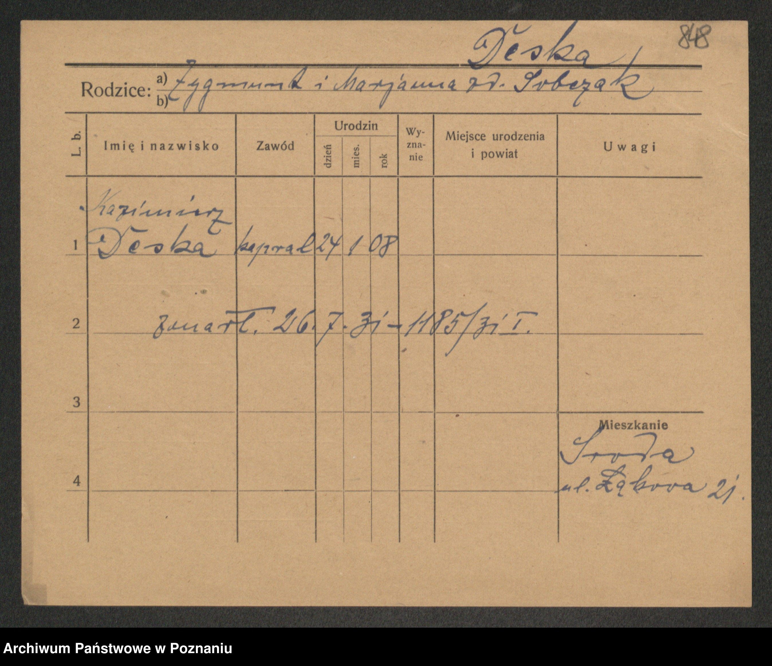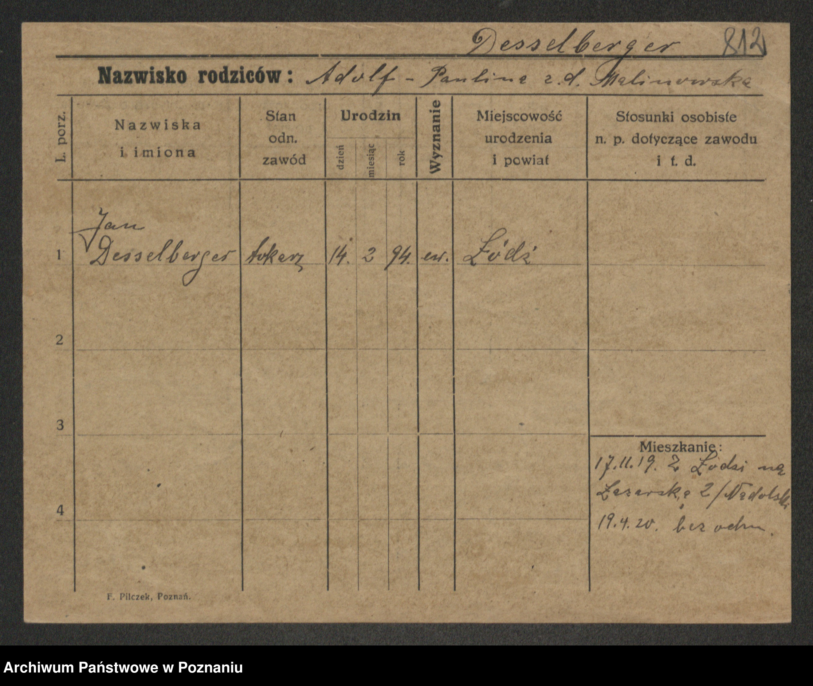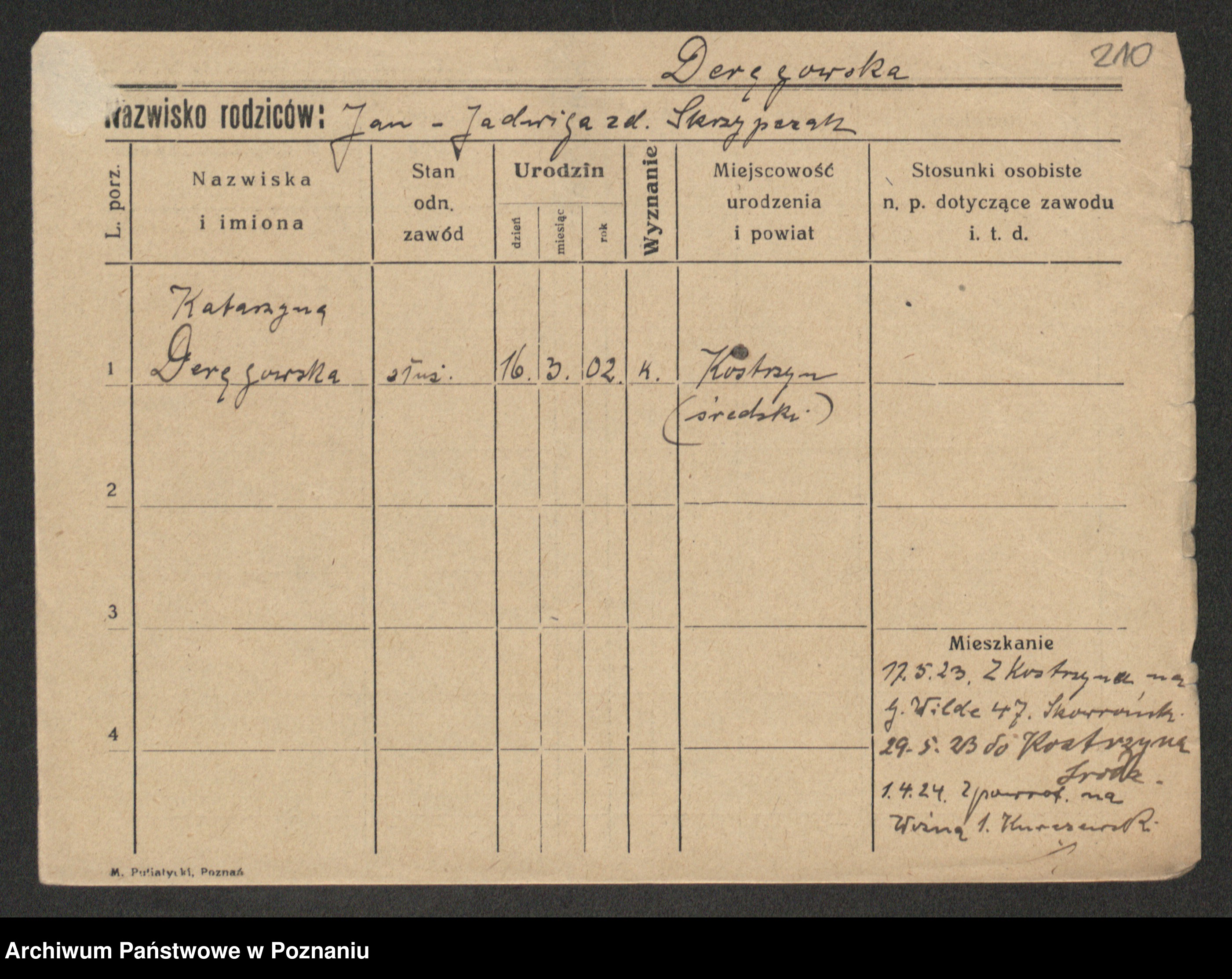 Podgląd karty osobowej dostępny jest po kliknięciu na nazwisko lub ikonkę karty. Można dokonywać powiększenia (ikony na górze) lub przechodzić między kolejnymi skanami (strzałki po bokach).