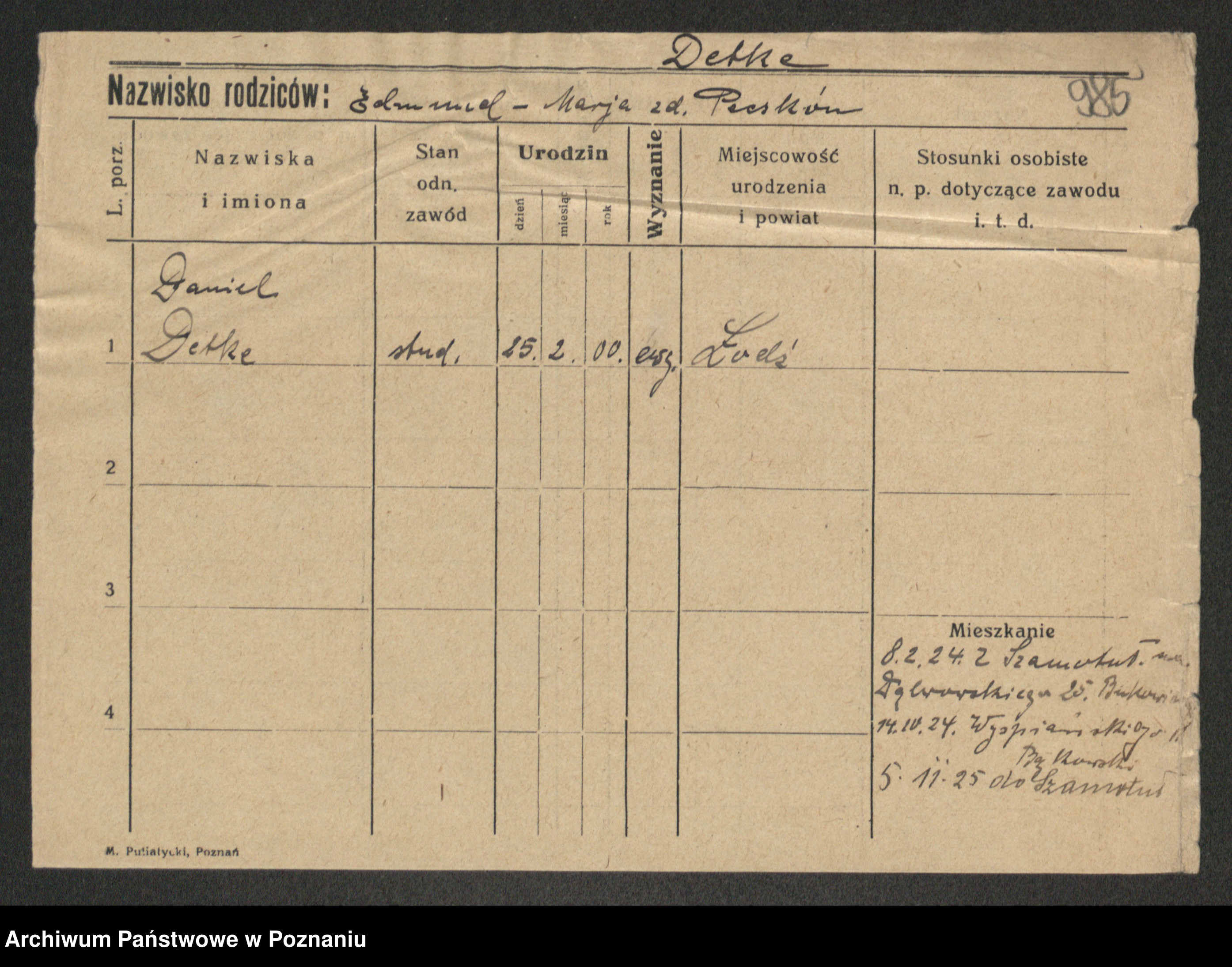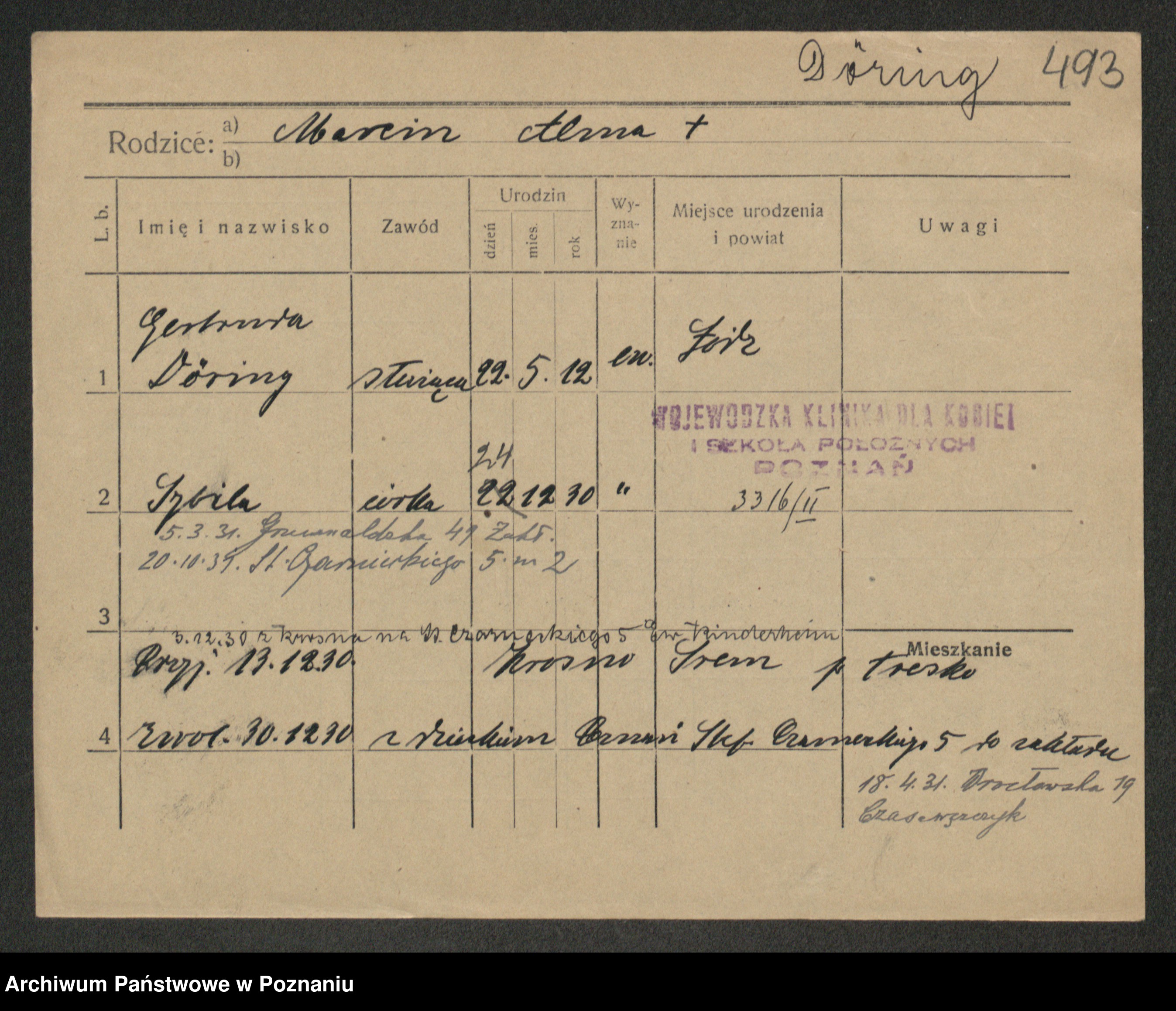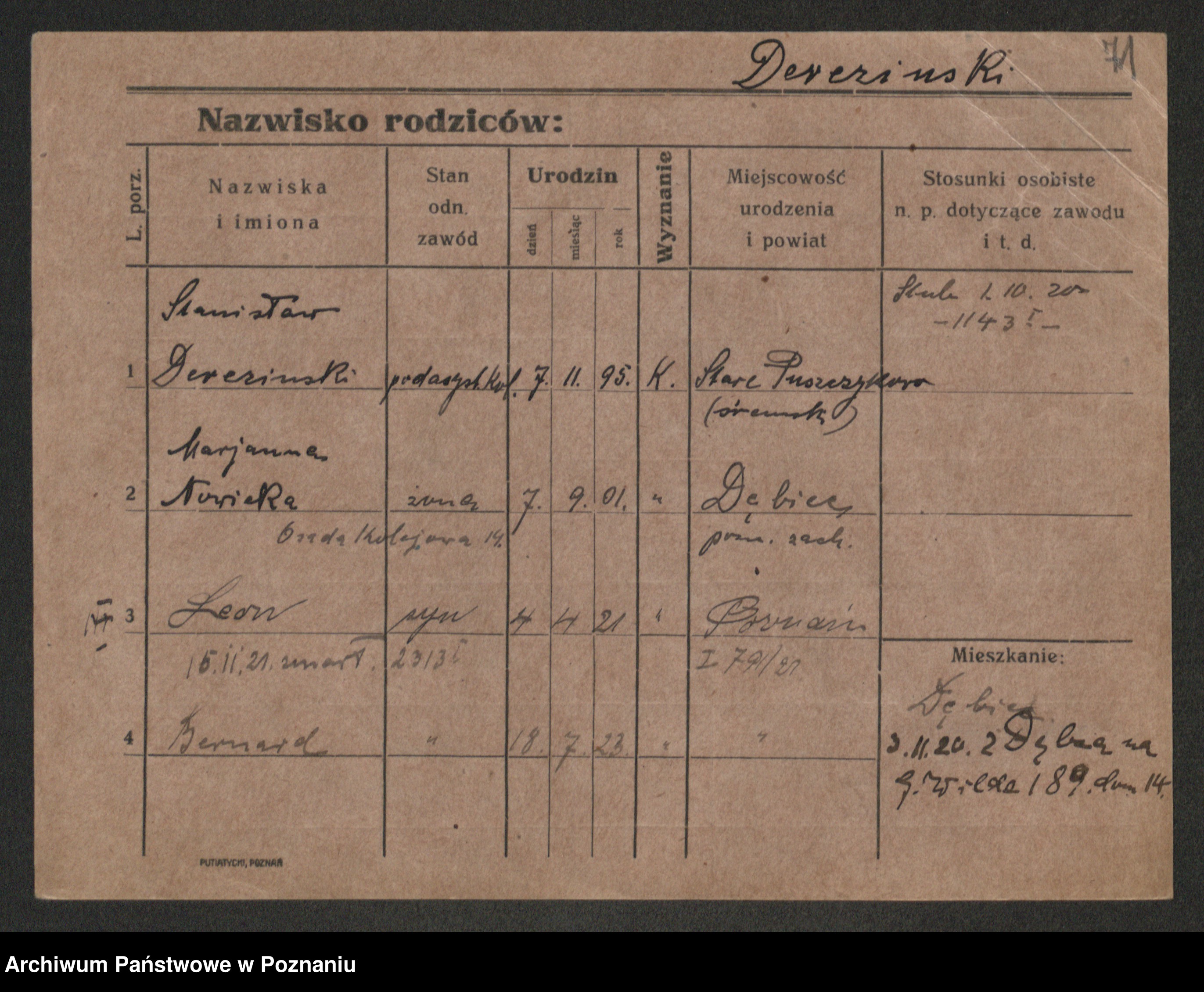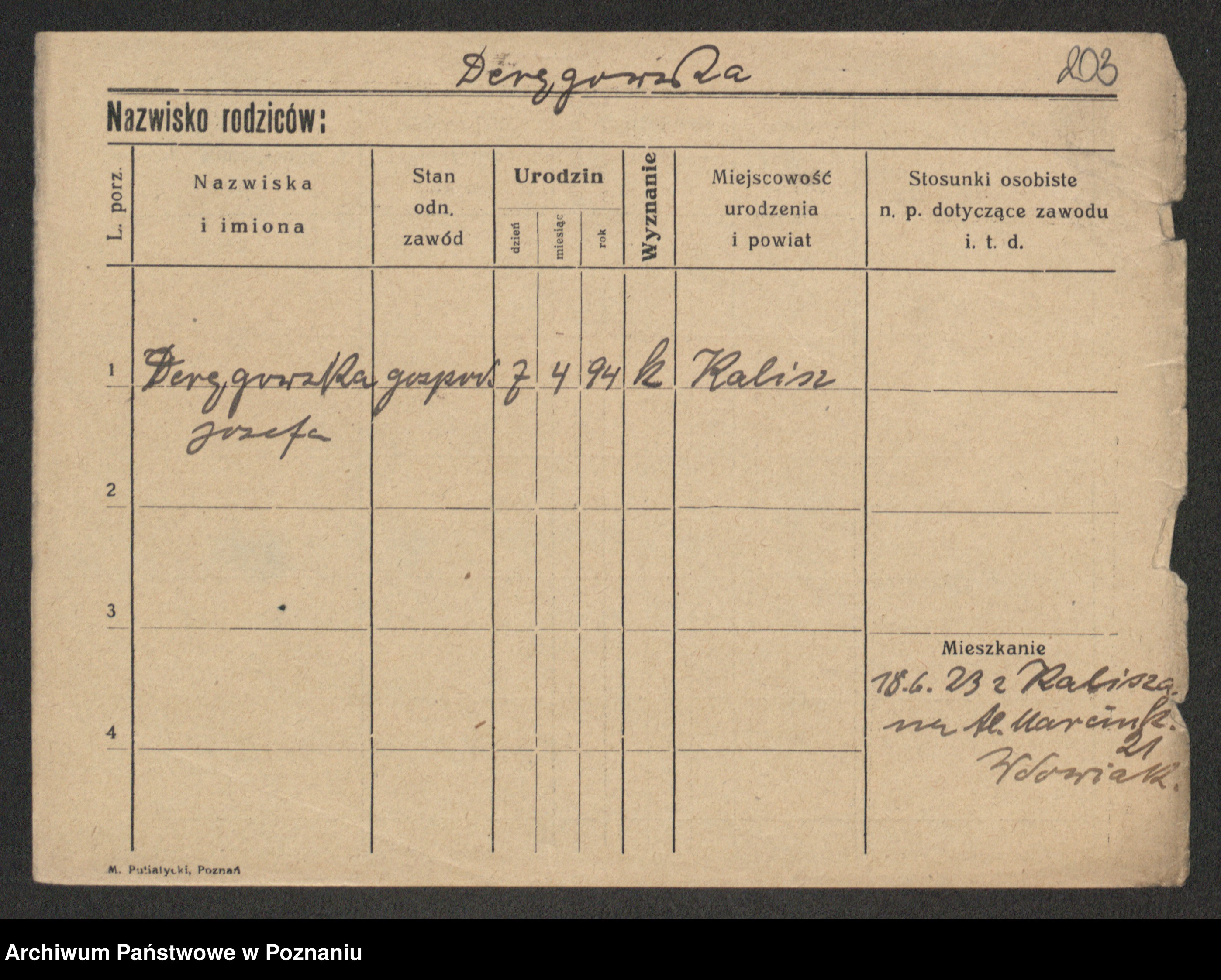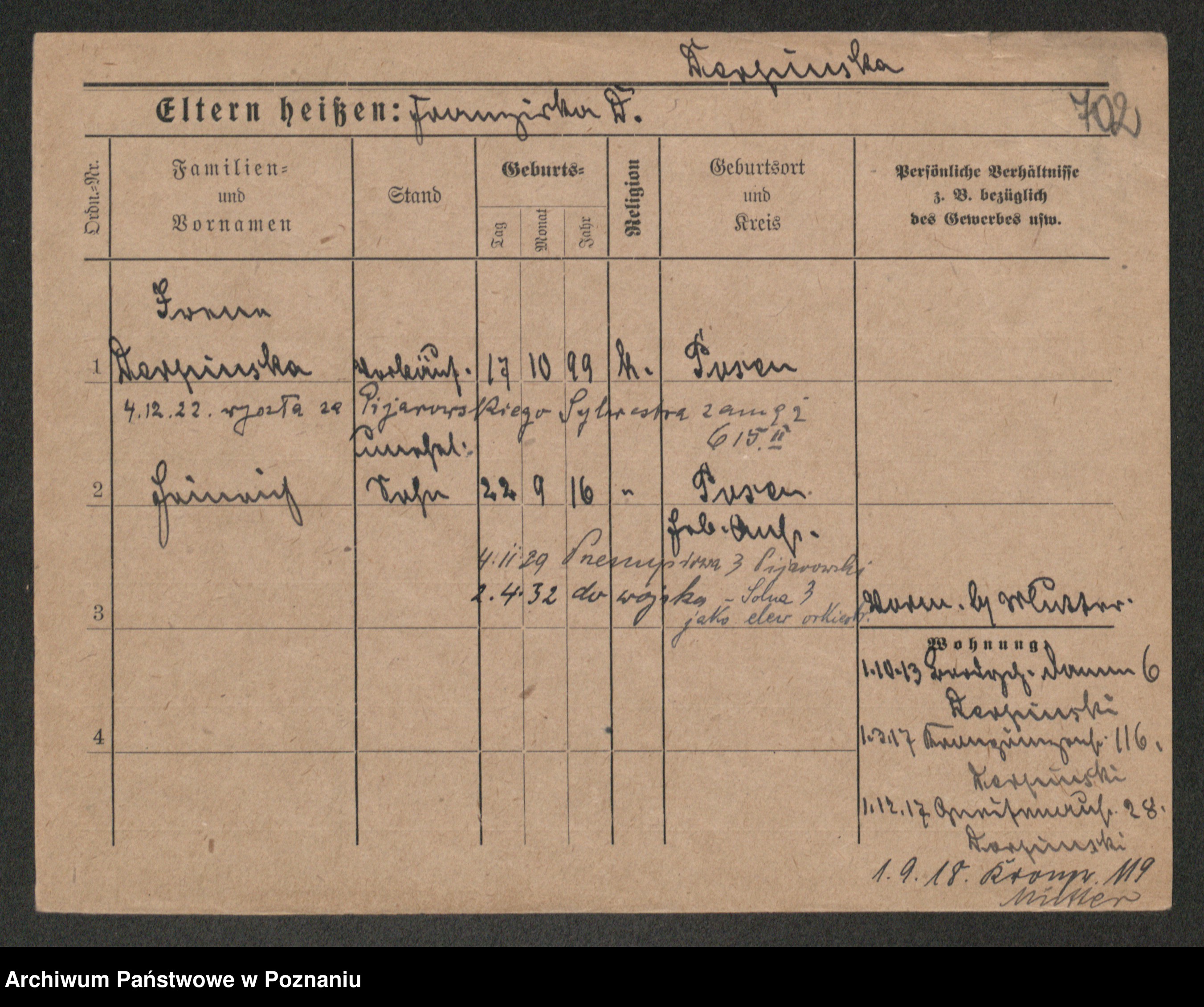 Podgląd karty osobowej dostępny jest po kliknięciu na nazwisko lub ikonkę karty. Można dokonywać powiększenia (ikony na górze) lub przechodzić między kolejnymi skanami (strzałki po bokach).