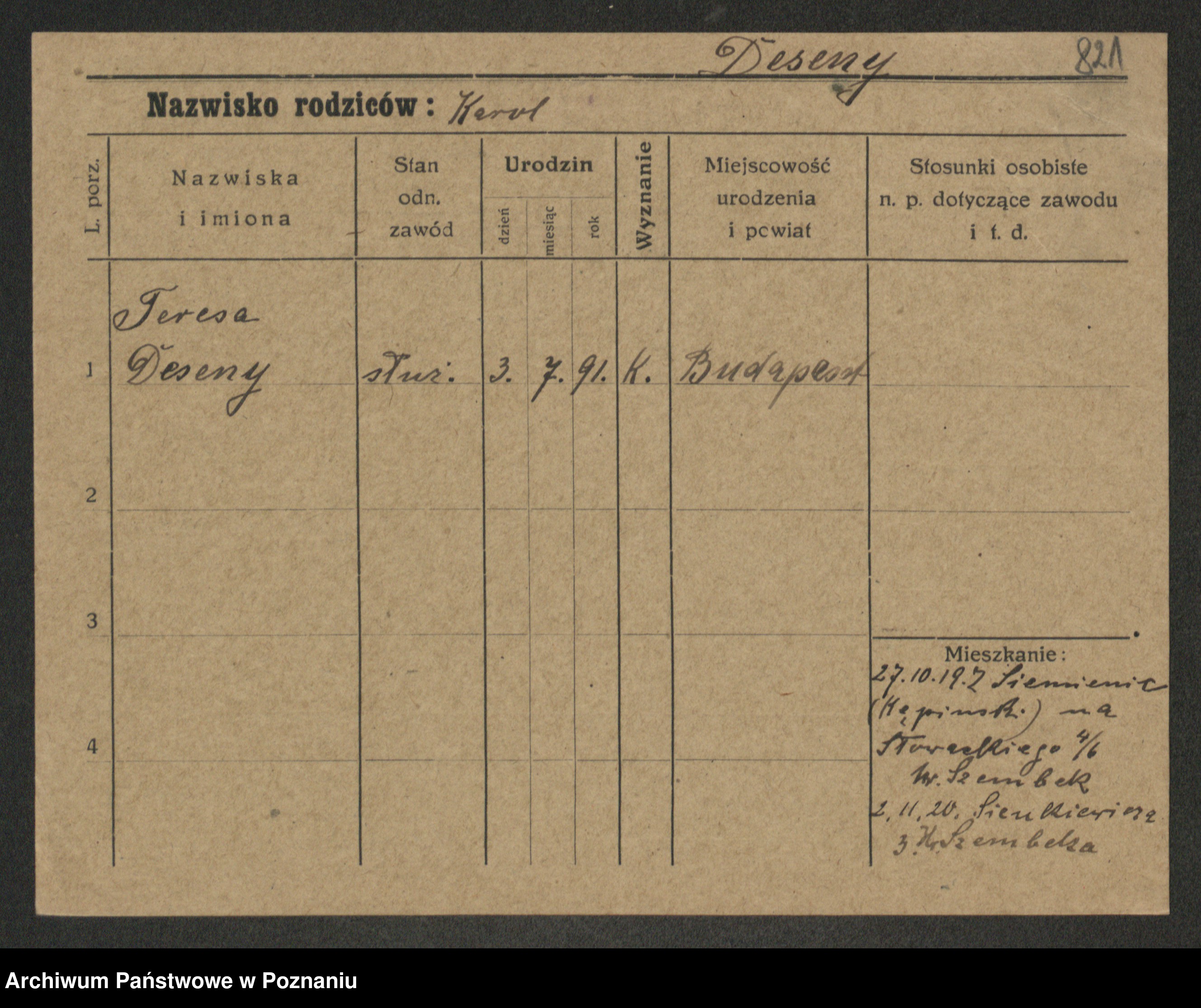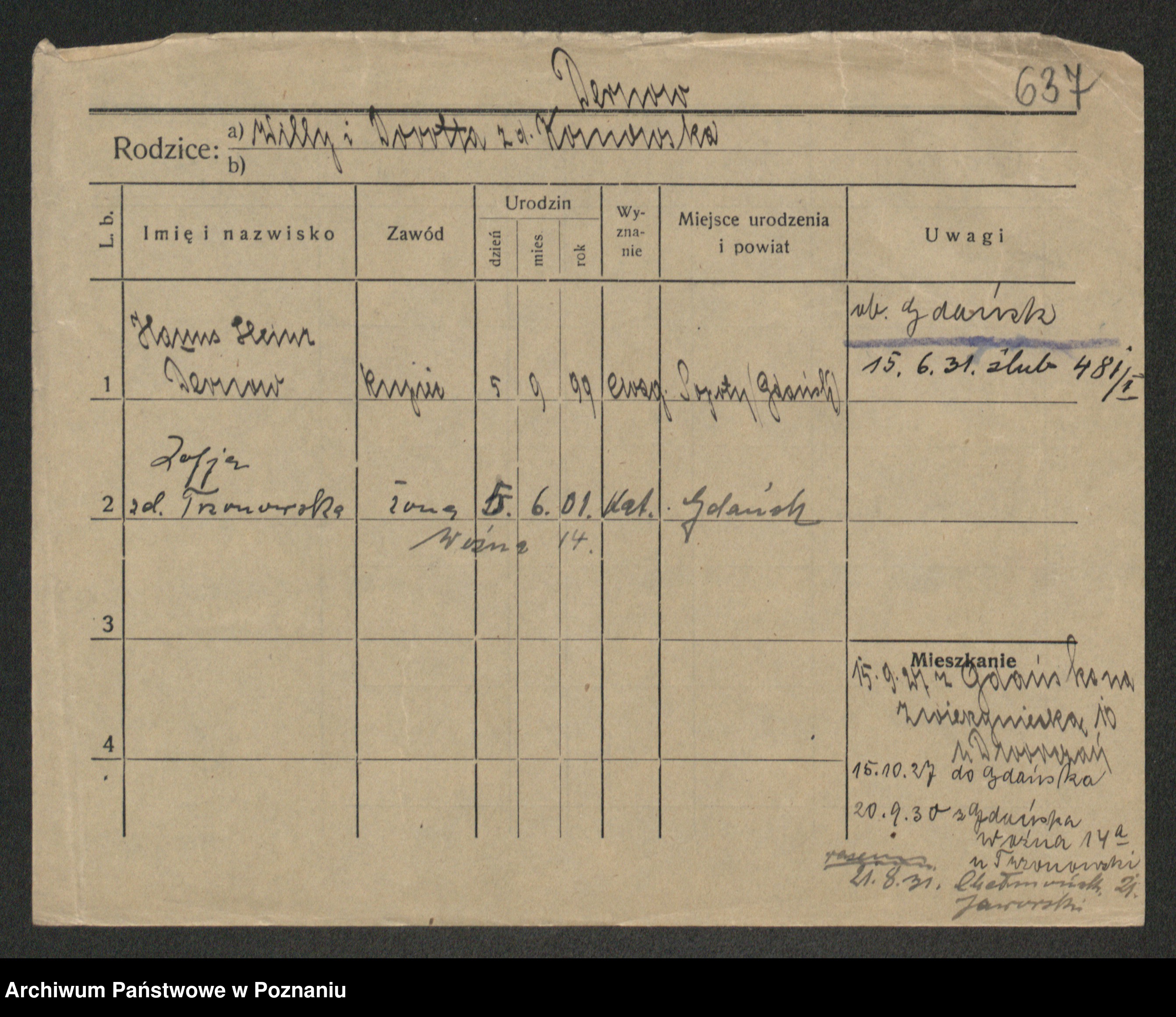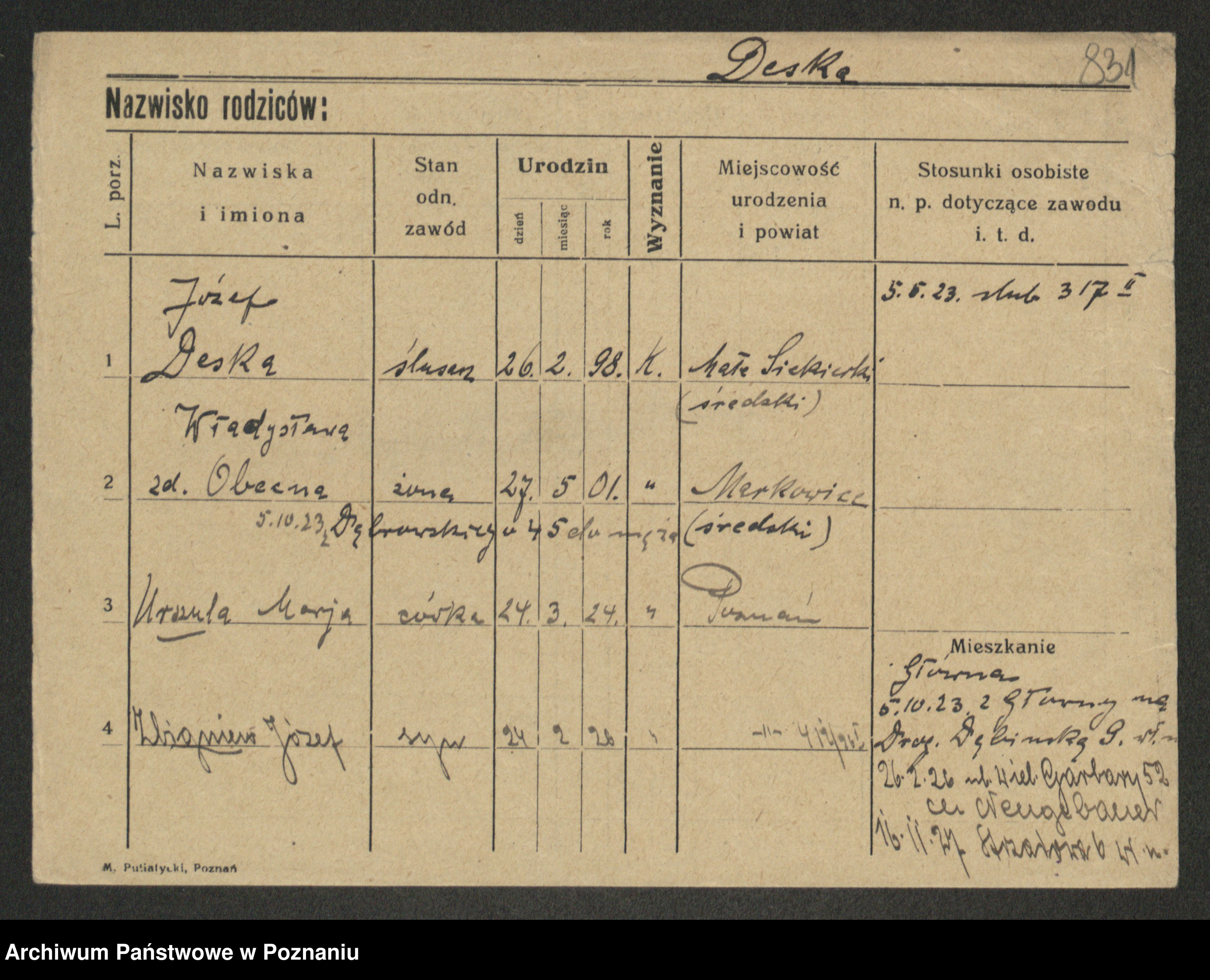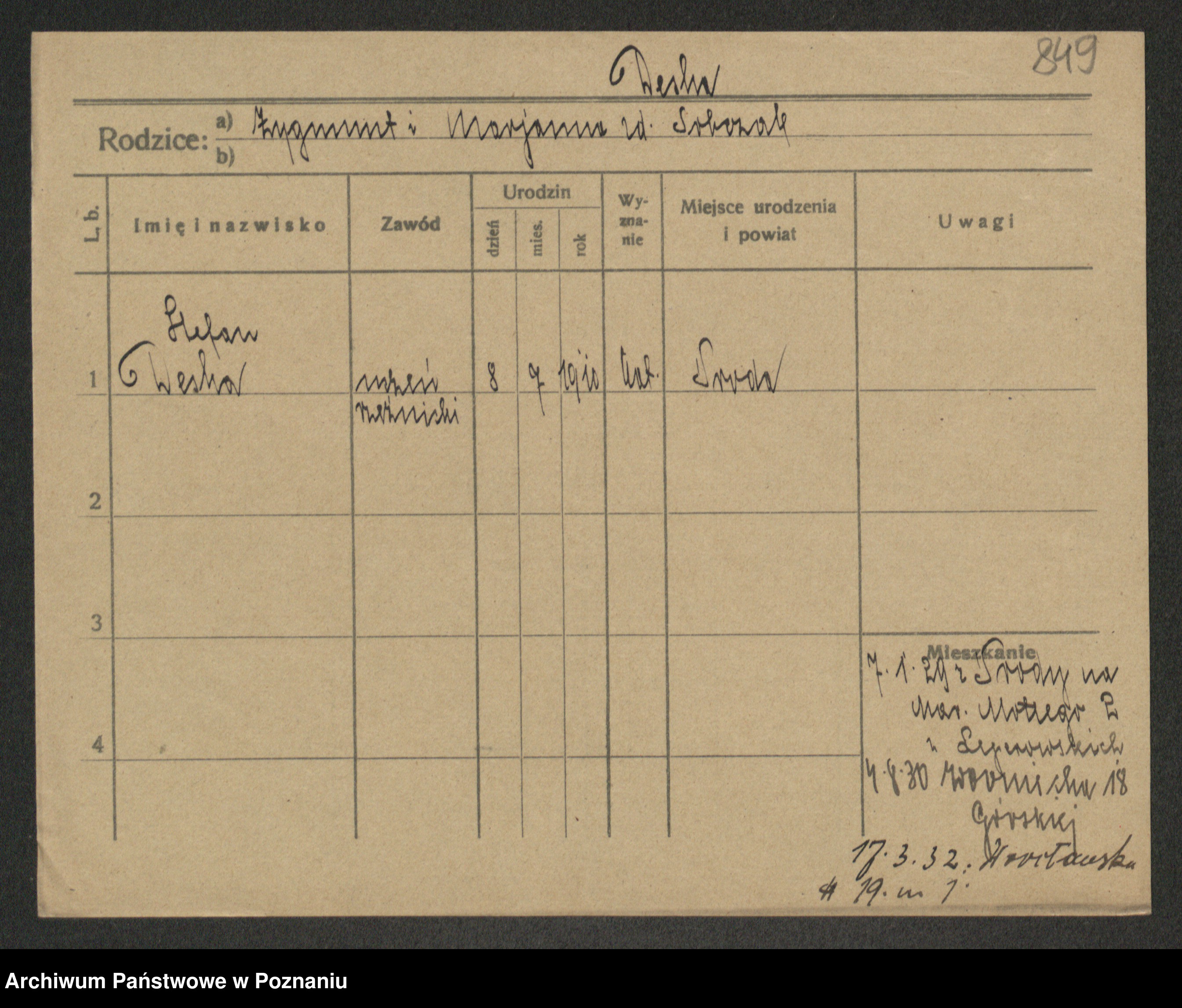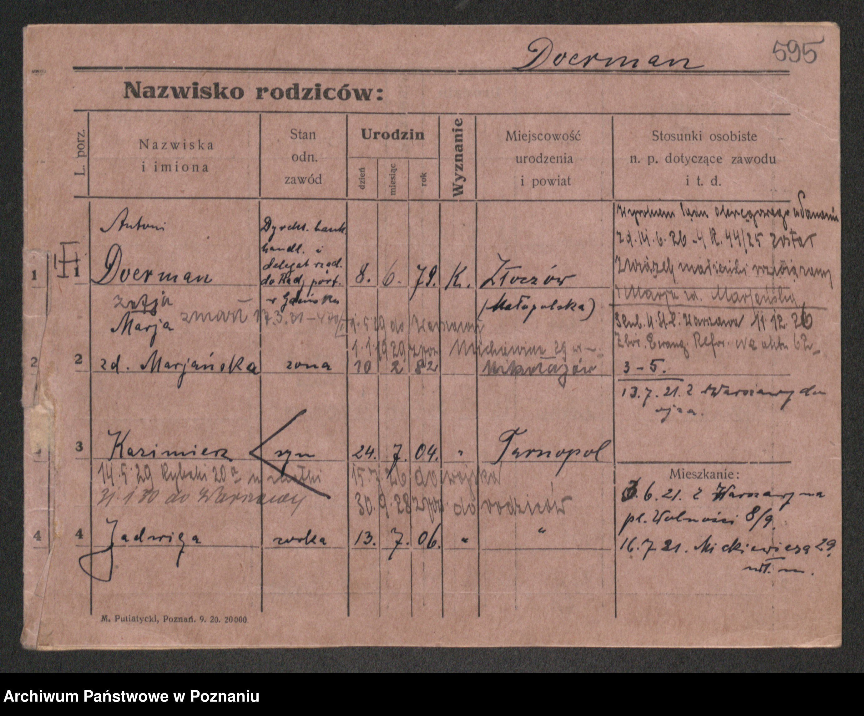 Podgląd karty osobowej dostępny jest po kliknięciu na nazwisko lub ikonkę karty. Można dokonywać powiększenia (ikony na górze) lub przechodzić między kolejnymi skanami (strzałki po bokach).