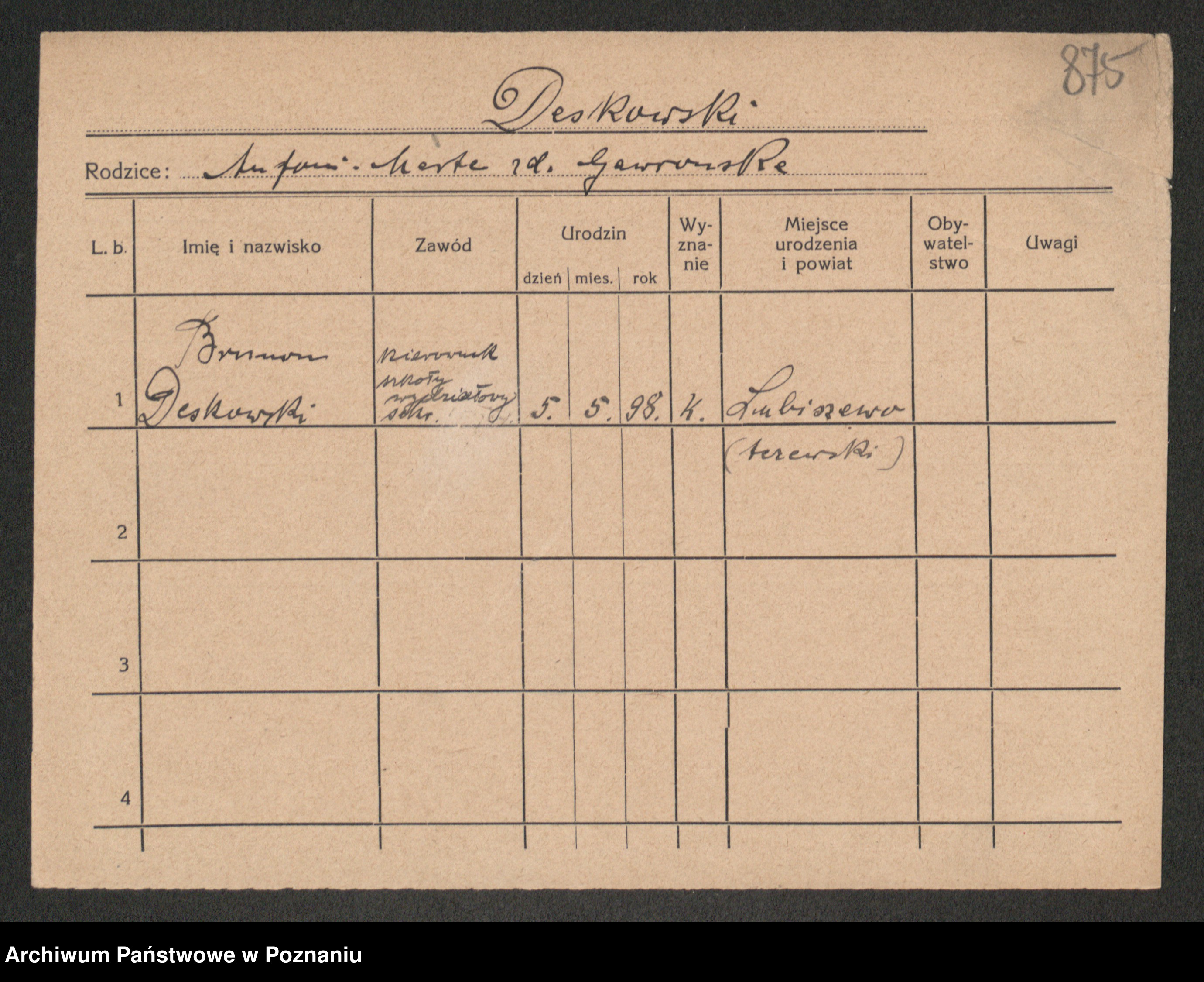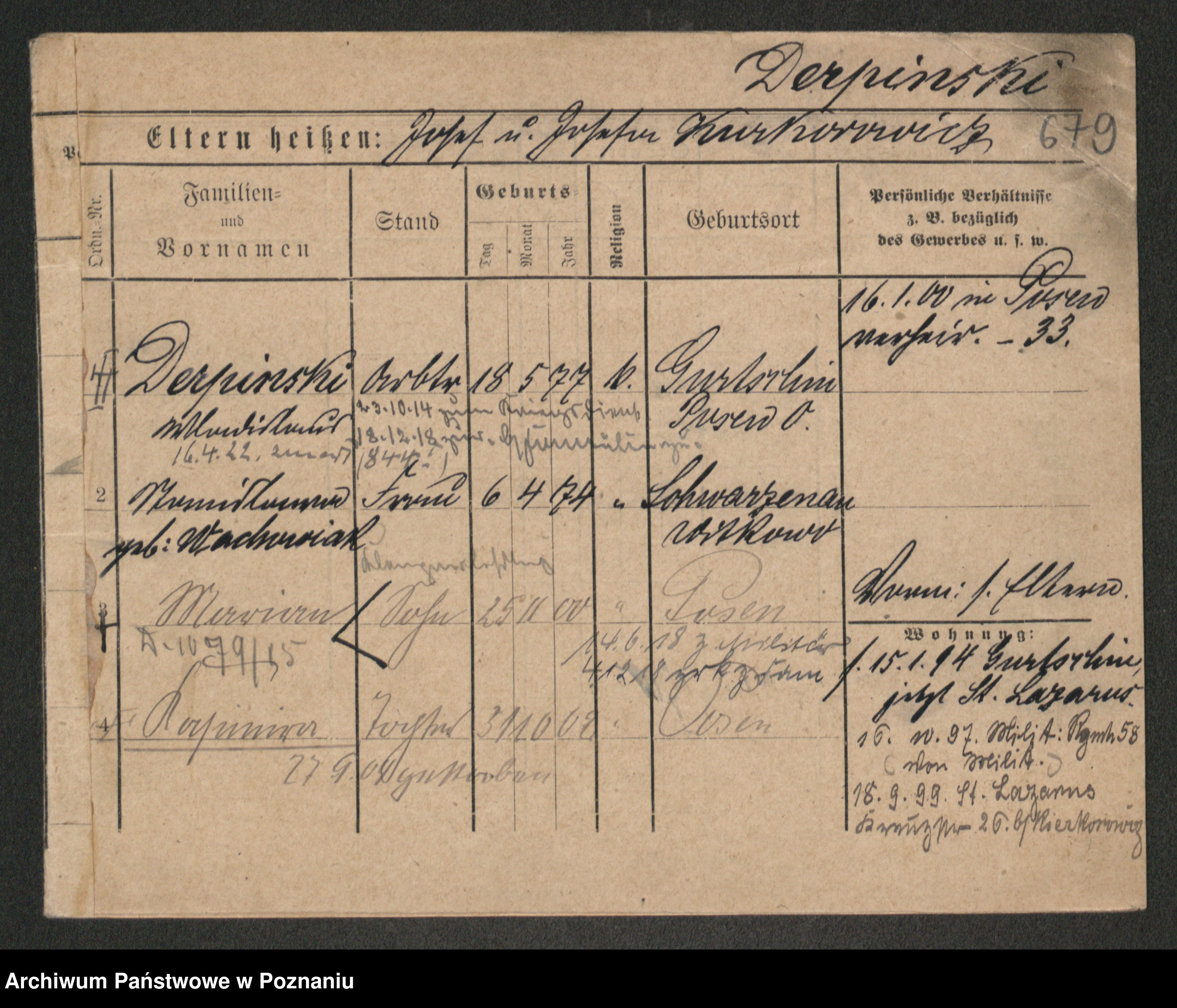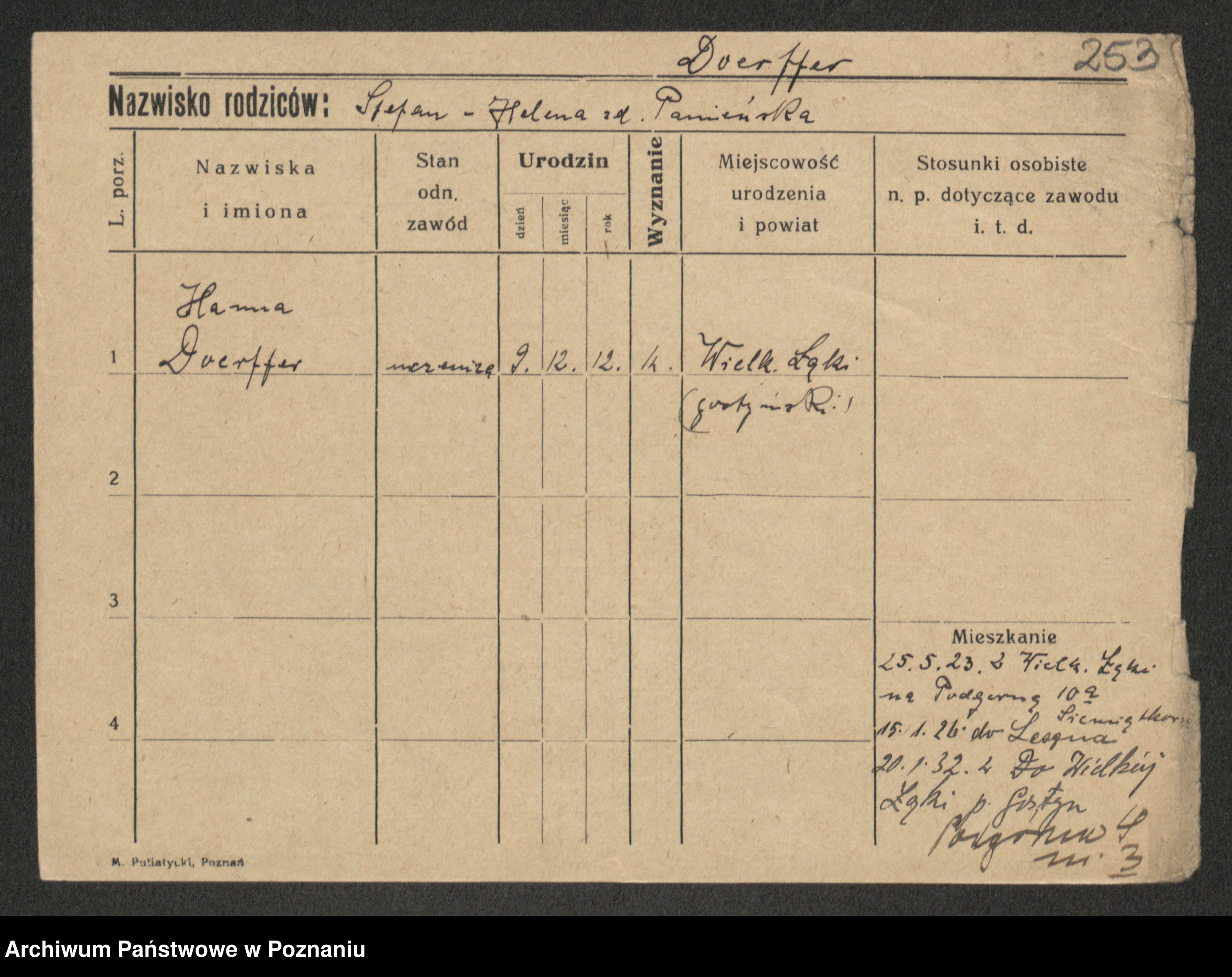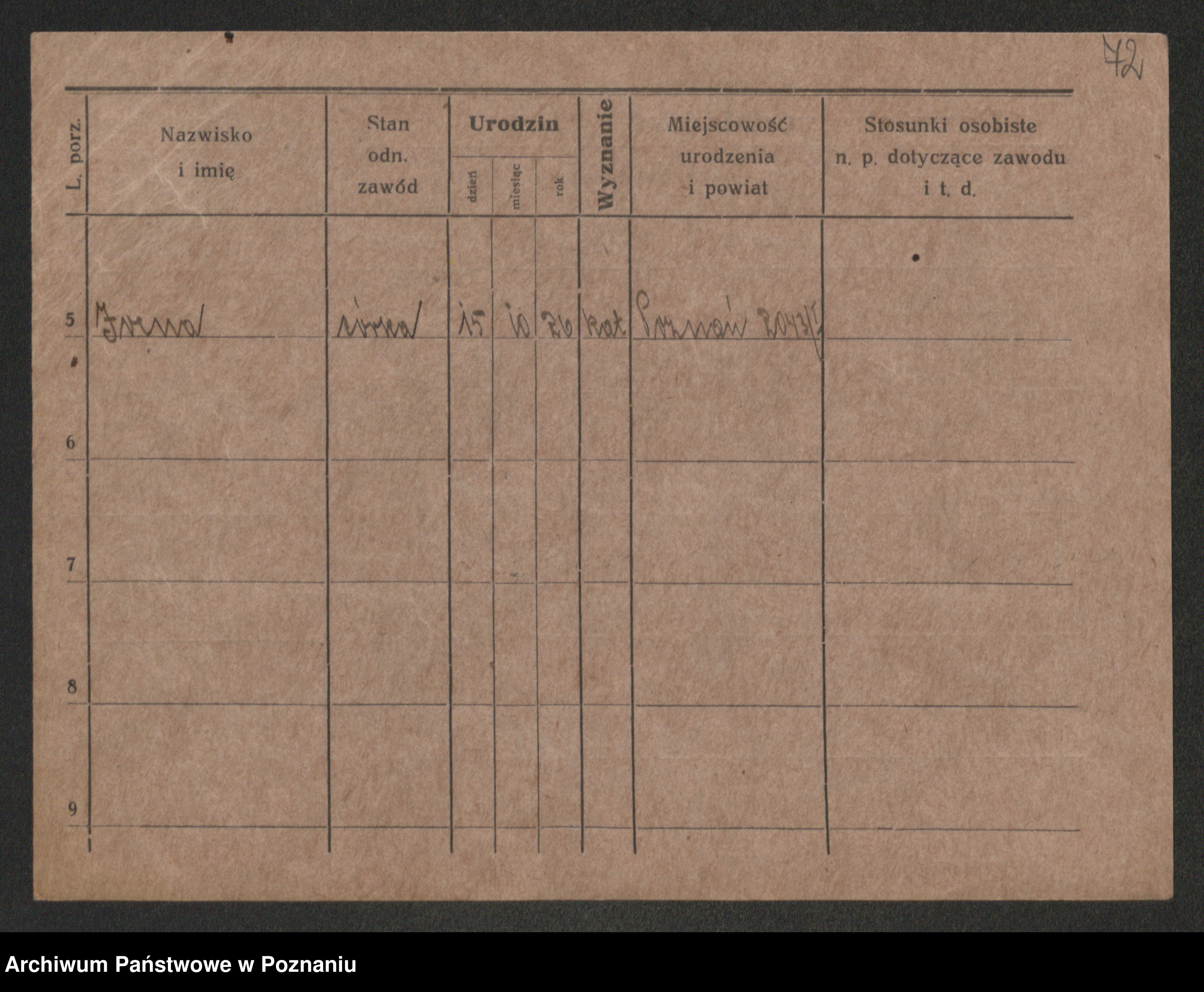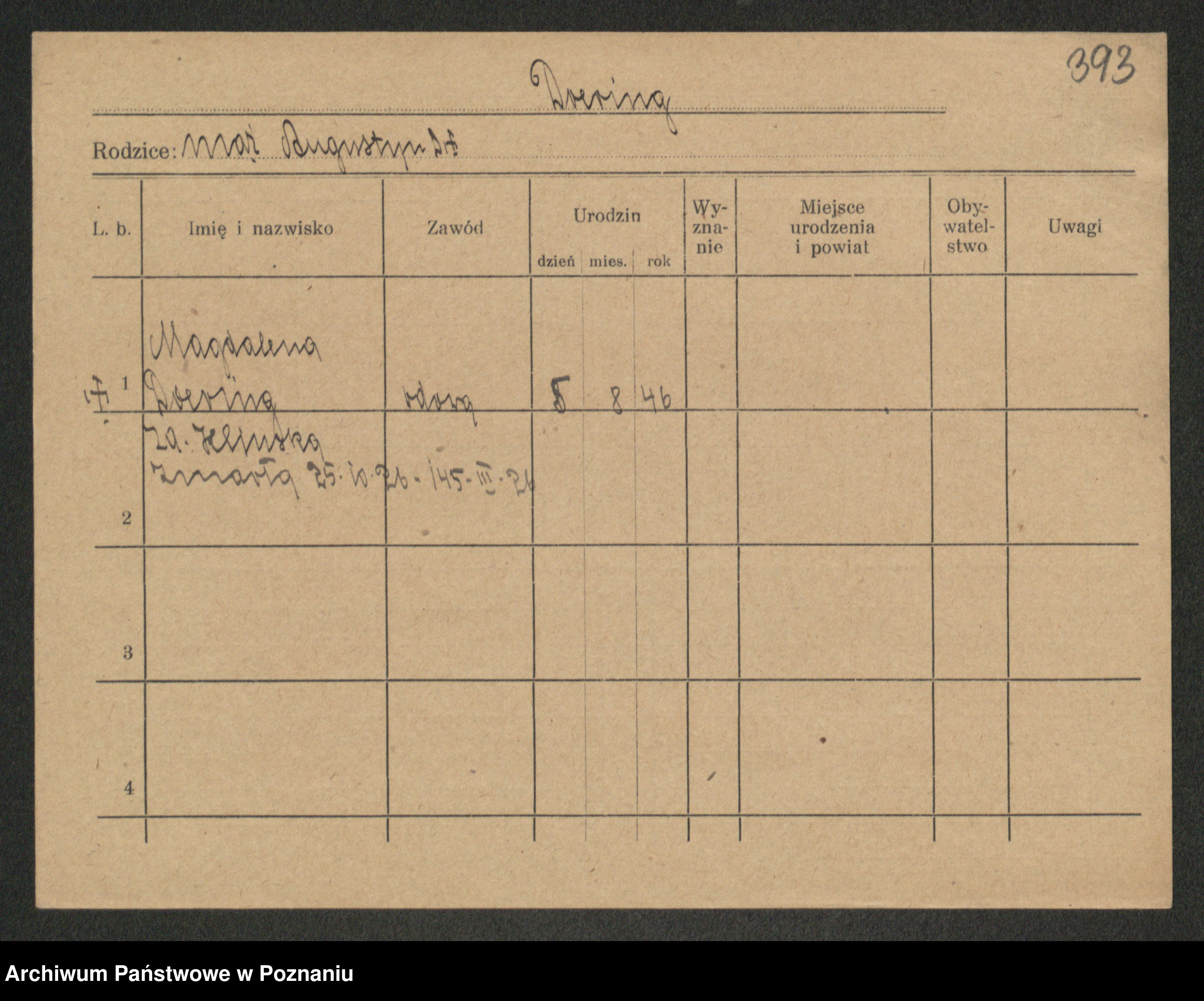 Podgląd karty osobowej dostępny jest po kliknięciu na nazwisko lub ikonkę karty. Można dokonywać powiększenia (ikony na górze) lub przechodzić między kolejnymi skanami (strzałki po bokach).