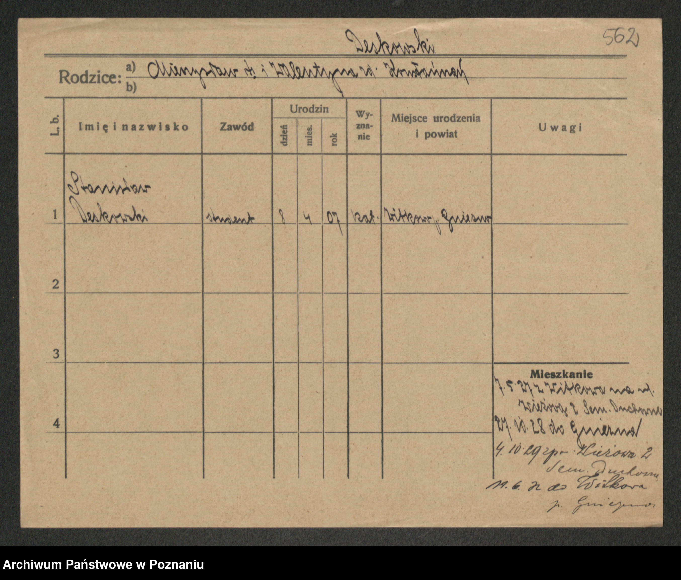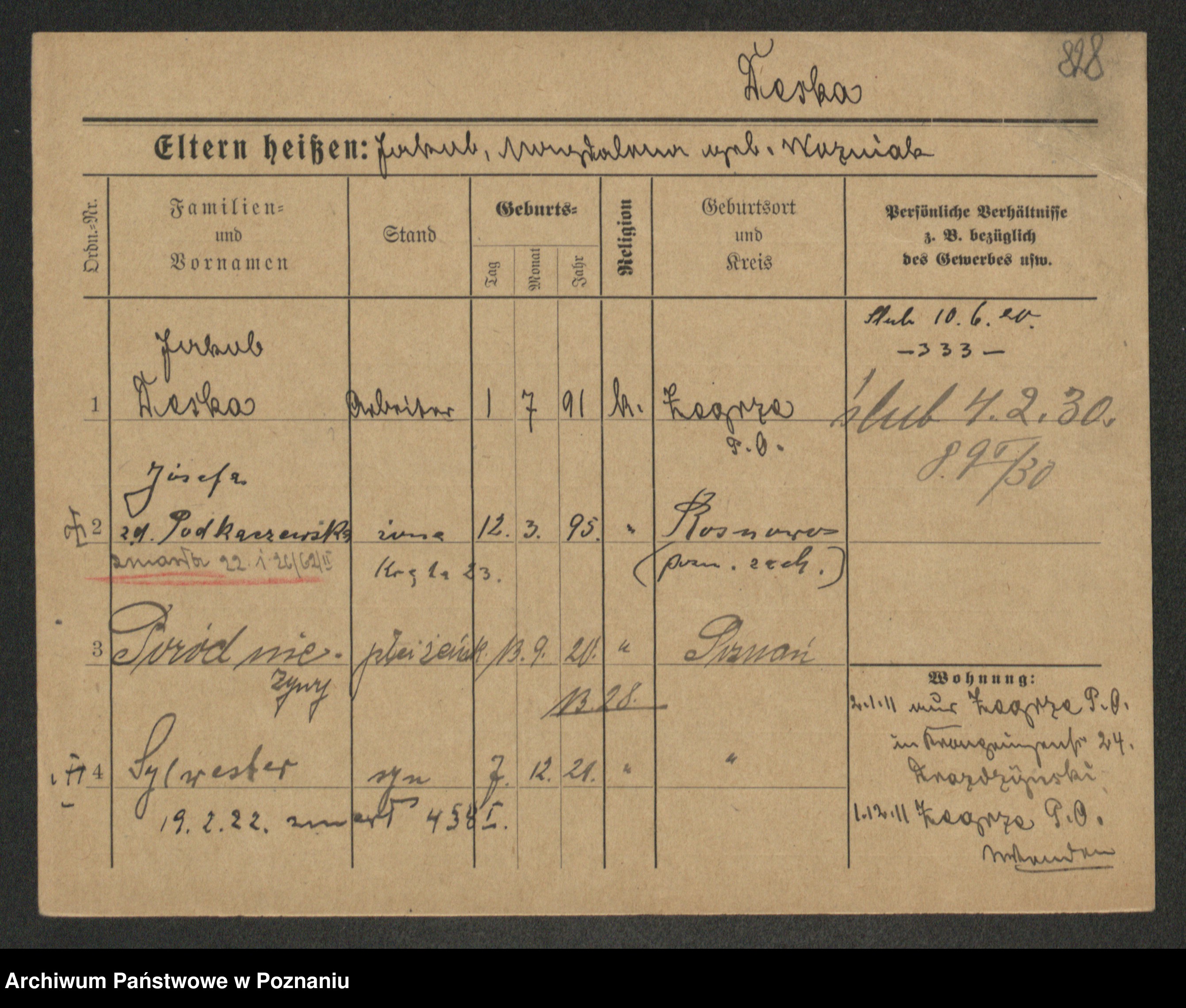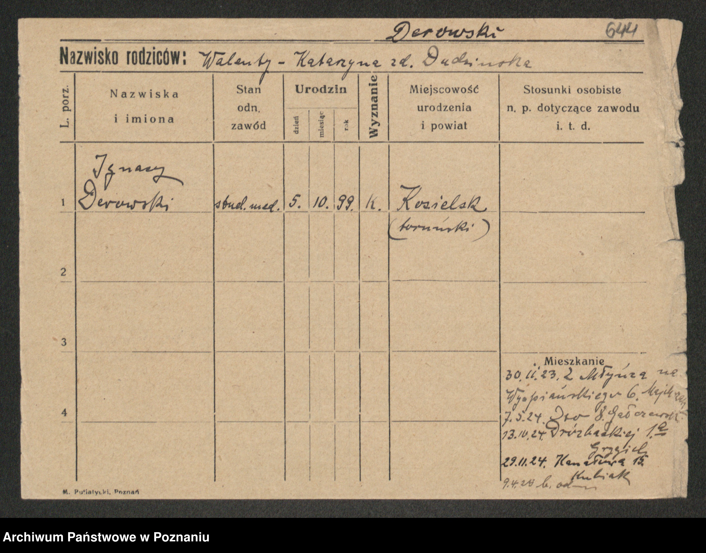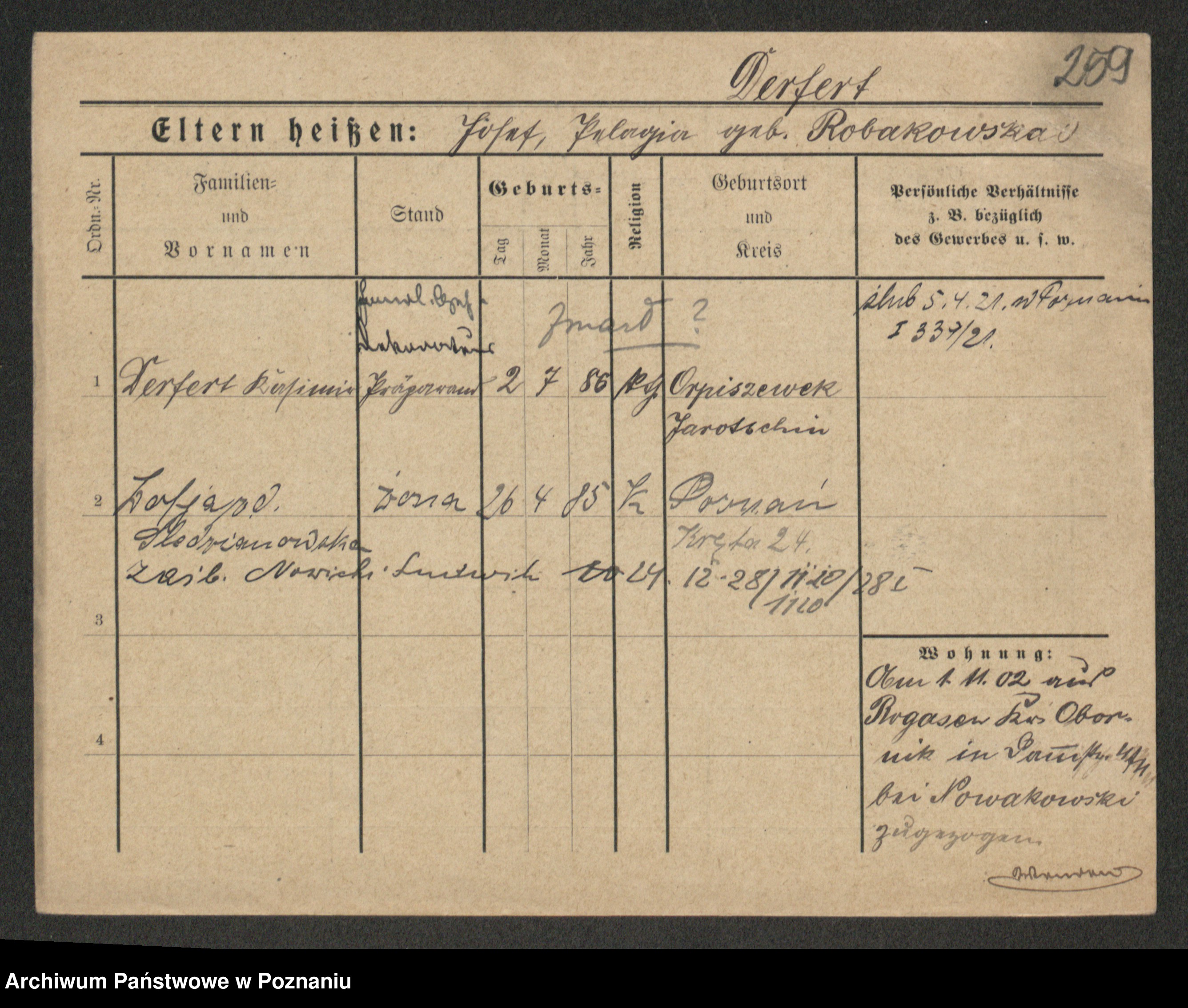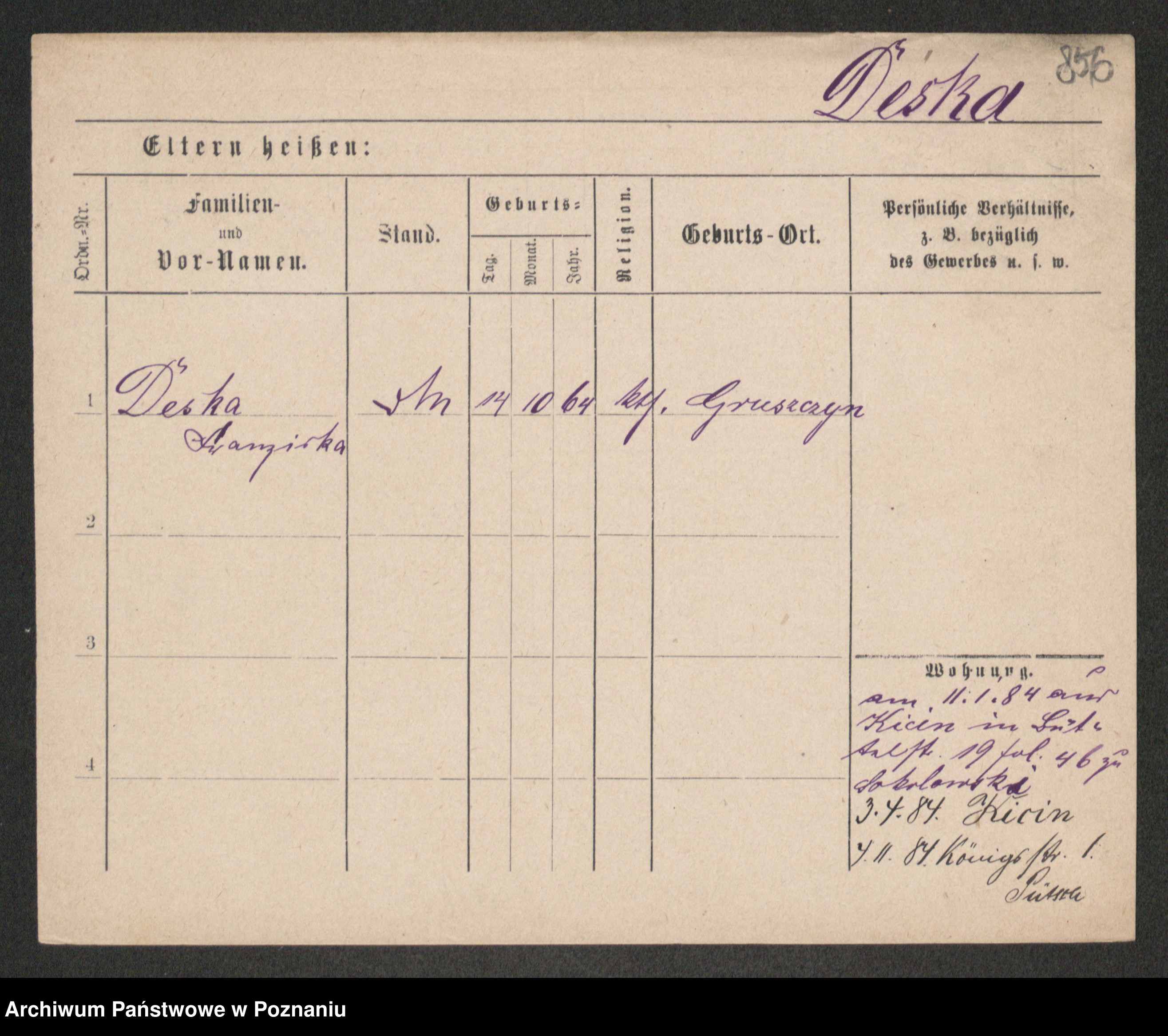 Podgląd karty osobowej dostępny jest po kliknięciu na nazwisko lub ikonkę karty. Można dokonywać powiększenia (ikony na górze) lub przechodzić między kolejnymi skanami (strzałki po bokach).