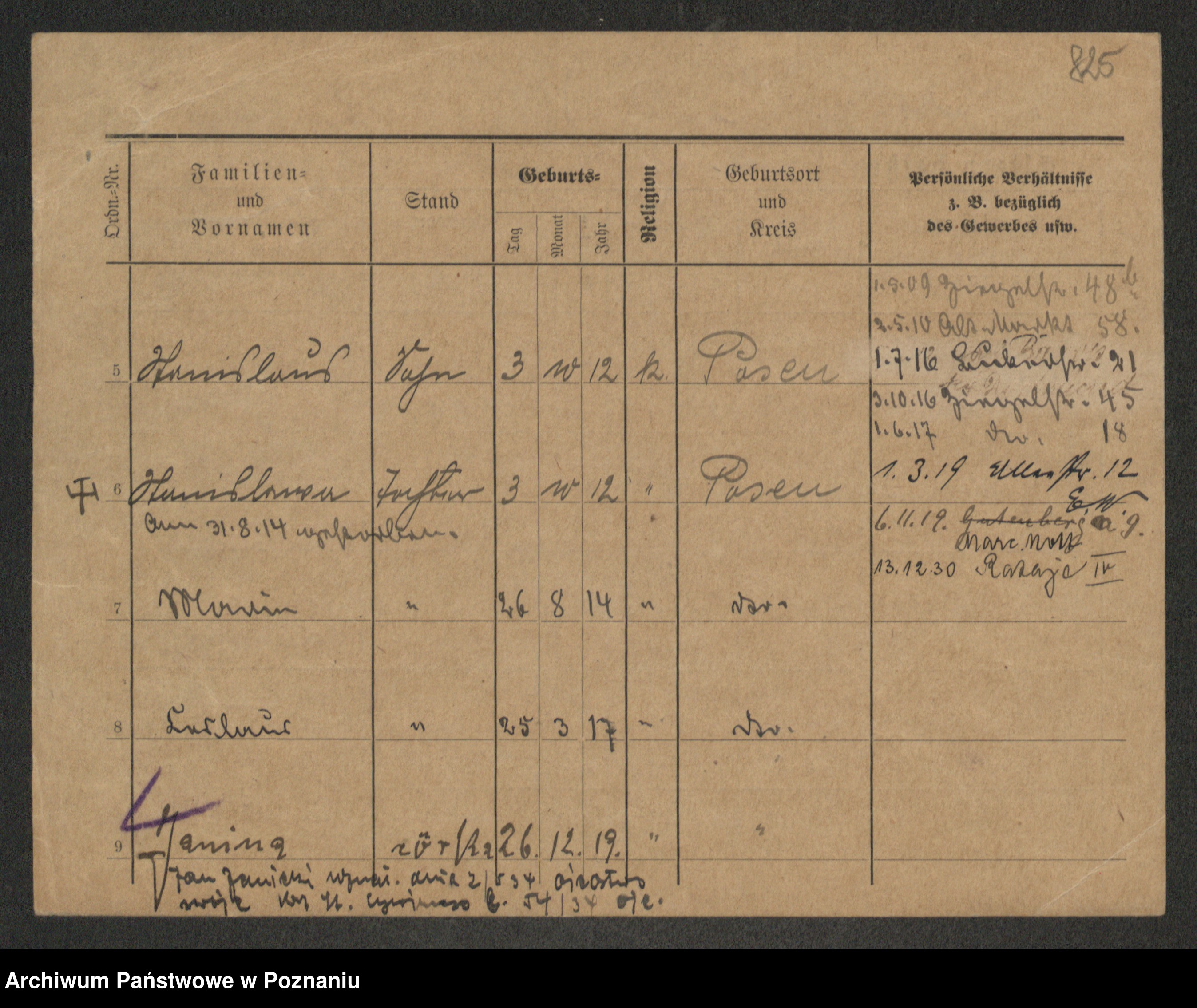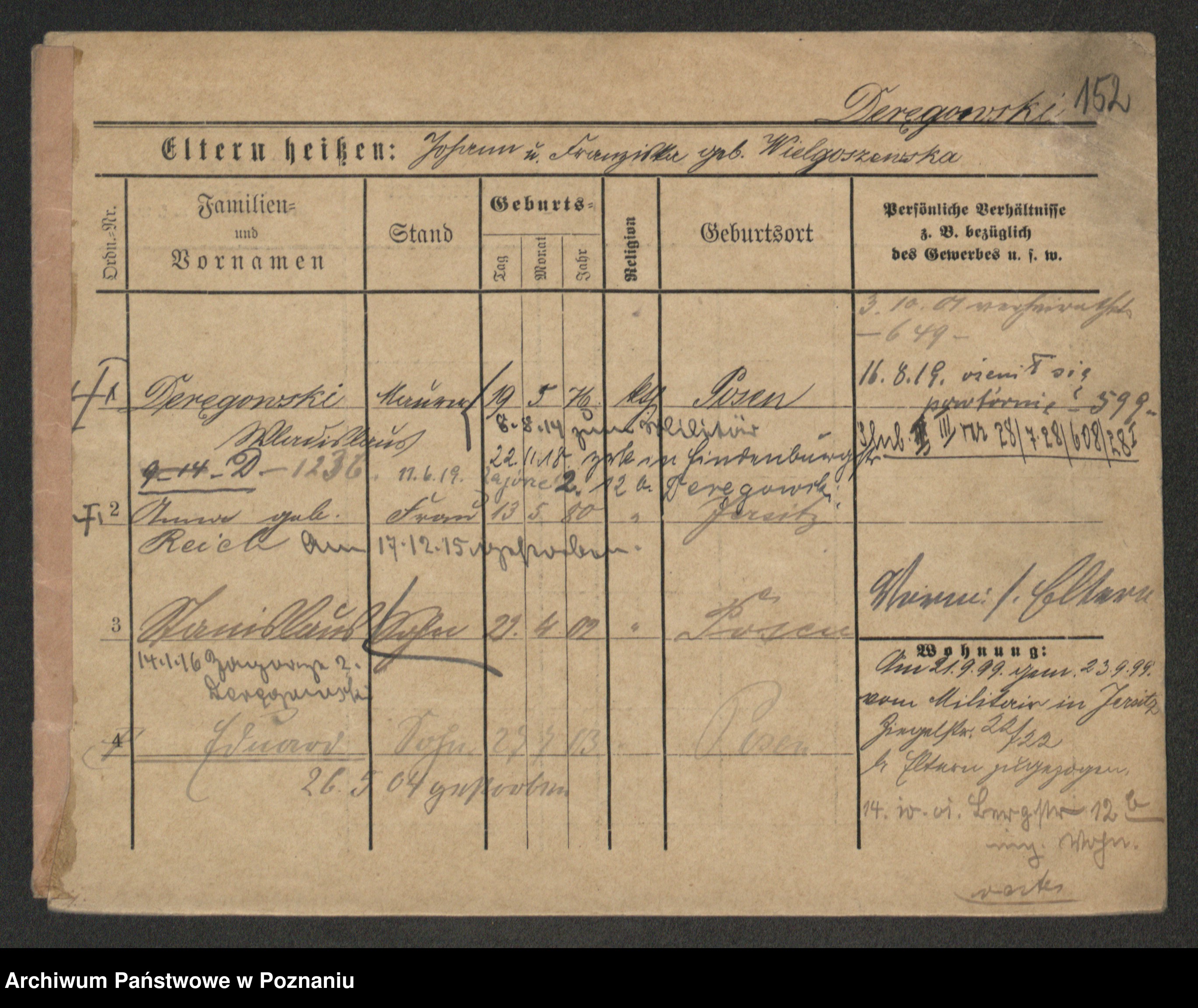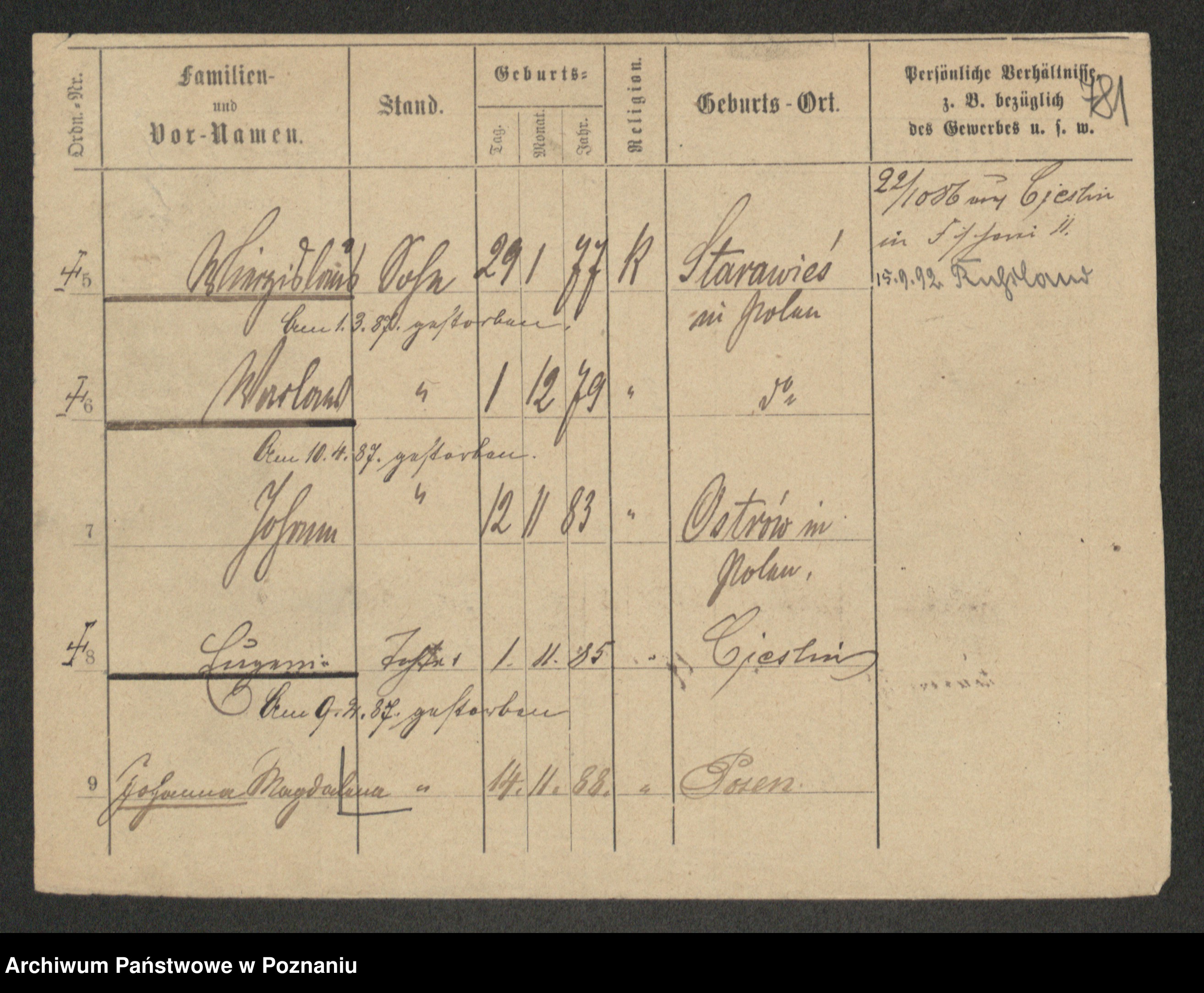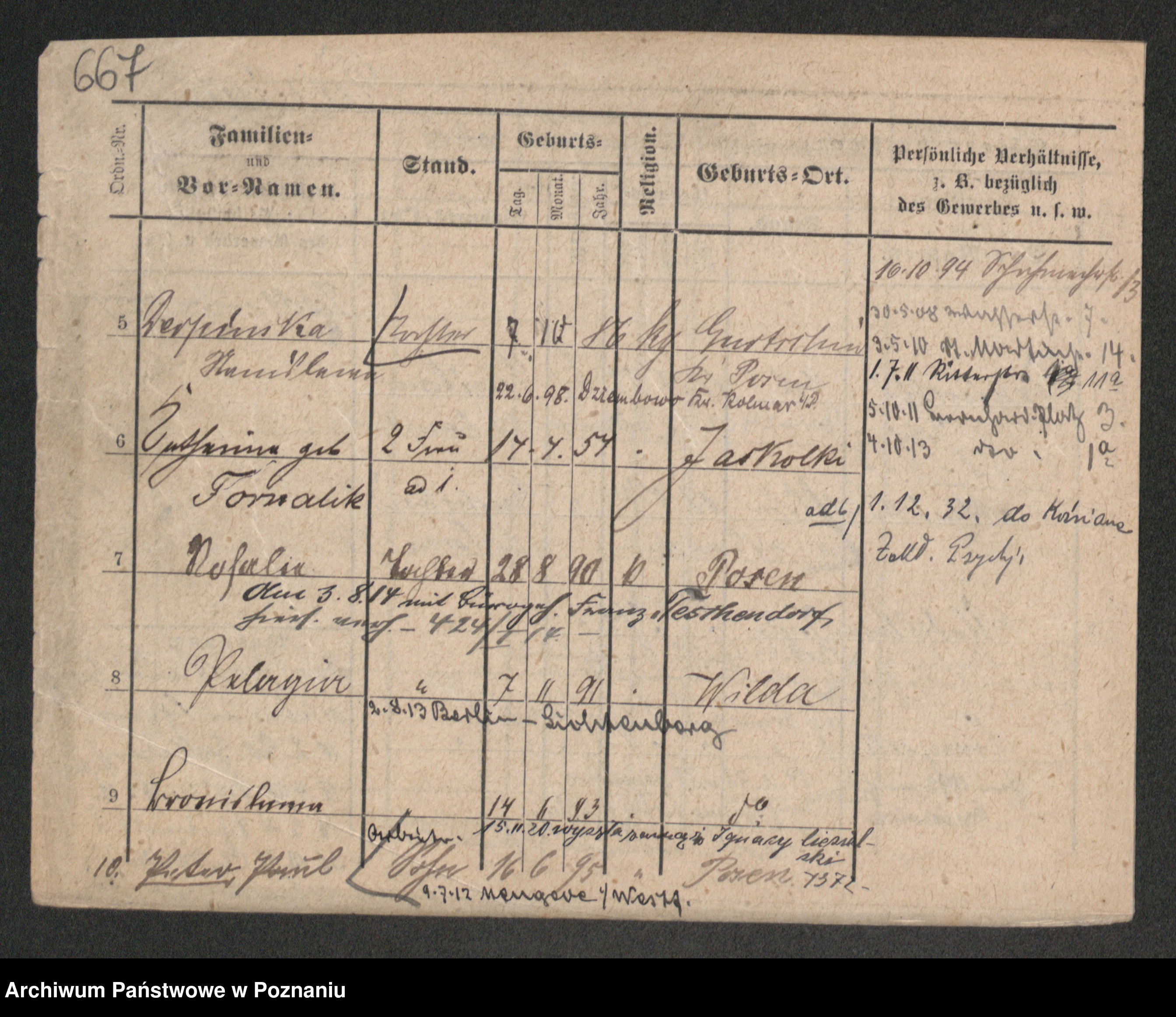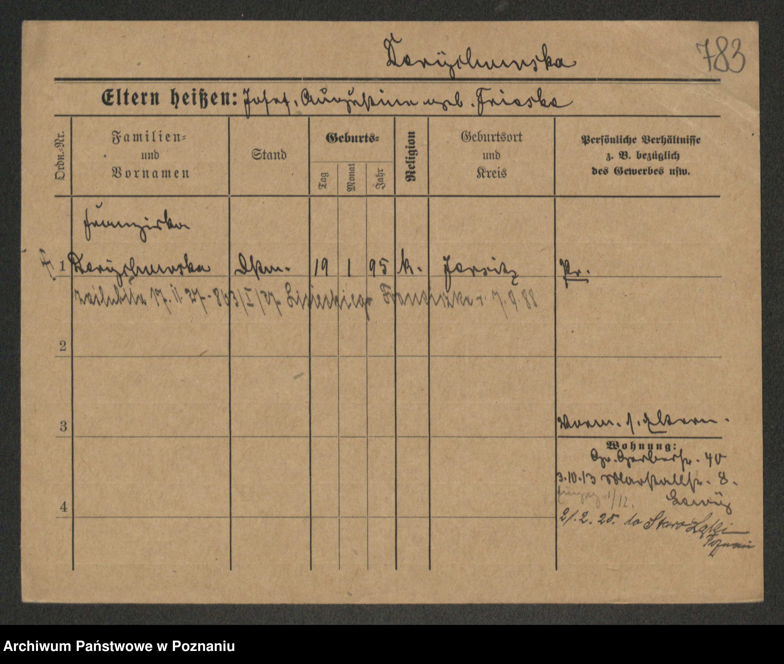Podgląd karty osobowej dostępny jest po kliknięciu na nazwisko lub ikonkę karty. Można dokonywać powiększenia (ikony na górze) lub przechodzić między kolejnymi skanami (strzałki po bokach).