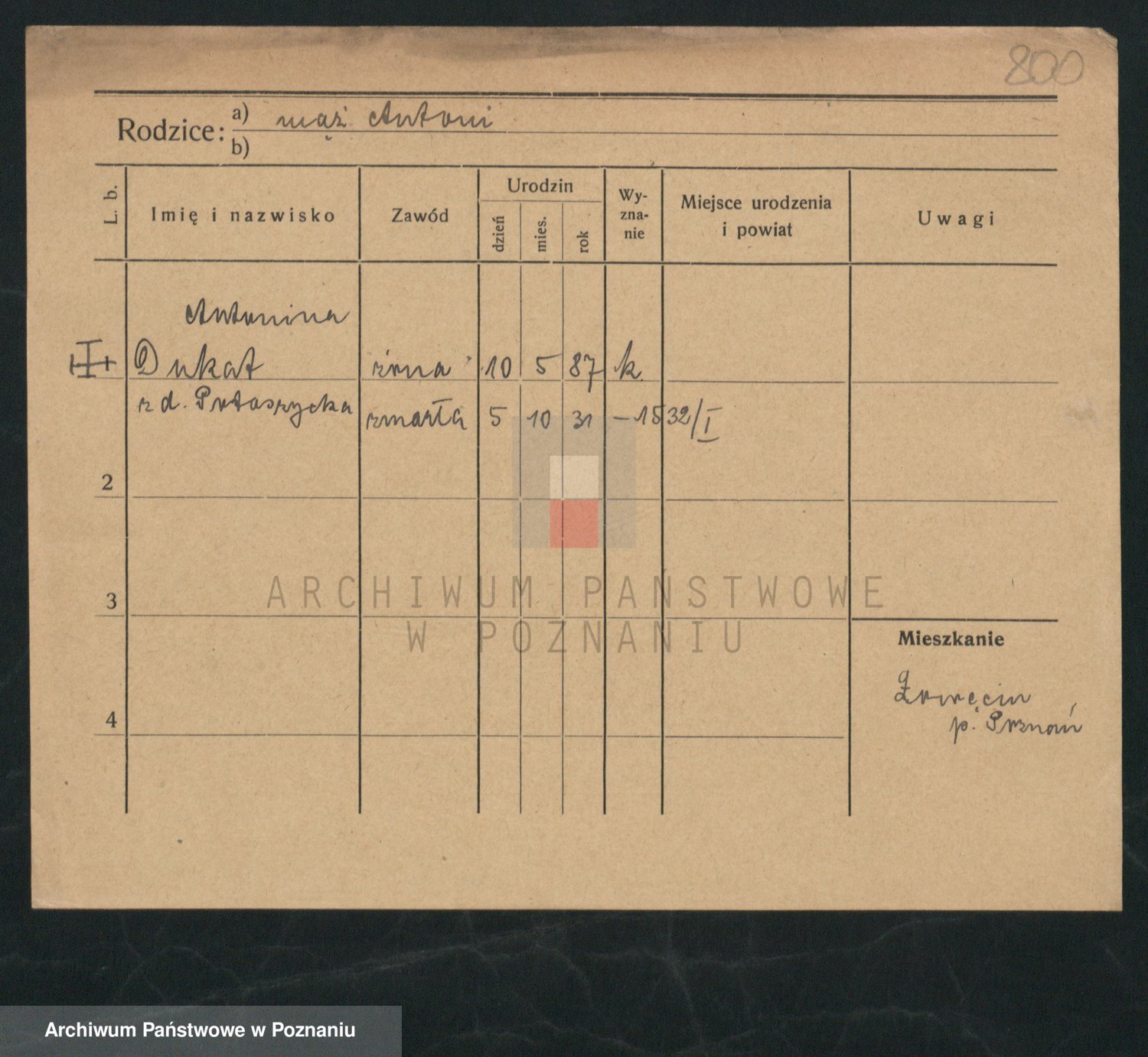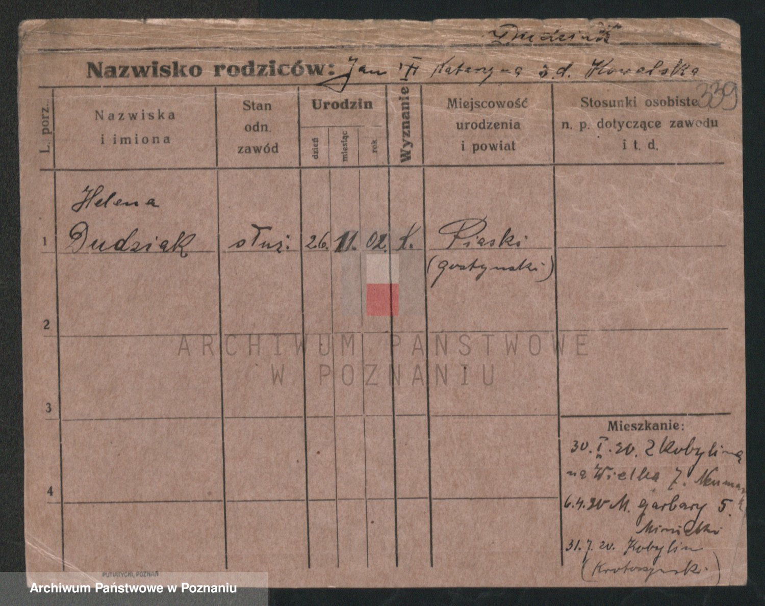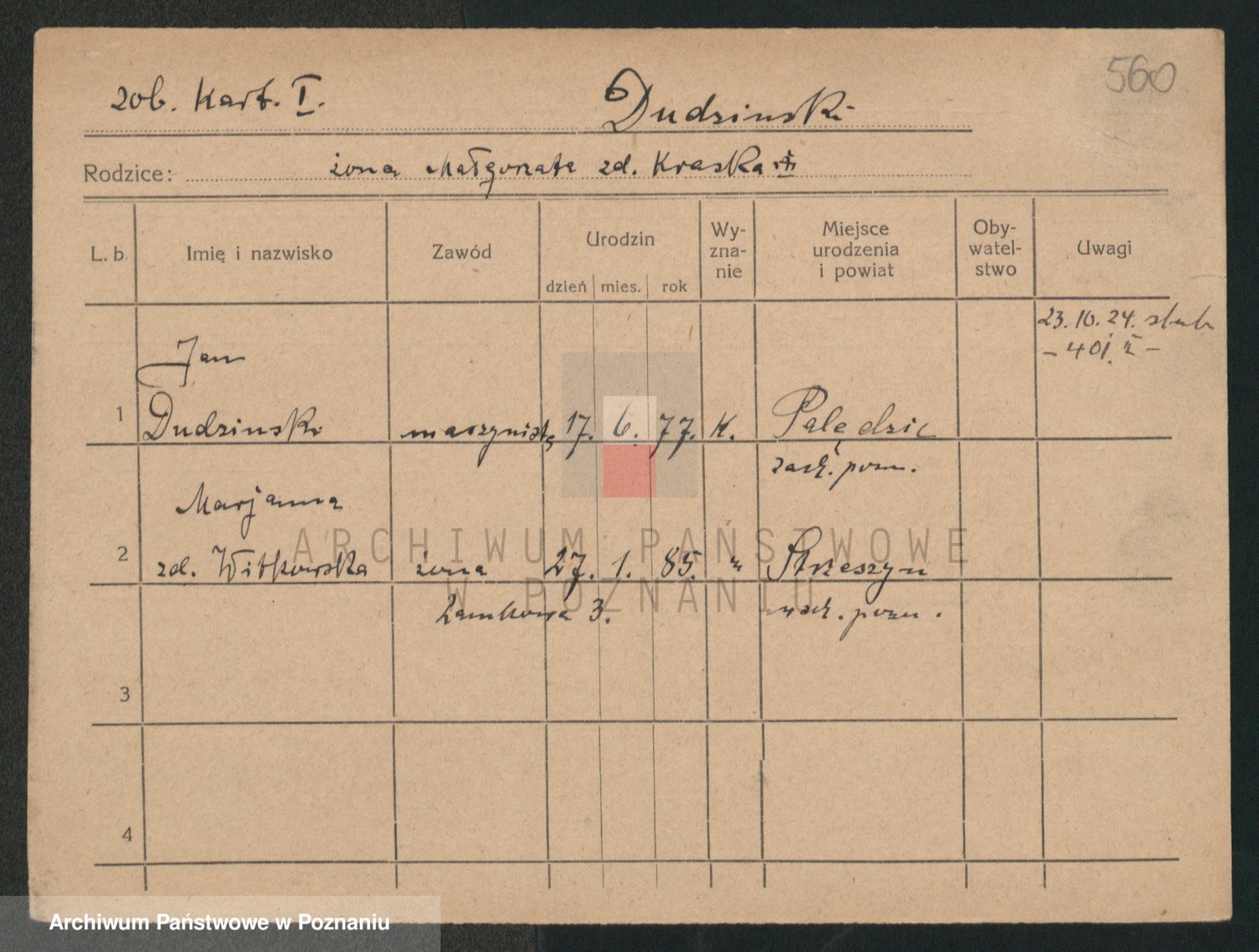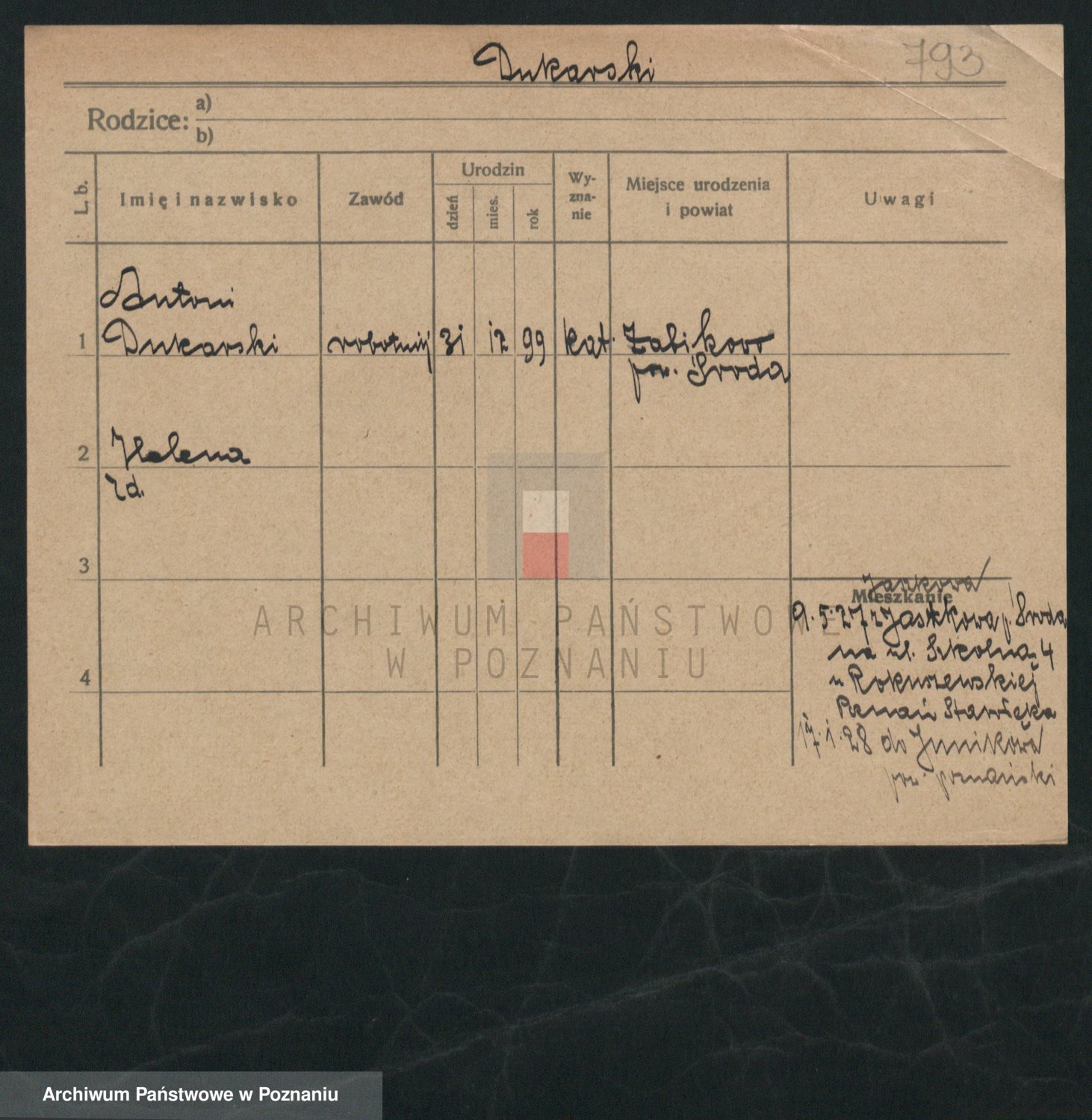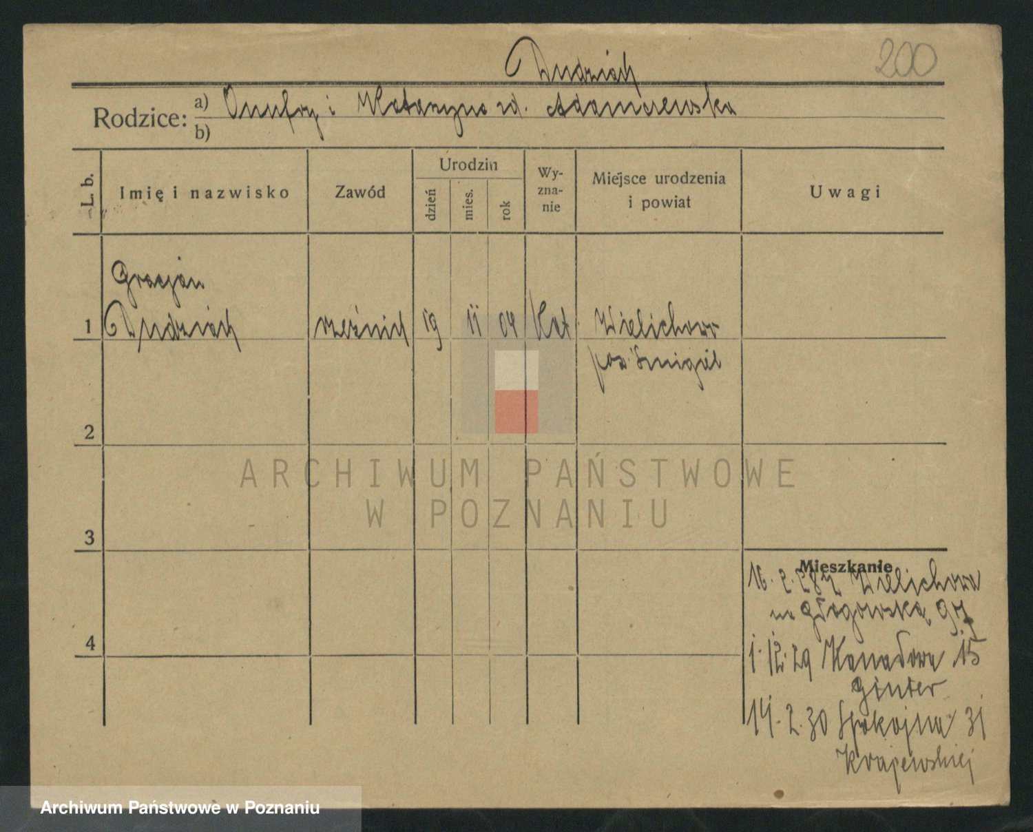 Podgląd karty osobowej dostępny jest po kliknięciu na nazwisko lub ikonkę karty. Można dokonywać powiększenia (ikony na górze) lub przechodzić między kolejnymi skanami (strzałki po bokach).