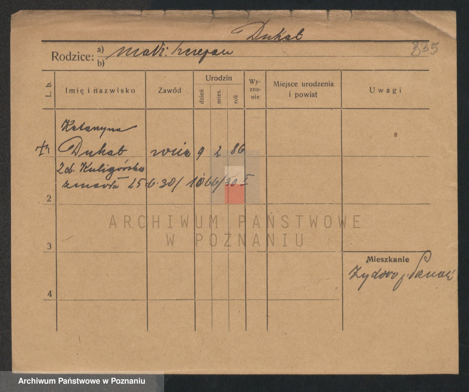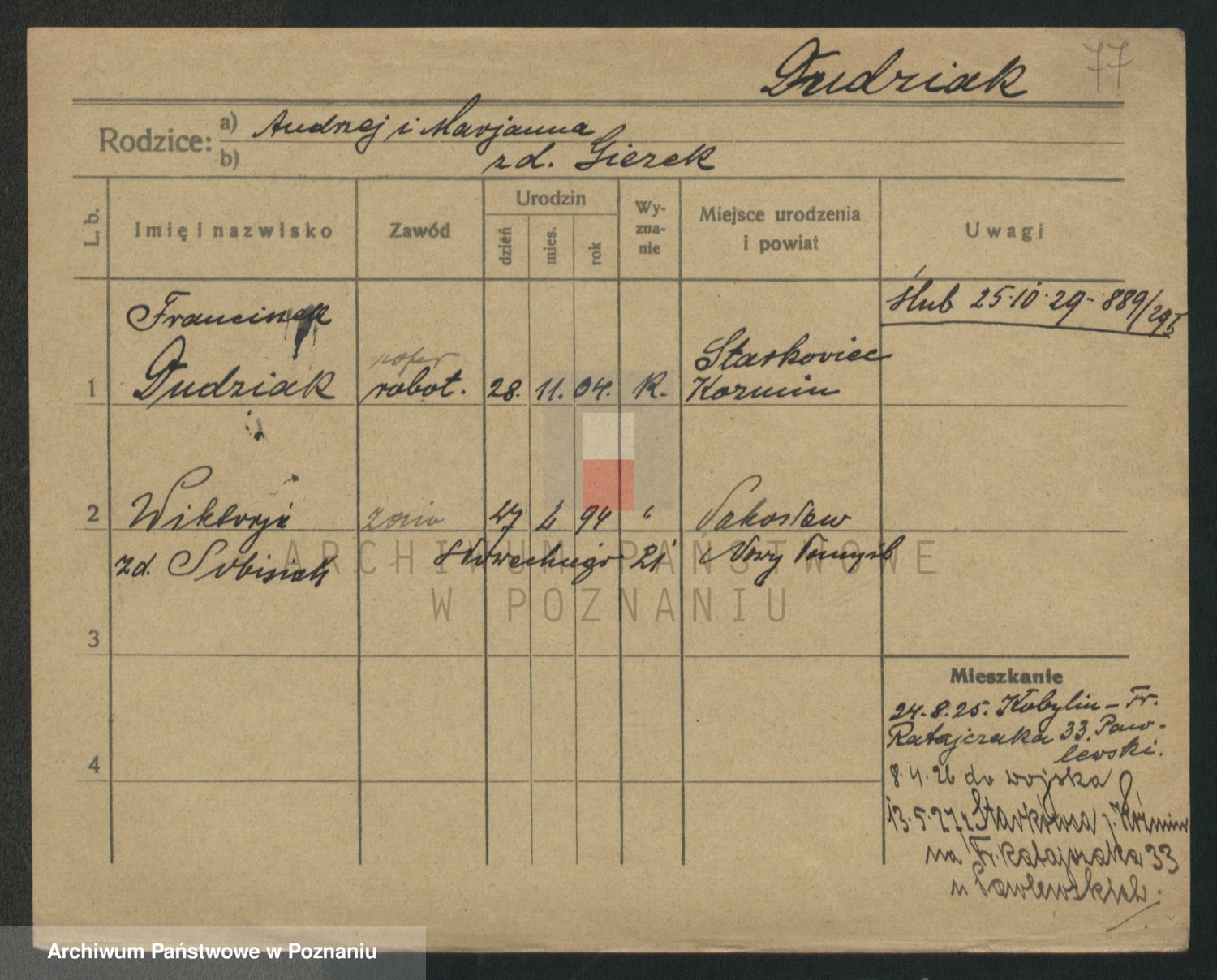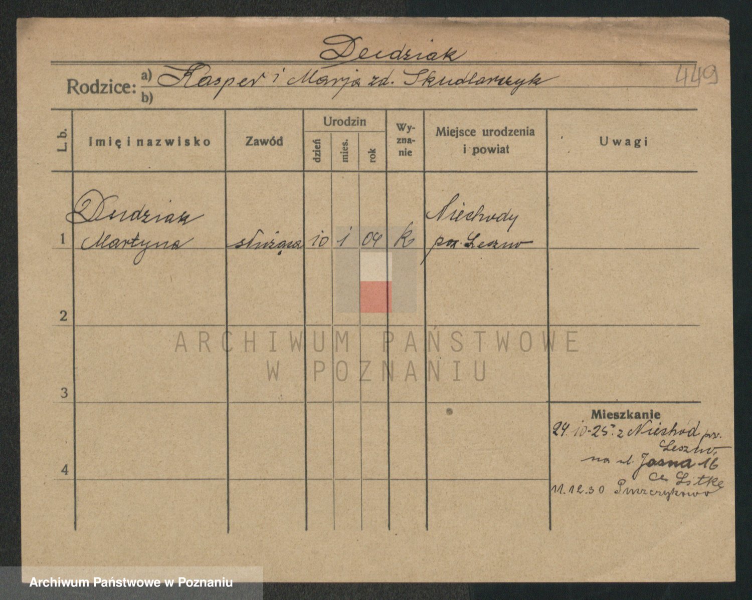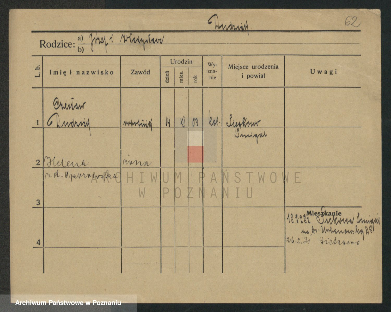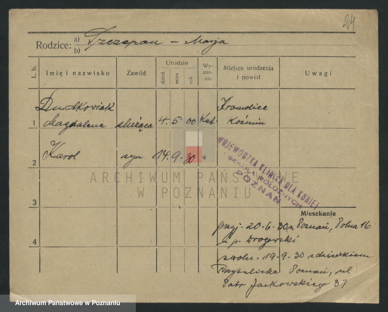 Podgląd karty osobowej dostępny jest po kliknięciu na nazwisko lub ikonkę karty. Można dokonywać powiększenia (ikony na górze) lub przechodzić między kolejnymi skanami (strzałki po bokach).