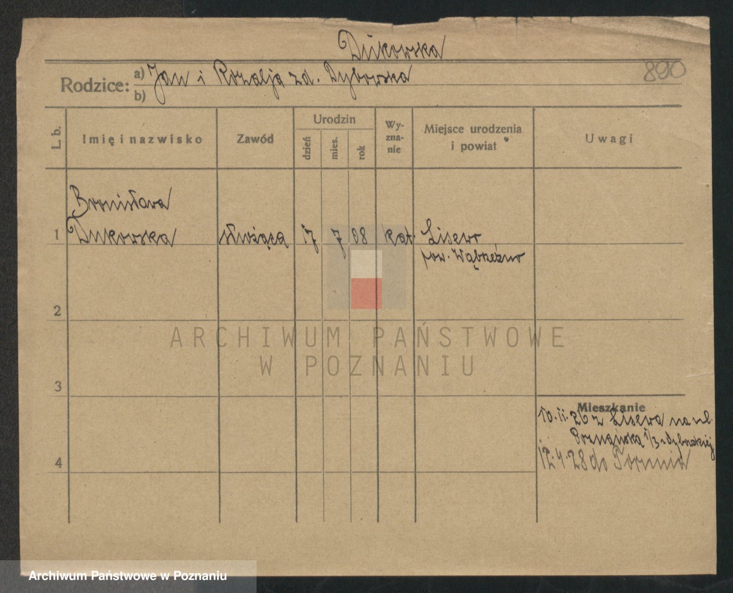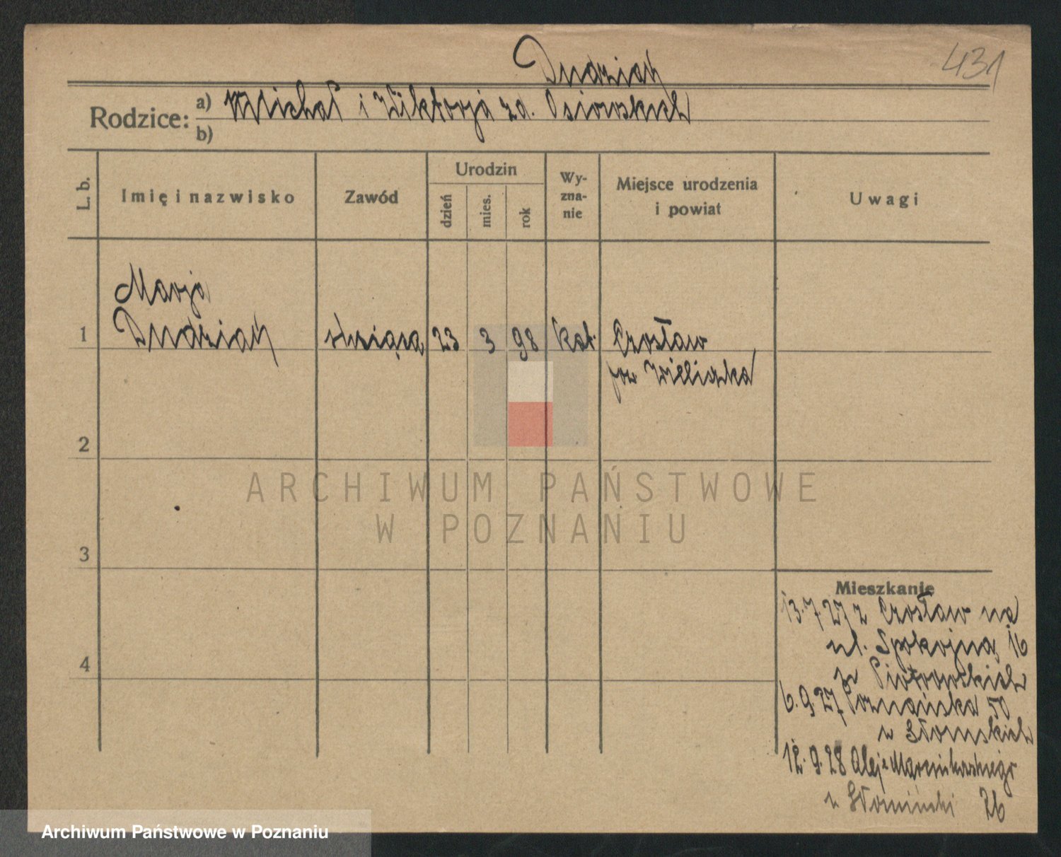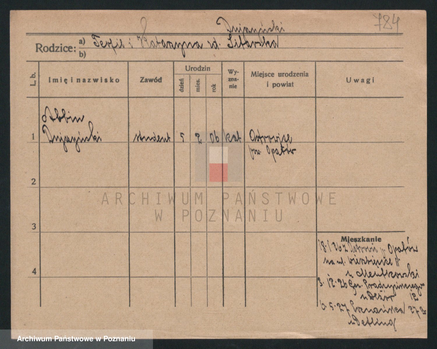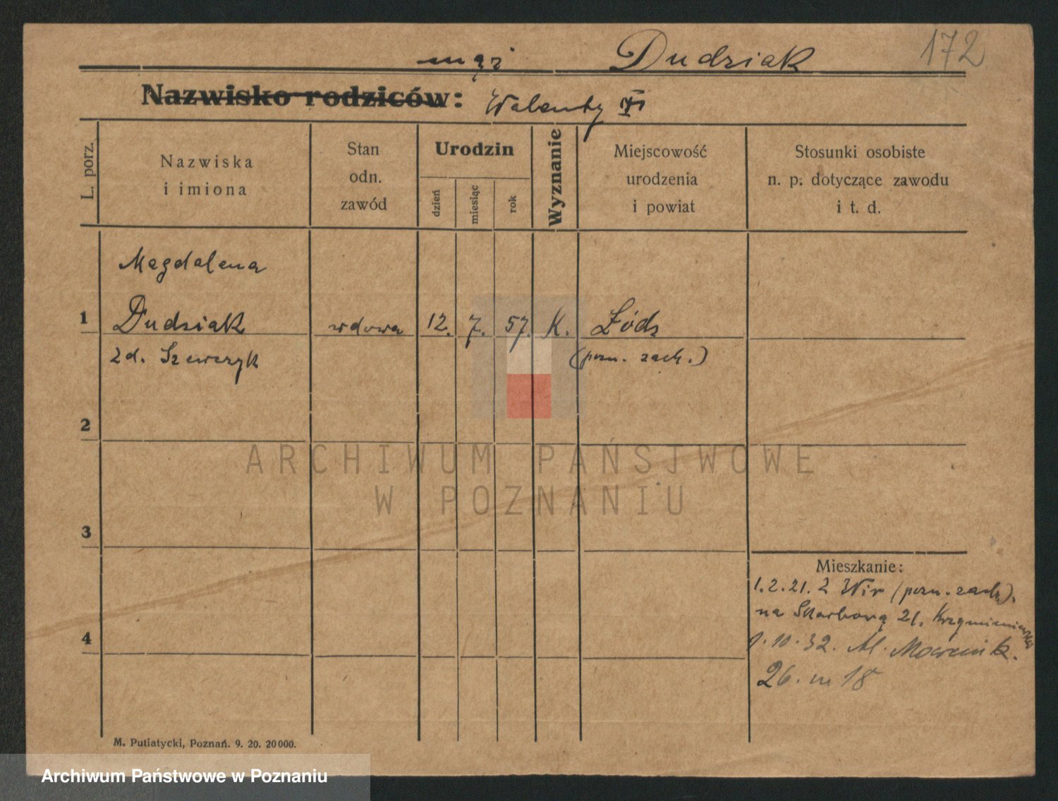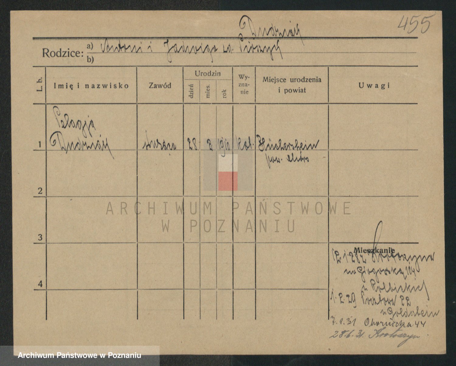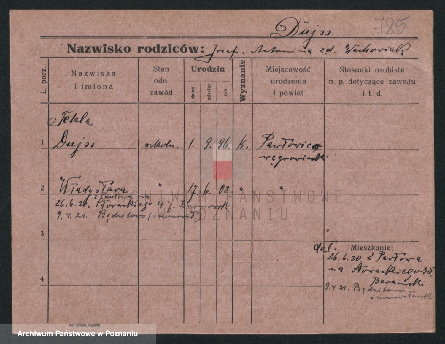 Podgląd karty osobowej dostępny jest po kliknięciu na nazwisko lub ikonkę karty. Można dokonywać powiększenia (ikony na górze) lub przechodzić między kolejnymi skanami (strzałki po bokach).