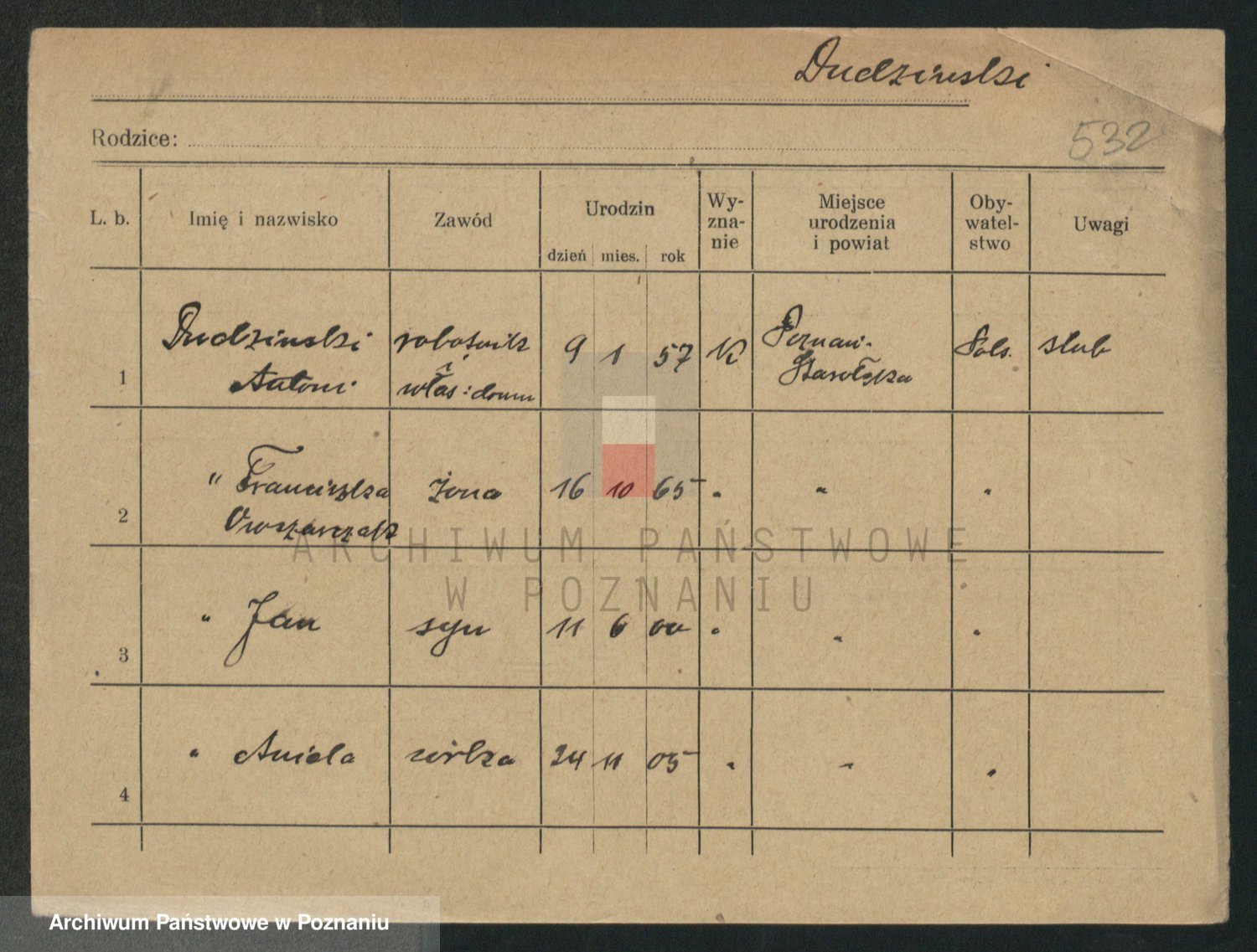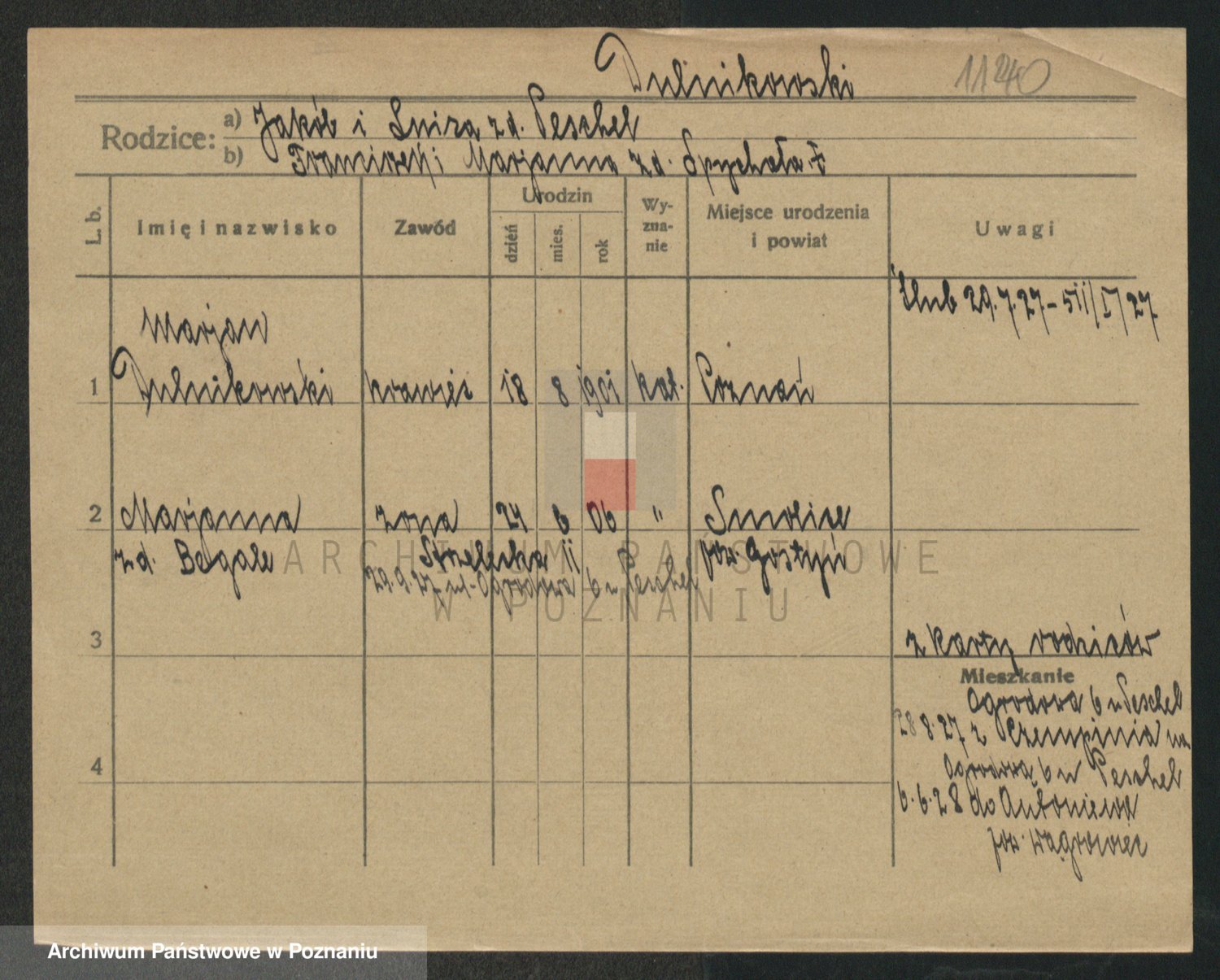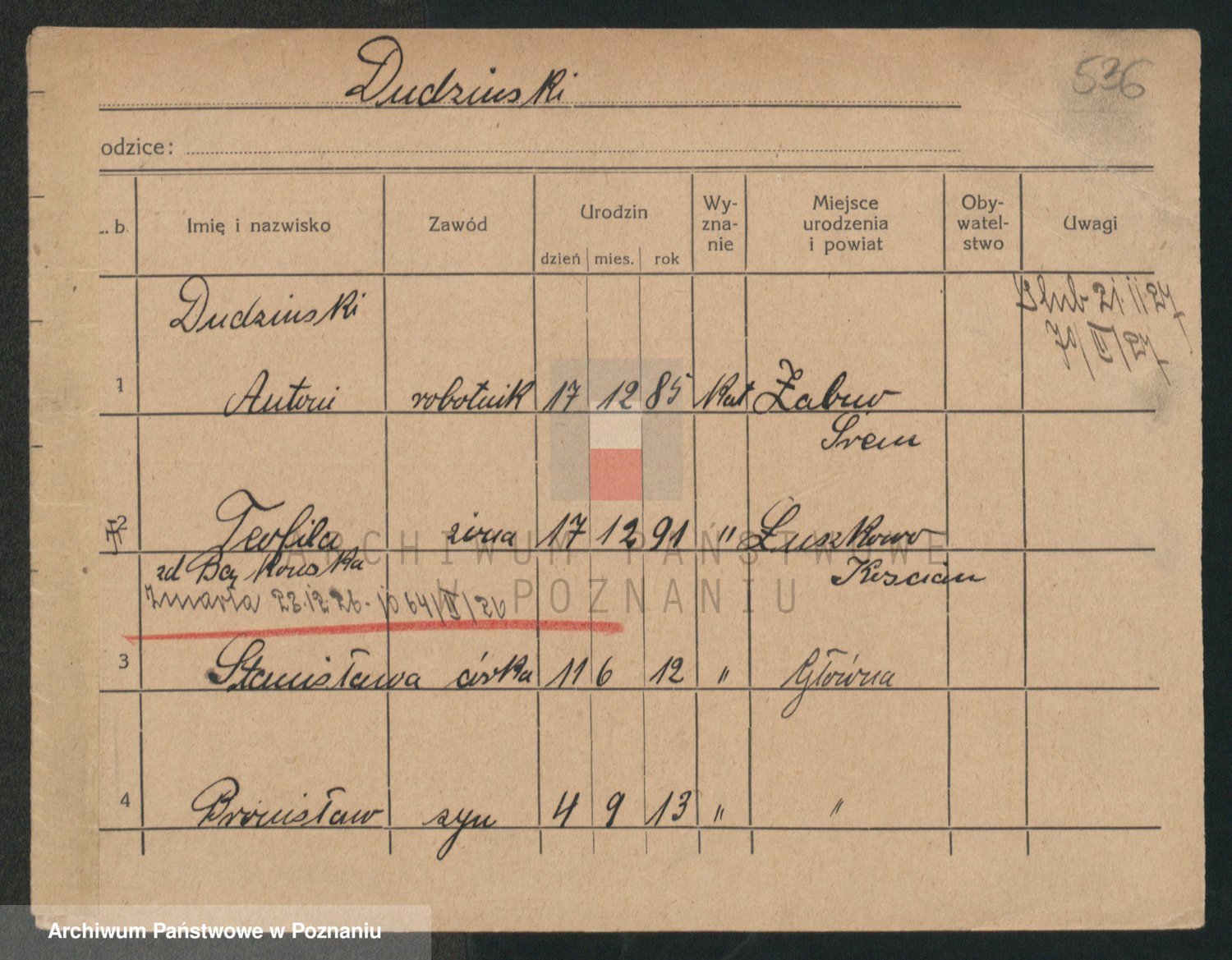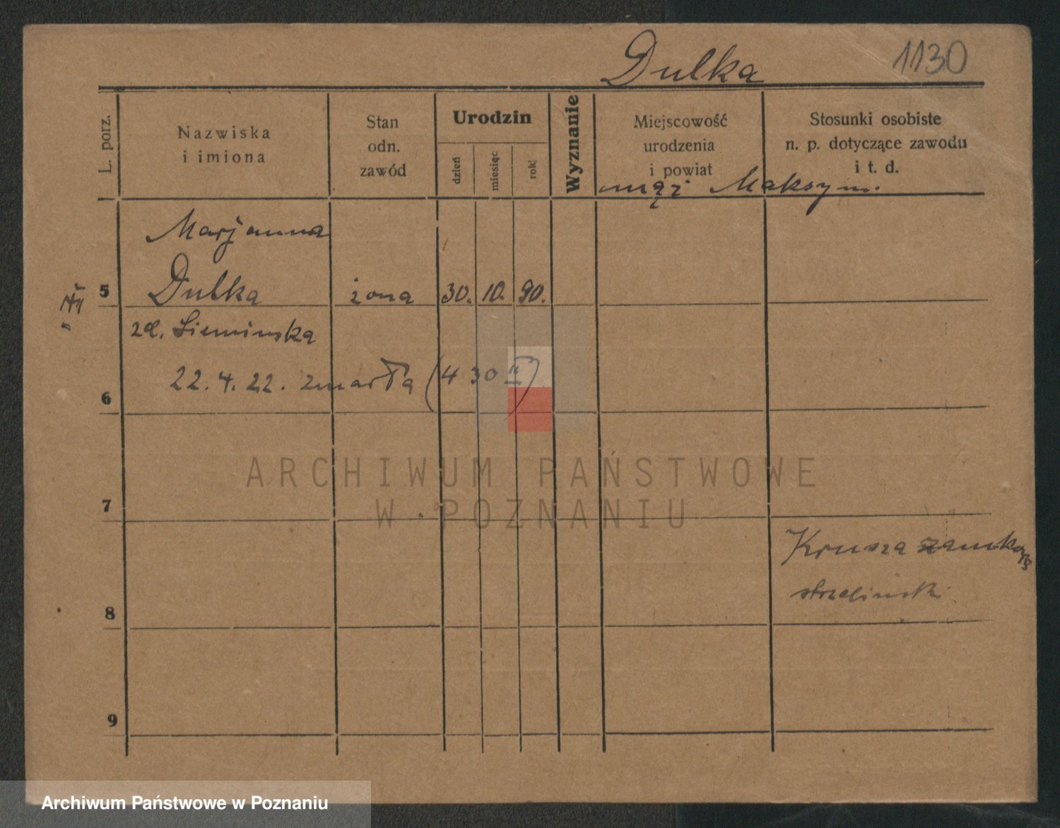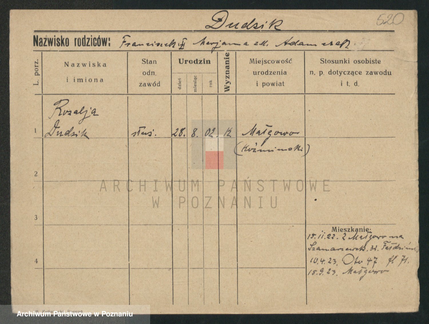Podgląd karty osobowej dostępny jest po kliknięciu na nazwisko lub ikonkę karty. Można dokonywać powiększenia (ikony na górze) lub przechodzić między kolejnymi skanami (strzałki po bokach).