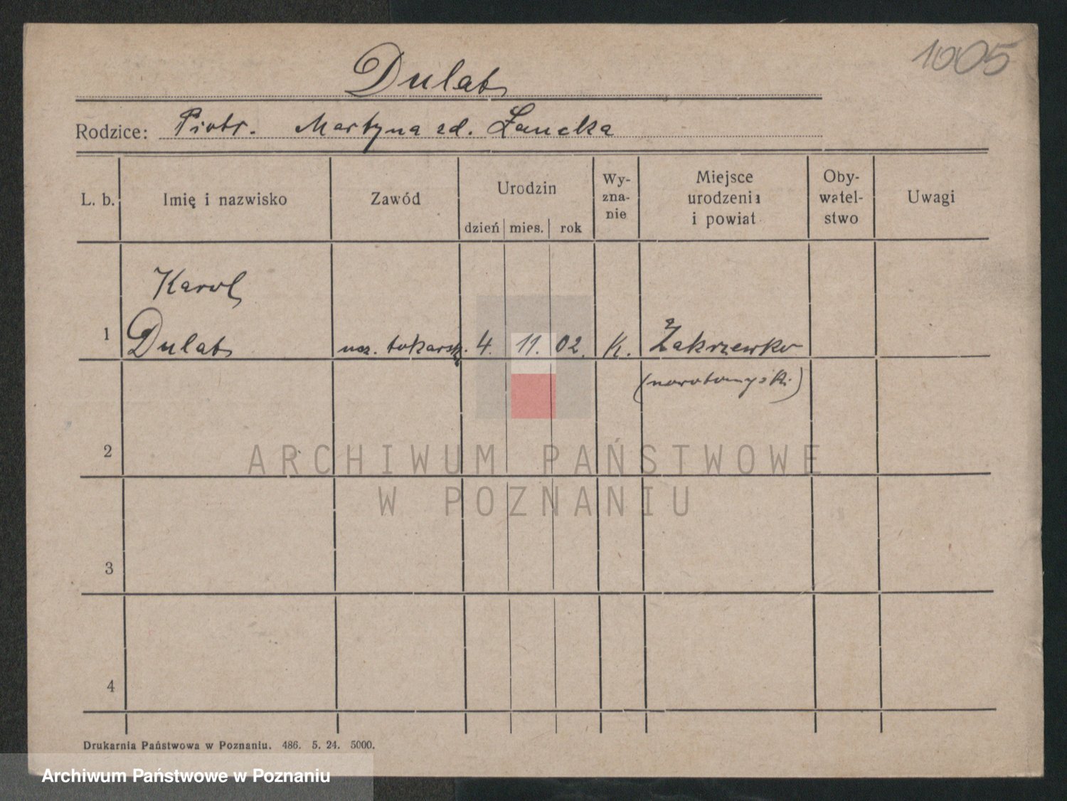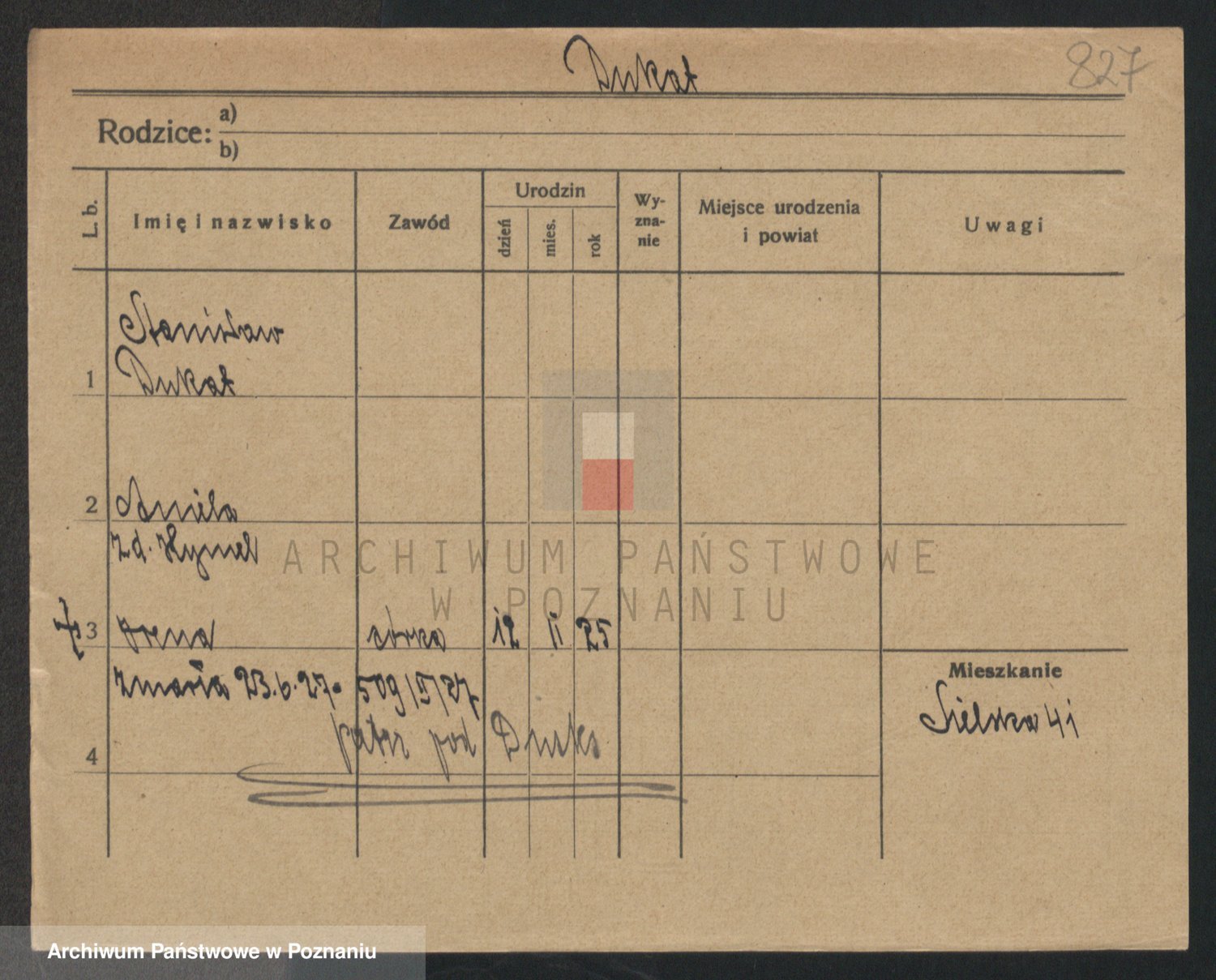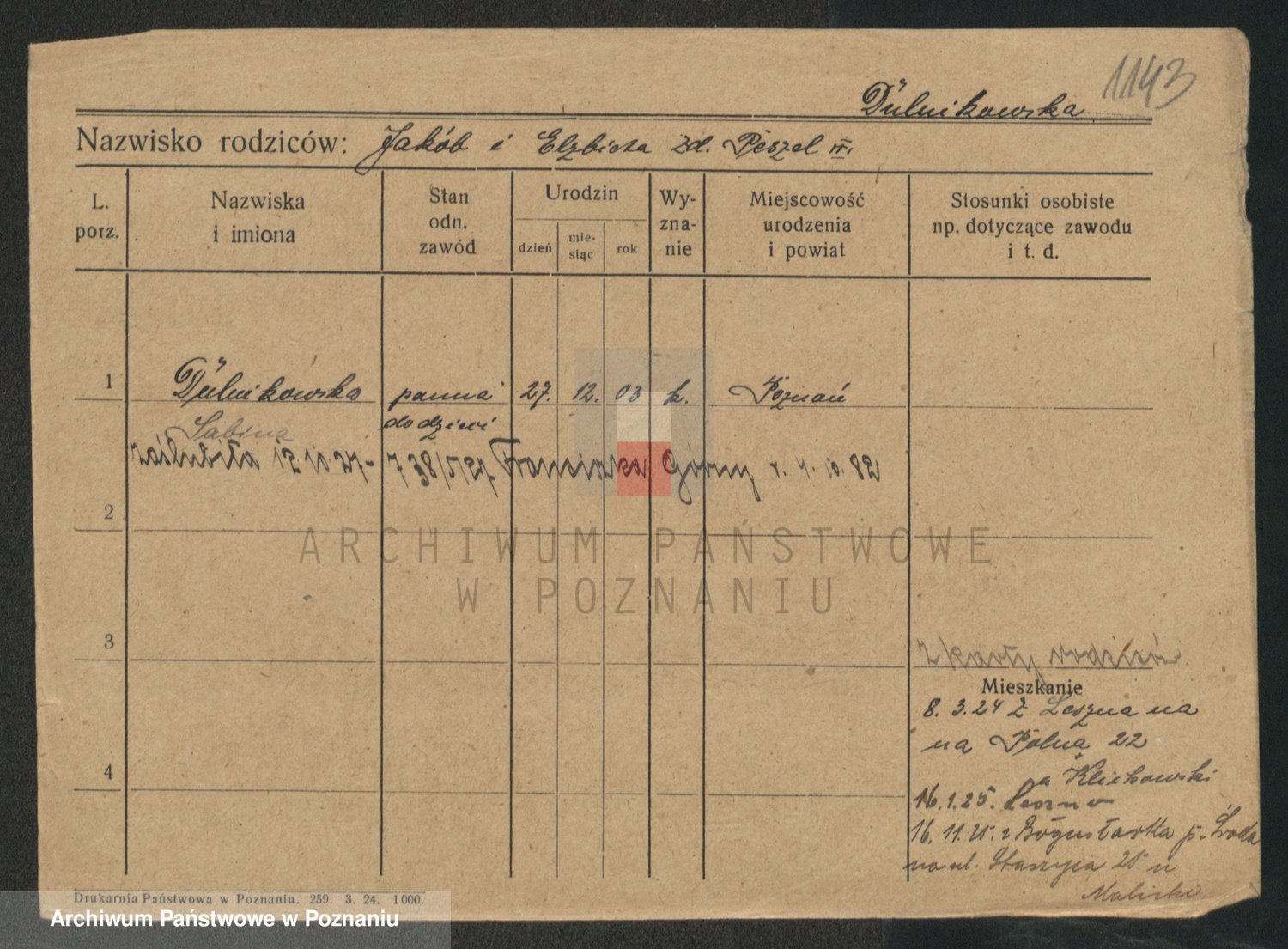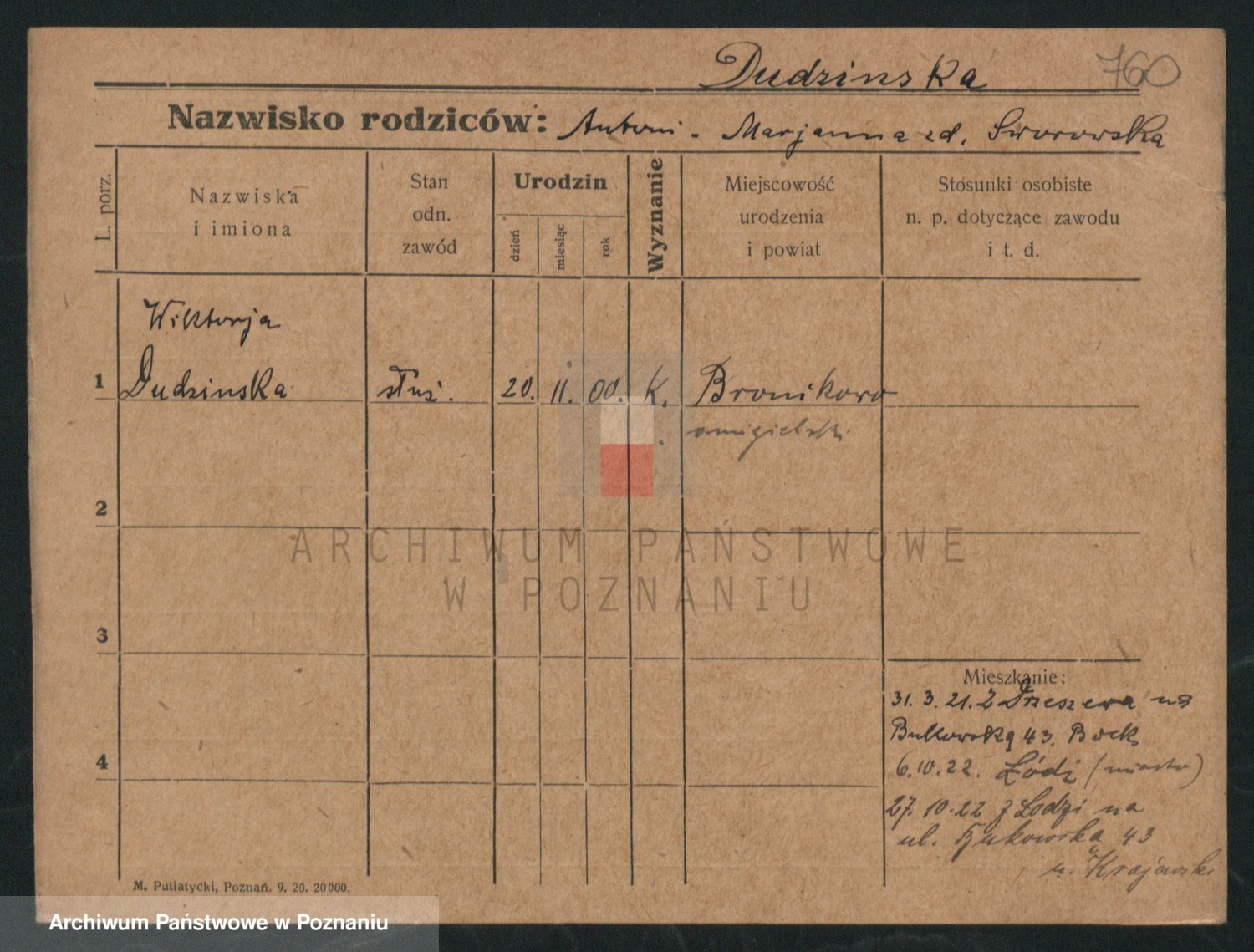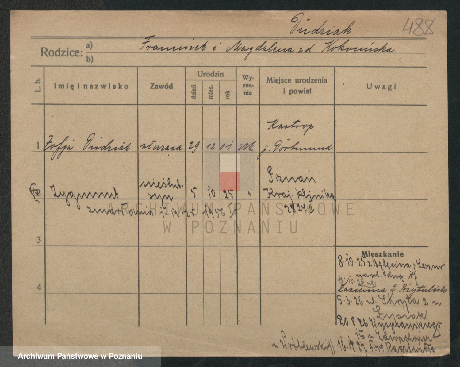 Podgląd karty osobowej dostępny jest po kliknięciu na nazwisko lub ikonkę karty. Można dokonywać powiększenia (ikony na górze) lub przechodzić między kolejnymi skanami (strzałki po bokach).