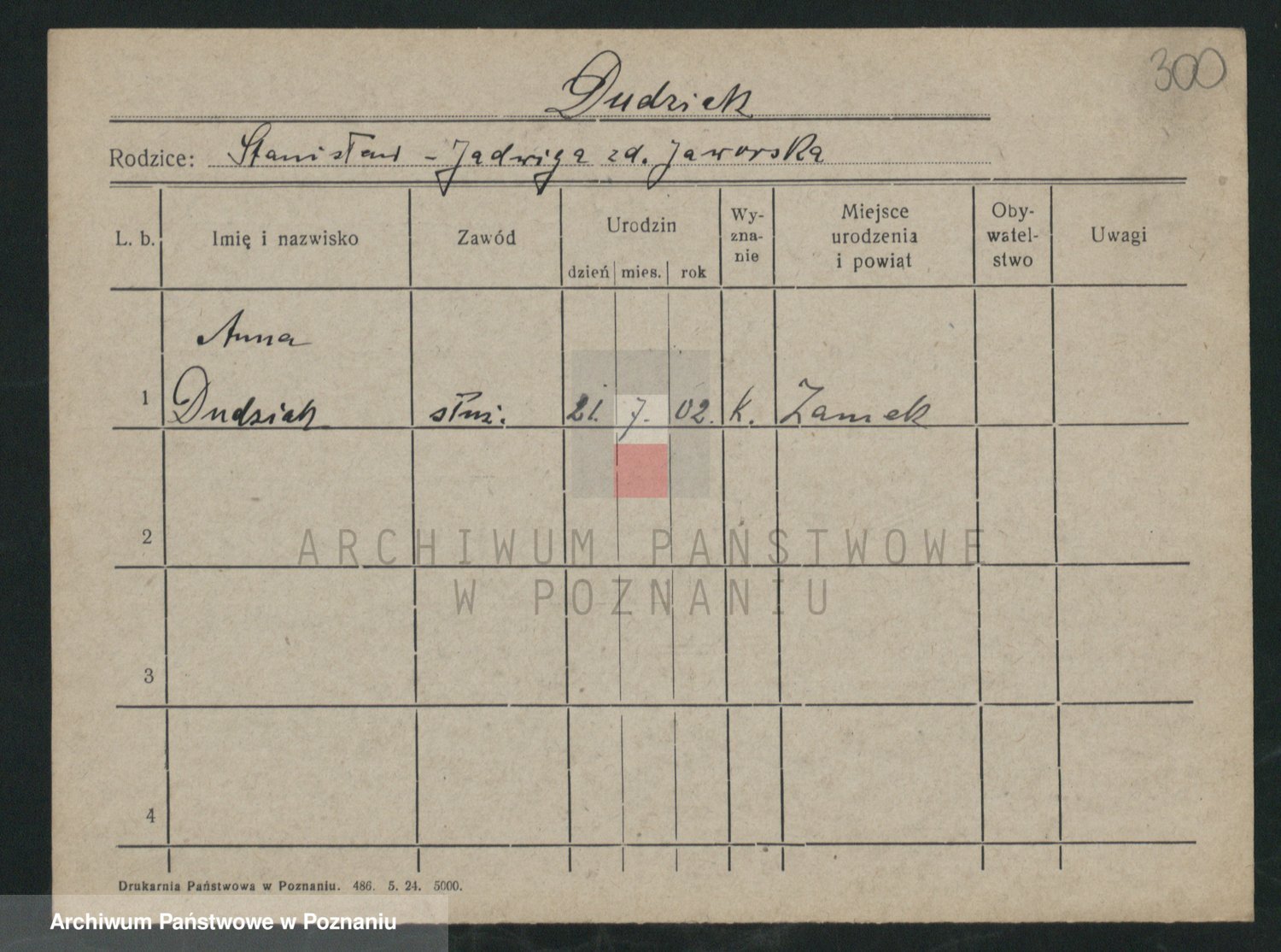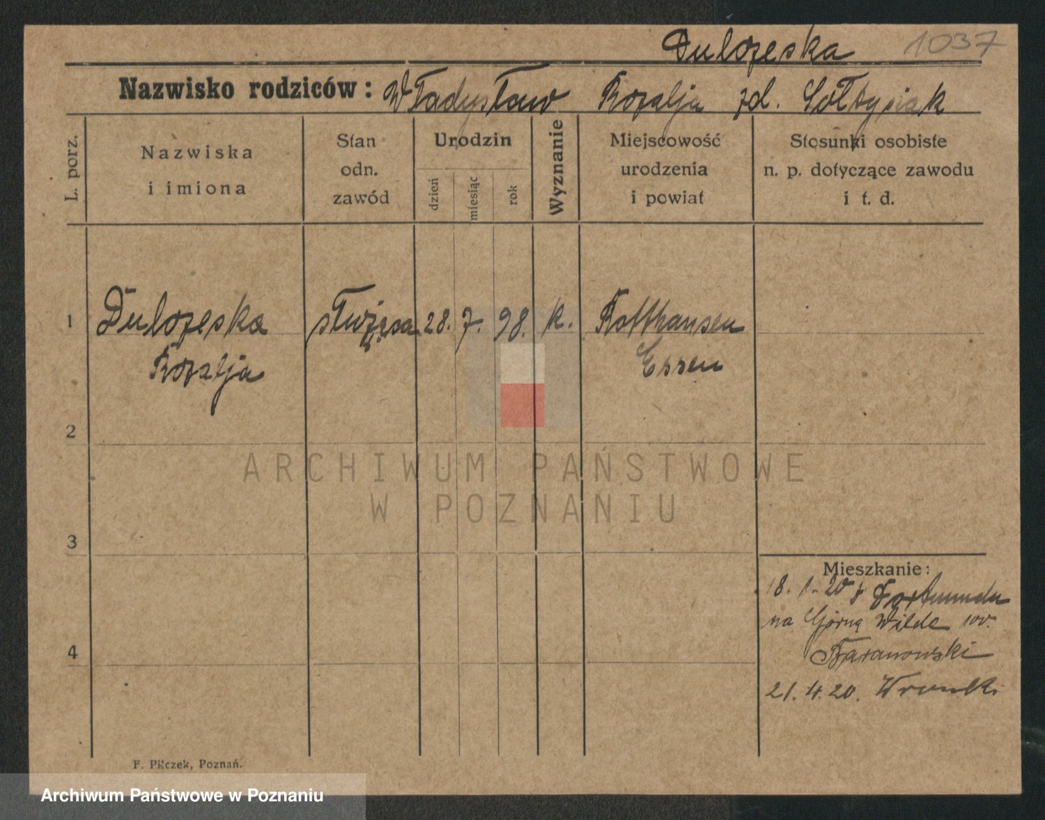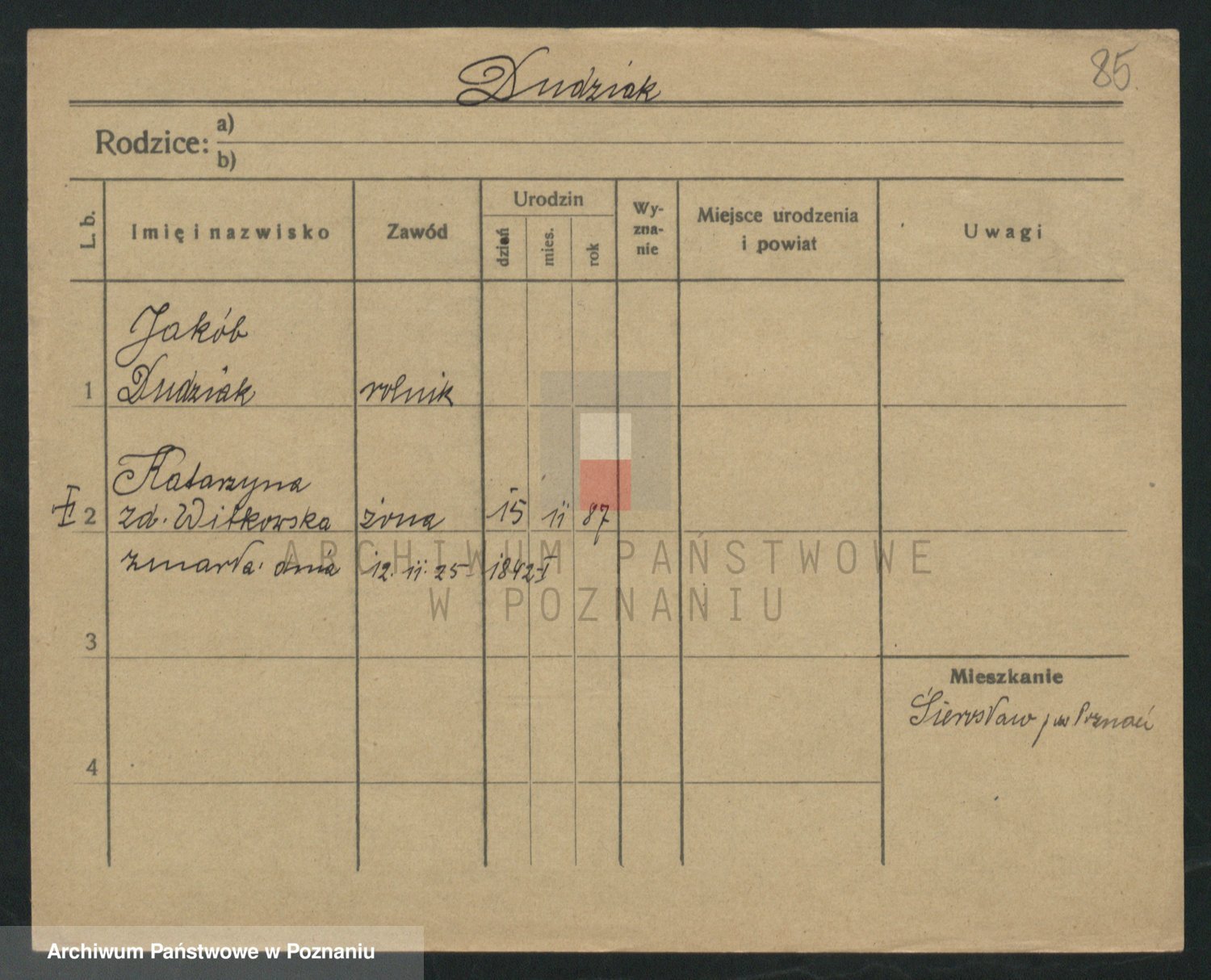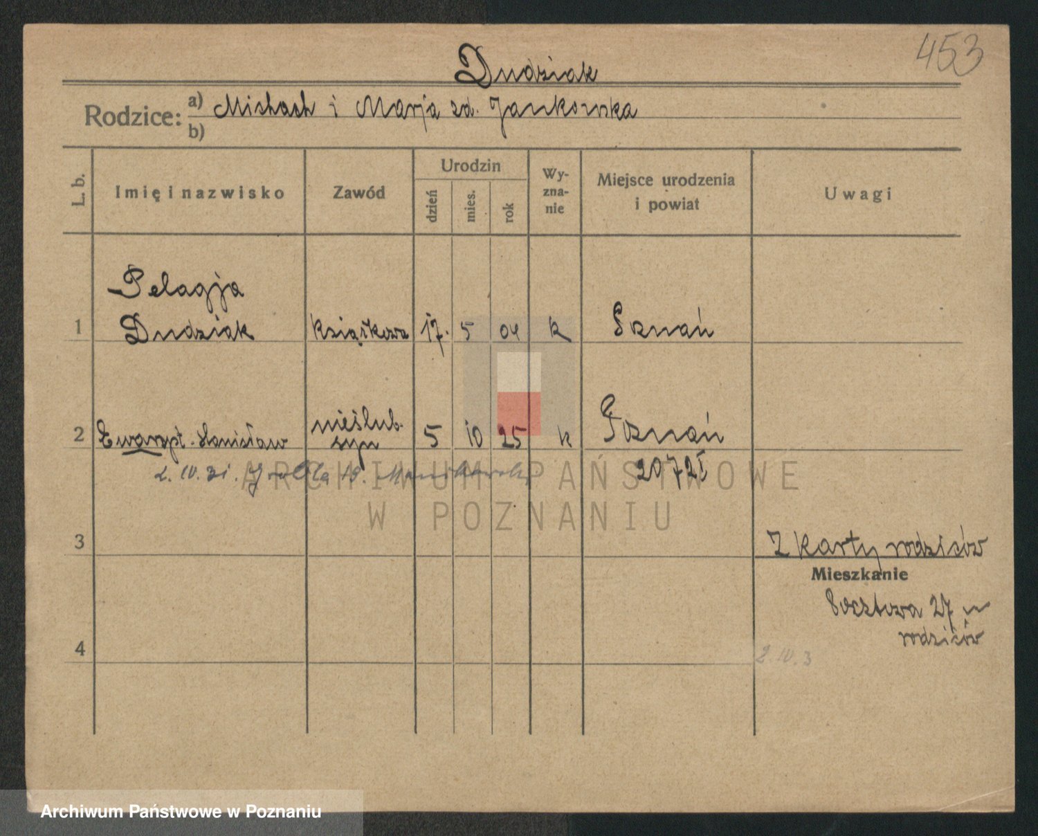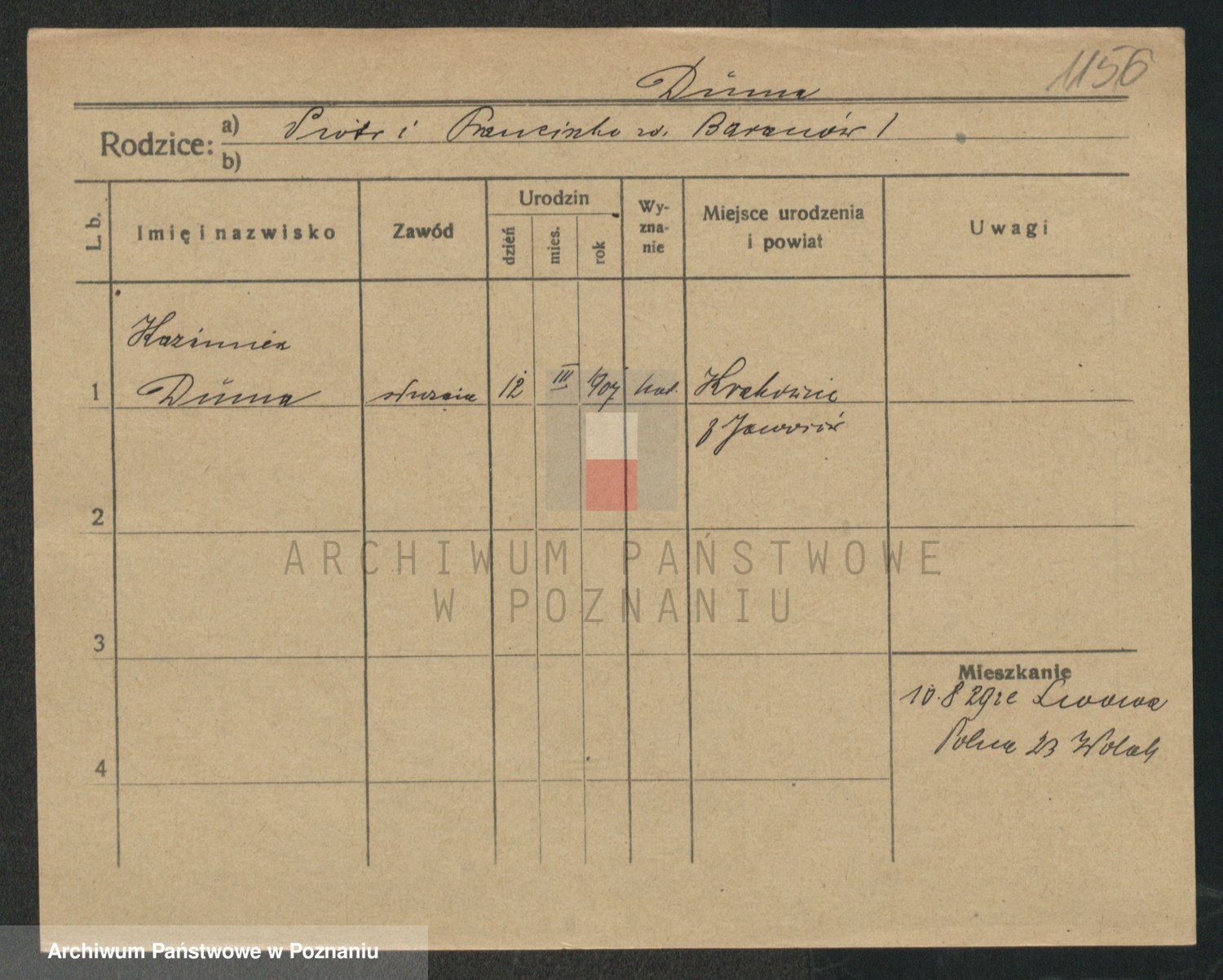 Podgląd karty osobowej dostępny jest po kliknięciu na nazwisko lub ikonkę karty. Można dokonywać powiększenia (ikony na górze) lub przechodzić między kolejnymi skanami (strzałki po bokach).