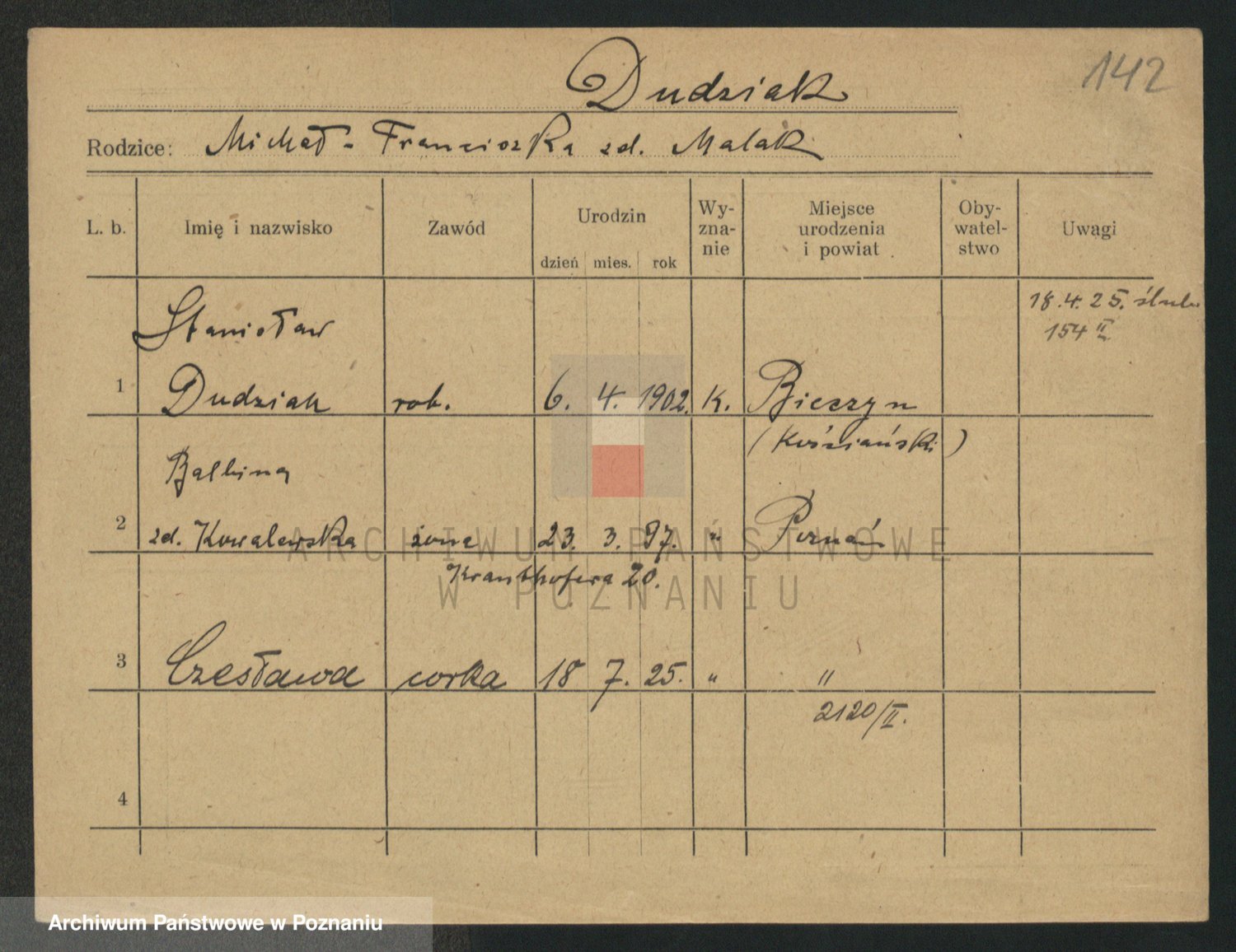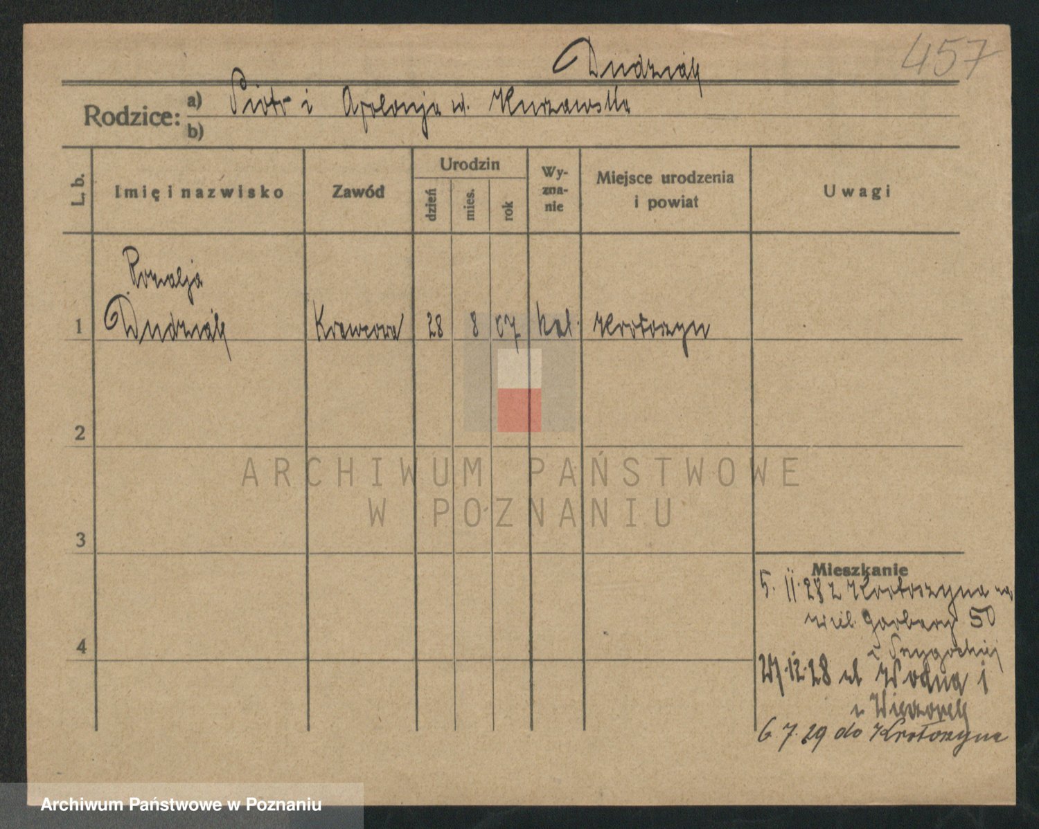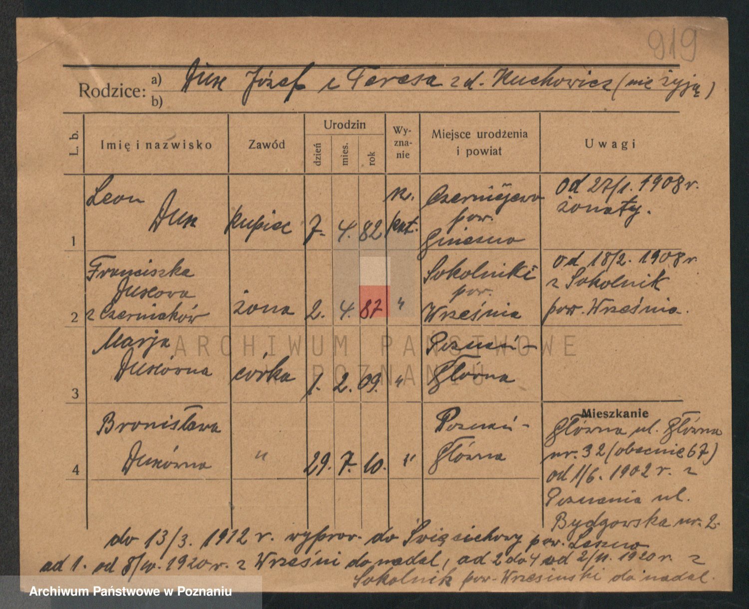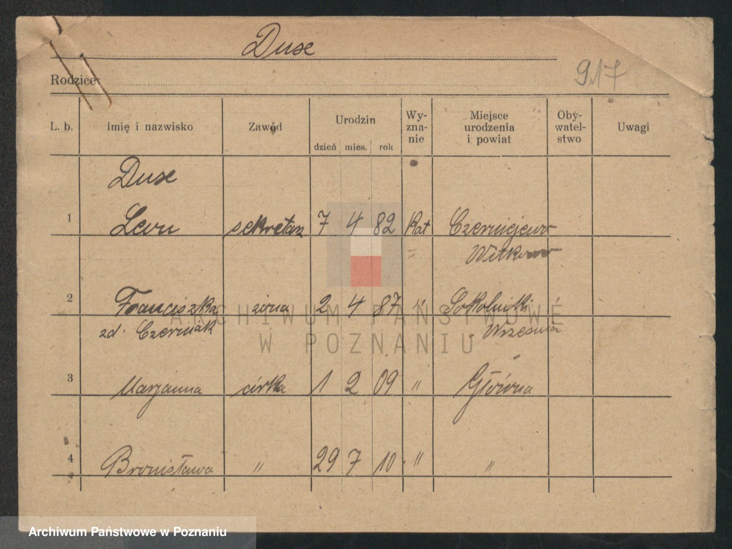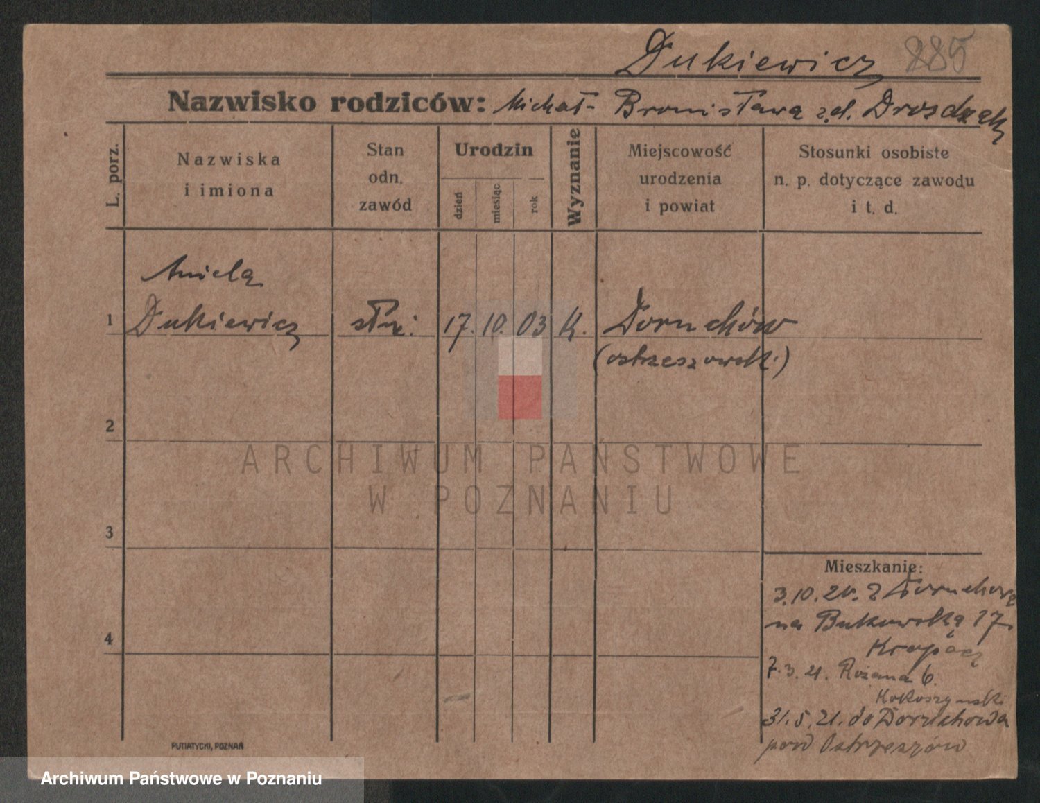 Podgląd karty osobowej dostępny jest po kliknięciu na nazwisko lub ikonkę karty. Można dokonywać powiększenia (ikony na górze) lub przechodzić między kolejnymi skanami (strzałki po bokach).