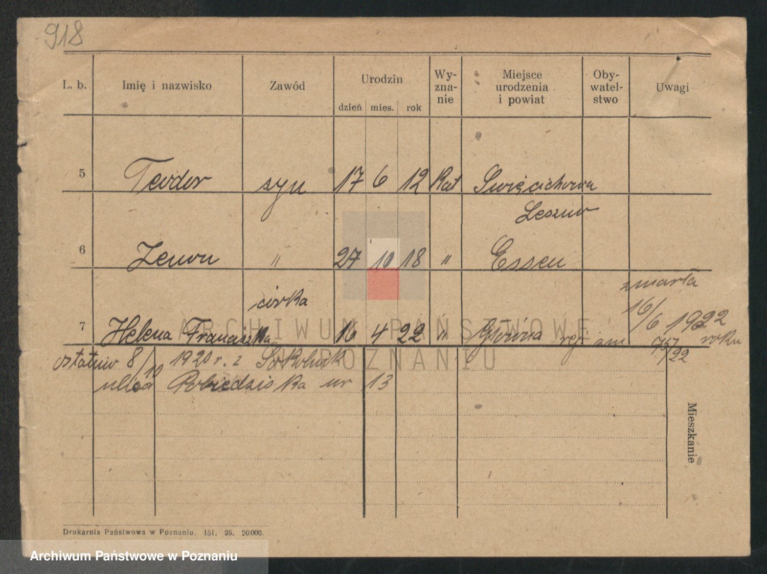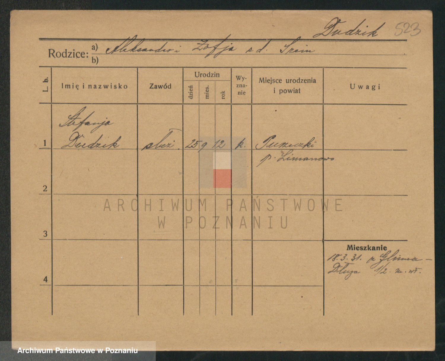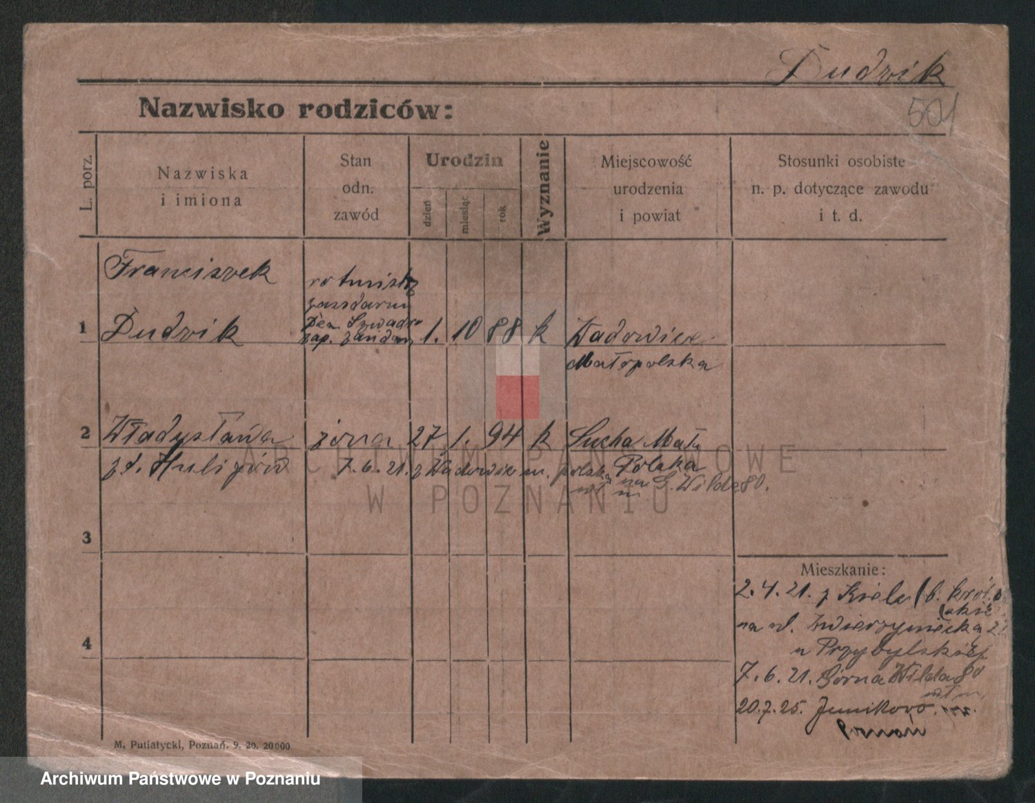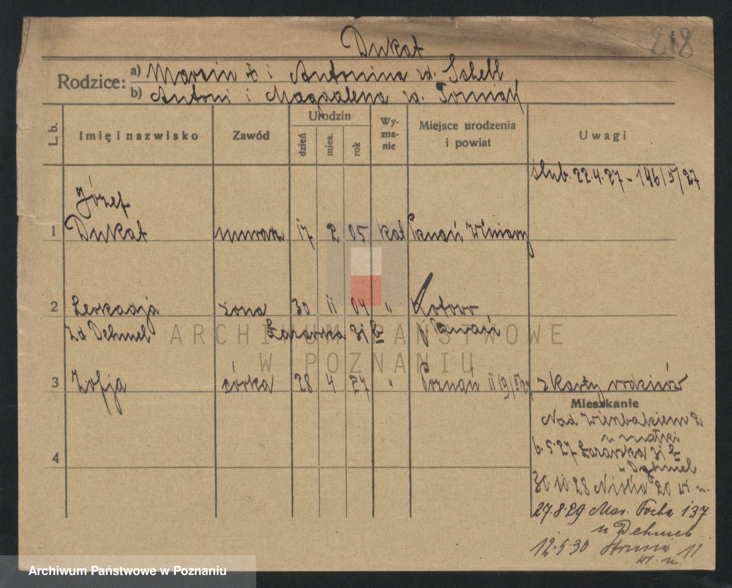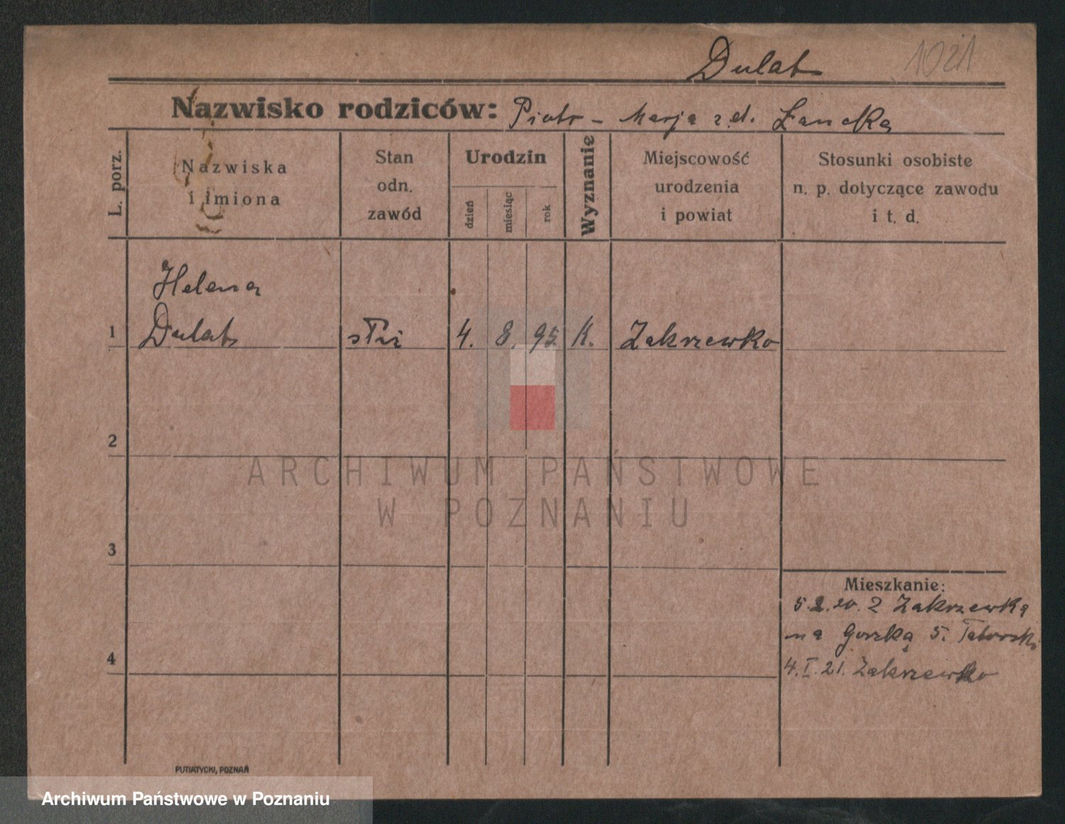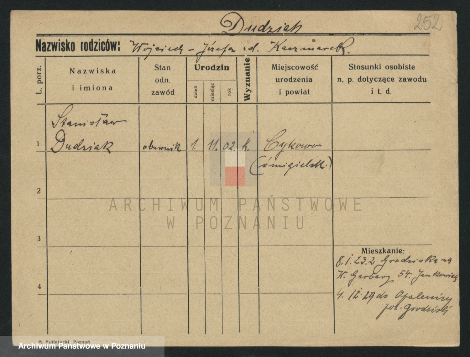 Podgląd karty osobowej dostępny jest po kliknięciu na nazwisko lub ikonkę karty. Można dokonywać powiększenia (ikony na górze) lub przechodzić między kolejnymi skanami (strzałki po bokach).