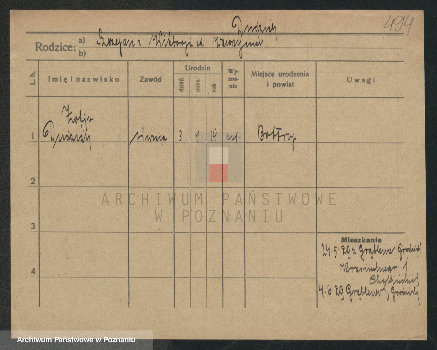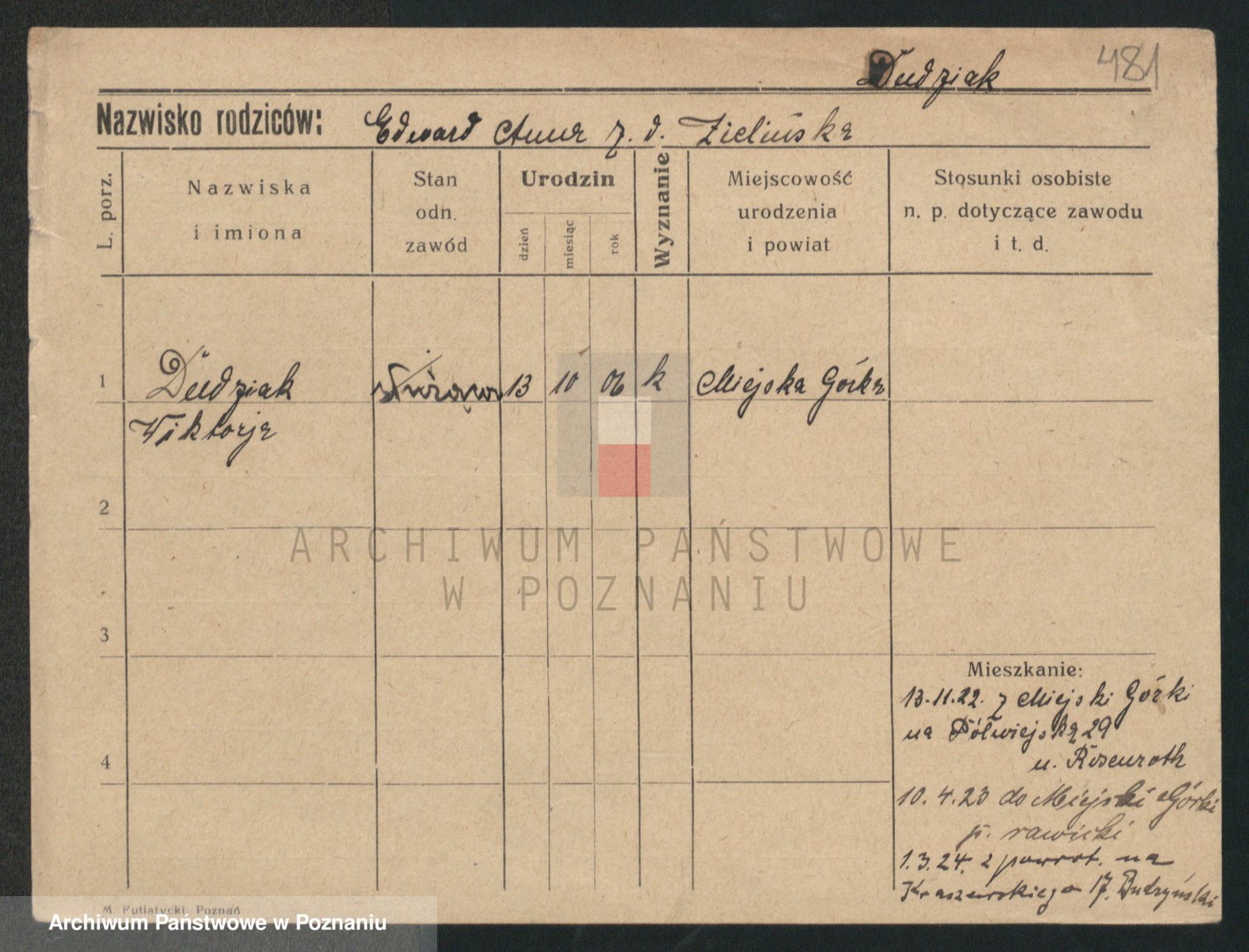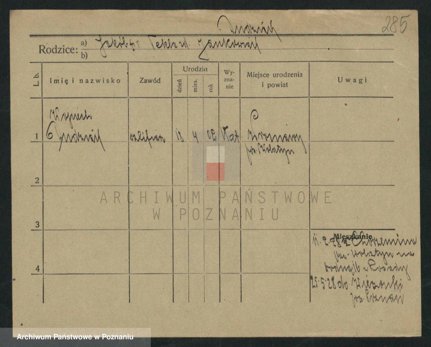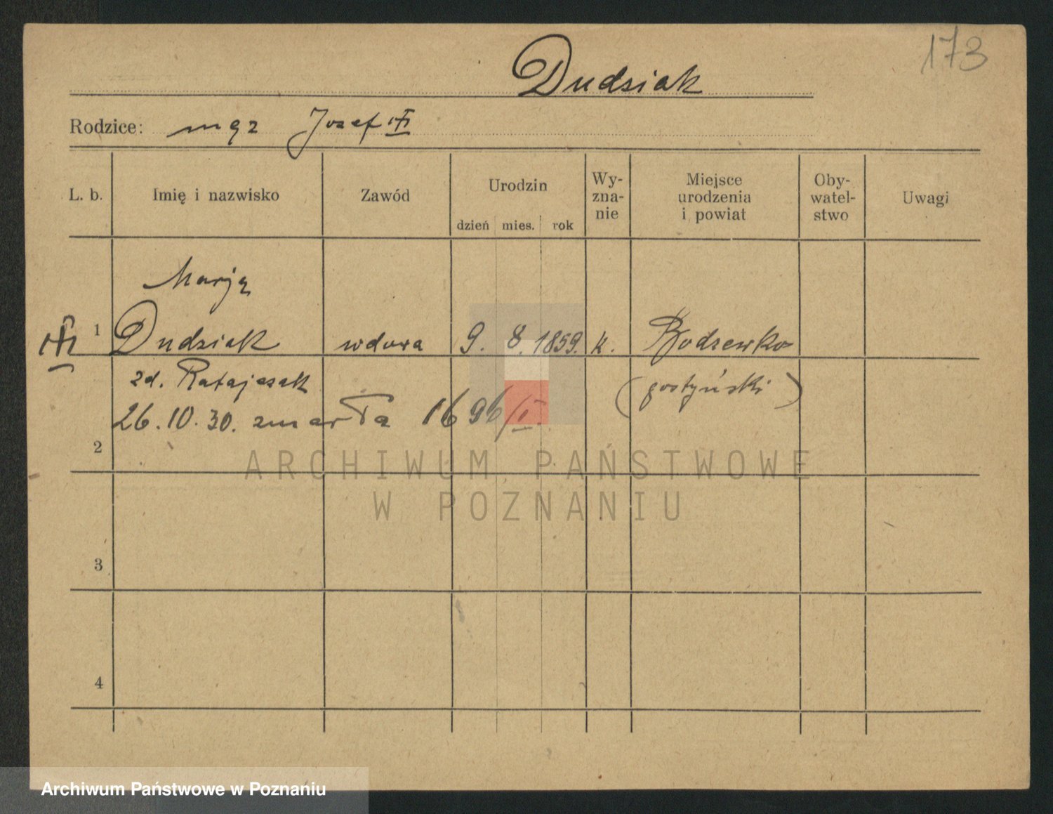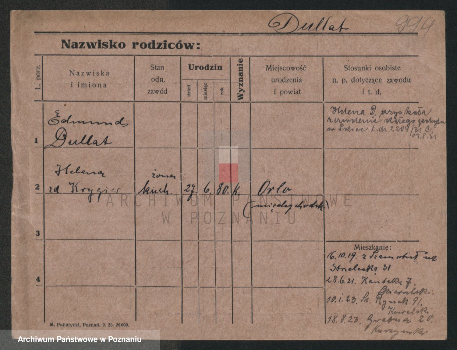Podgląd karty osobowej dostępny jest po kliknięciu na nazwisko lub ikonkę karty. Można dokonywać powiększenia (ikony na górze) lub przechodzić między kolejnymi skanami (strzałki po bokach).