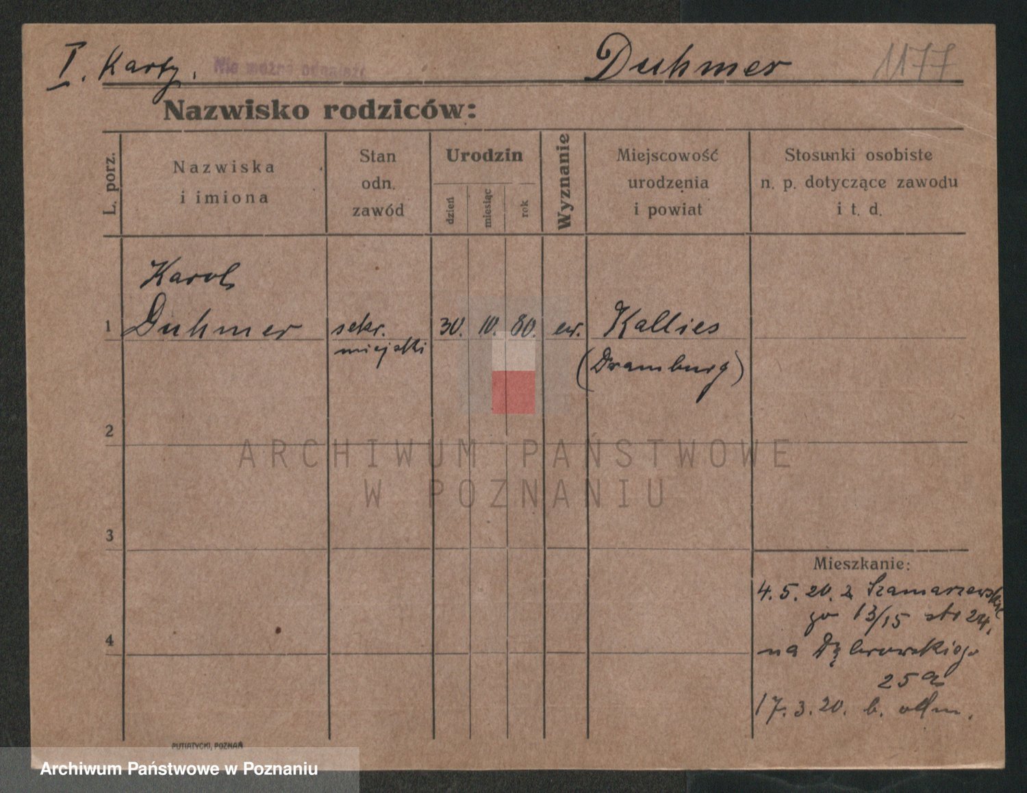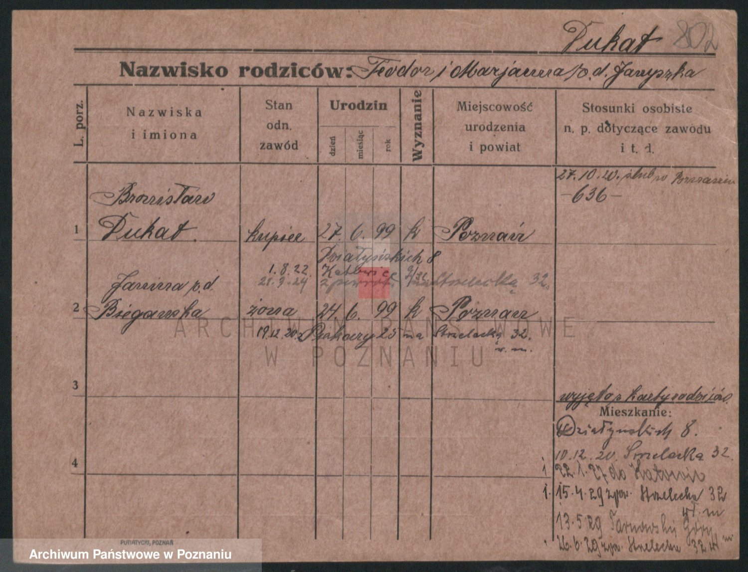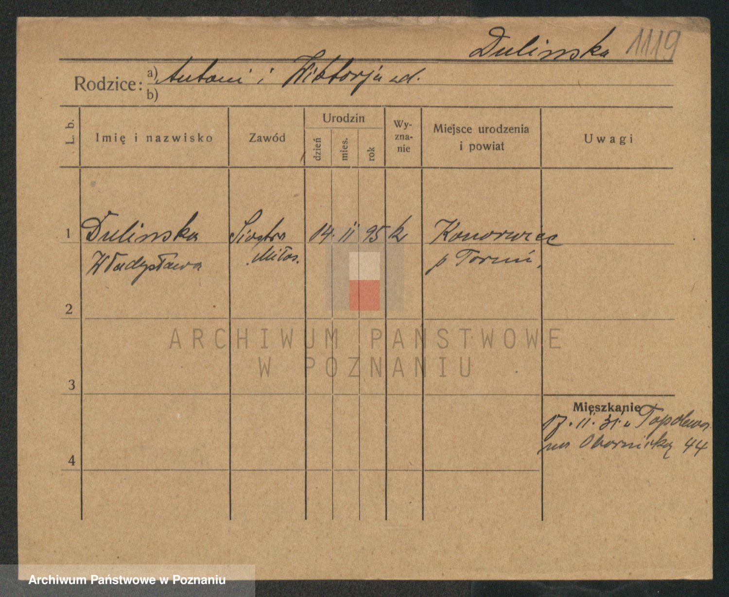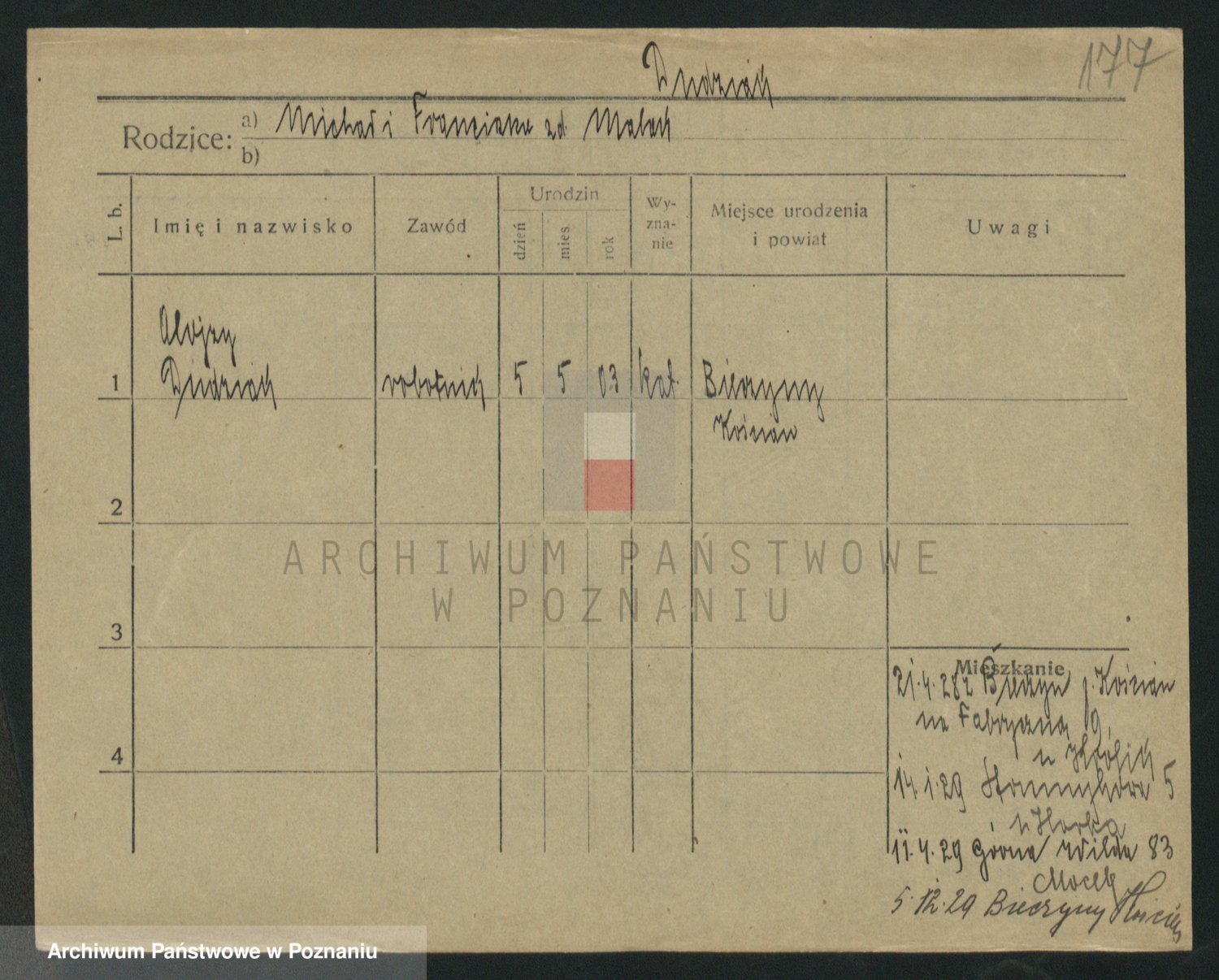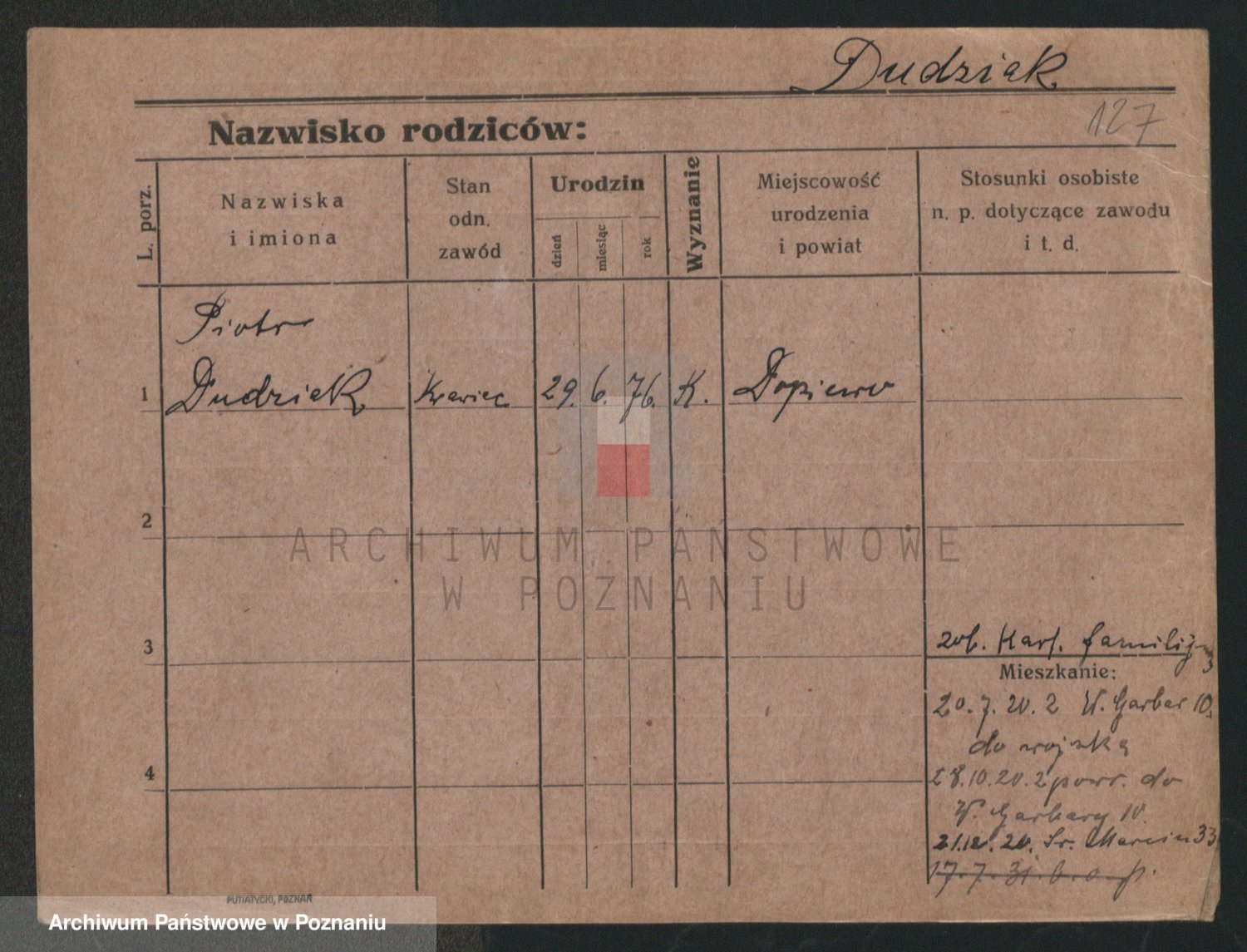 Podgląd karty osobowej dostępny jest po kliknięciu na nazwisko lub ikonkę karty. Można dokonywać powiększenia (ikony na górze) lub przechodzić między kolejnymi skanami (strzałki po bokach).