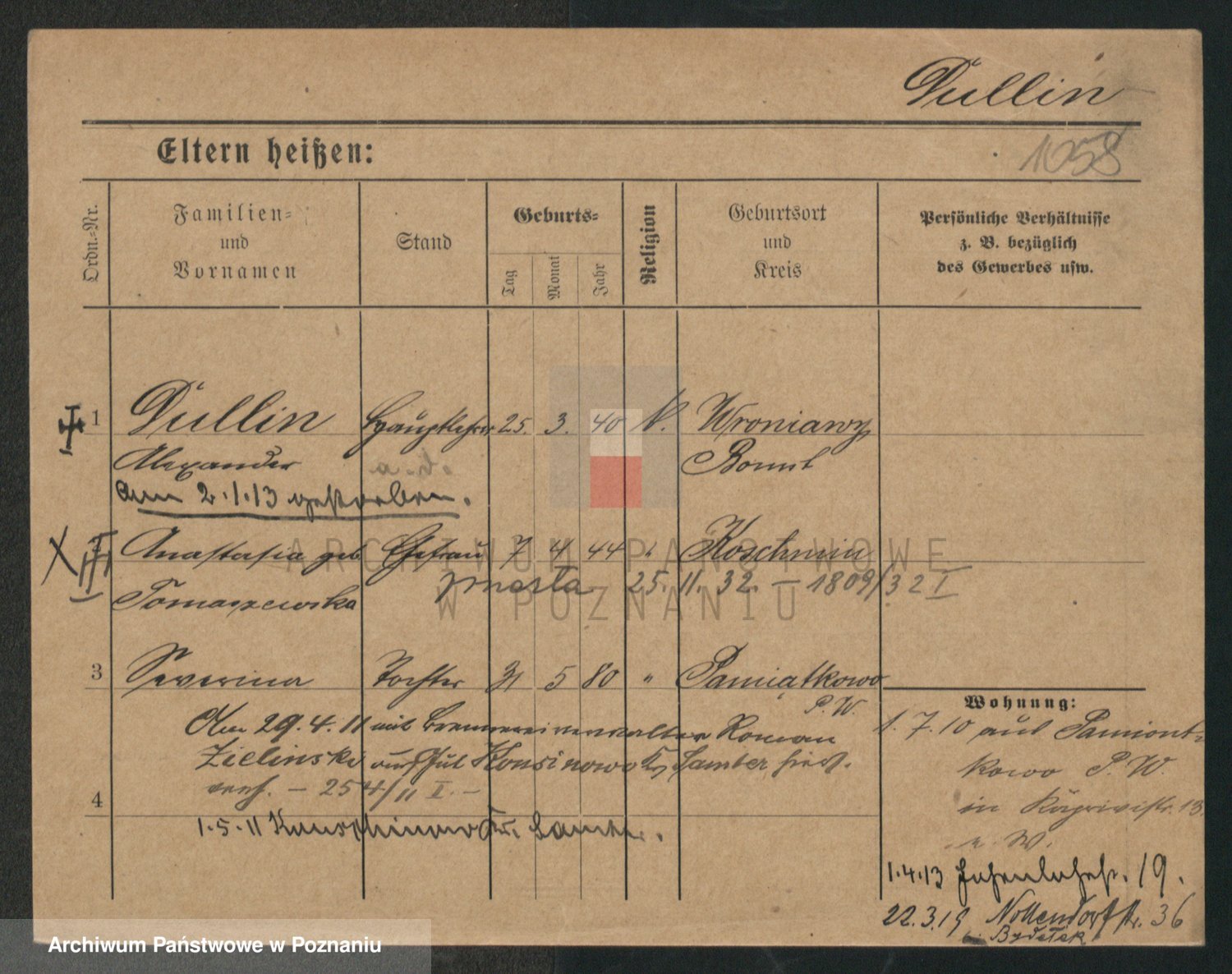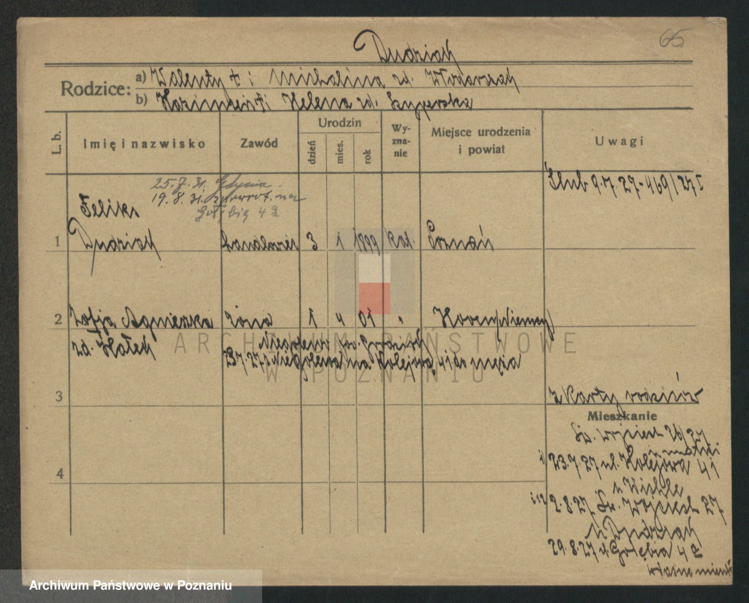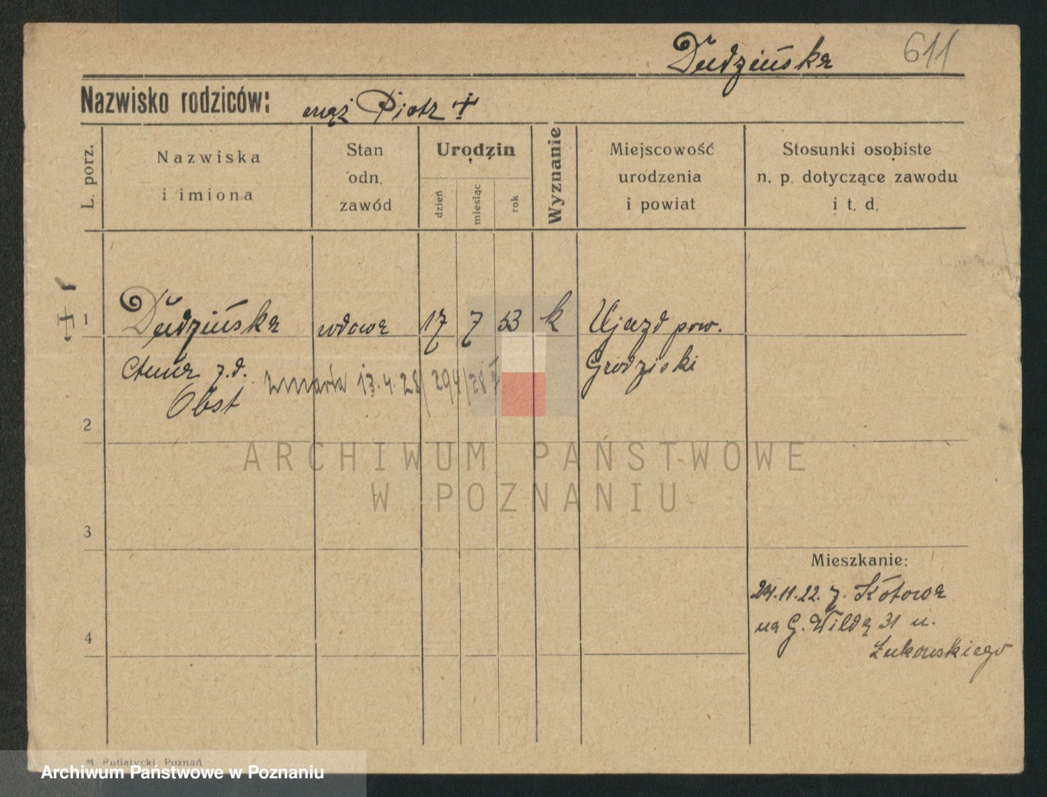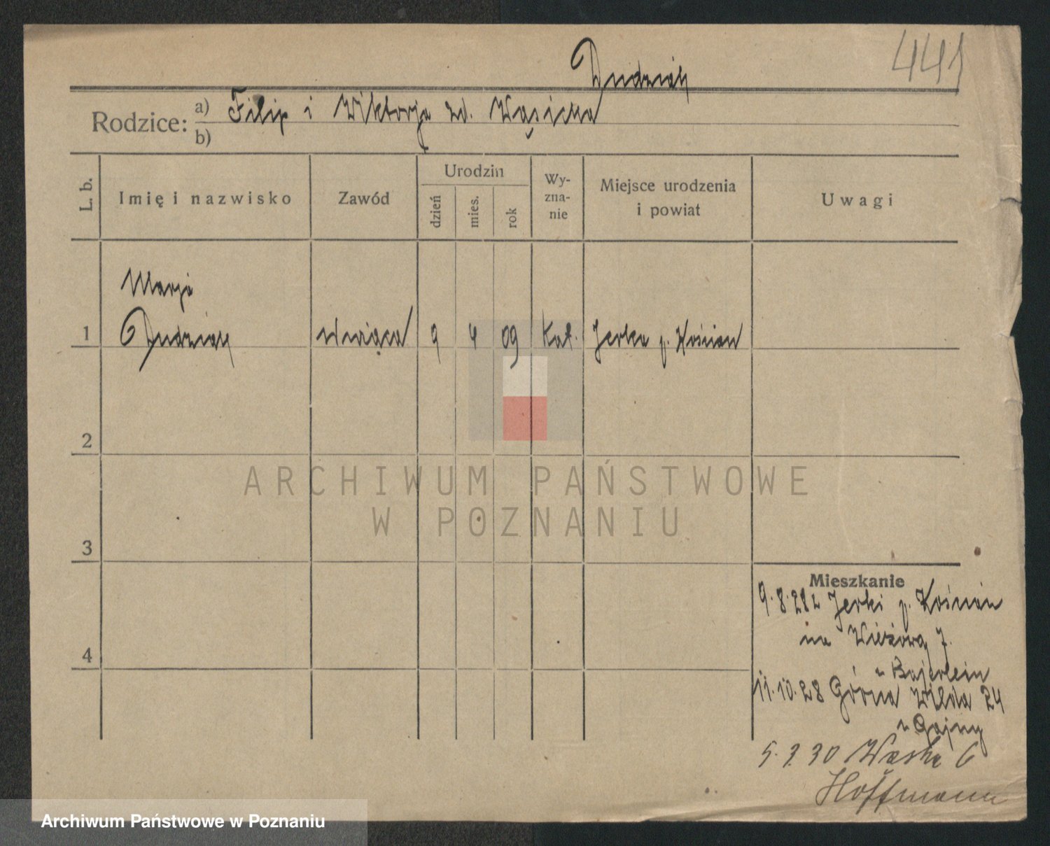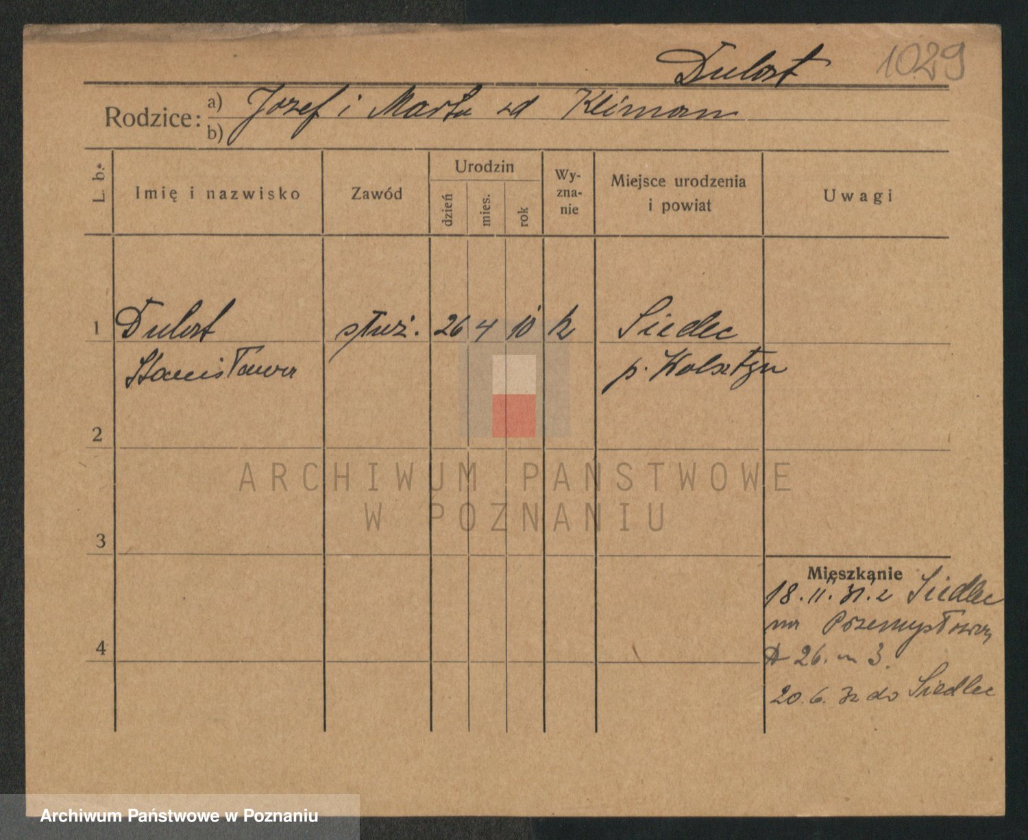 Podgląd karty osobowej dostępny jest po kliknięciu na nazwisko lub ikonkę karty. Można dokonywać powiększenia (ikony na górze) lub przechodzić między kolejnymi skanami (strzałki po bokach).