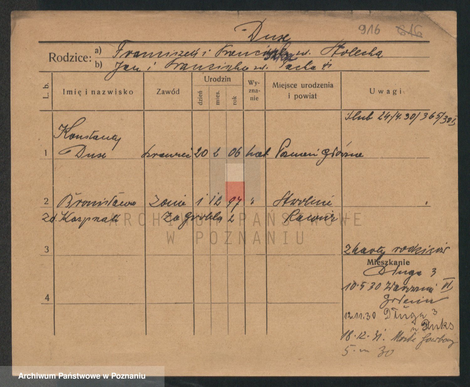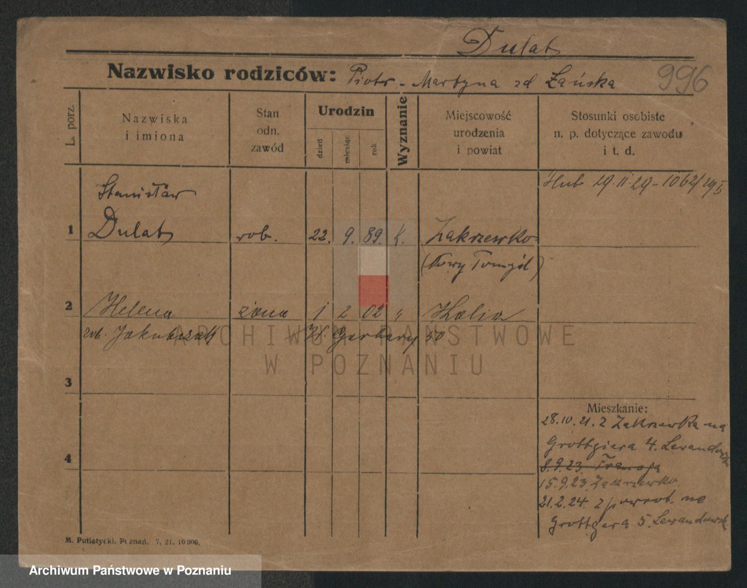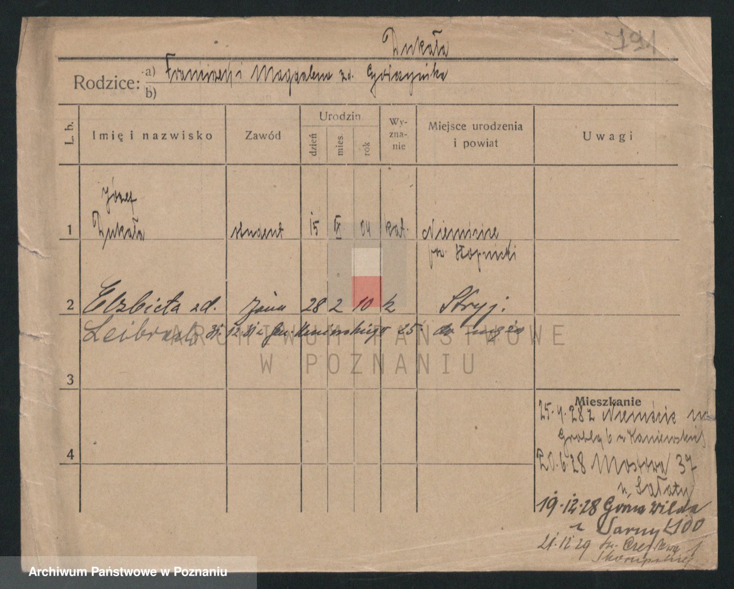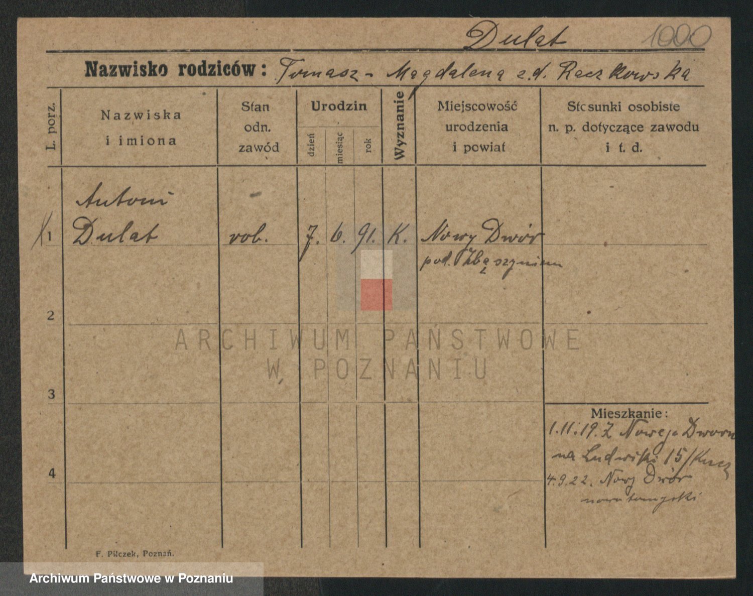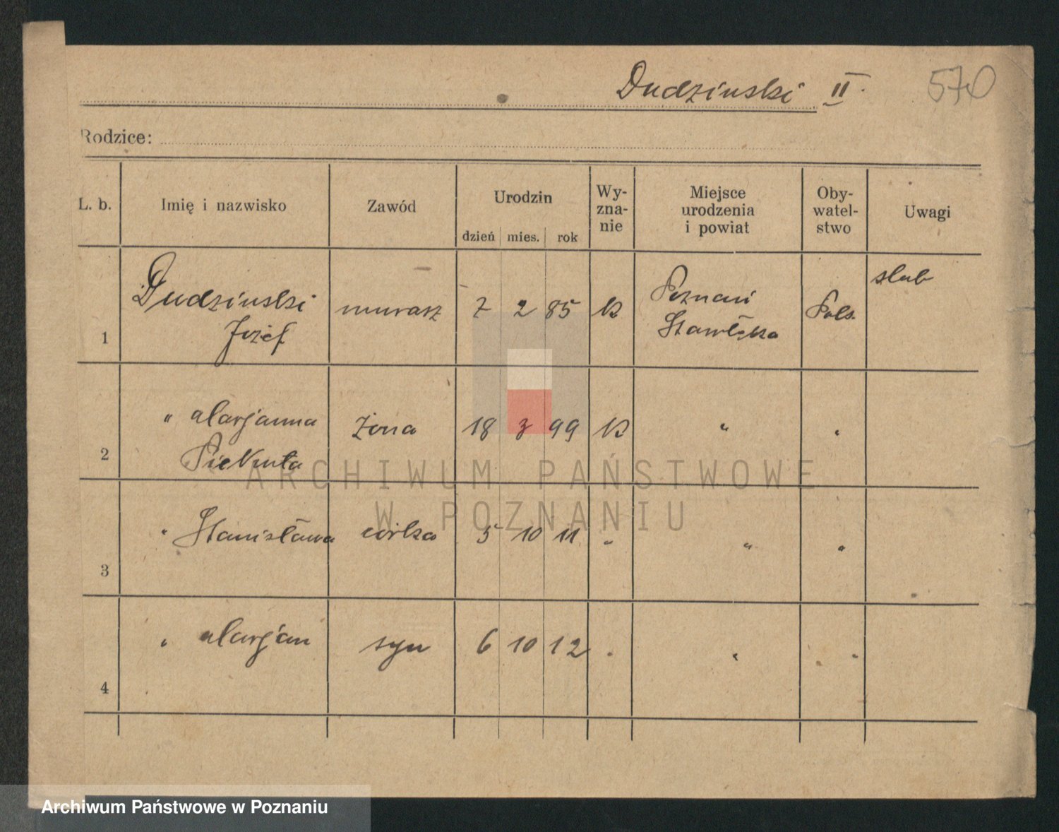 Podgląd karty osobowej dostępny jest po kliknięciu na nazwisko lub ikonkę karty. Można dokonywać powiększenia (ikony na górze) lub przechodzić między kolejnymi skanami (strzałki po bokach).