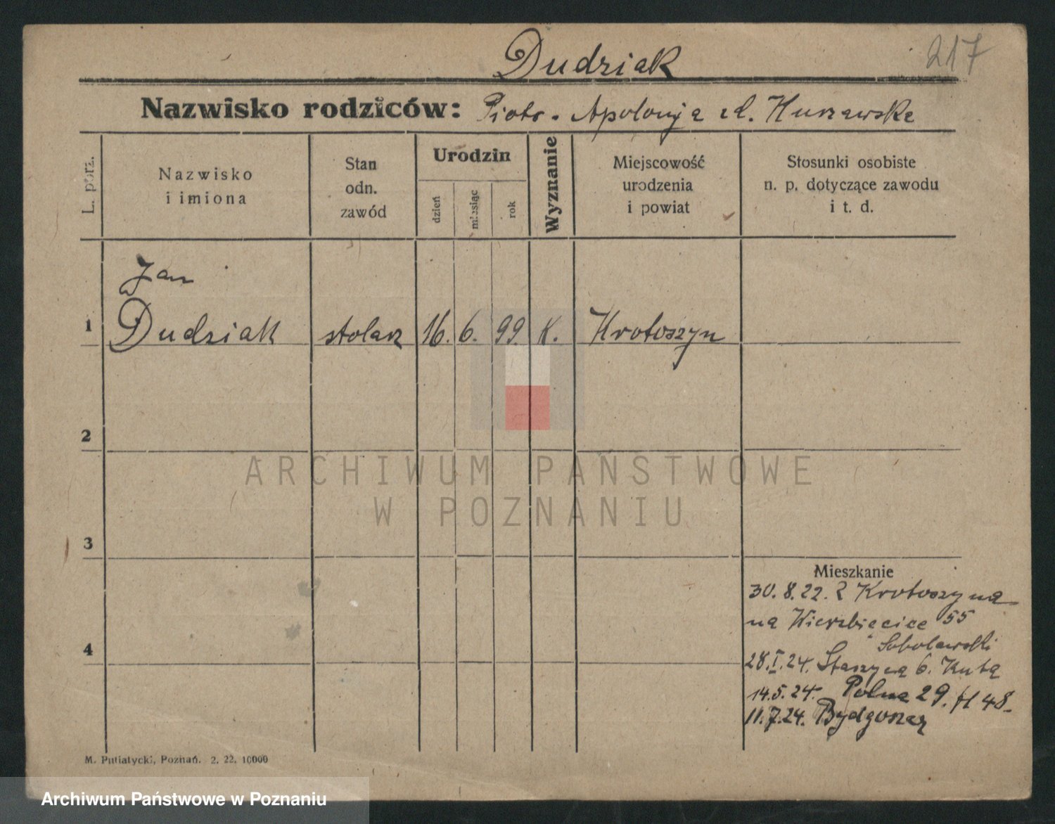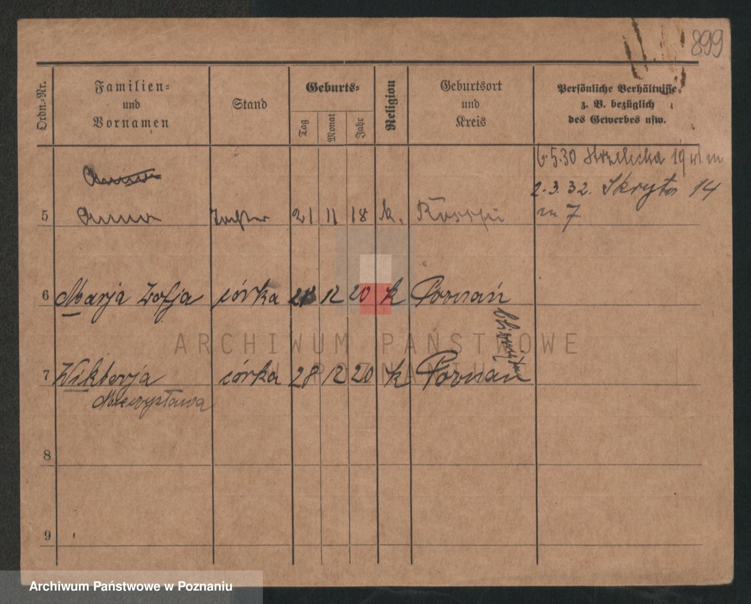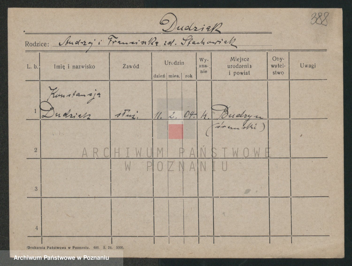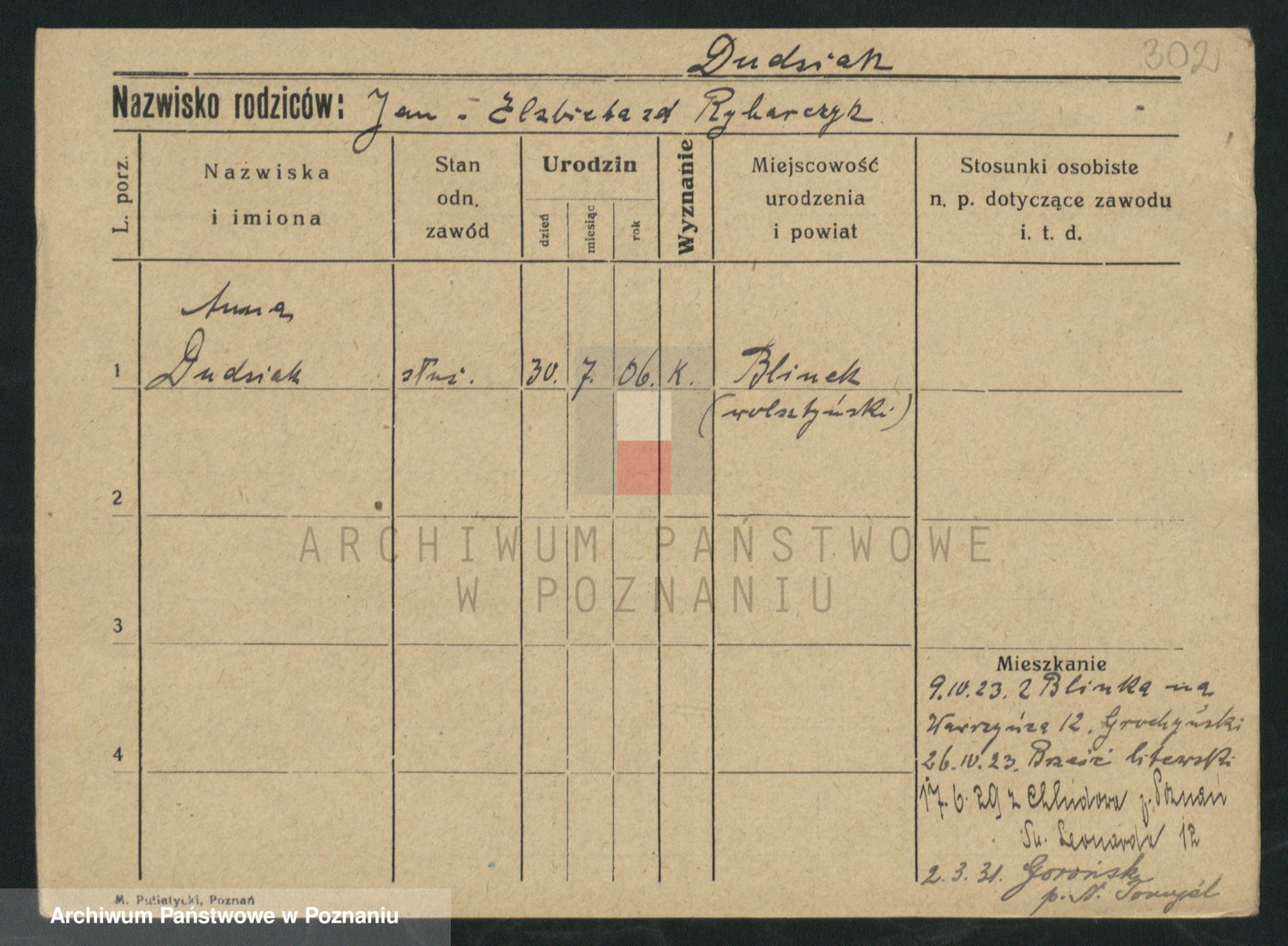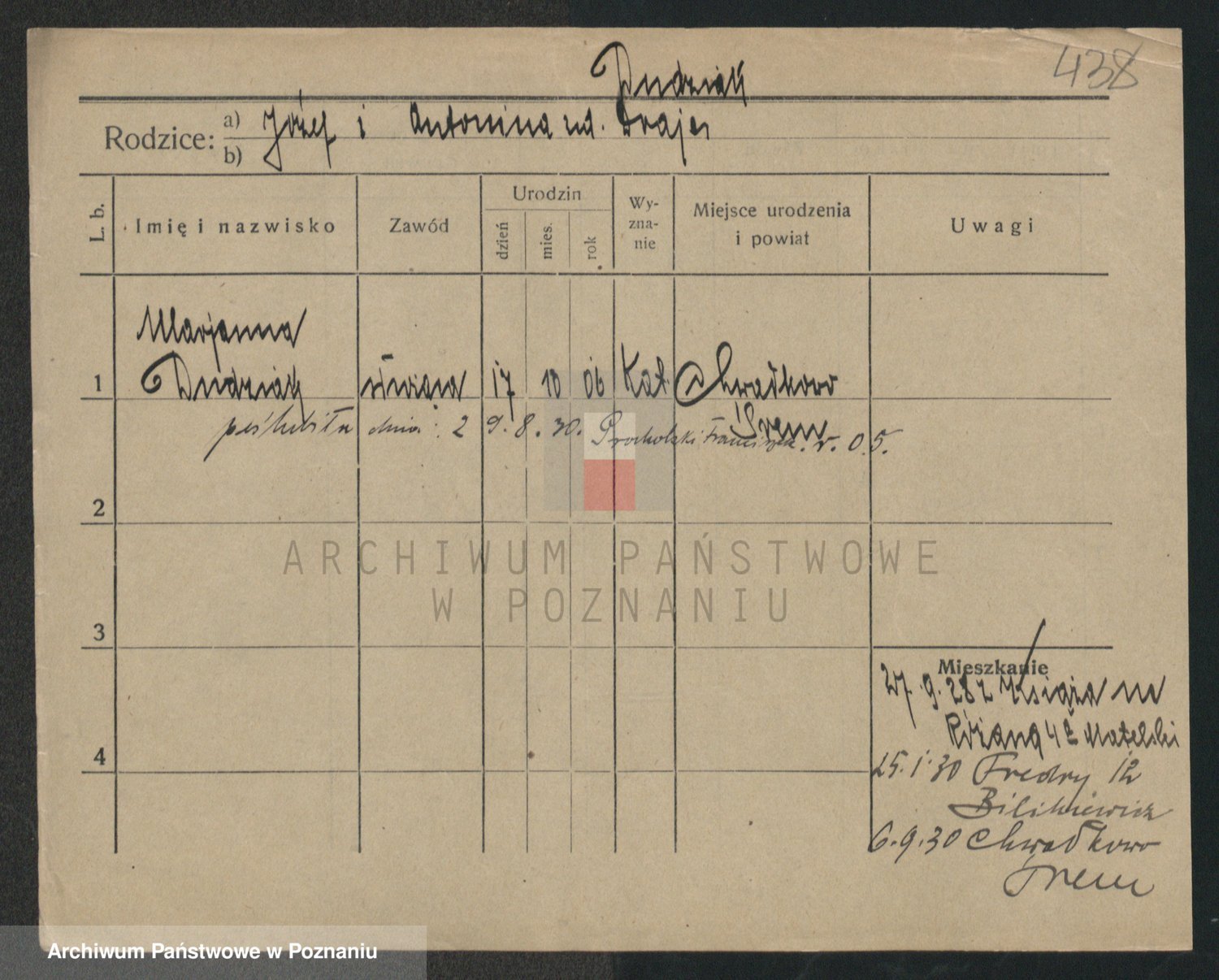 Podgląd karty osobowej dostępny jest po kliknięciu na nazwisko lub ikonkę karty. Można dokonywać powiększenia (ikony na górze) lub przechodzić między kolejnymi skanami (strzałki po bokach).