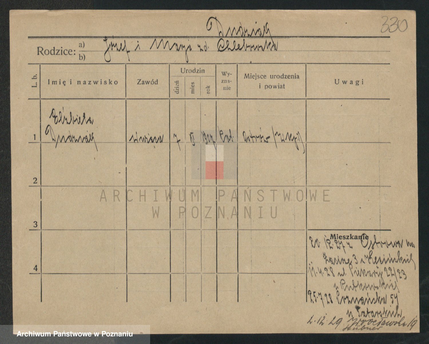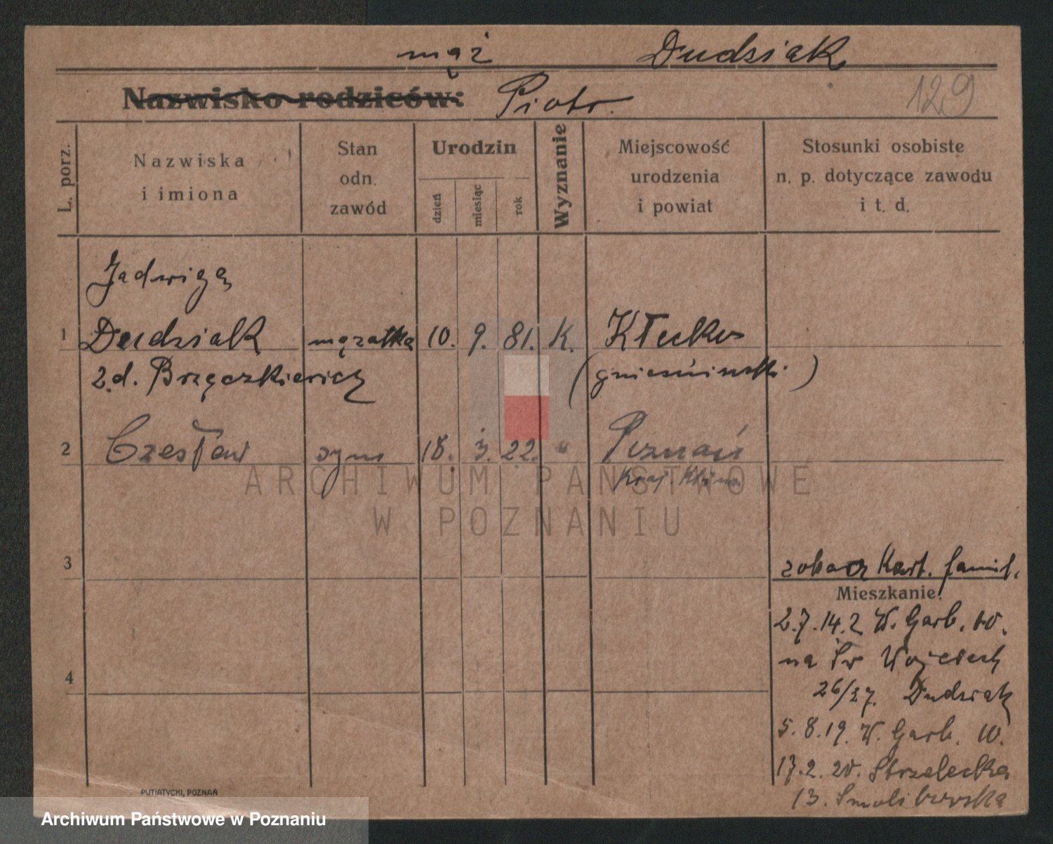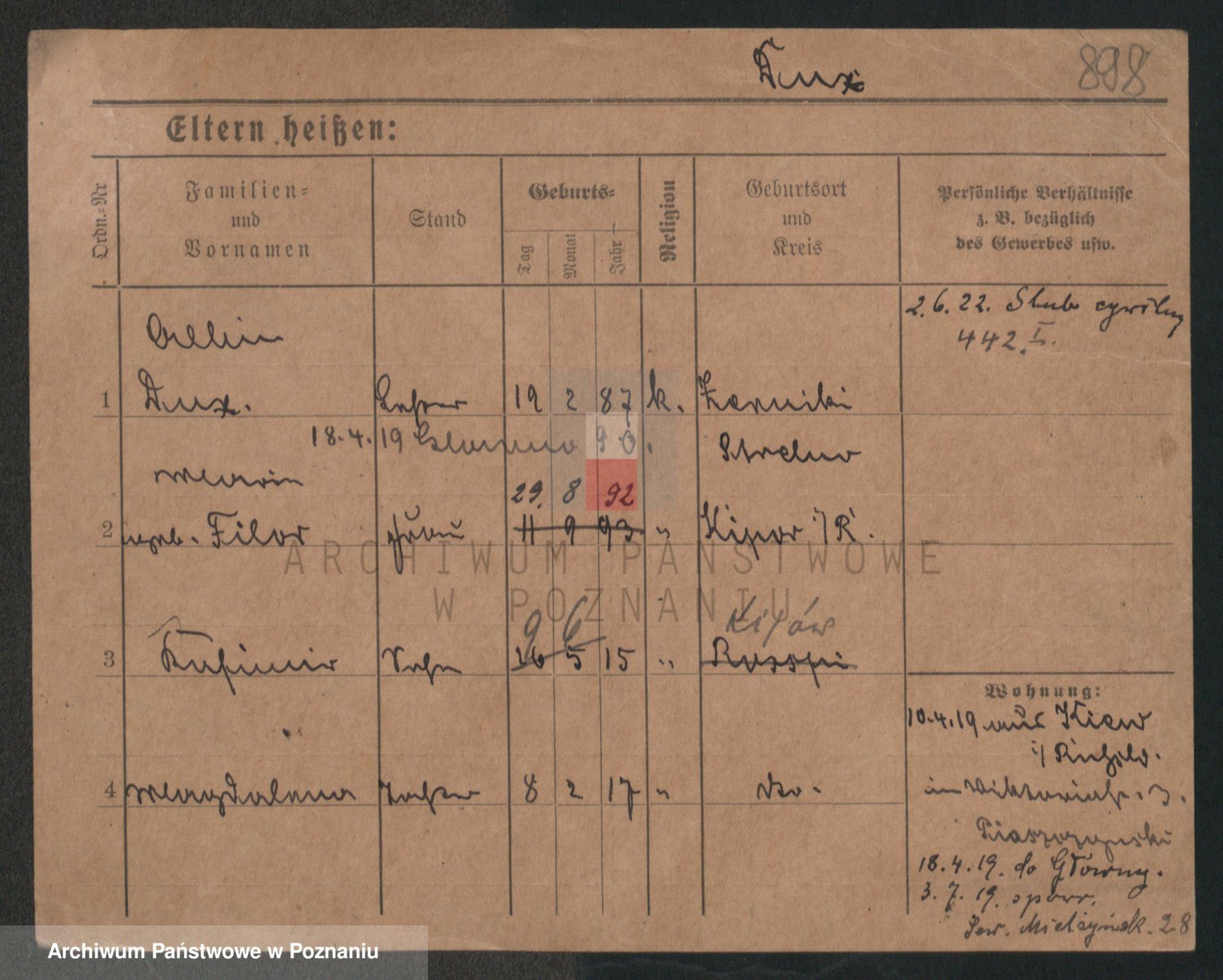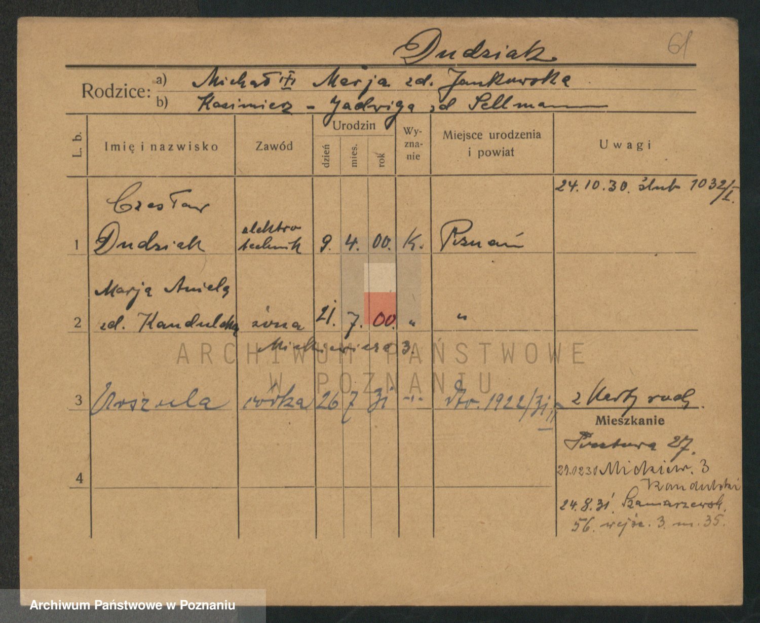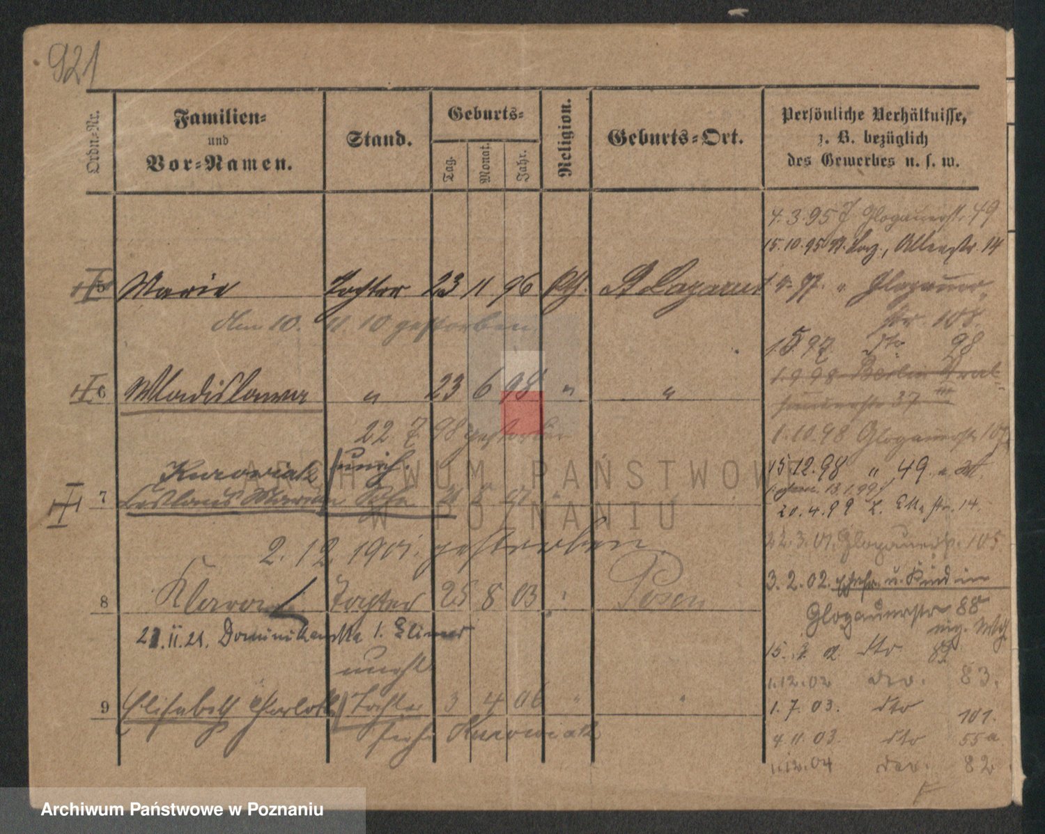 Podgląd karty osobowej dostępny jest po kliknięciu na nazwisko lub ikonkę karty. Można dokonywać powiększenia (ikony na górze) lub przechodzić między kolejnymi skanami (strzałki po bokach).