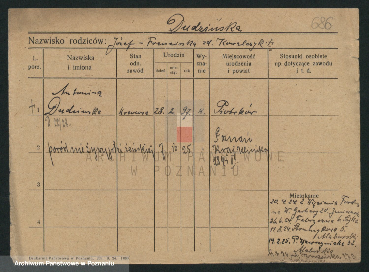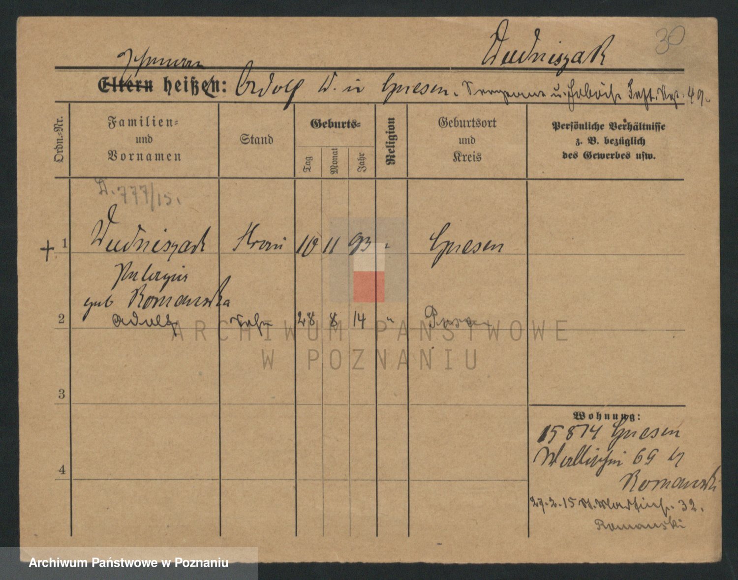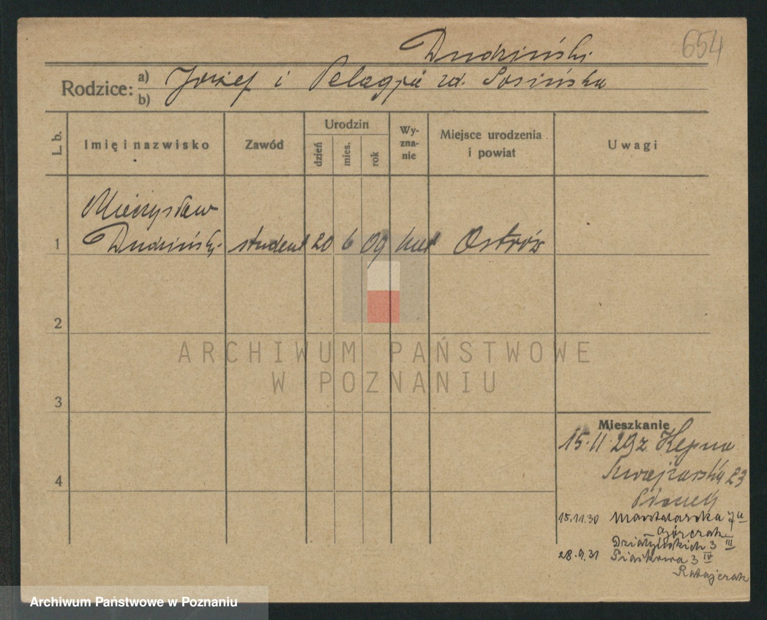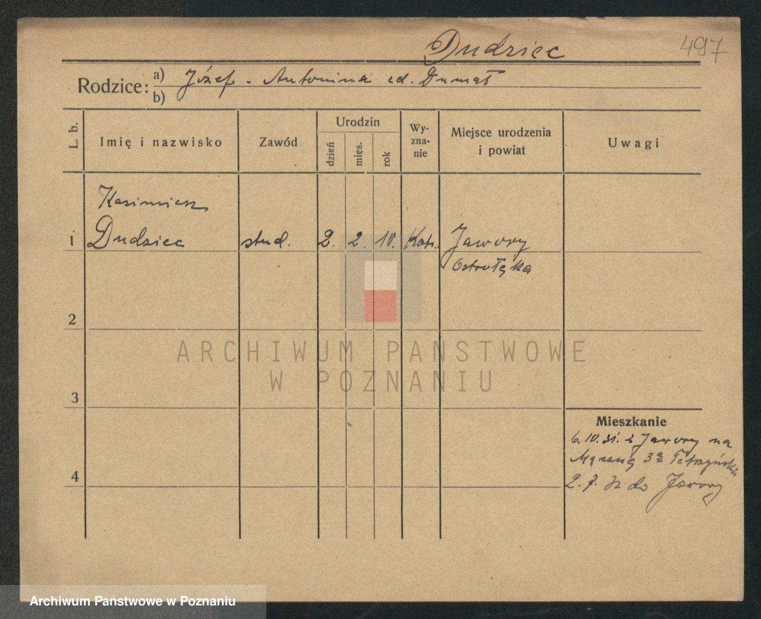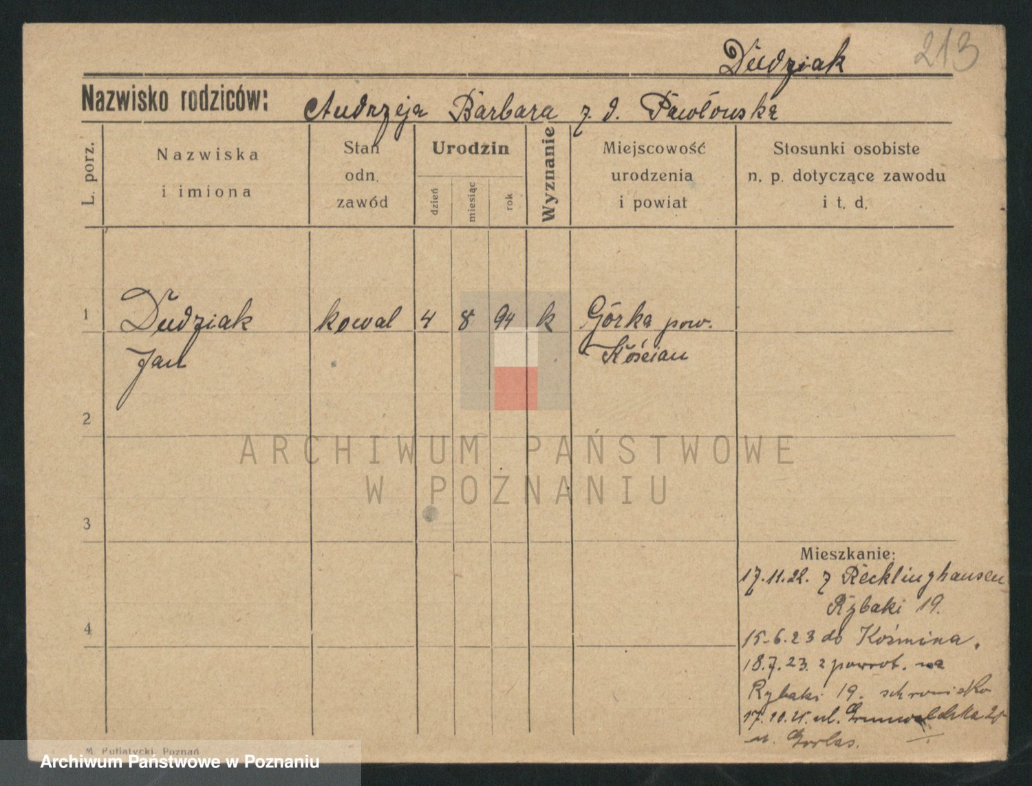 Podgląd karty osobowej dostępny jest po kliknięciu na nazwisko lub ikonkę karty. Można dokonywać powiększenia (ikony na górze) lub przechodzić między kolejnymi skanami (strzałki po bokach).