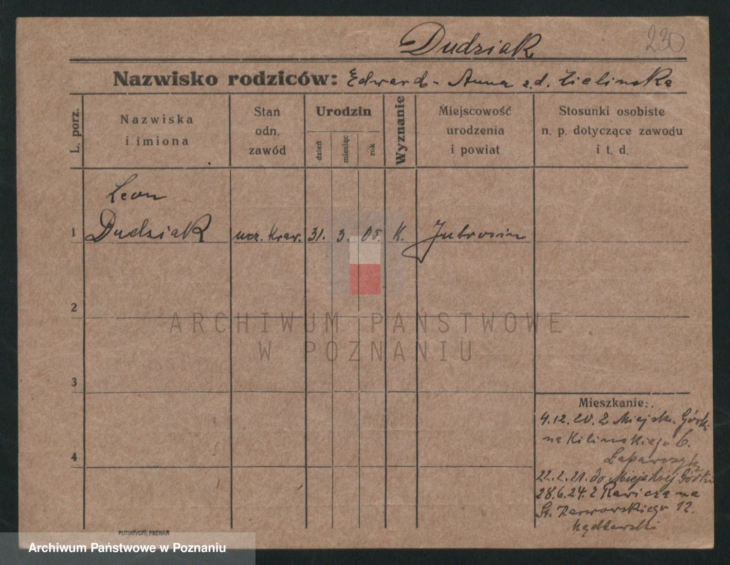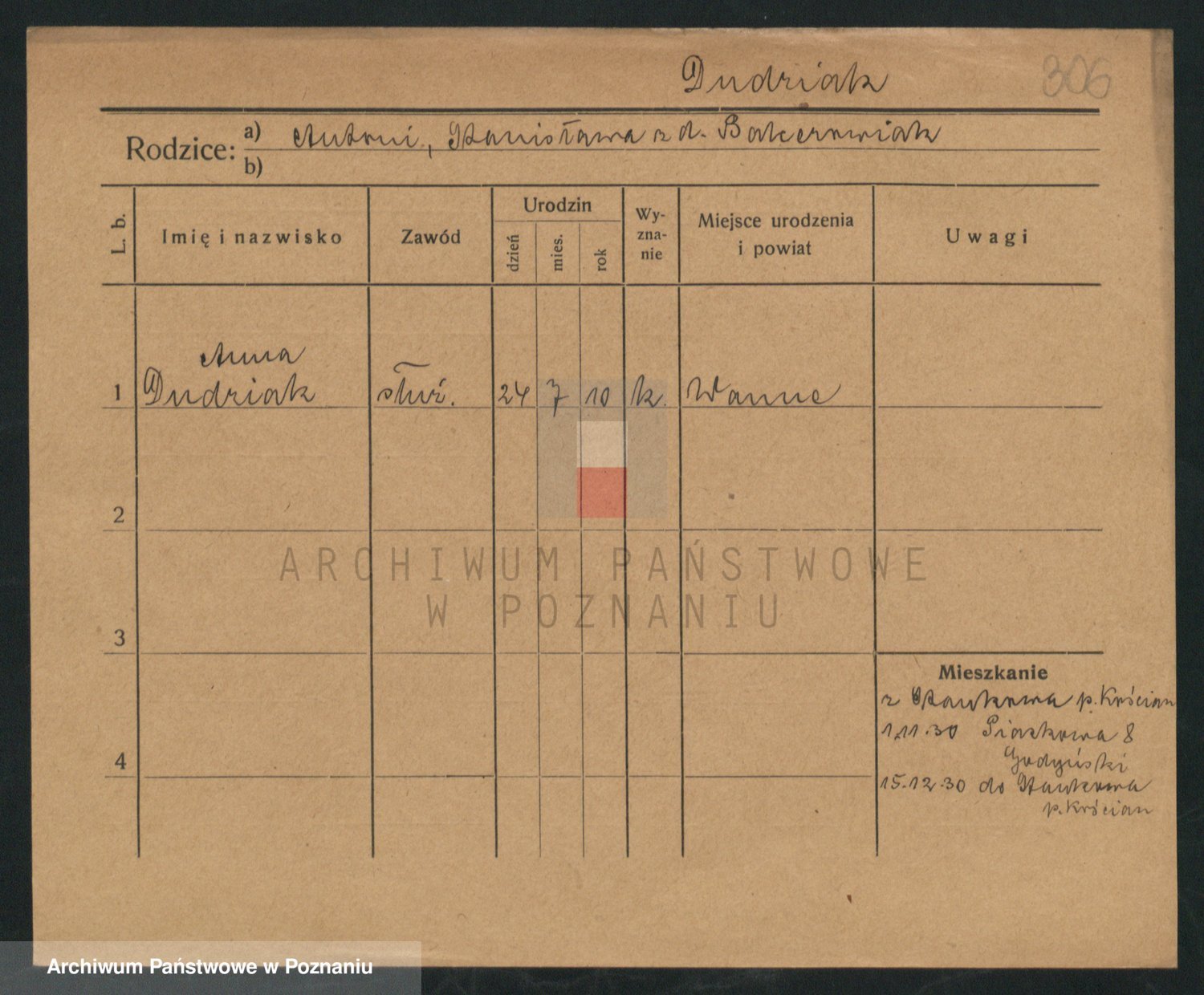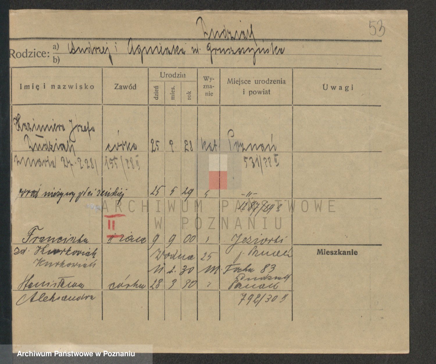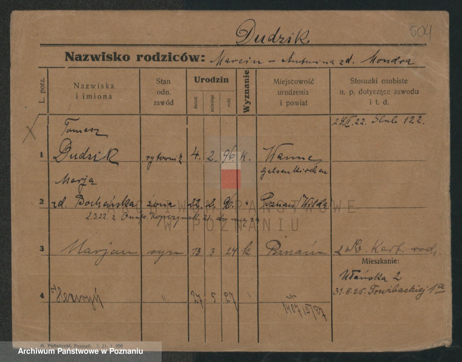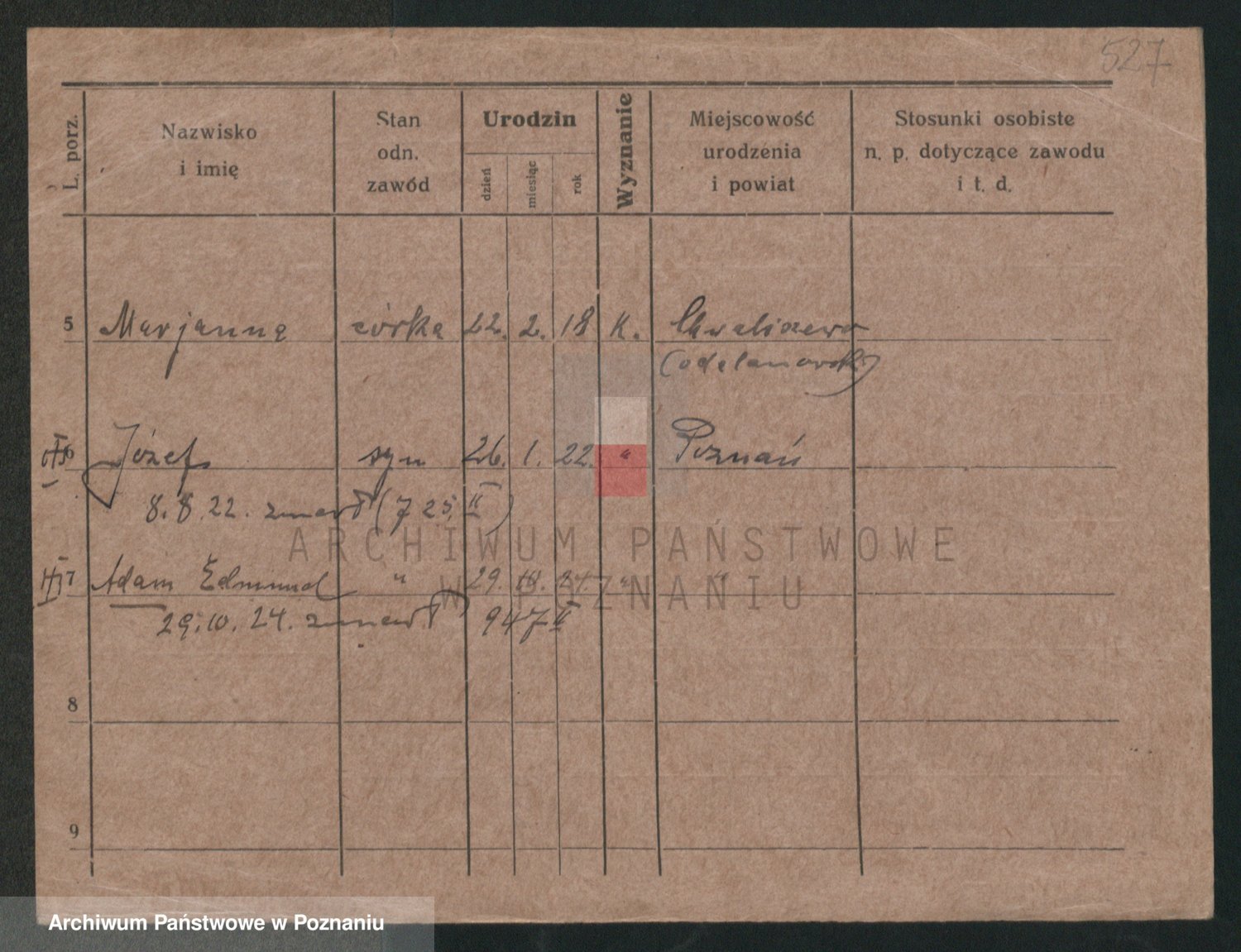 Podgląd karty osobowej dostępny jest po kliknięciu na nazwisko lub ikonkę karty. Można dokonywać powiększenia (ikony na górze) lub przechodzić między kolejnymi skanami (strzałki po bokach).