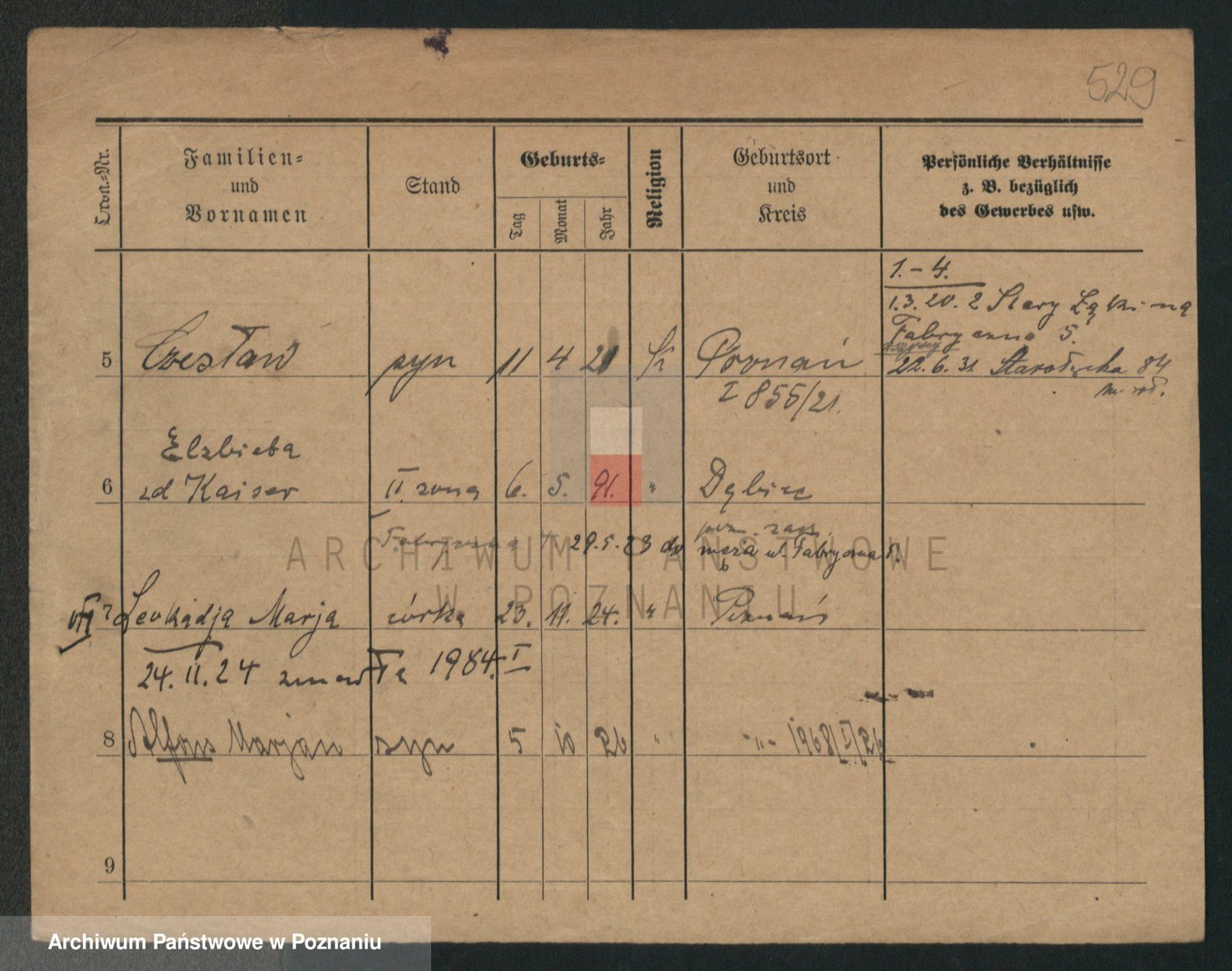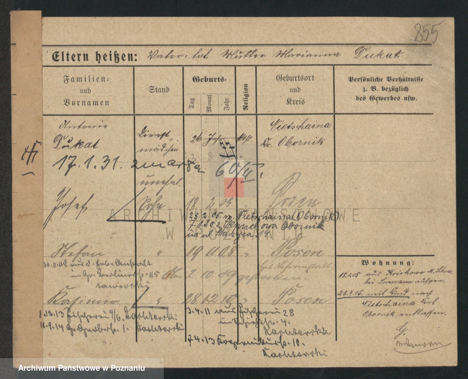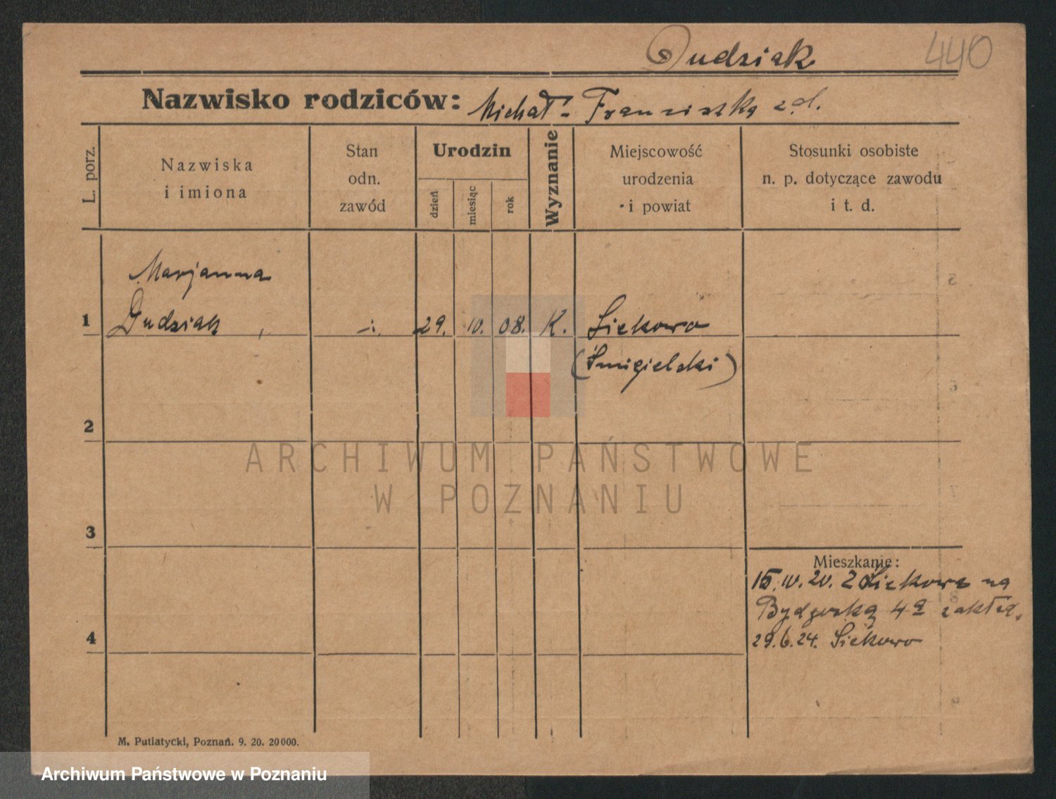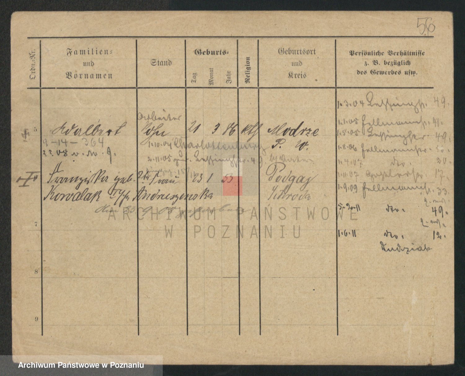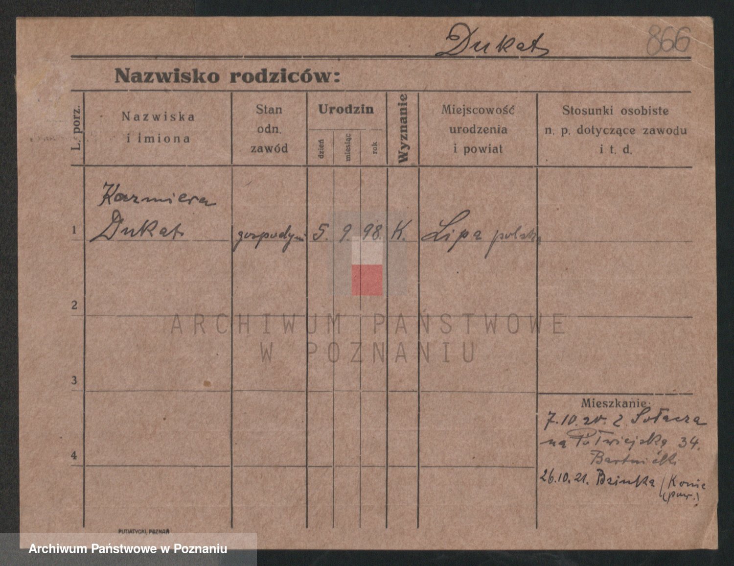 Podgląd karty osobowej dostępny jest po kliknięciu na nazwisko lub ikonkę karty. Można dokonywać powiększenia (ikony na górze) lub przechodzić między kolejnymi skanami (strzałki po bokach).