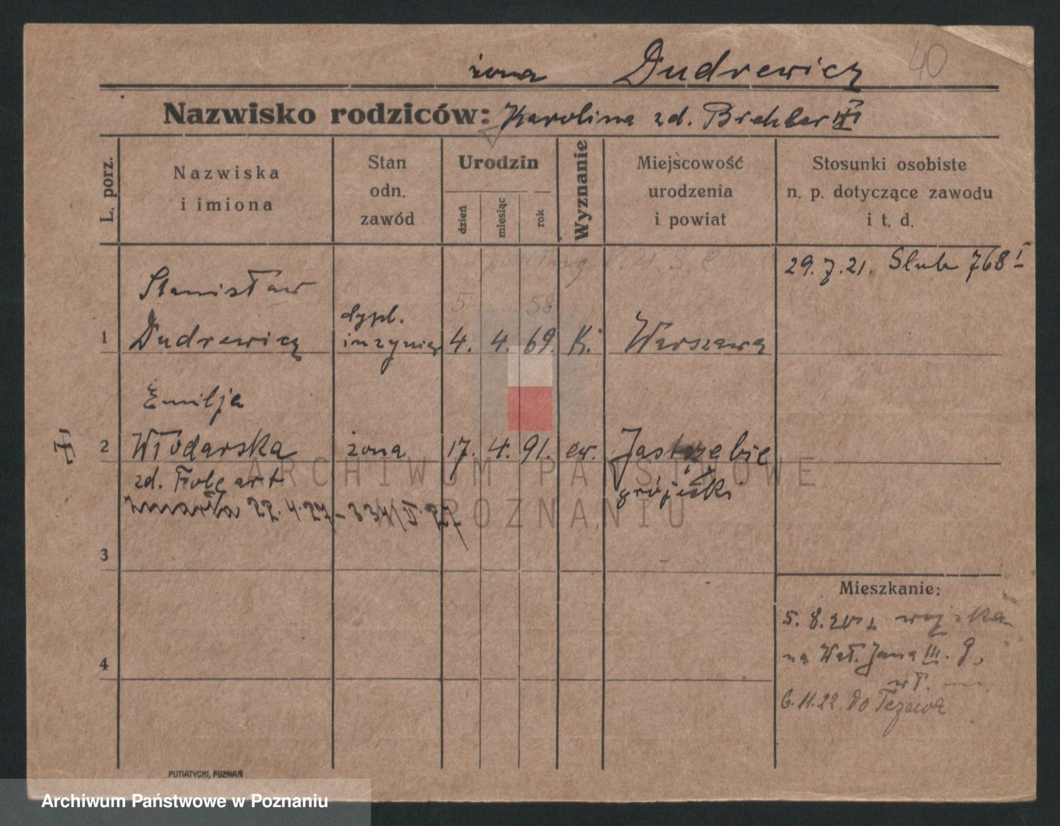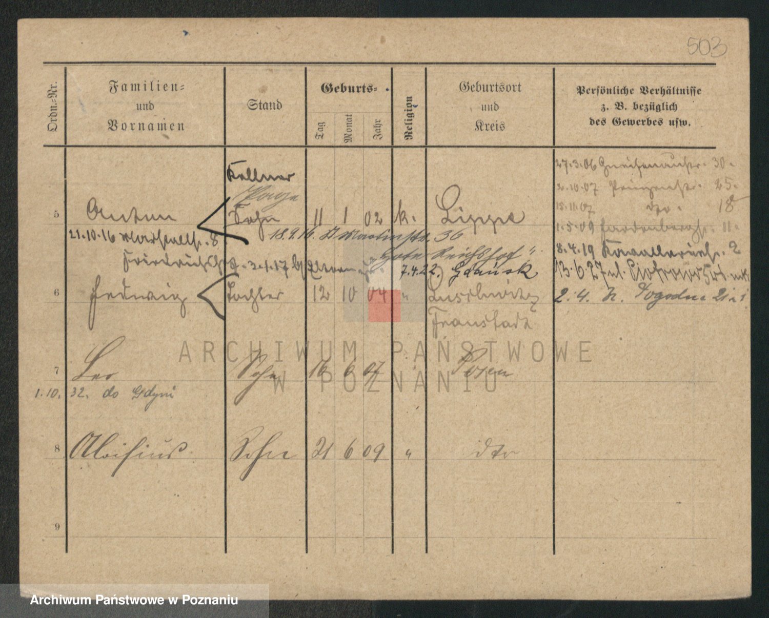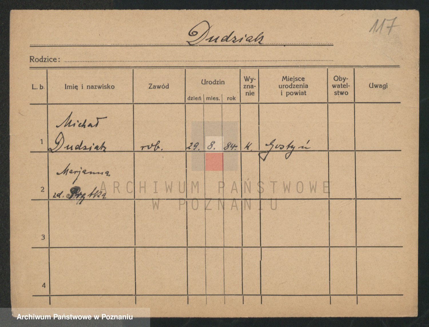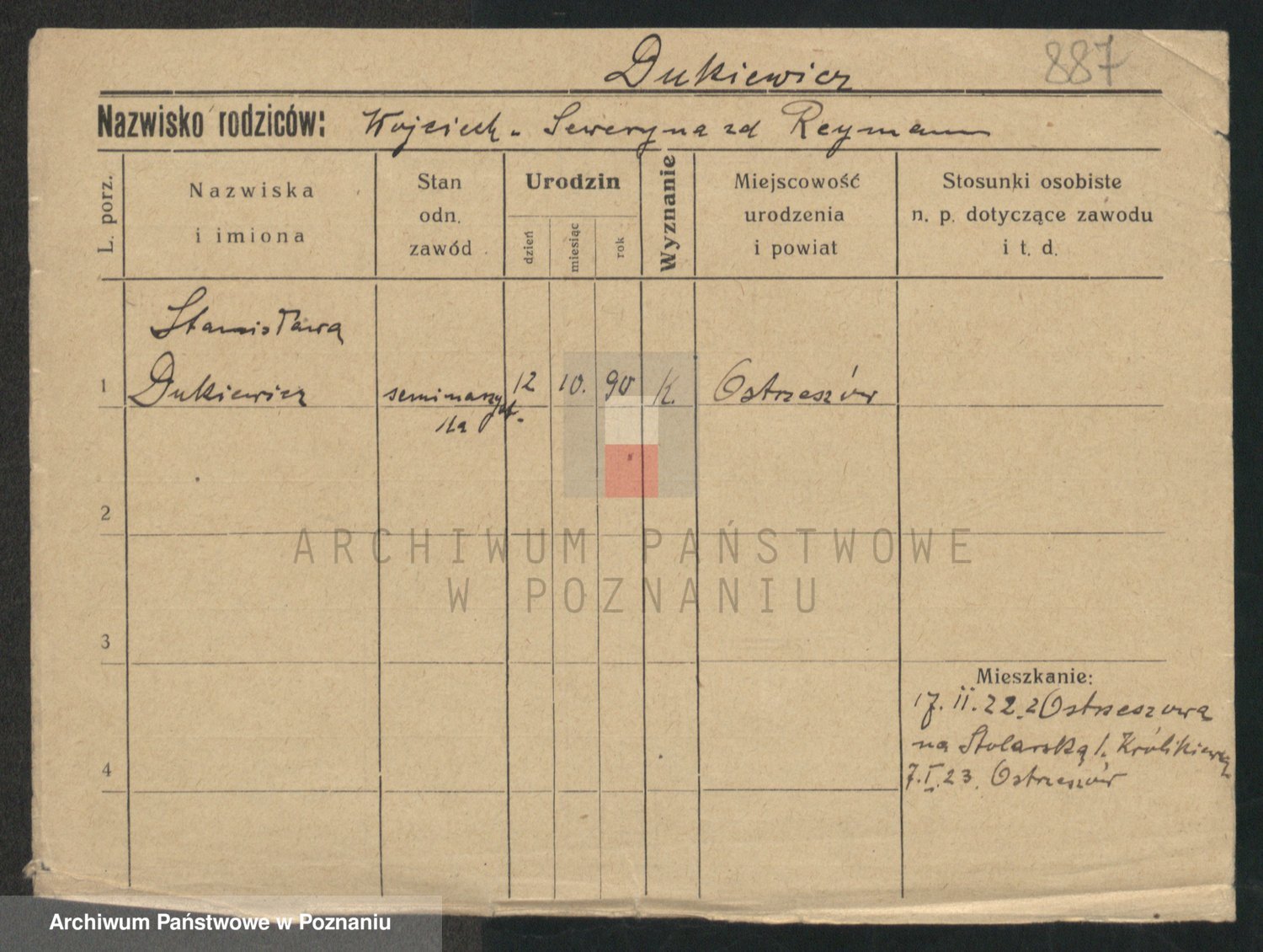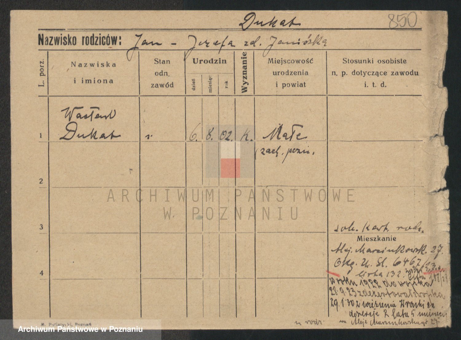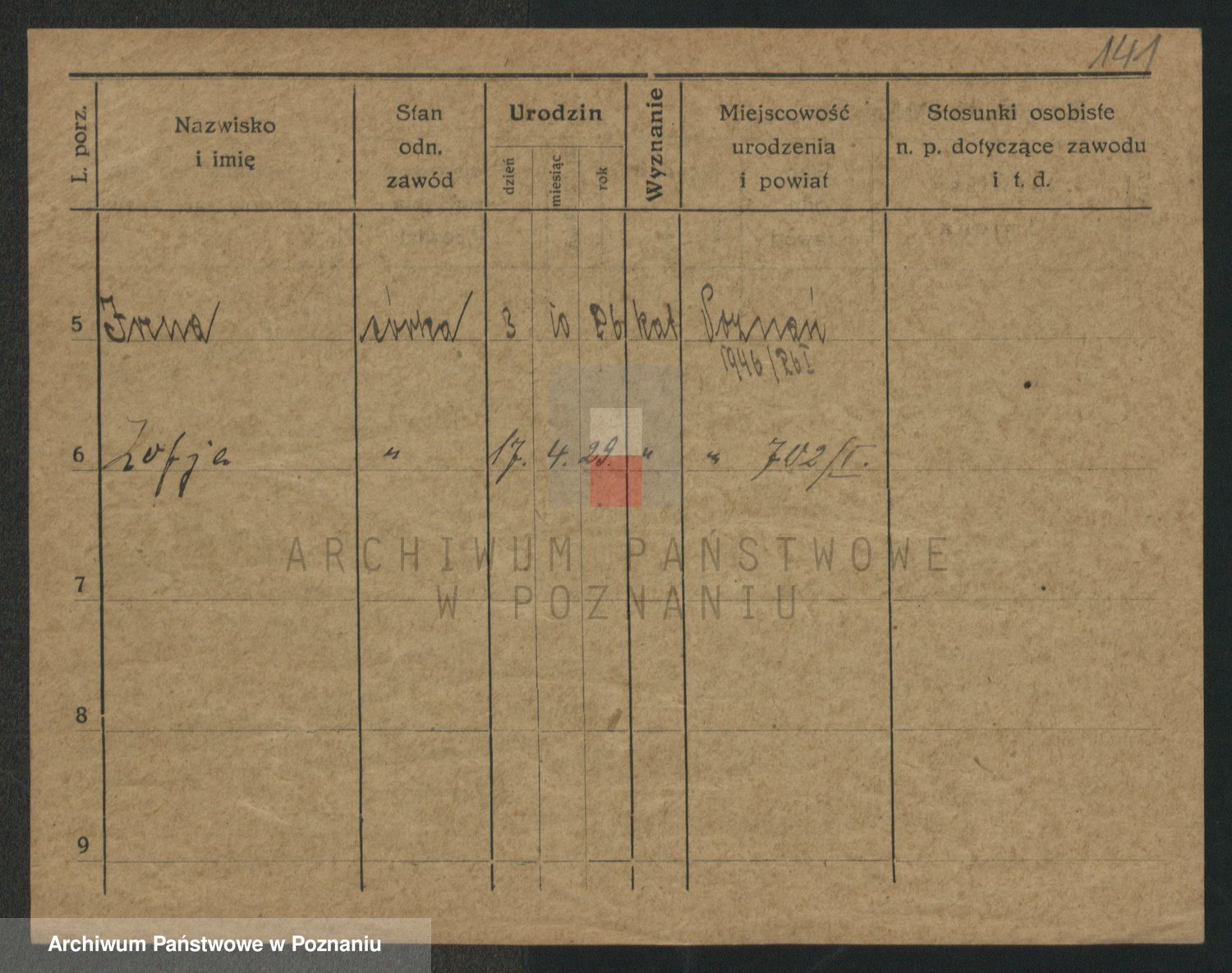 Podgląd karty osobowej dostępny jest po kliknięciu na nazwisko lub ikonkę karty. Można dokonywać powiększenia (ikony na górze) lub przechodzić między kolejnymi skanami (strzałki po bokach).